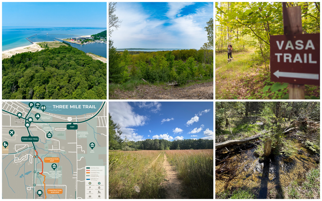 Pictured, Top Row L-R: Elberta Waterfront Community Conservation Project, The Ridge (photo credit: Rick Kane), the VASA Trail. Bottom Row L-R: Three Mile Trail map, Holiday Woodlands Natural Area, Cedar Run Creek Natural Area.