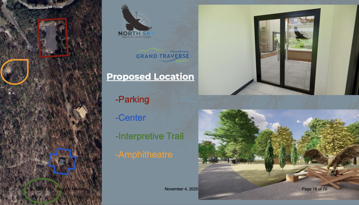 Grand Traverse County hopes to team up with the nonprofit North Sky Raptor Sanctuary to locate a new raptor sanctuary at Camp Greilick, including educational programming, a wildlife hospital, an interpretative trail, bird enclosures, and a flight pen.