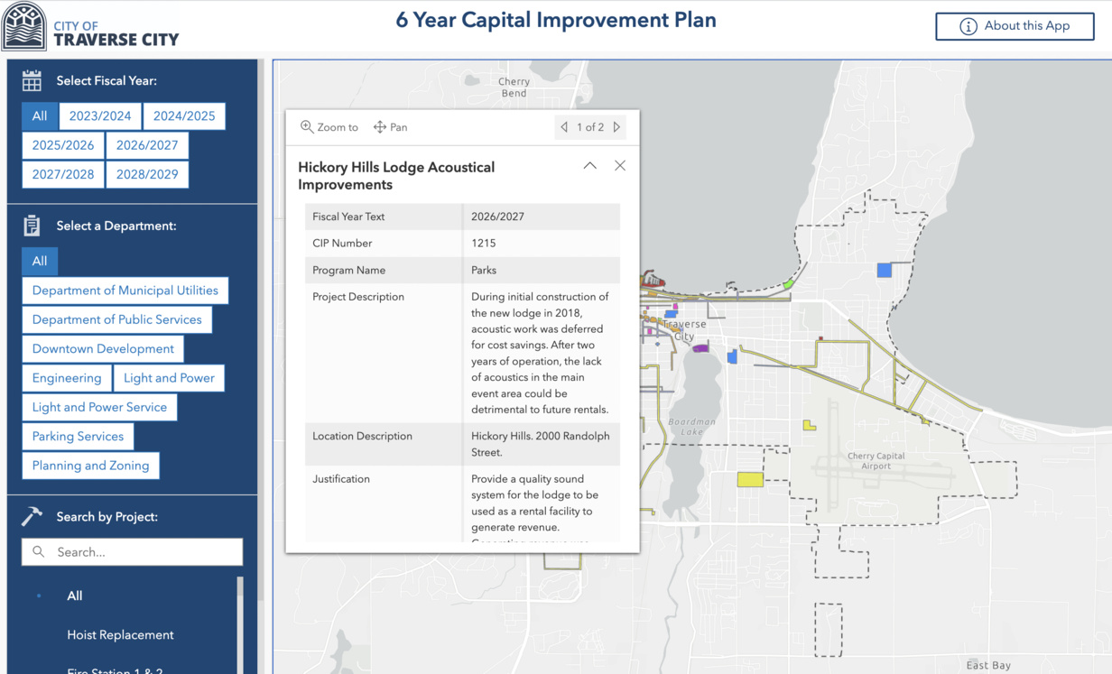 A new CIP map just launched by the city provides a visual, color-coded, interactive display of all upcoming projects. Residents can click on projects by neighborhood, year, or department (such as parks and recreation or Traverse City Light & Power or parking services). Residents can also search for projects by name. Clicking on a project will bring up a pop-up screen that shows a description of the planned work, its timeline, and budget (pictured). In the upcoming fiscal year – 2023-24 – more than a dozen city projects are shown on the new map. Some of those include:
