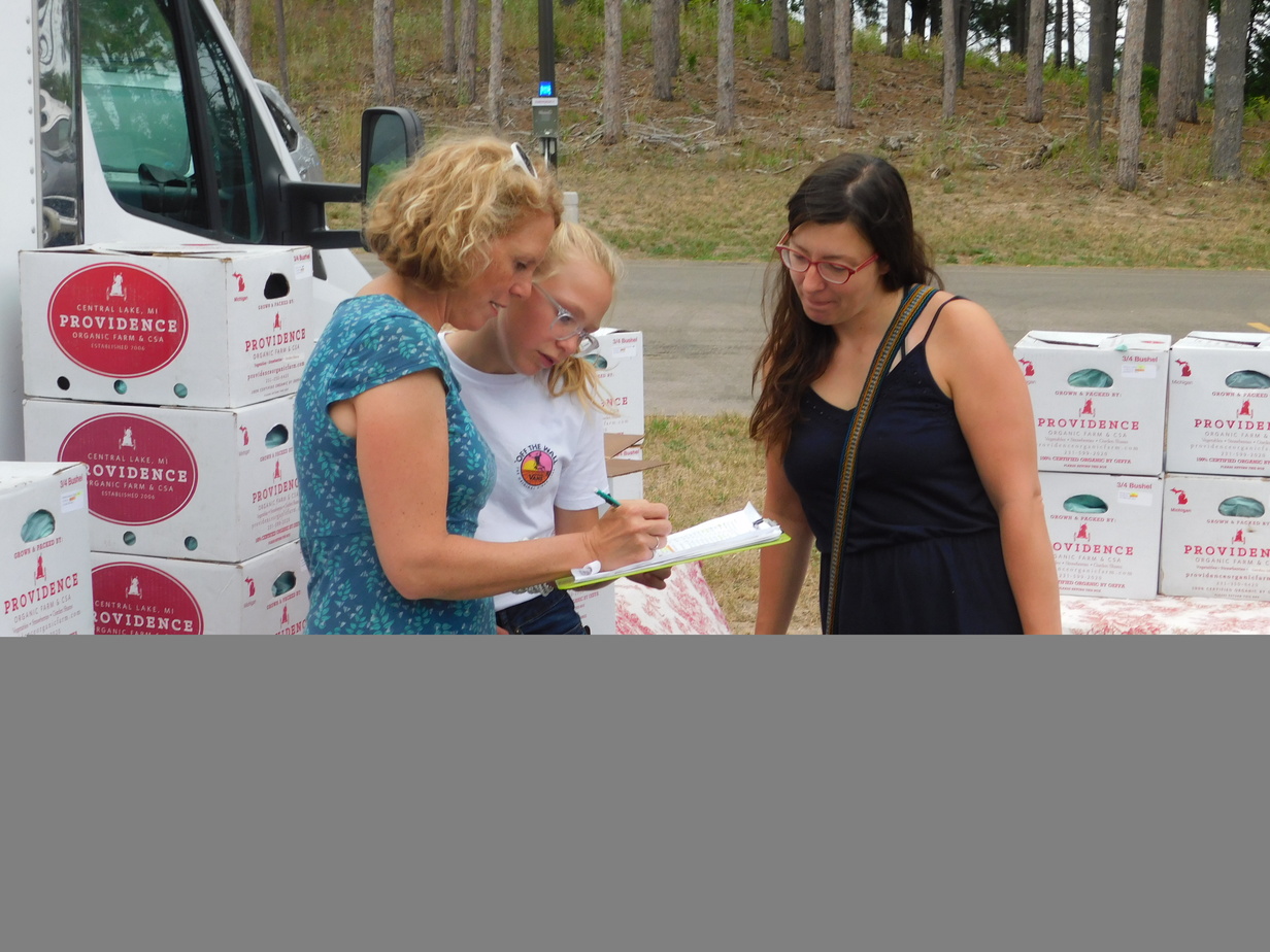 “I’ve been really busy and I’m not eating all of it,” she tells Andrea Romeyn (pictured above left), who owns Providence Organic Farm in Central Lake. Romeyn and her daughter Maia are handing out boxes from an enclosed freight truck.