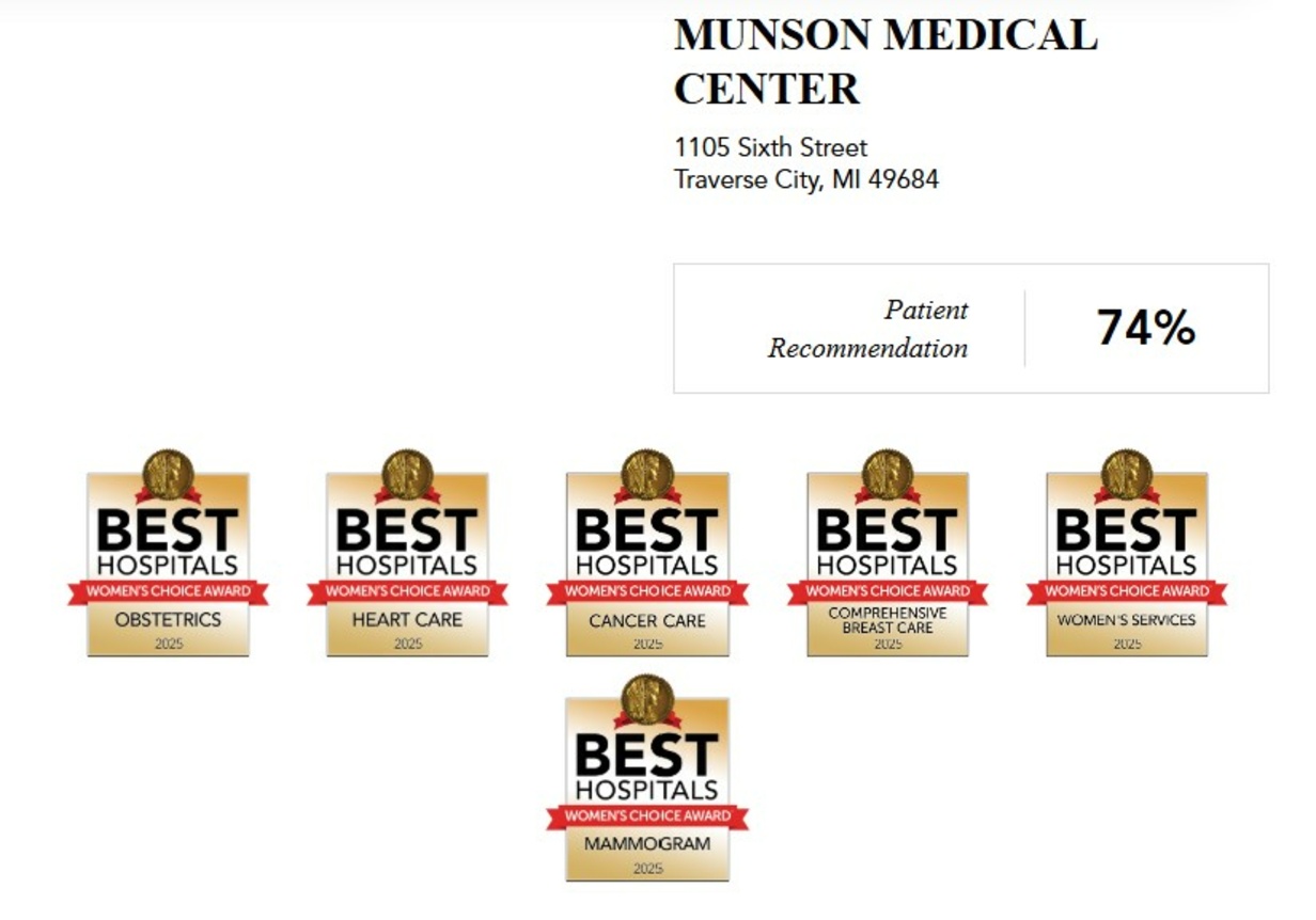 “We are honored that Women’s Choice Health has recognized the outstanding care provided by our Healthcare Team,” said Munson's Kathy LaRaia in a press release. LaRaia is Munson Healthcare’s VP of oncology, women’s health, and professional services. “Receiving awards in these six different areas truly reflects our commitment to the quality and growth of specialty care at Munson Medical Center.”