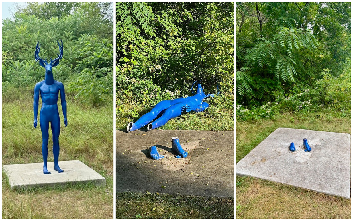 The Traverse City Arts Commission (TCAC) installed the four sculptures – tall blue figures made from cast aluminum that have a humanlike body with a deer head and antlers – earlier this summer as part of a rotating exhibit called Art on the TART. TCAC paid the Coys $4,000 for the loan of their sculptures for two years. Late afternoon Tuesday, the Traverse City Police Department learned of reported damage to one of the sculptures. It was broken off at the ankles, with the figure toppled on the ground. A day later, on Wednesday evening, a second sculpture was found destroyed in nearly identical fashion.