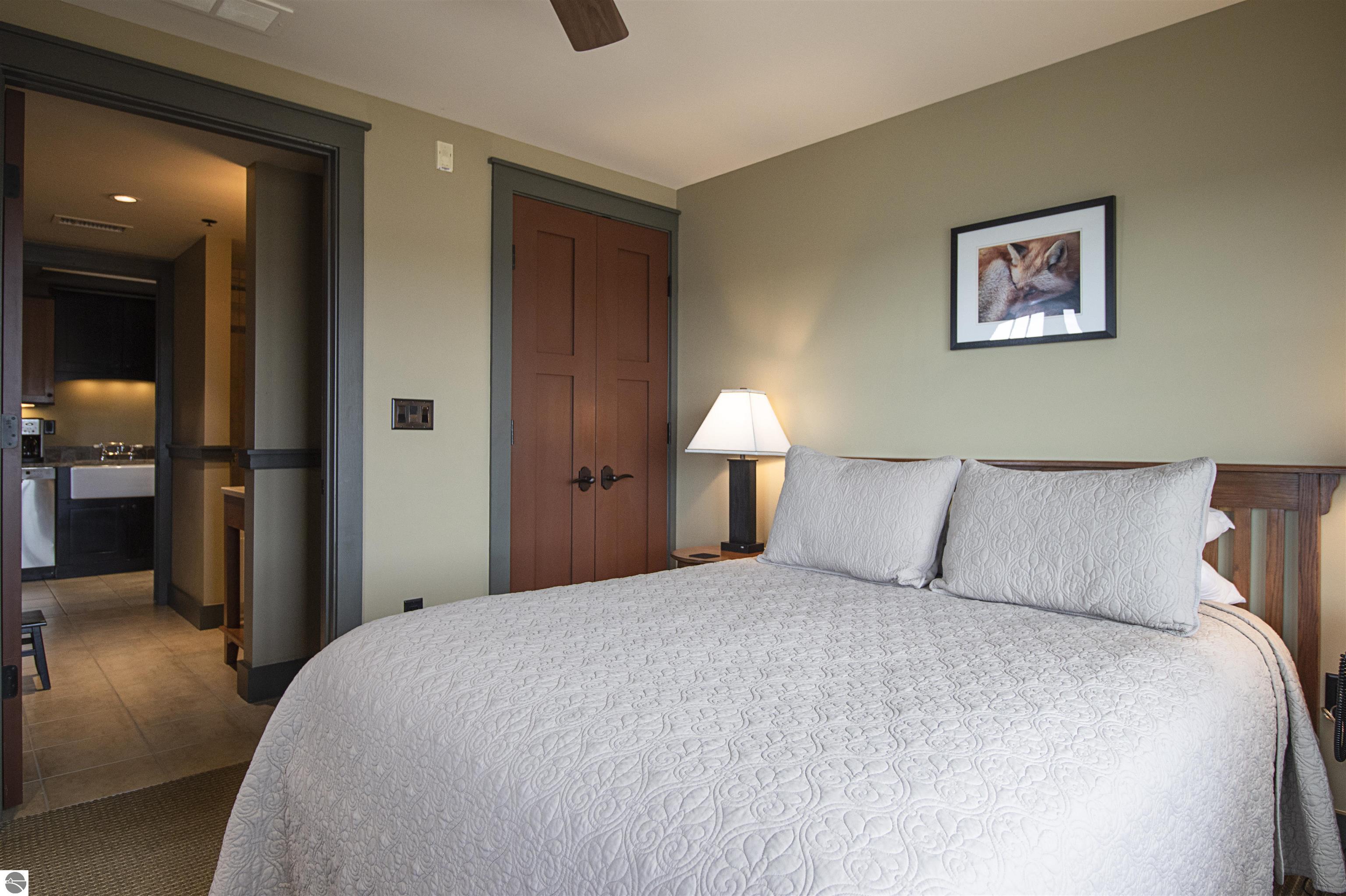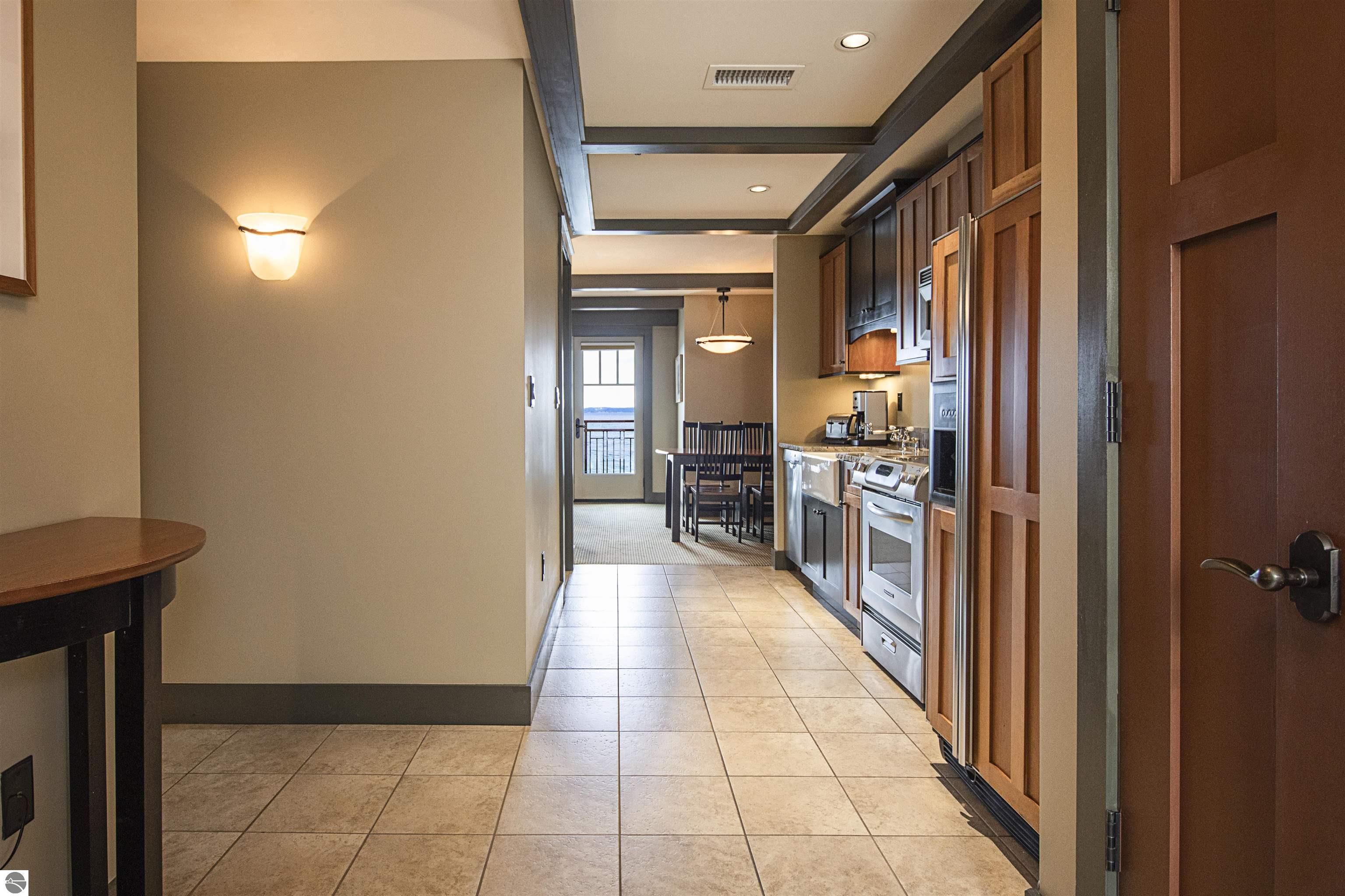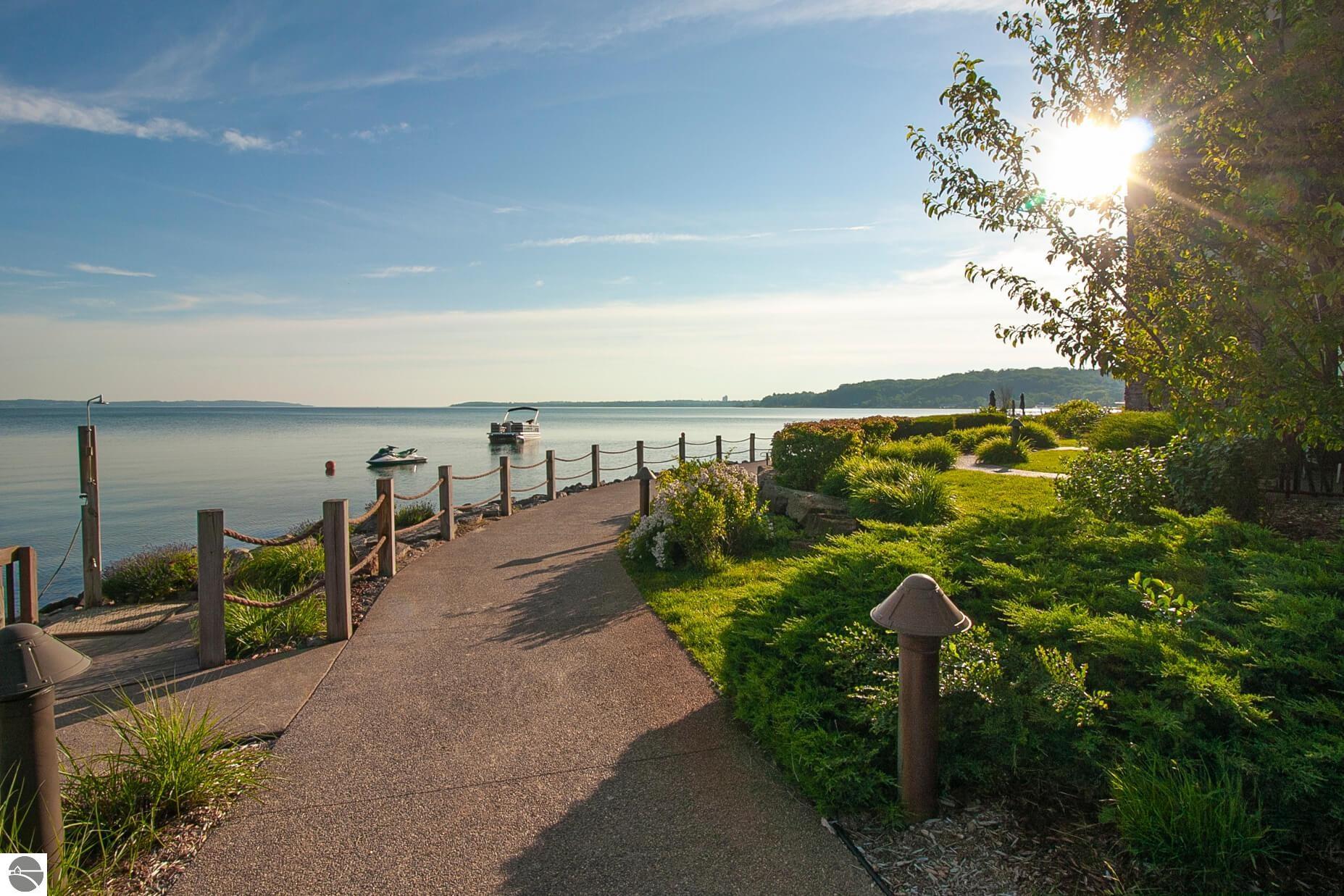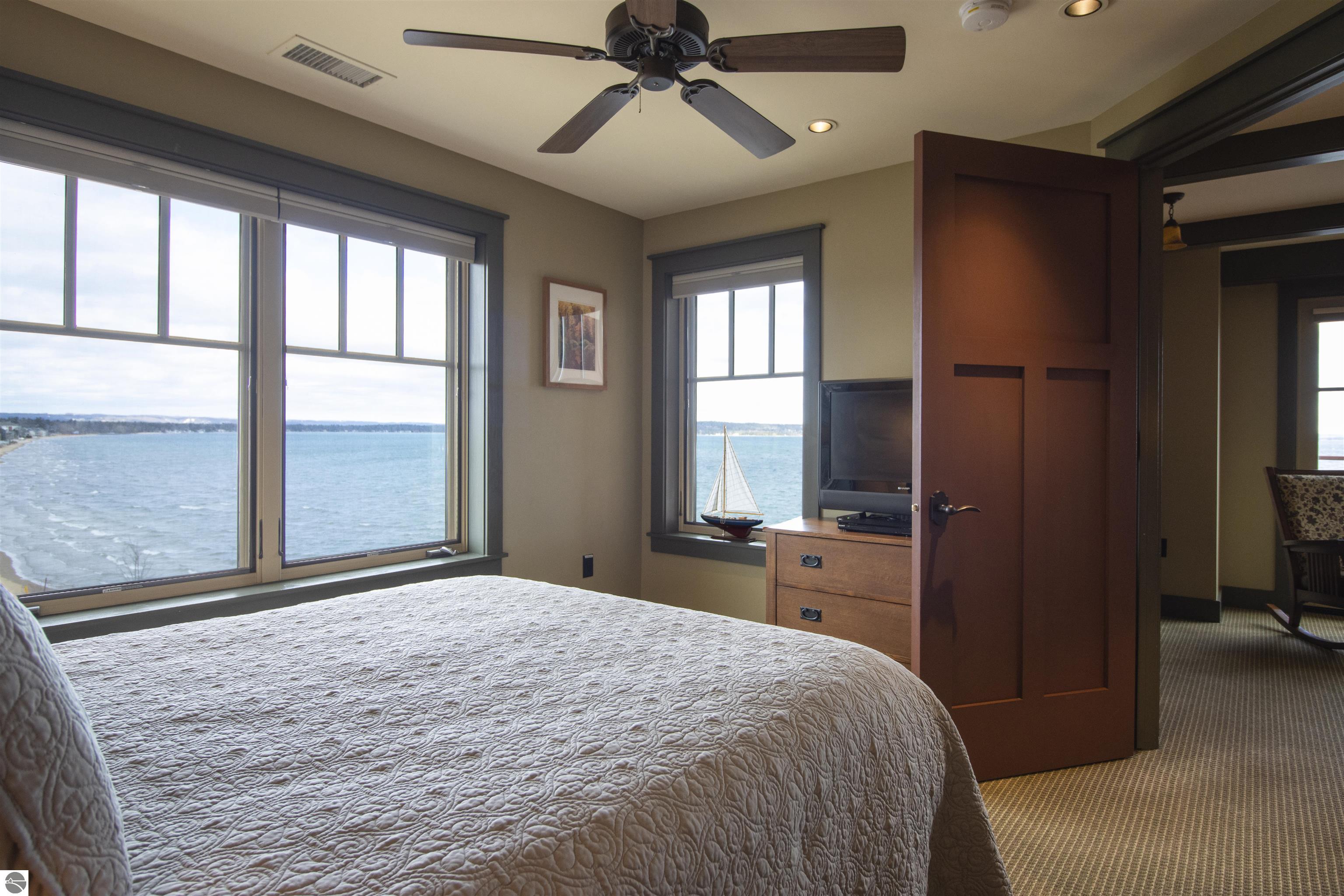 Tamarack Lodge! Aspen room 2500, an end unit on the NW corner of the top floor of a 5 story building that has an elevator. Absolutely outstanding water views and the best sugar sand beach imaginable from this 1/8th fractional ownership waterfront condo in Traverse City on Lake Michigan's East Grand Traverse Bay. See rotation D schedule for the 6 weeks that are included for the coming years (weeks change slightly each year). $287 per month association dues cover pretty much everything except for room cleaning and property taxes. Financing available (this is not a timeshare) through TBACU. All furnishings and linens included, even the fully stocked kitchen (appliances, pots, pans, silverware, etc).