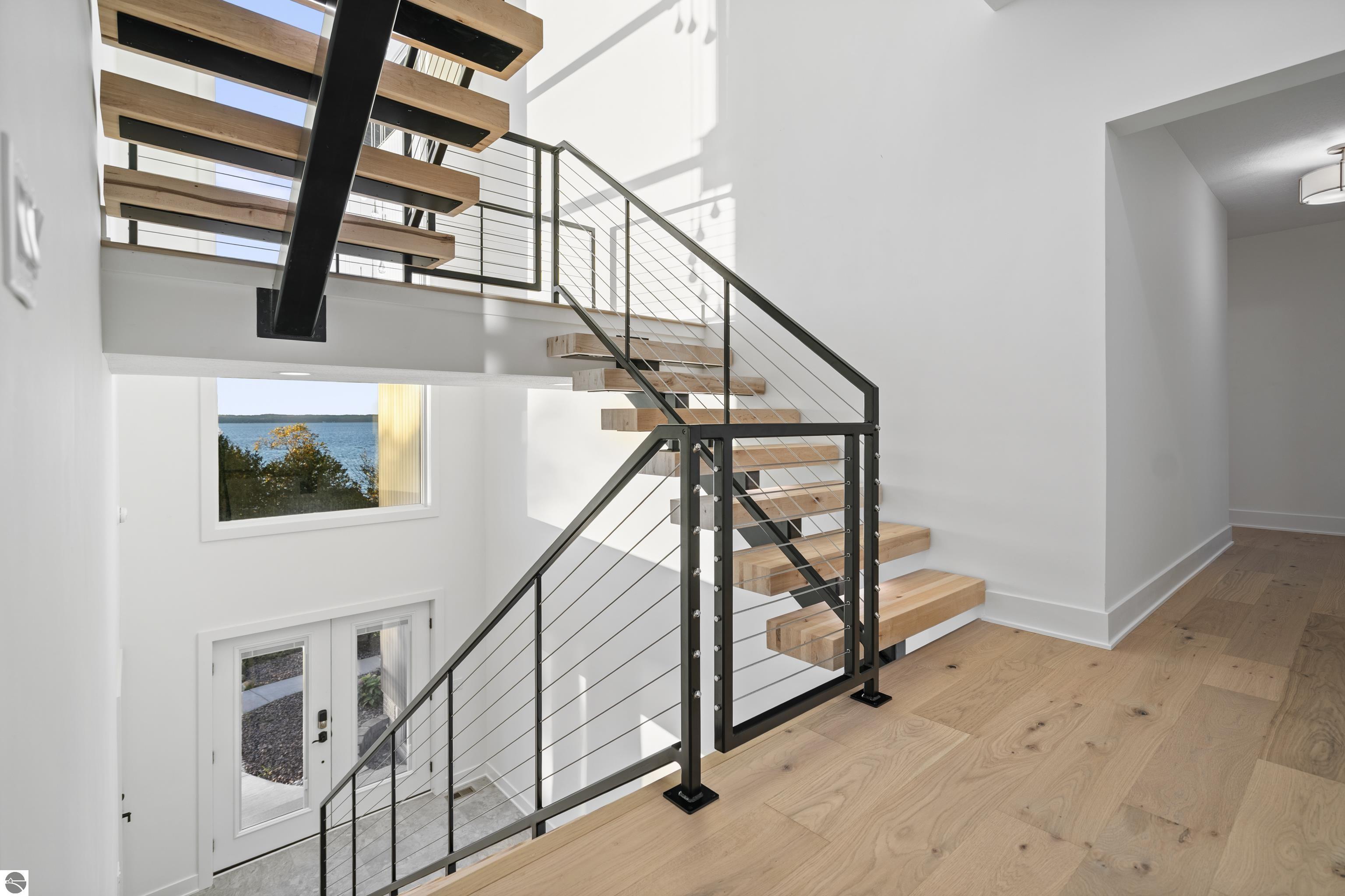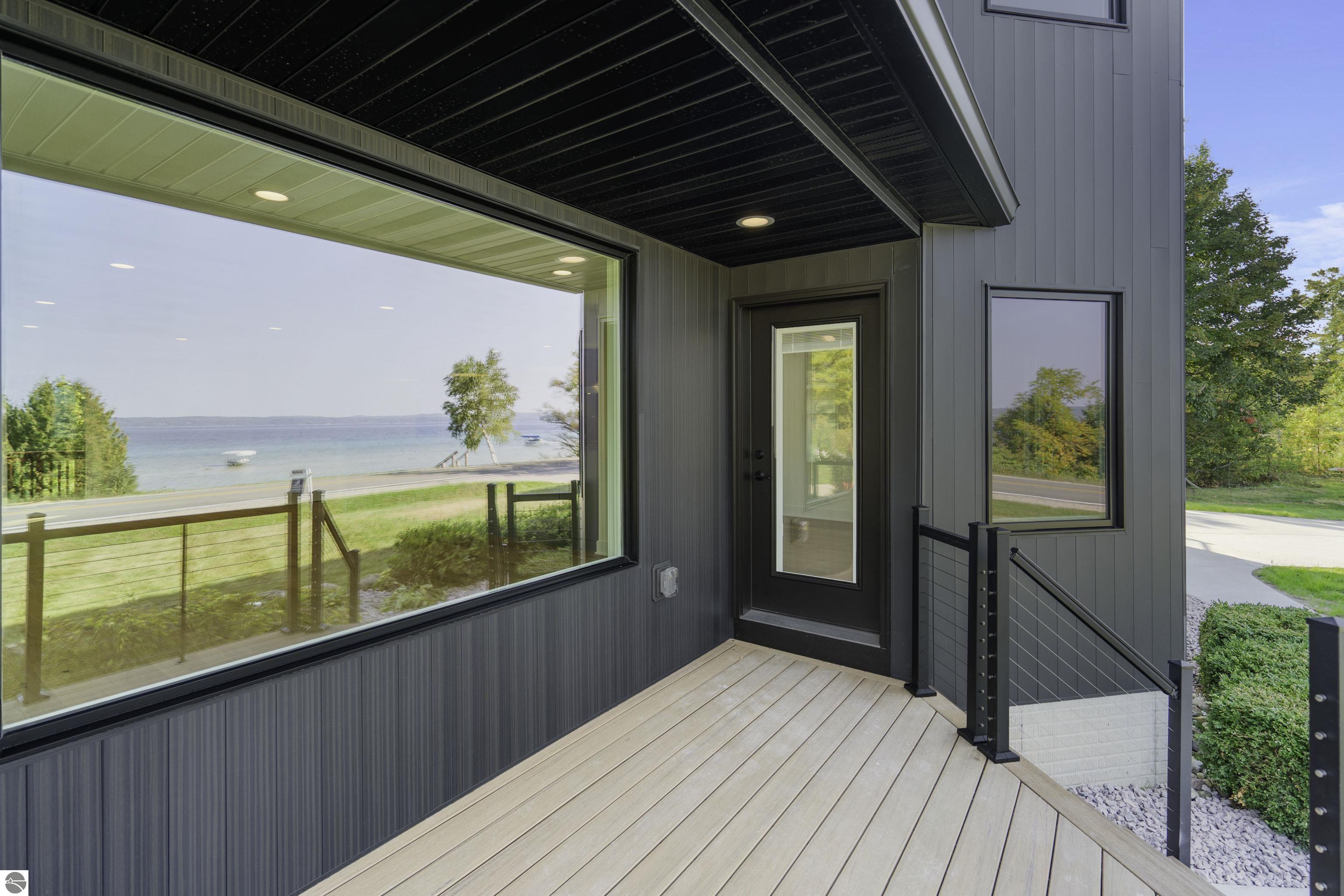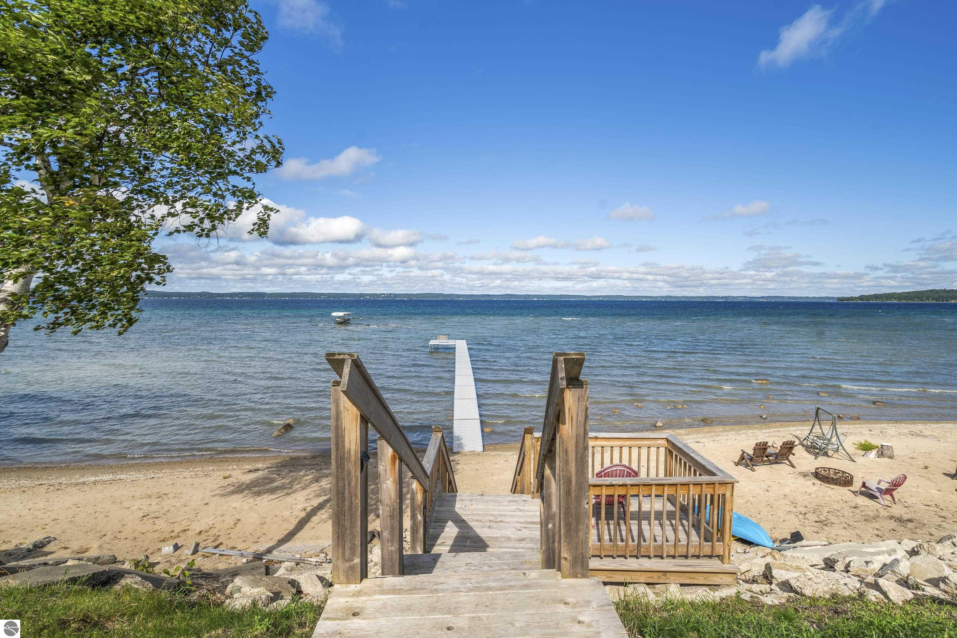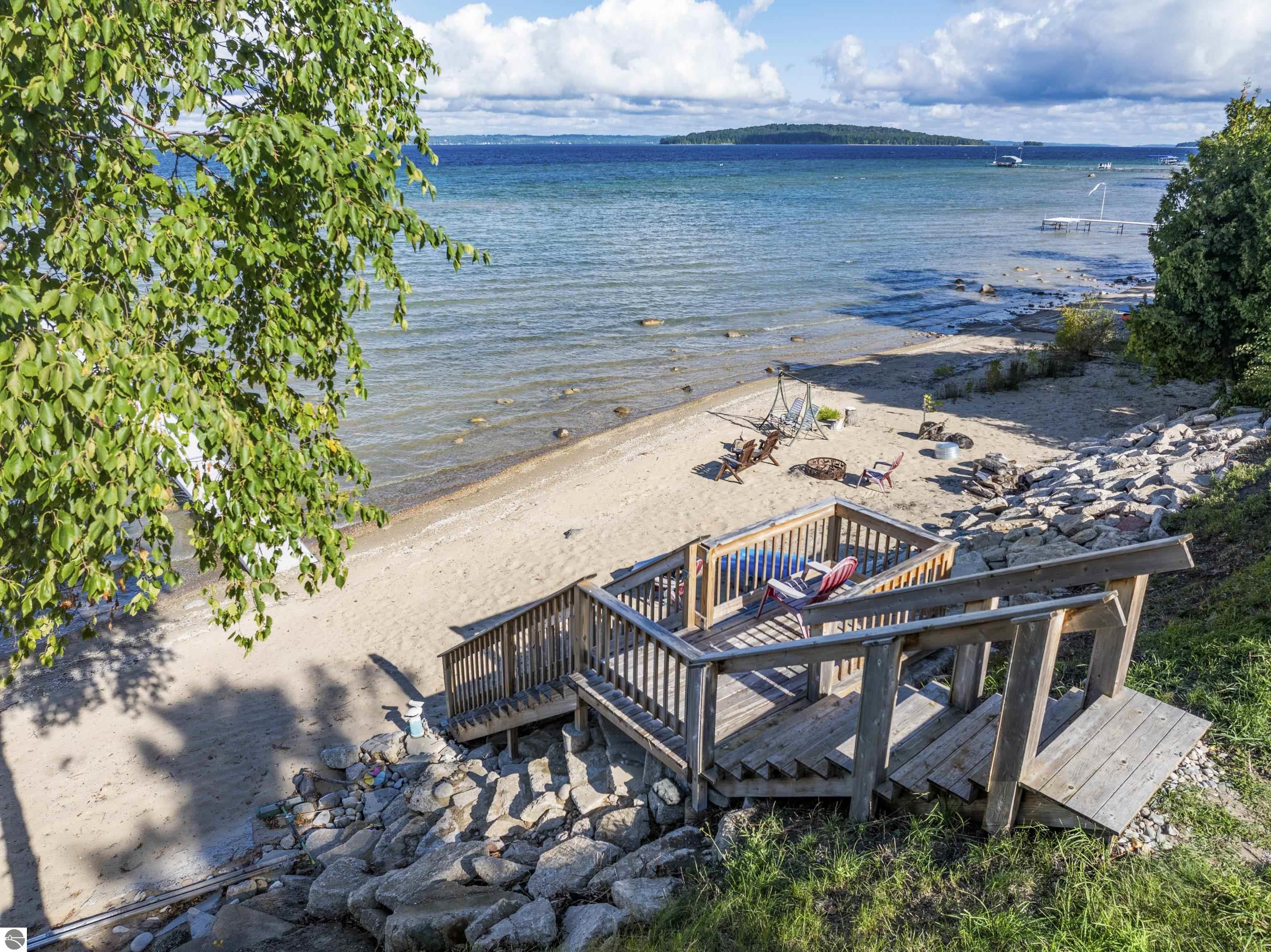 Views of West Bay from every room on the front of the house! Contemporary on Old Mission! The bay sparkles are endlessly beautiful on your extra-wide 109' private beach. And then... your first step into the home is right into the coolest foyer entry in TC! It's a masterpiece featuring a 15 ft. chandelier, which perfectly ignites the beauty from outside, while warming the interior with soft light. The staircase itself is magazine-worthy, with its handmade maple wood treads that will have LED lighting & custom-welded bannister once complete. Everything is new in this renovated home featuring 4 bedrooms, 3.5 baths & a spa-like master bedroom suite with heated floors & a soaking tub overlooking the bay. Top-quality metal roof and siding mean low maintenance for easy living. The second-floor media room is wired for surround sound, has a wet bar, shiplap wall cover, and large easterly facing windows. The room has a balcony overlooking West Bay accessible by 3 walkout sliders, while the third-story bedrooms also feature walk-out balconies, all overlooking beautiful West Bay. All the sights, sounds, and feels are here!
