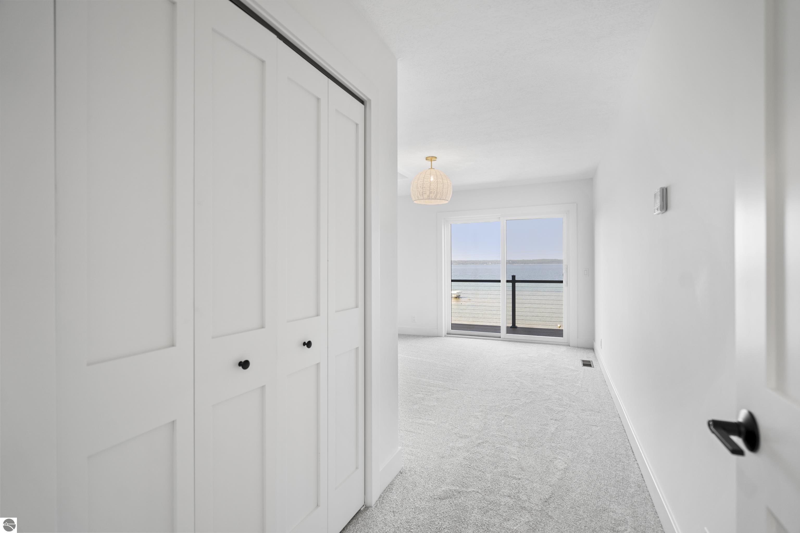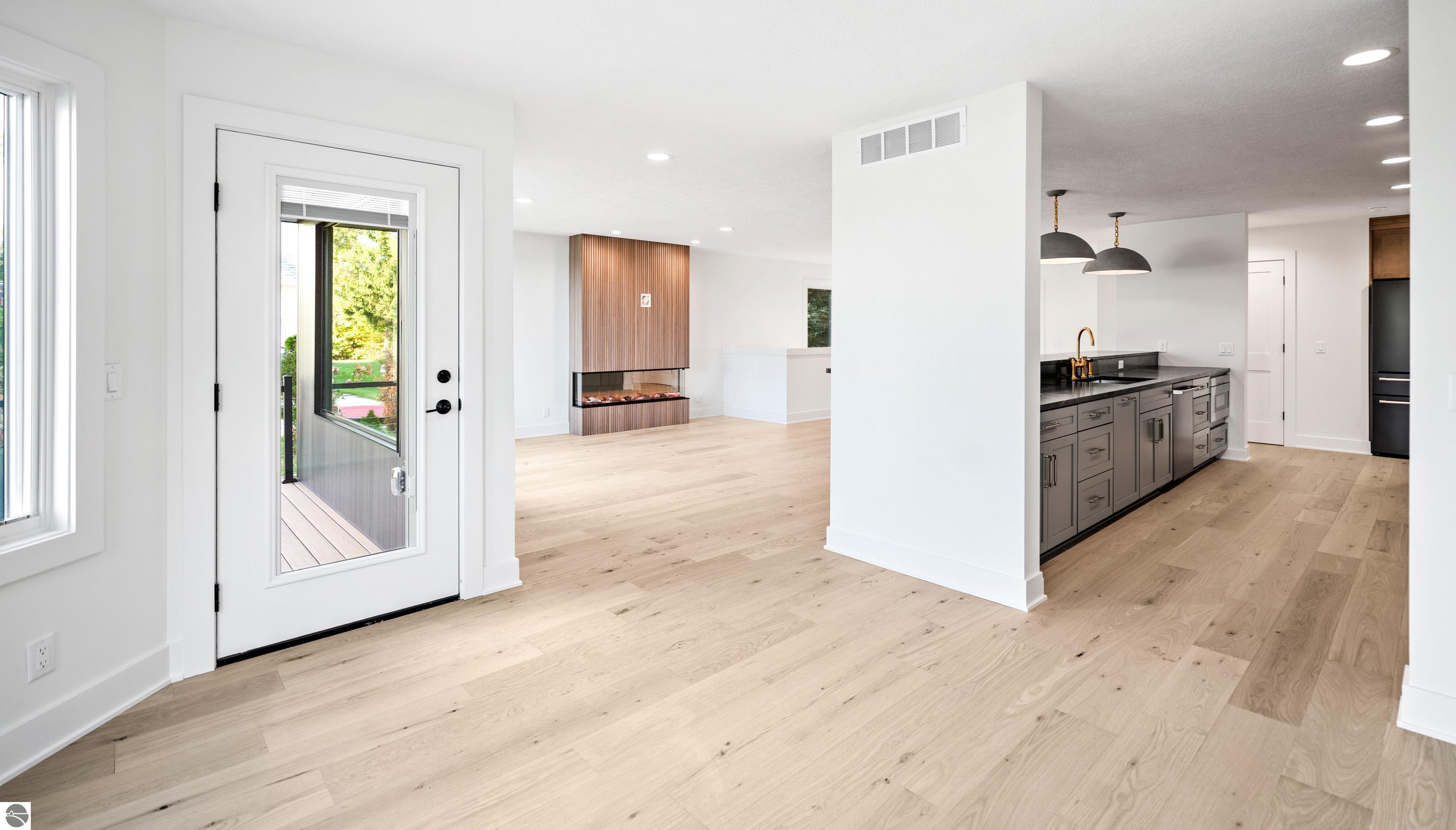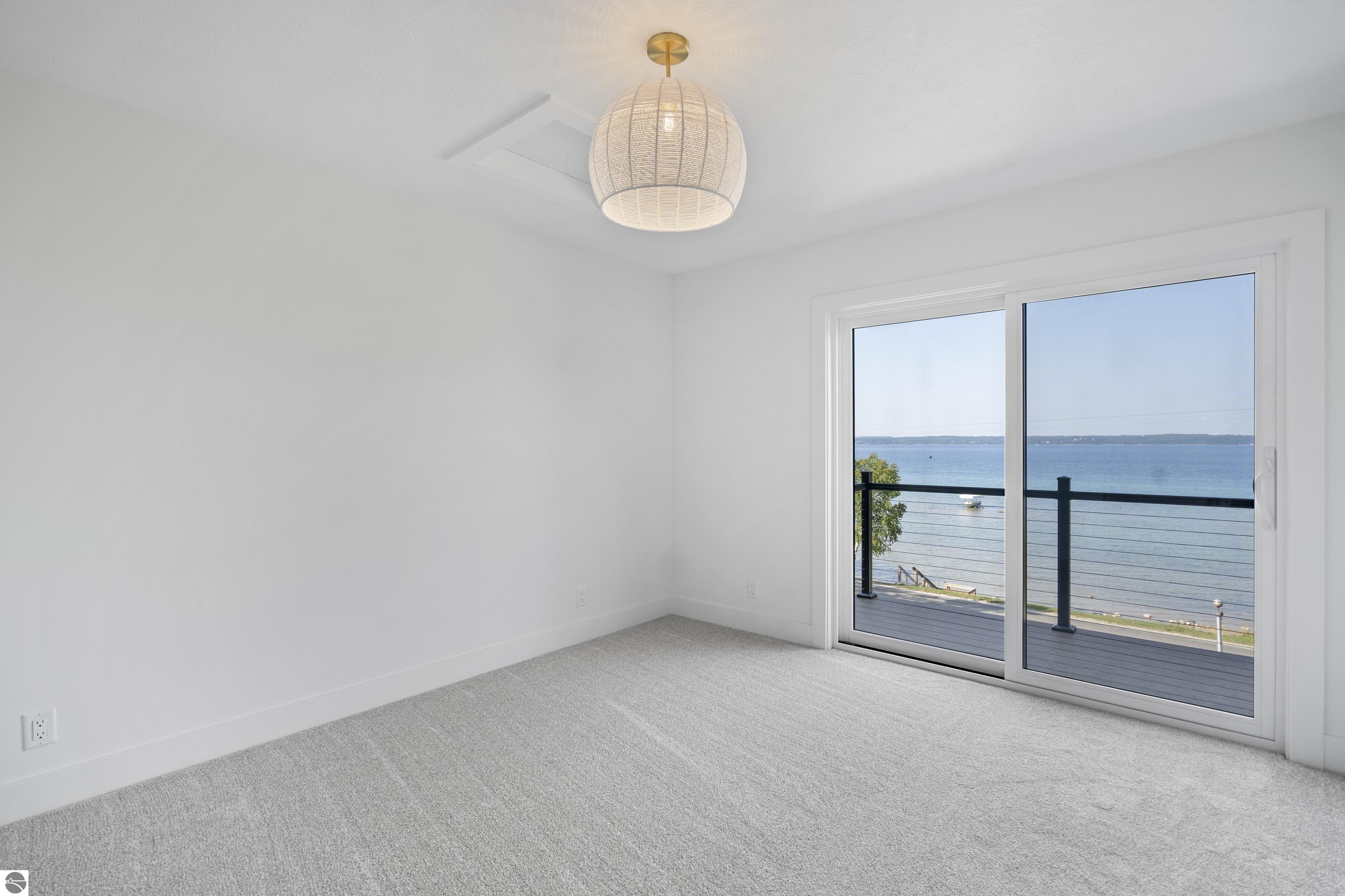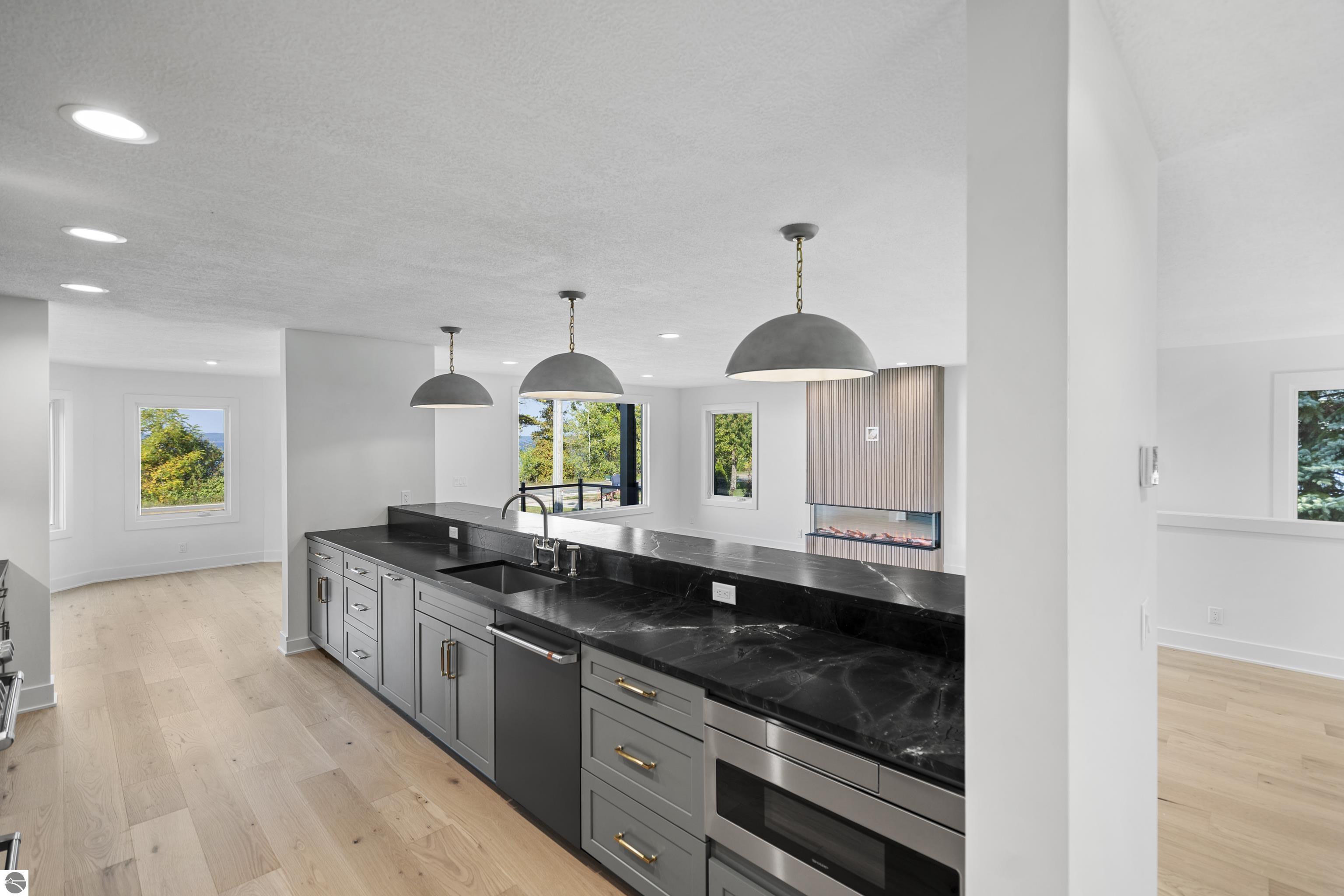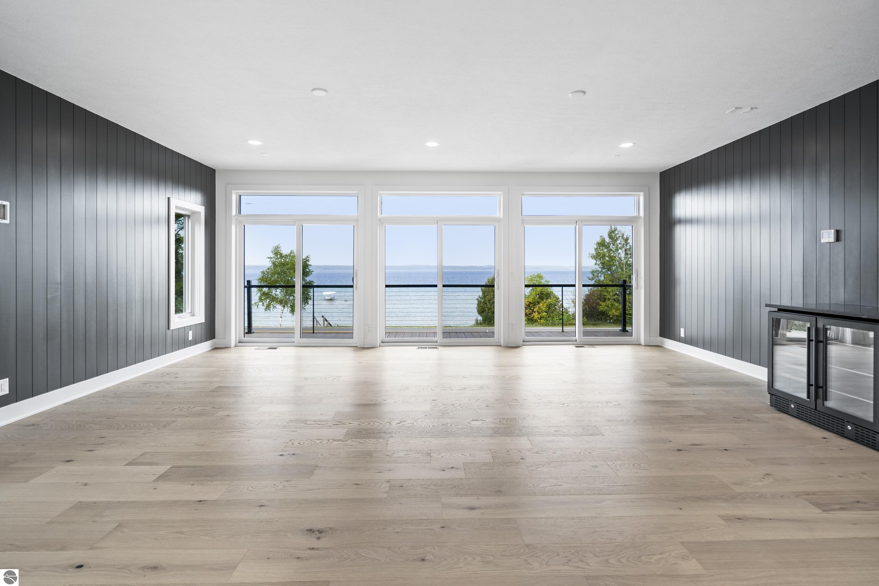 Views of West Bay from every room on the front of the house! Contemporary on Old Mission! The bay sparkles are endlessly beautiful on your extra-wide 109' private beach. And then... your first step into the home is right into the coolest foyer entry in TC! It's a masterpiece featuring a 15 ft. chandelier, which perfectly ignites the beauty from outside, while warming the interior with soft light. The staircase itself is magazine-worthy, with its handmade maple wood treads that will have LED lighting & custom-welded bannister once complete. Everything is new in this renovated home featuring 4 bedrooms, 3.5 baths & a spa-like master bedroom suite with heated floors & a soaking tub overlooking the bay. Top-quality metal roof and siding mean low maintenance for easy living. The second-floor media room is wired for surround sound, has a wet bar, shiplap wall cover, and large easterly facing windows. The room has a balcony overlooking West Bay accessible by 3 walkout sliders, while the third-story bedrooms also feature walk-out balconies, all overlooking beautiful West Bay. All the sights, sounds, and feels are here!