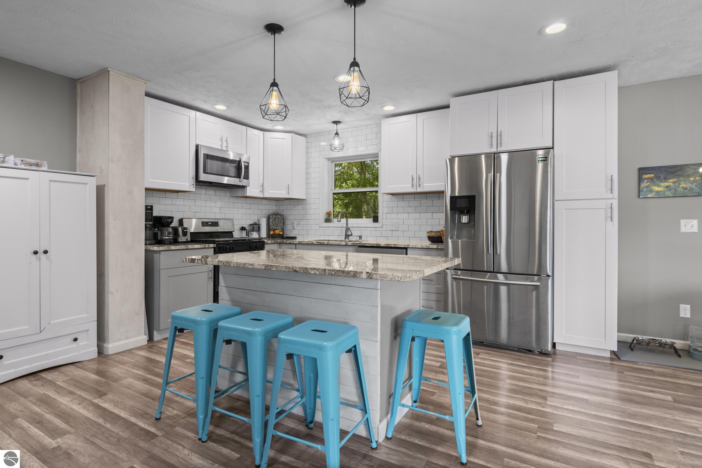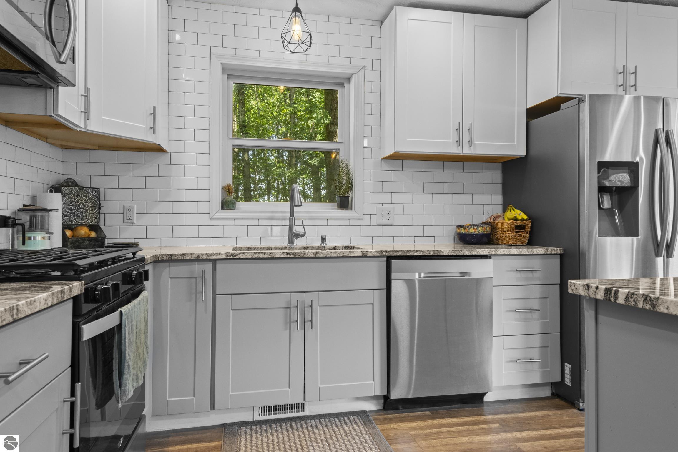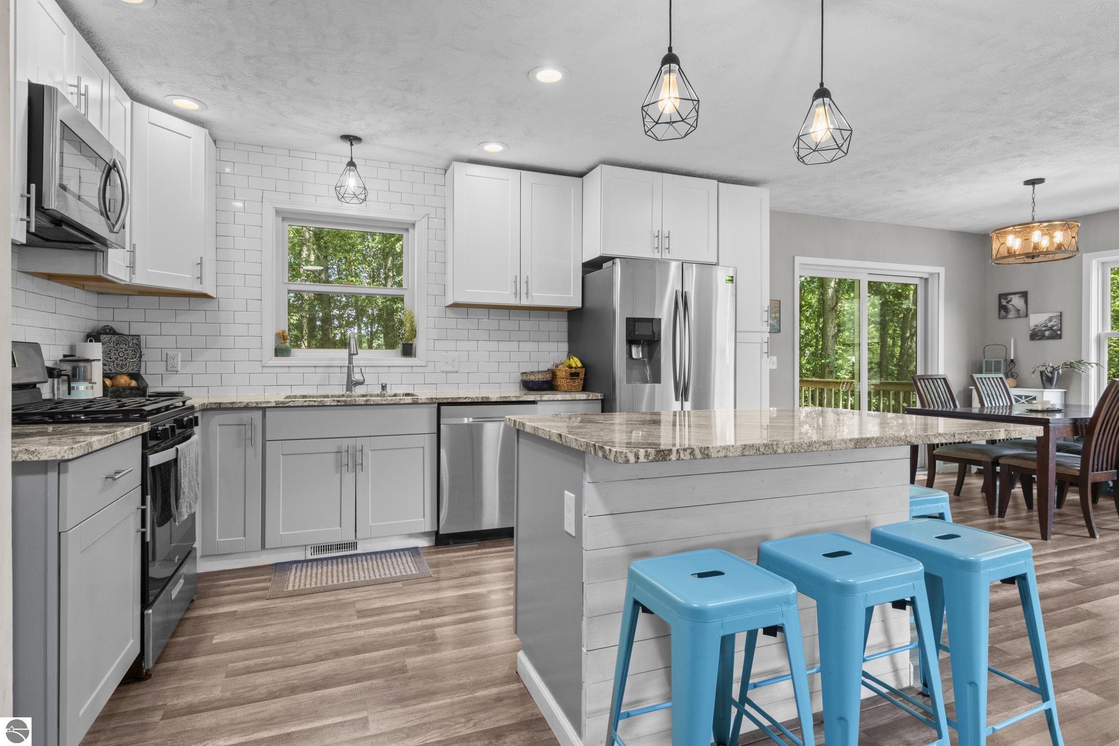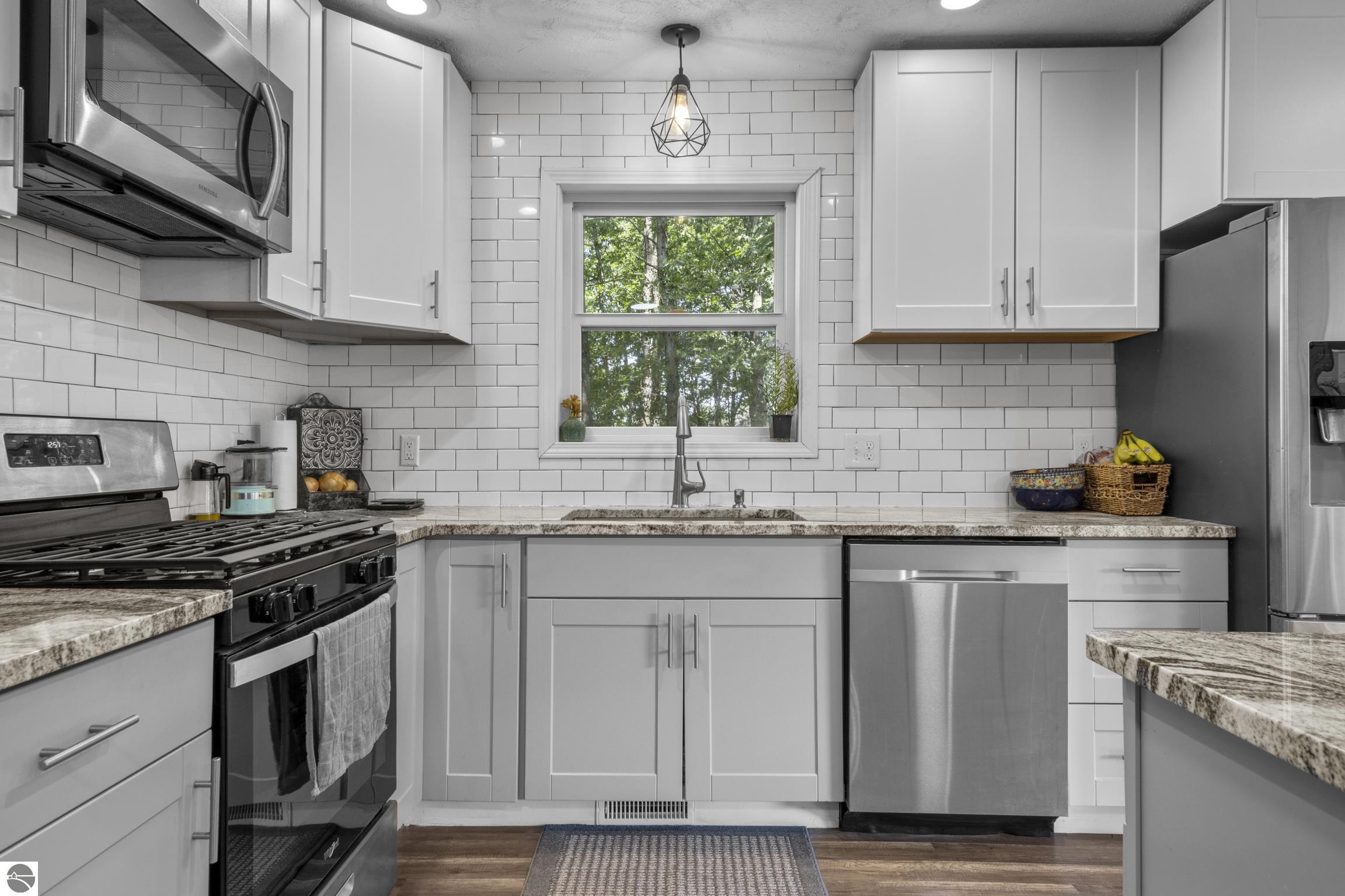 Stunning park-like setting for this fully updated 4 bedroom 2.5 bath home set on over an acre on a cul-de-sac. Updates include new roof 2024, full remodel in 2019 with new furnace, hot water heater, appliances & sliding glass doors and nearly all windows. Charming covered entry opens into a spacious living room with country side views out of all windows and flows beautifully into the dining and kitchen. Deck on the rear of the home overlooks the woods and is perfect for bbq'ing. Kitchen is fresh and clean with white cabinets, subway tile backsplash, stainless steel appliances and granite counter tops. A cooks delight! The darling powder room is tucked in under the stairs. Upstairs there are three bedrooms and a large bathroom. The lower level is a walkout with great light, the family room is currently used as workout space could also be a great place for movie night & game nights. There is addition bedroom and office as well as the laundry room and a full bath. Step outside and enjoy the garden area, fenced to keep the wildlife out of the veggies. There is an attached 2 car garage and a shed which has a full workshop. This home is an eastside gem, close to lakes, the VASA trail, the Boardman River, and just a few miles to downtown Traverse City.