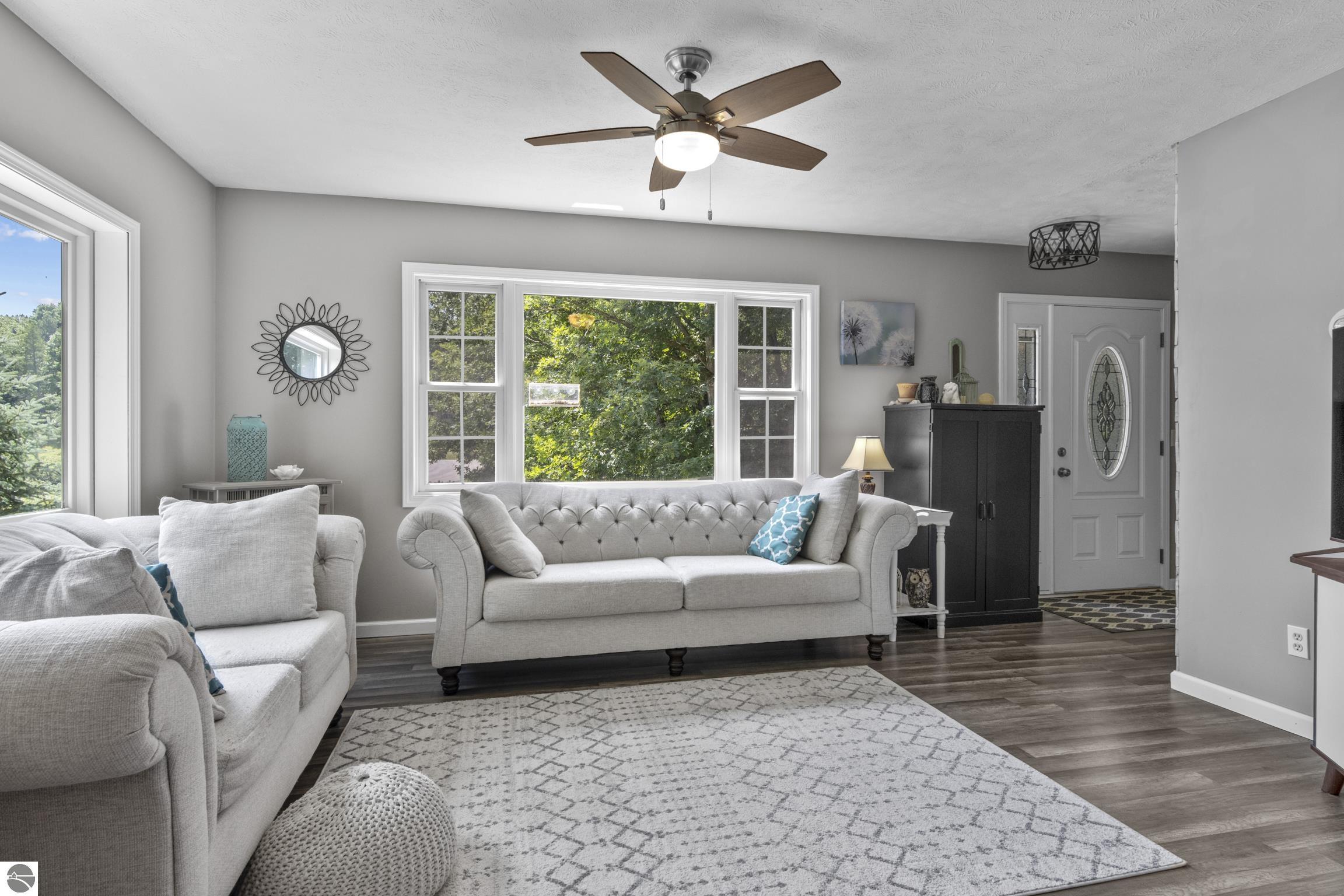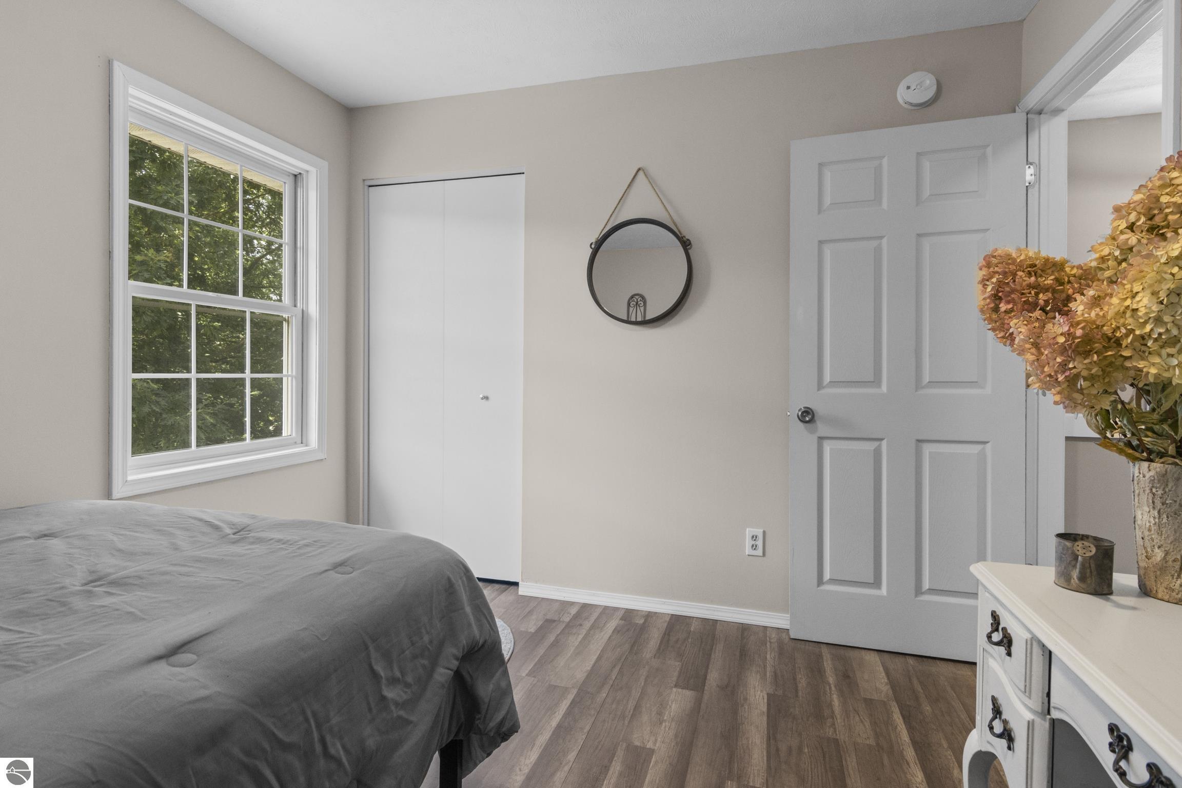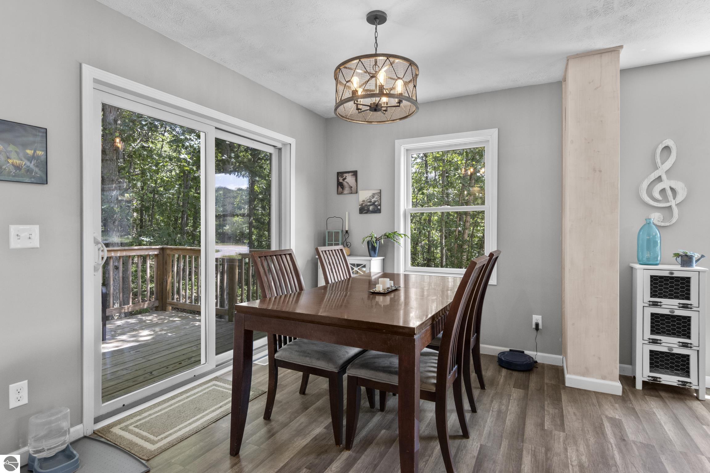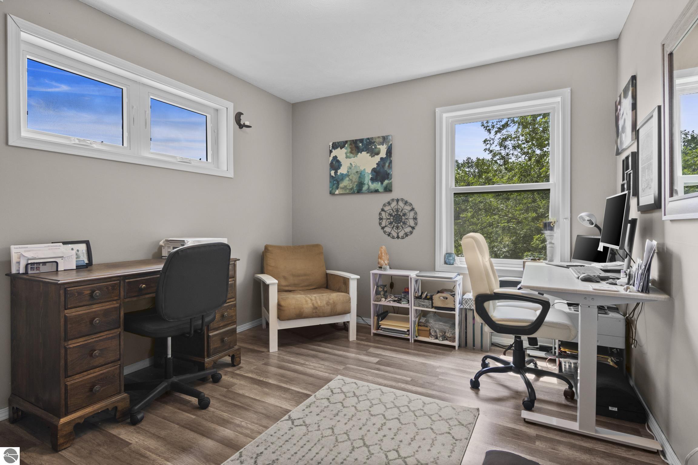 Stunning park-like setting for this fully updated 4 bedroom 2.5 bath home set on over an acre on a cul-de-sac. Updates include new roof 2024, full remodel in 2019 with new furnace, hot water heater, appliances & sliding glass doors and nearly all windows. Charming covered entry opens into a spacious living room with country side views out of all windows and flows beautifully into the dining and kitchen. Deck on the rear of the home overlooks the woods and is perfect for bbq'ing. Kitchen is fresh and clean with white cabinets, subway tile backsplash, stainless steel appliances and granite counter tops. A cooks delight! The darling powder room is tucked in under the stairs. Upstairs there are three bedrooms and a large bathroom. The lower level is a walkout with great light, the family room is currently used as workout space could also be a great place for movie night & game nights. There is addition bedroom and office as well as the laundry room and a full bath. Step outside and enjoy the garden area, fenced to keep the wildlife out of the veggies. There is an attached 2 car garage and a shed which has a full workshop. This home is an eastside gem, close to lakes, the VASA trail, the Boardman River, and just a few miles to downtown Traverse City.
