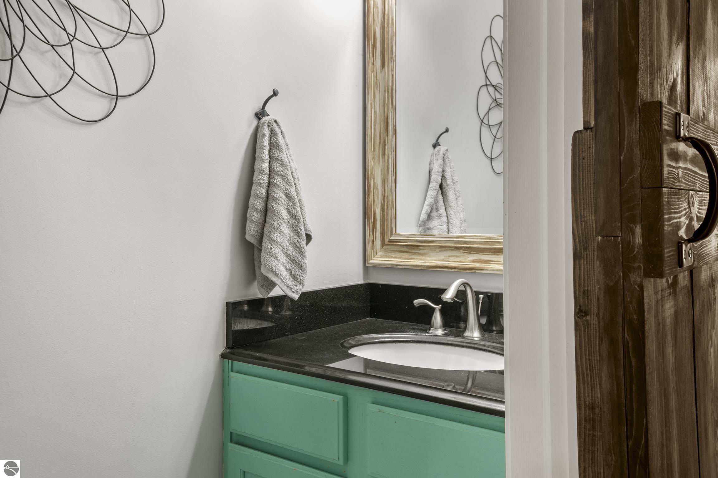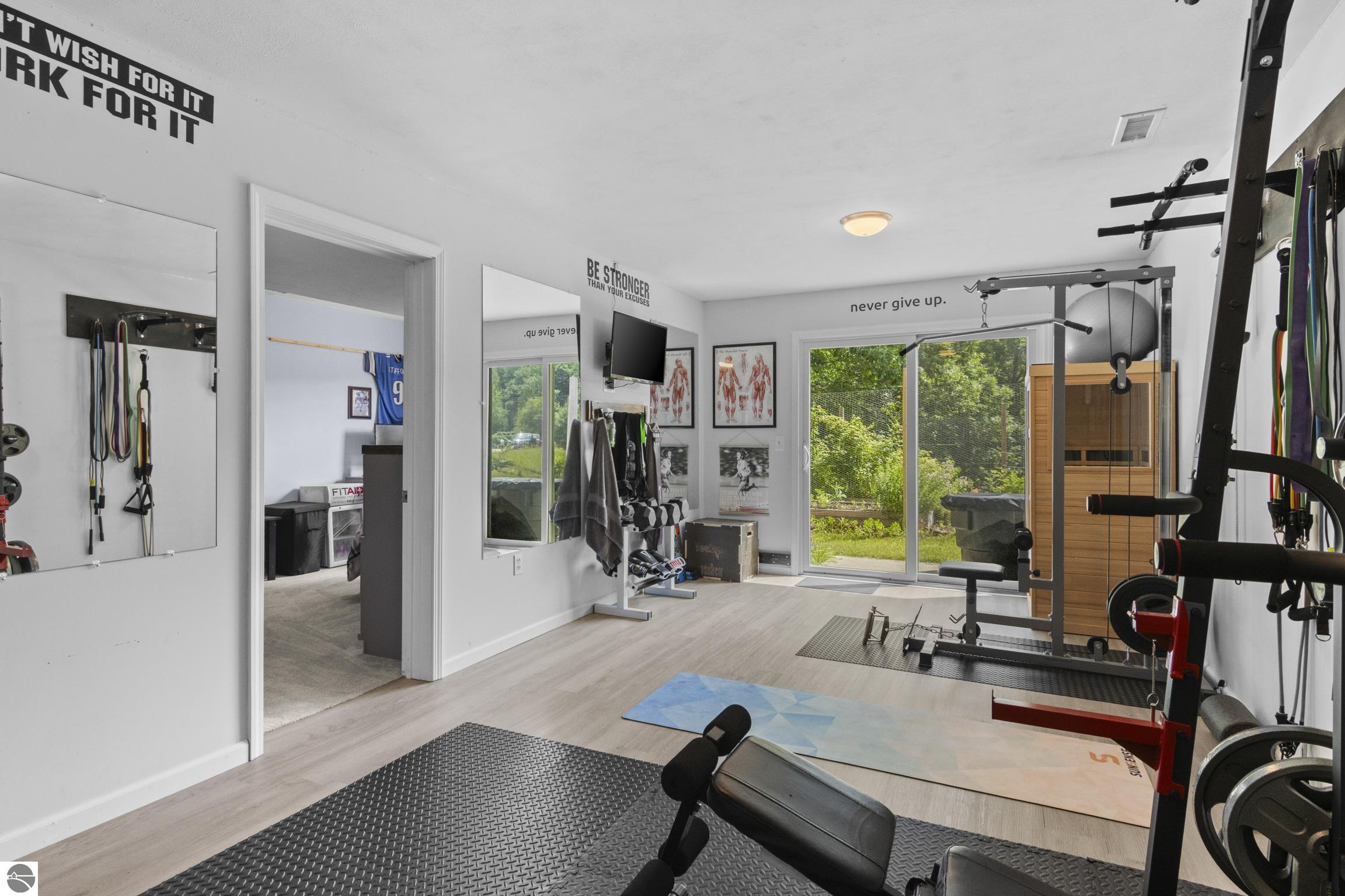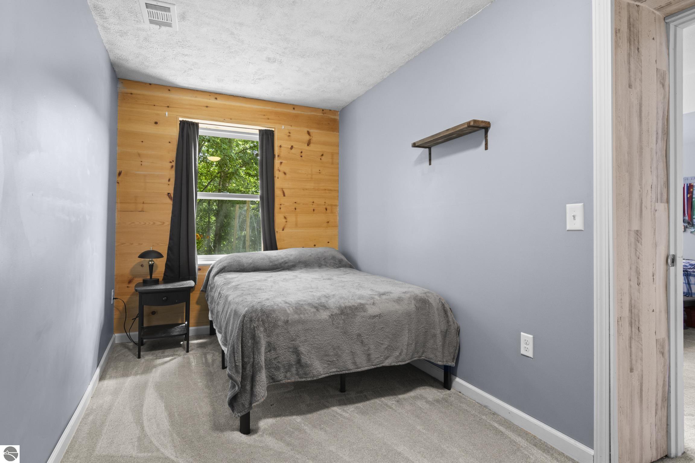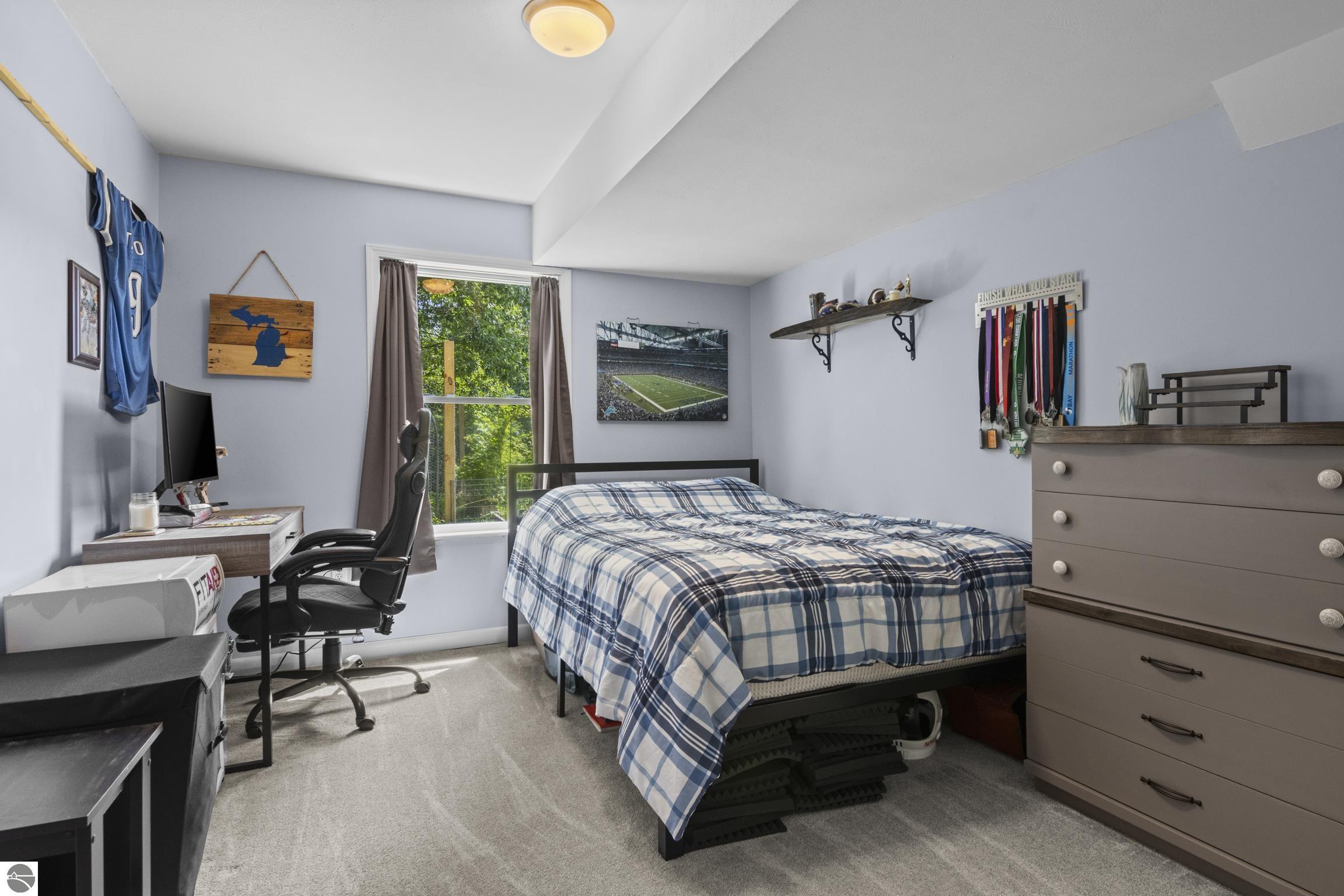 Stunning park-like setting for this fully updated 4 bedroom 2.5 bath home set on over an acre on a cul-de-sac. Updates include new roof 2024, full remodel in 2019 with new furnace, hot water heater, appliances & sliding glass doors and nearly all windows. Charming covered entry opens into a spacious living room with country side views out of all windows and flows beautifully into the dining and kitchen. Deck on the rear of the home overlooks the woods and is perfect for bbq'ing. Kitchen is fresh and clean with white cabinets, subway tile backsplash, stainless steel appliances and granite counter tops. A cooks delight! The darling powder room is tucked in under the stairs. Upstairs there are three bedrooms and a large bathroom. The lower level is a walkout with great light, the family room is currently used as workout space could also be a great place for movie night & game nights. There is addition bedroom and office as well as the laundry room and a full bath. Step outside and enjoy the garden area, fenced to keep the wildlife out of the veggies. There is an attached 2 car garage and a shed which has a full workshop. This home is an eastside gem, close to lakes, the VASA trail, the Boardman River, and just a few miles to downtown Traverse City.