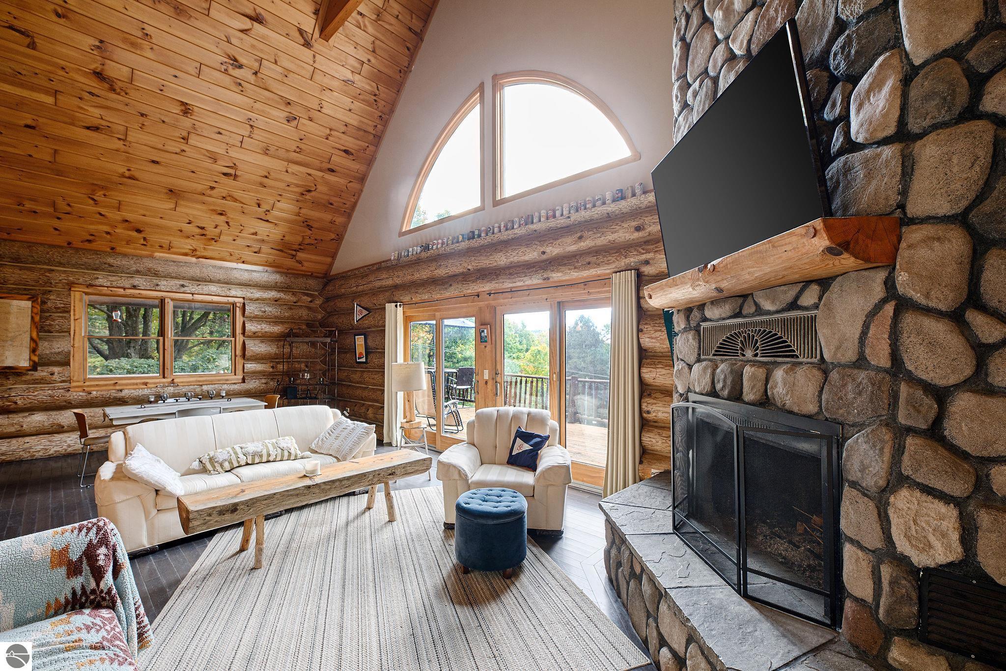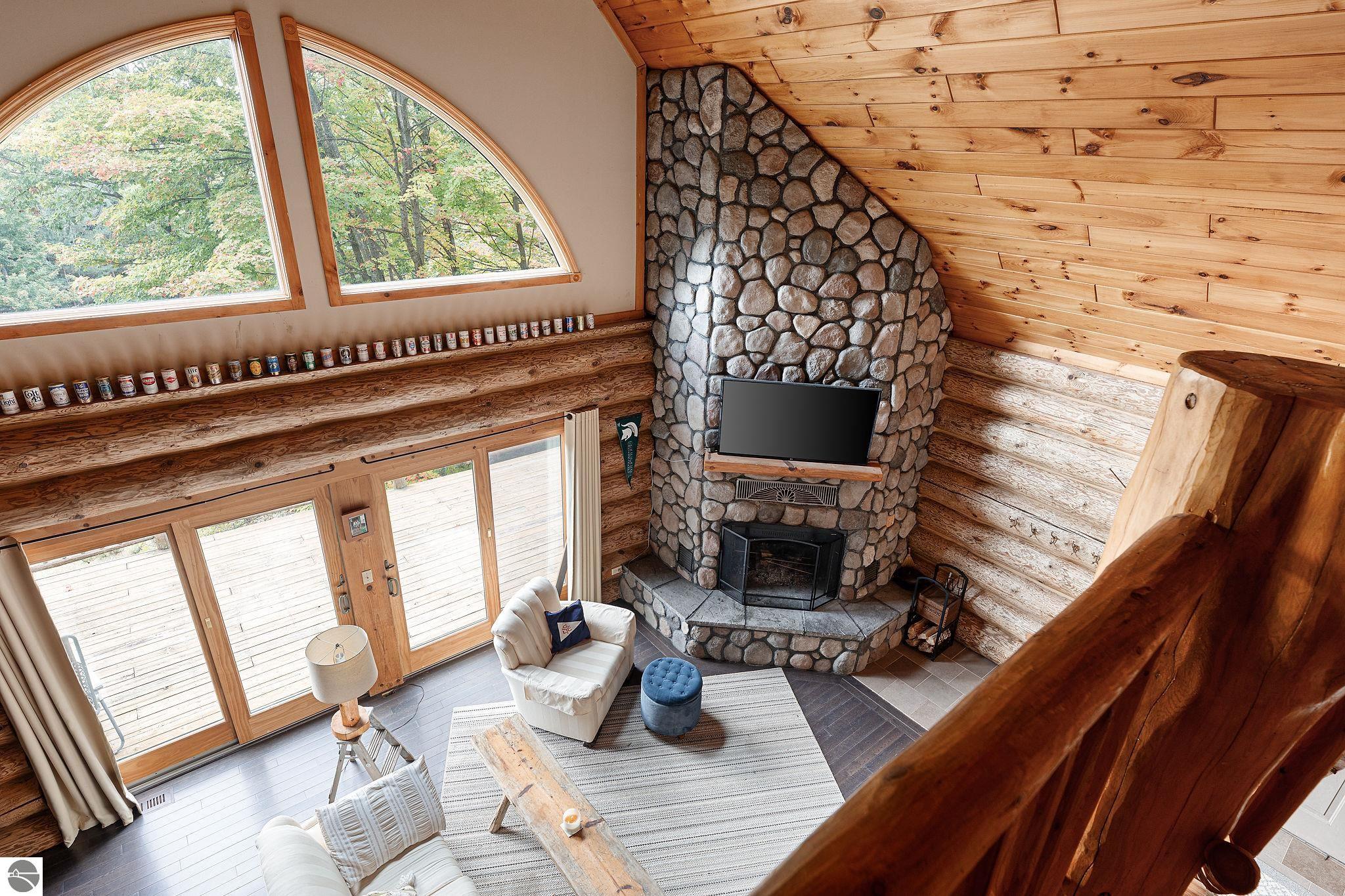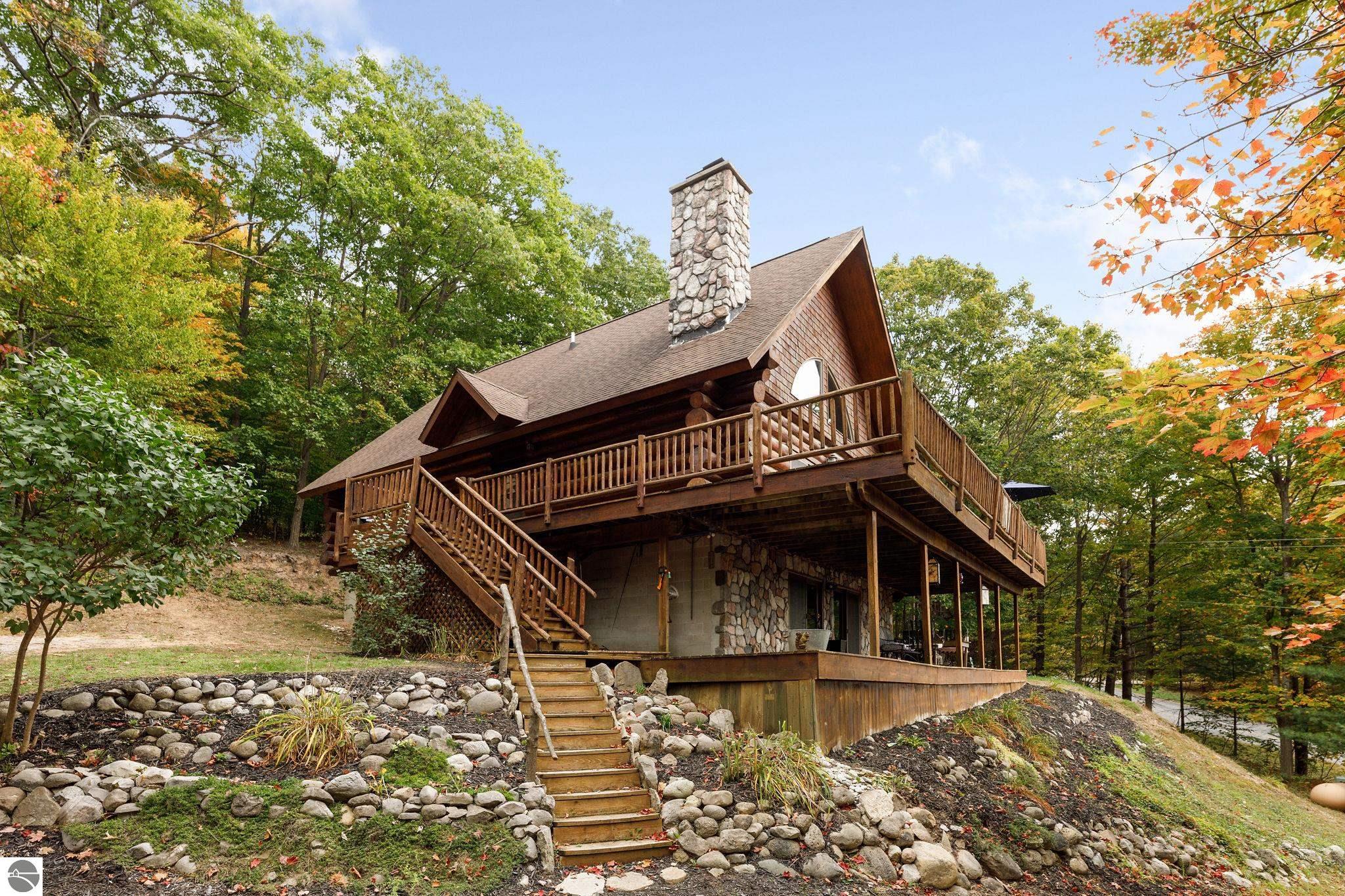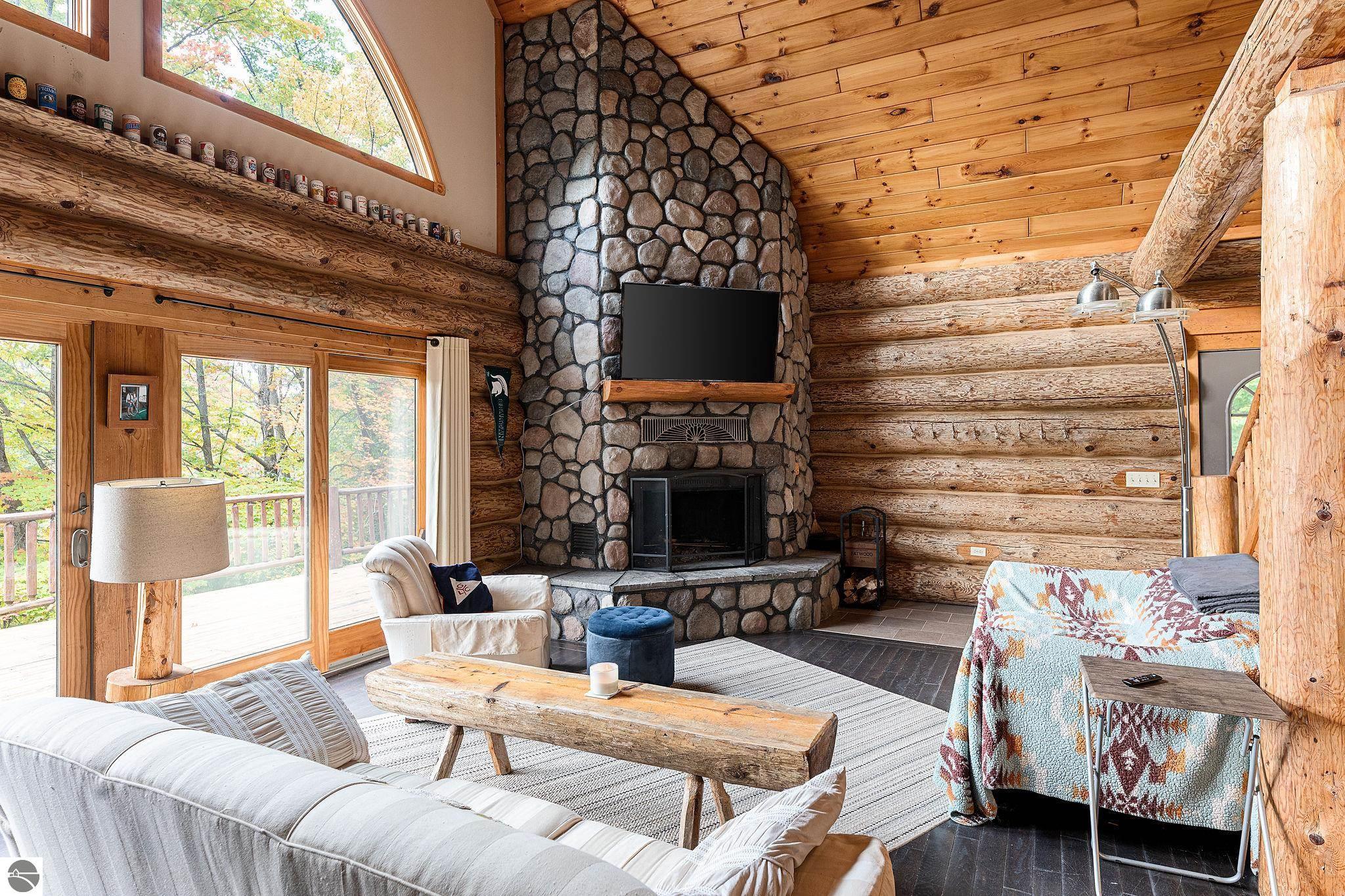 Experience classic Up North living in this custom full-scribed log home offering beautiful views of Big Glen Lake. The main level features hardwood floors, a natural-burning stone masonry fireplace, two bedrooms, and a full bath — all wrapped in warm knotty pine. A spacious lofted master bedroom provides additional privacy and comfort. The walkout lower level is fully self-contained and ideal for guests or use as an in-law suite, complete with its own kitchen, bar, bathroom, washer and dryer, and a second natural-burning stone fireplace. This flexible layout allows multiple uses — enjoy the entire home as a vacation retreat, or live on the main and upper levels while offering the lower level as a rental opportunity. Expansive multi-level decking extends the living space outdoors, perfect for entertaining or relaxing while taking in the natural wooded setting and lake views, Home is being sold in as - is condition. Rustic character and practical functionality come together in a location close to Big Glen Lake access and year-round recreation — making this a standout property in one of northern Michigan’s most desirable areas. Seller is a licensed Real Estate agent in the State of Michigan.