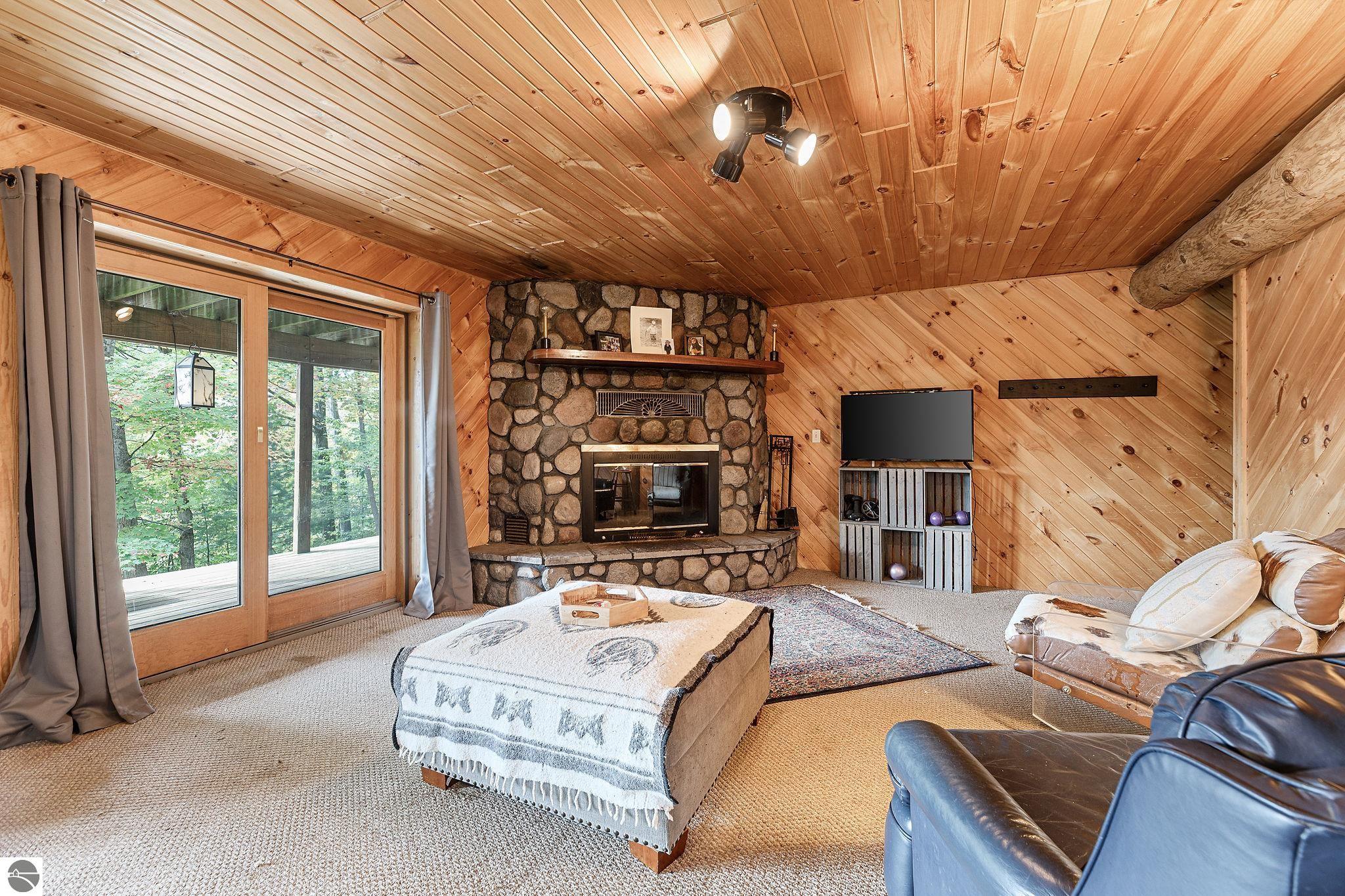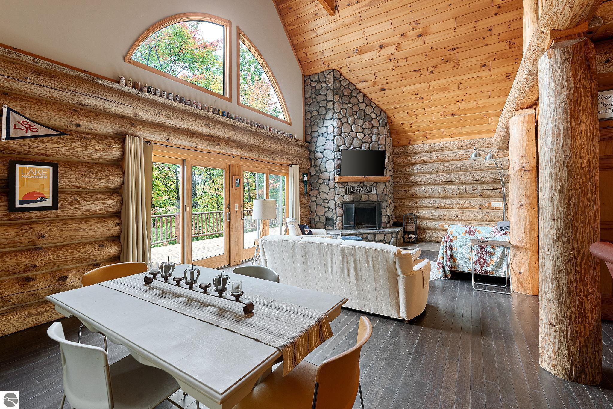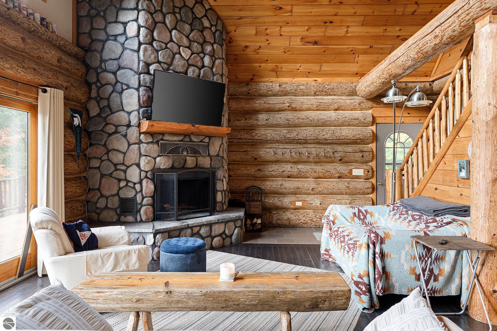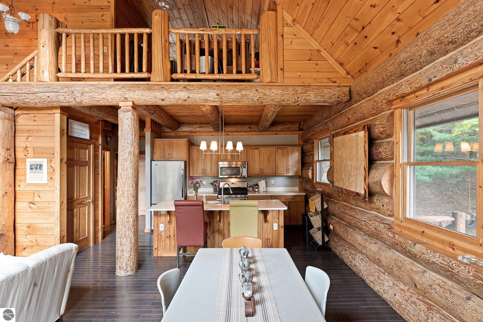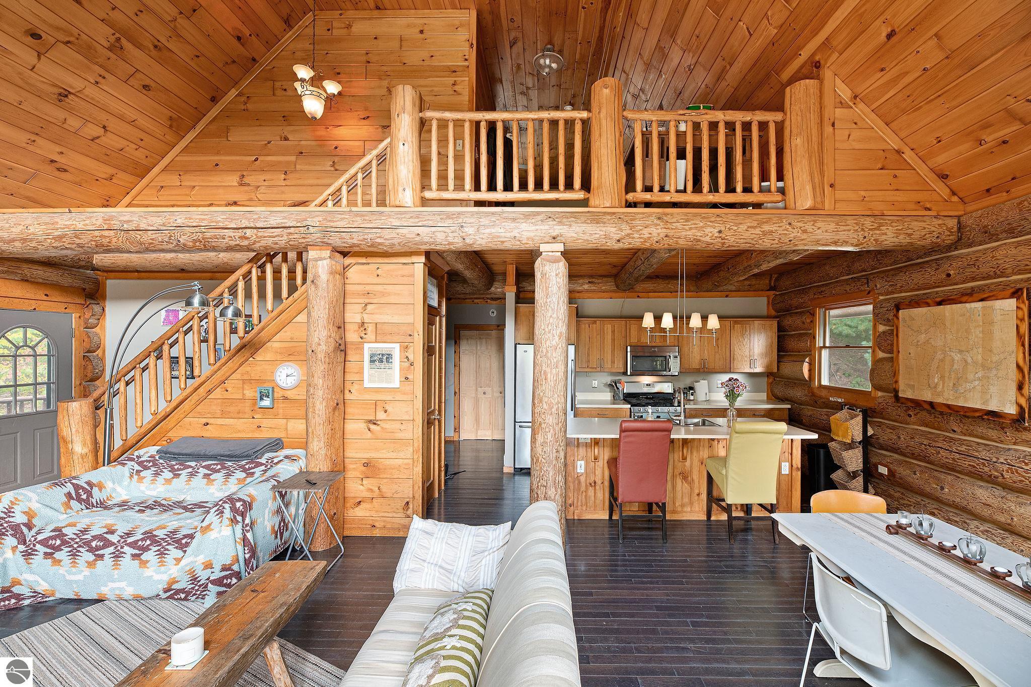 Experience classic Up North living in this custom full-scribed log home offering beautiful views of Big Glen Lake. The main level features hardwood floors, a natural-burning stone masonry fireplace, two bedrooms, and a full bath — all wrapped in warm knotty pine. A spacious lofted master bedroom provides additional privacy and comfort. The walkout lower level is fully self-contained and ideal for guests or use as an in-law suite, complete with its own kitchen, bar, bathroom, washer and dryer, and a second natural-burning stone fireplace. This flexible layout allows multiple uses — enjoy the entire home as a vacation retreat, or live on the main and upper levels while offering the lower level as a rental opportunity. Expansive multi-level decking extends the living space outdoors, perfect for entertaining or relaxing while taking in the natural wooded setting and lake views, Home is being sold in as - is condition. Rustic character and practical functionality come together in a location close to Big Glen Lake access and year-round recreation — making this a standout property in one of northern Michigan’s most desirable areas. Seller is a licensed Real Estate agent in the State of Michigan.