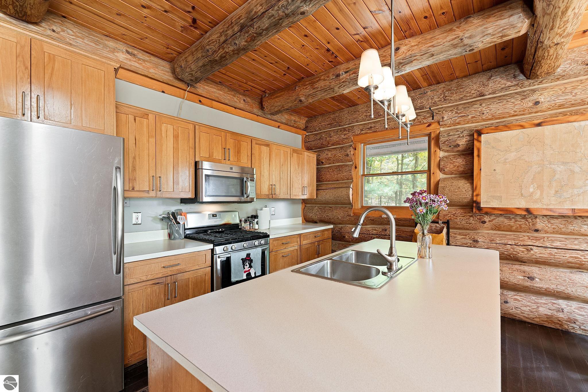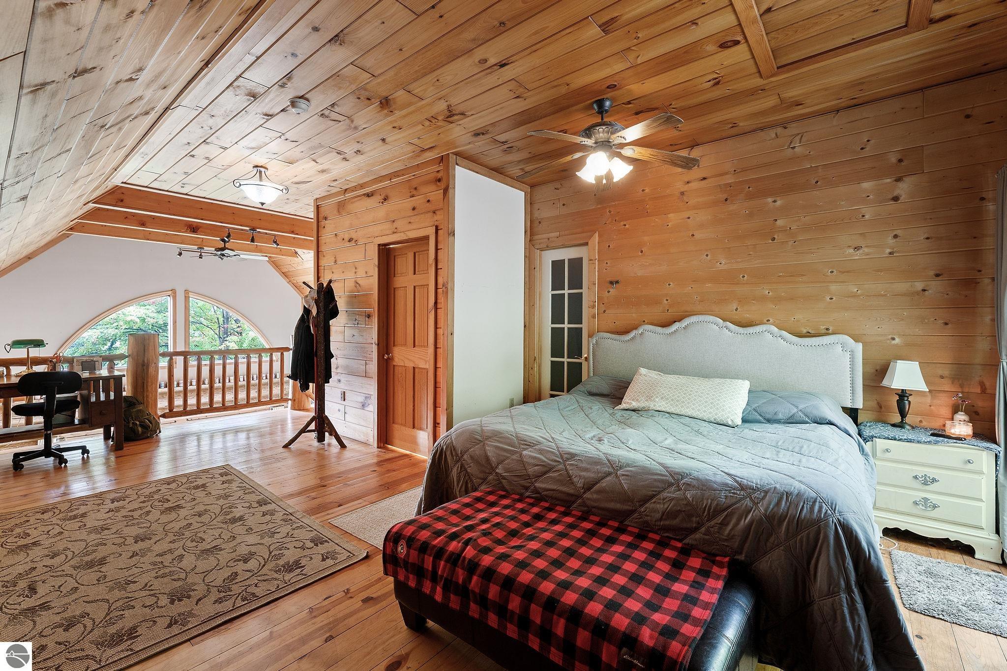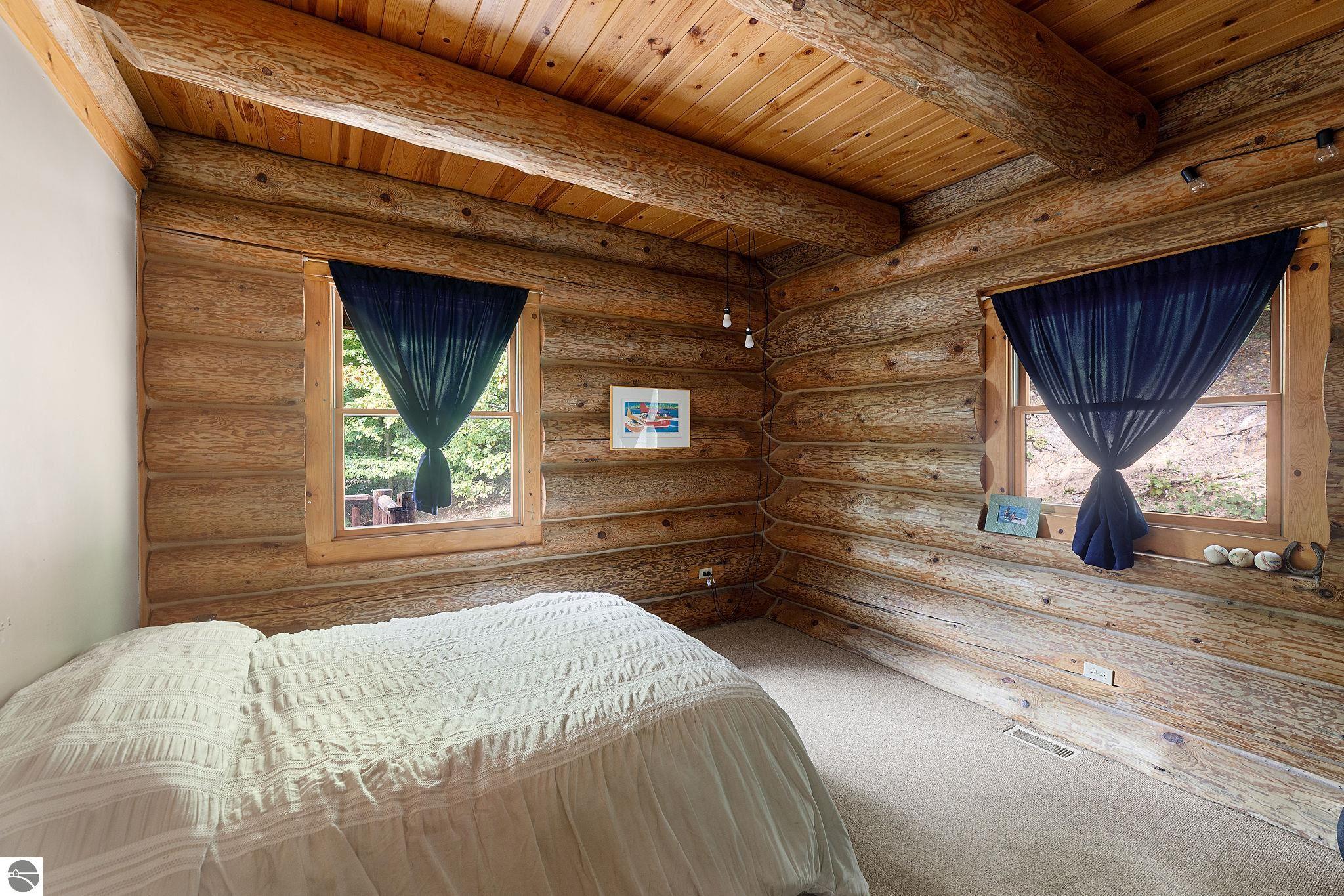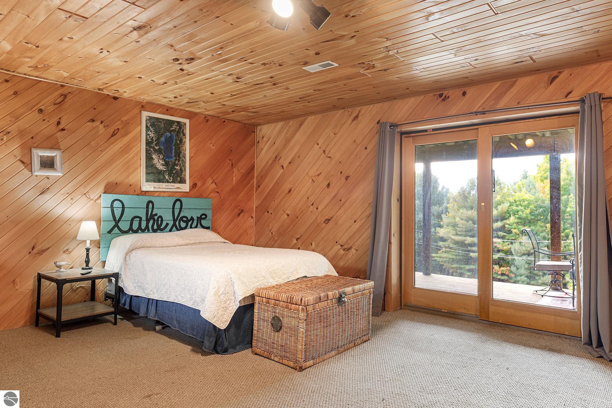 Experience classic Up North living in this custom full-scribed log home offering beautiful views of Big Glen Lake. The main level features hardwood floors, a natural-burning stone masonry fireplace, two bedrooms, and a full bath — all wrapped in warm knotty pine. A spacious lofted master bedroom provides additional privacy and comfort. The walkout lower level is fully self-contained and ideal for guests or use as an in-law suite, complete with its own kitchen, bar, bathroom, washer and dryer, and a second natural-burning stone fireplace. This flexible layout allows multiple uses — enjoy the entire home as a vacation retreat, or live on the main and upper levels while offering the lower level as a rental opportunity. Expansive multi-level decking extends the living space outdoors, perfect for entertaining or relaxing while taking in the natural wooded setting and lake views, Home is being sold in as - is condition. Rustic character and practical functionality come together in a location close to Big Glen Lake access and year-round recreation — making this a standout property in one of northern Michigan’s most desirable areas. Seller is a licensed Real Estate agent in the State of Michigan.