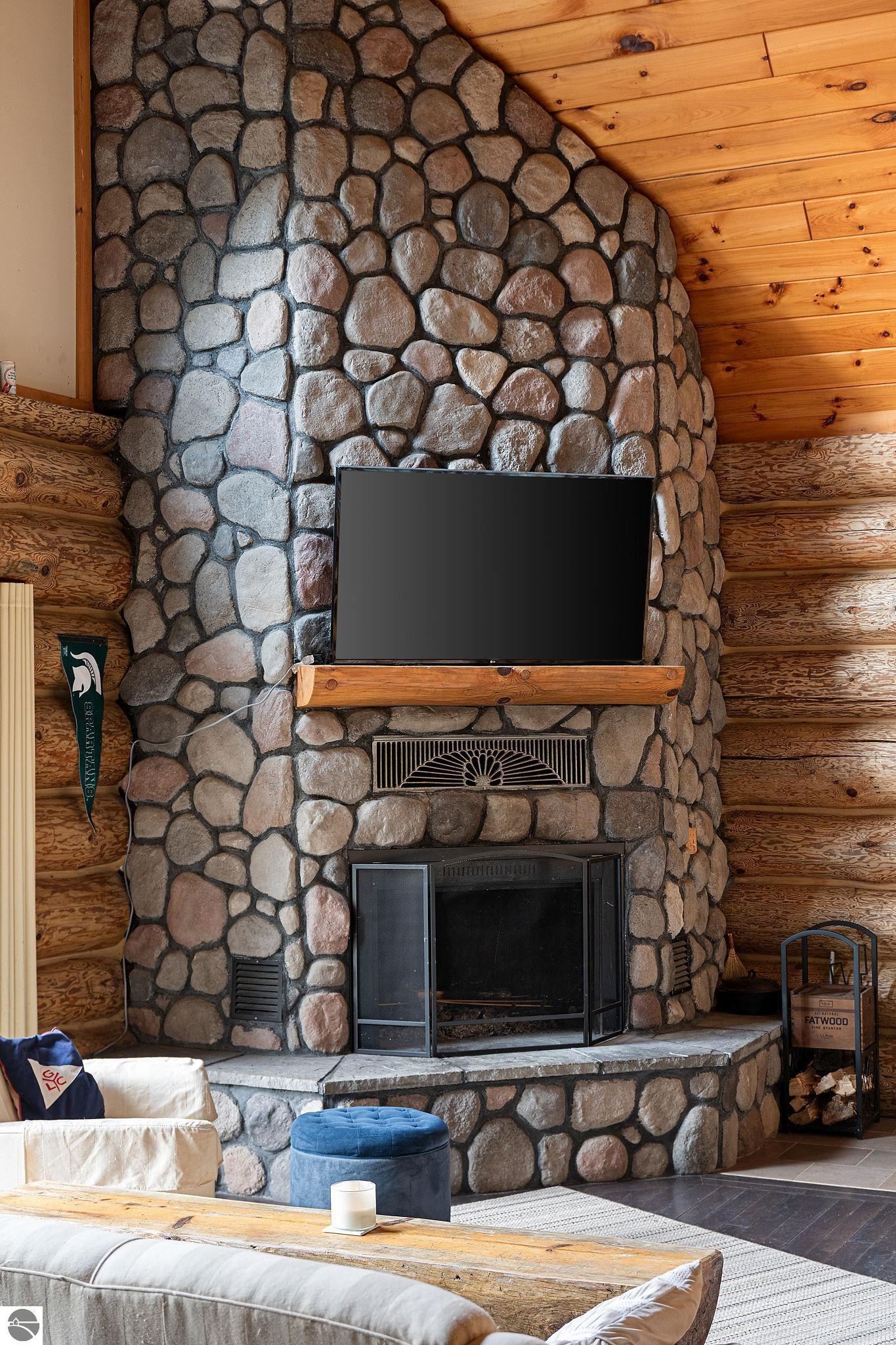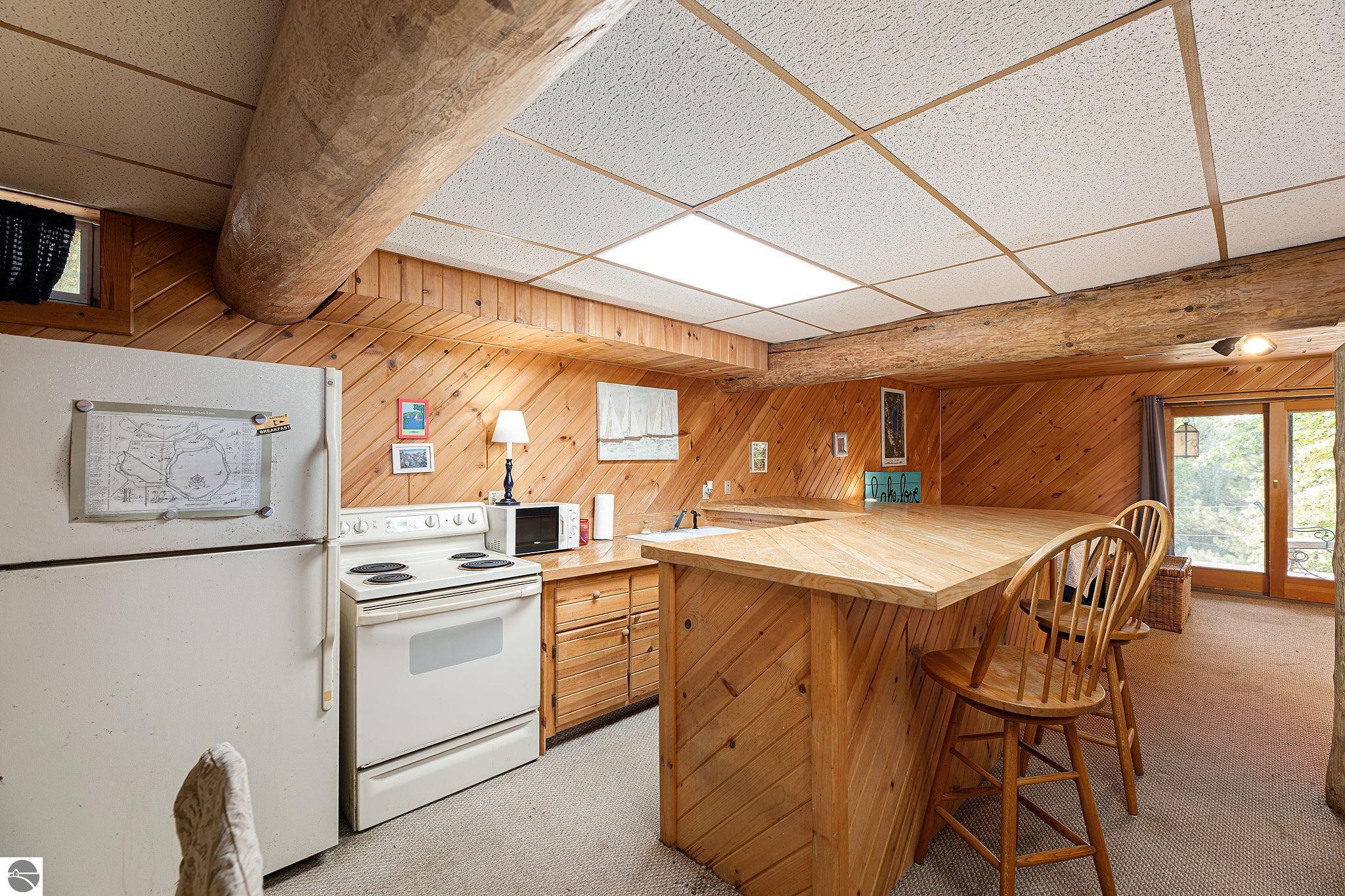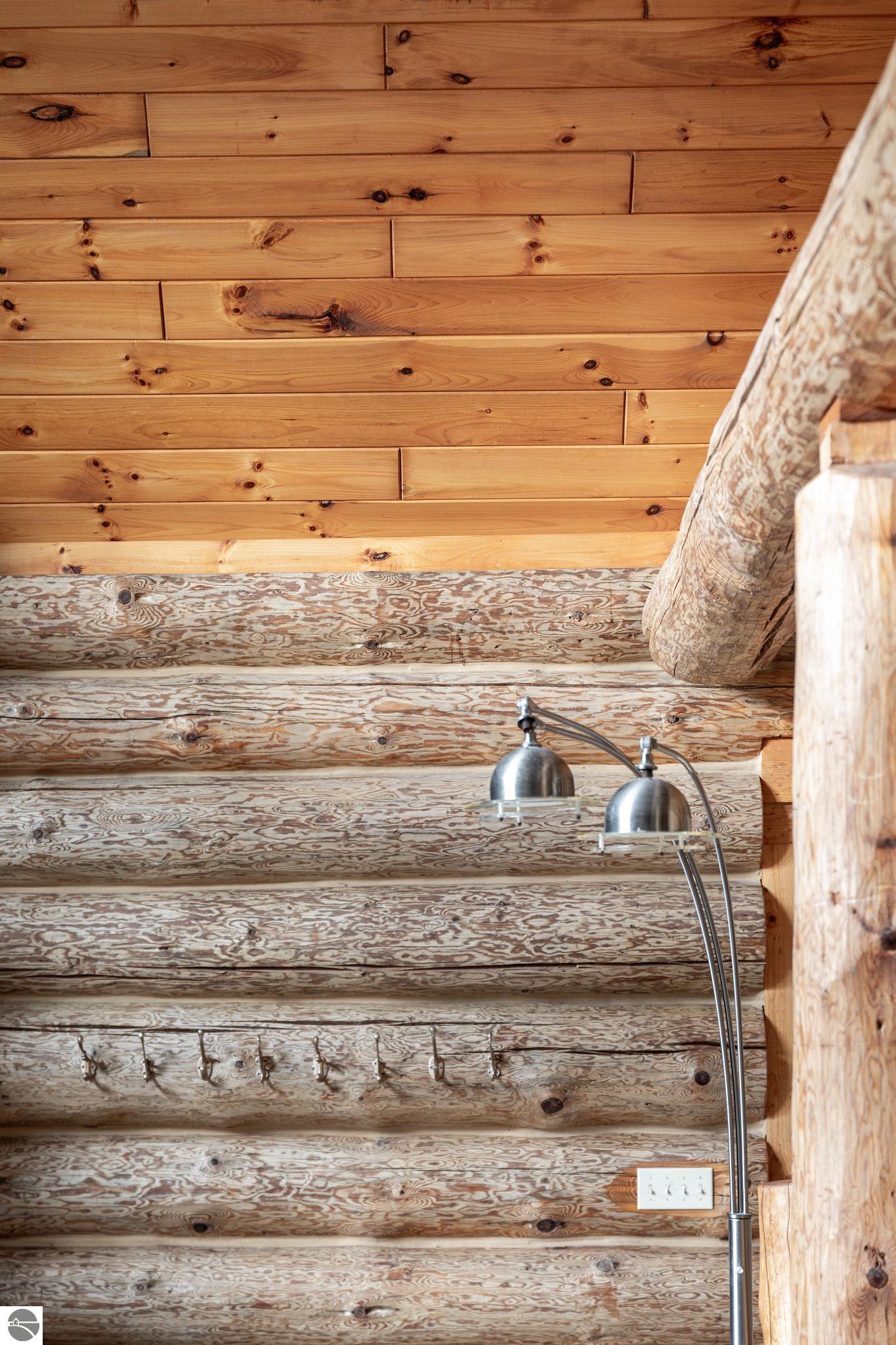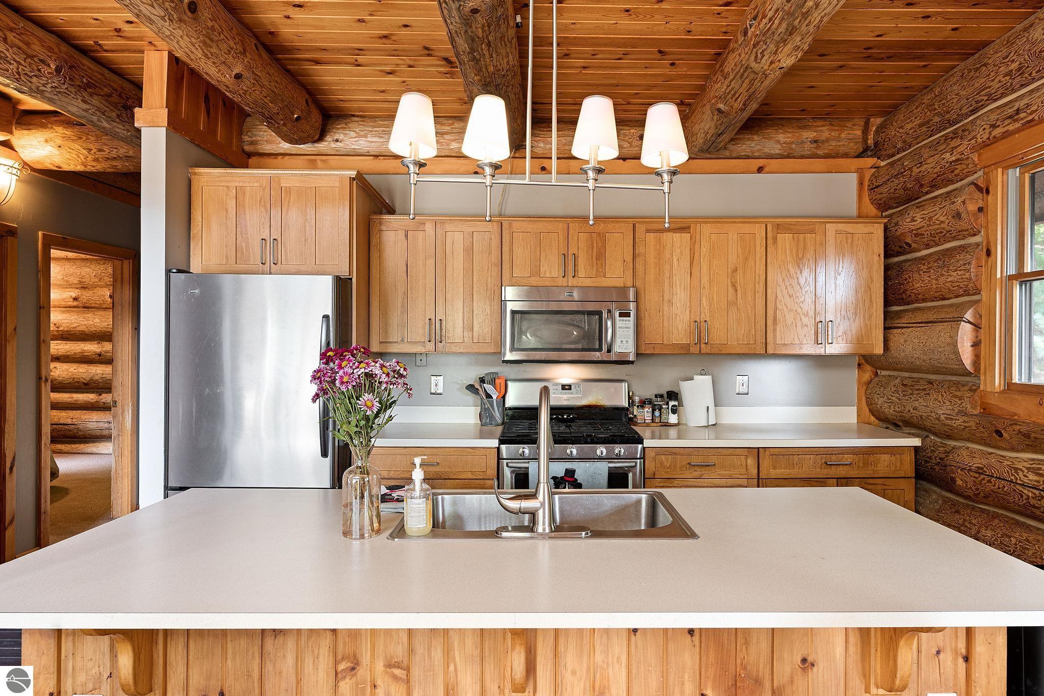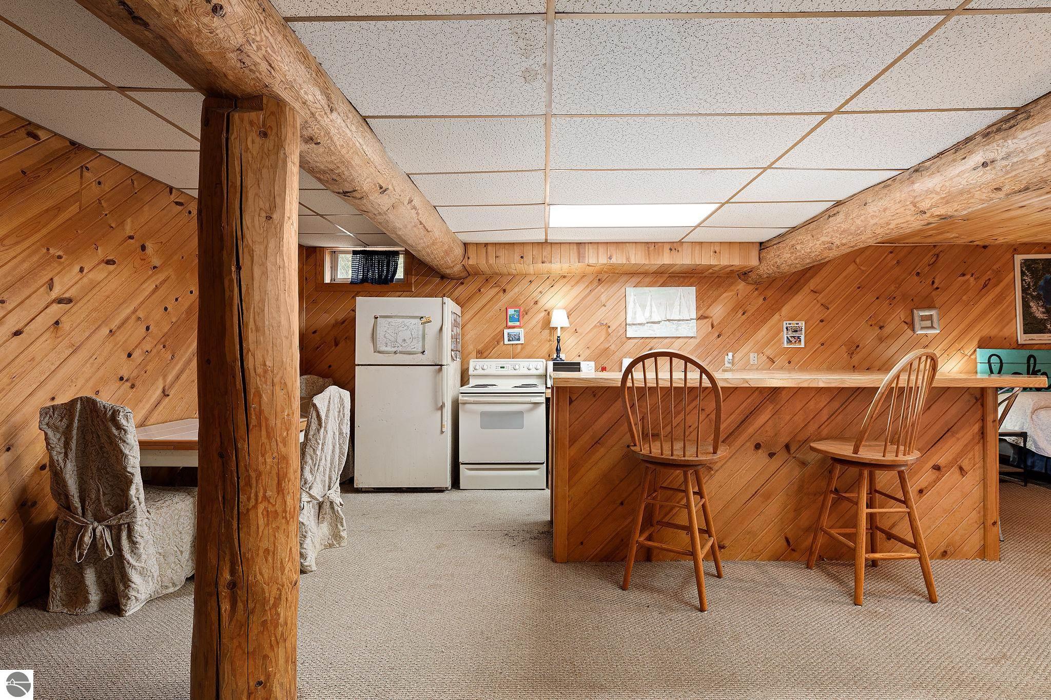 Experience classic Up North living in this custom full-scribed log home offering beautiful views of Big Glen Lake. The main level features hardwood floors, a natural-burning stone masonry fireplace, two bedrooms, and a full bath — all wrapped in warm knotty pine. A spacious lofted master bedroom provides additional privacy and comfort. The walkout lower level is fully self-contained and ideal for guests or use as an in-law suite, complete with its own kitchen, bar, bathroom, washer and dryer, and a second natural-burning stone fireplace. This flexible layout allows multiple uses — enjoy the entire home as a vacation retreat, or live on the main and upper levels while offering the lower level as a rental opportunity. Expansive multi-level decking extends the living space outdoors, perfect for entertaining or relaxing while taking in the natural wooded setting and lake views, Home is being sold in as - is condition. Rustic character and practical functionality come together in a location close to Big Glen Lake access and year-round recreation — making this a standout property in one of northern Michigan’s most desirable areas. Seller is a licensed Real Estate agent in the State of Michigan.