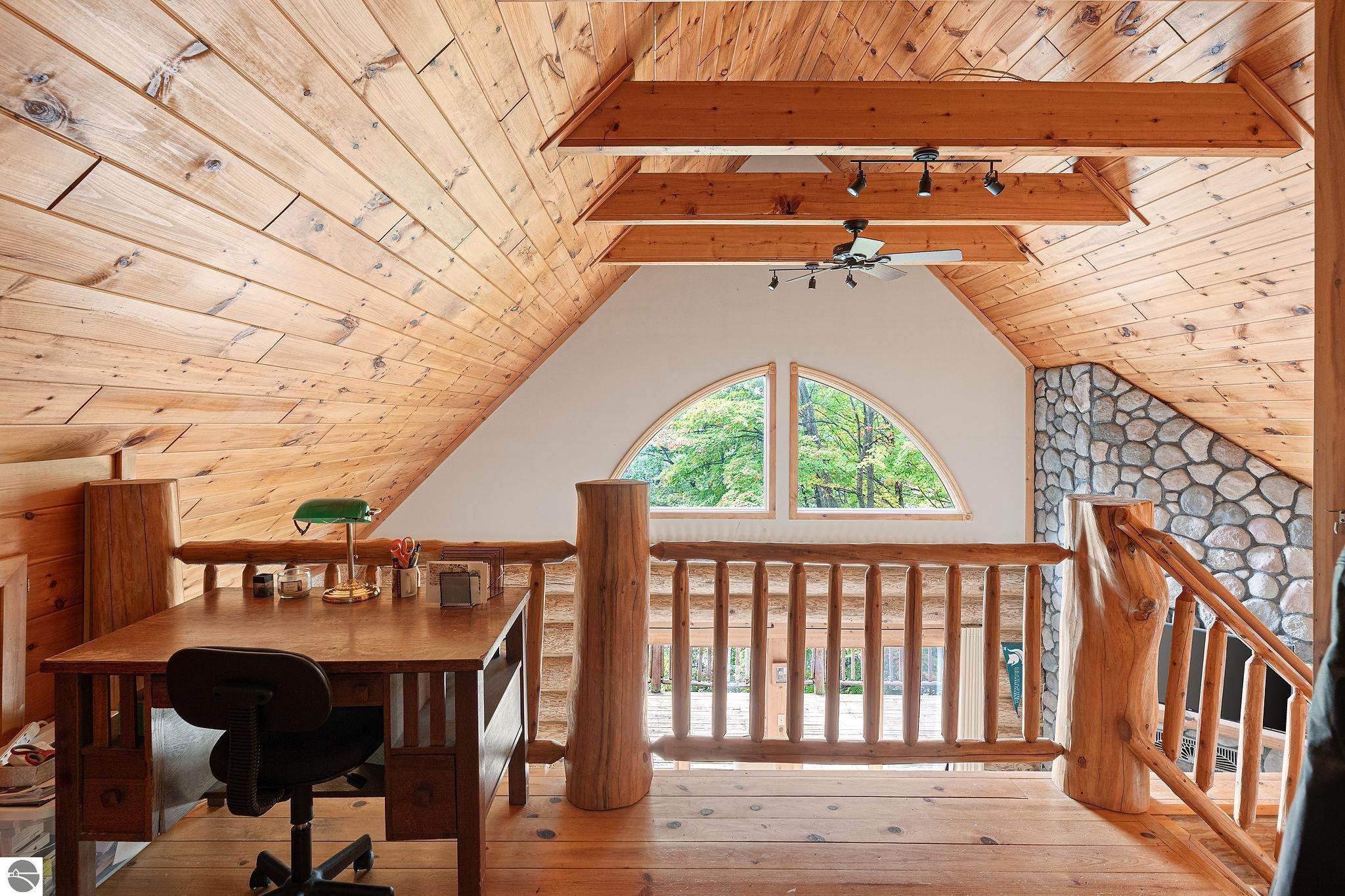 - Interior: Cathedral Ceilings, Walk-In Closet(s), Loft, Island Kitchen, Beamed Ceilings