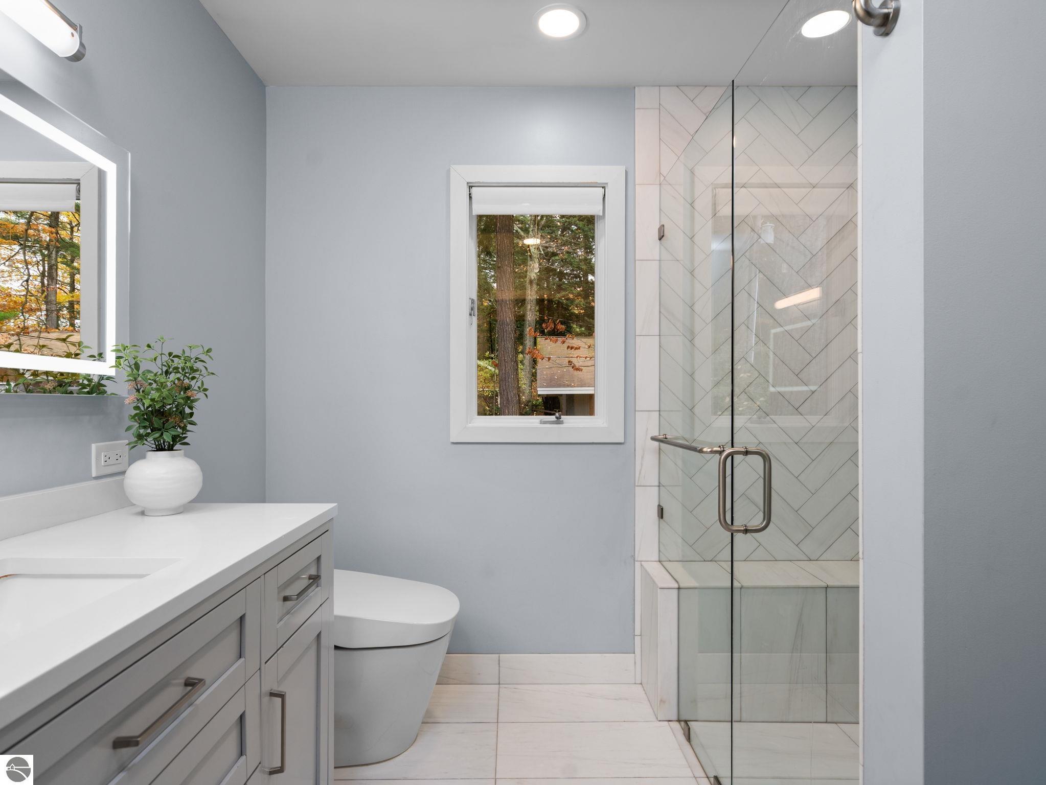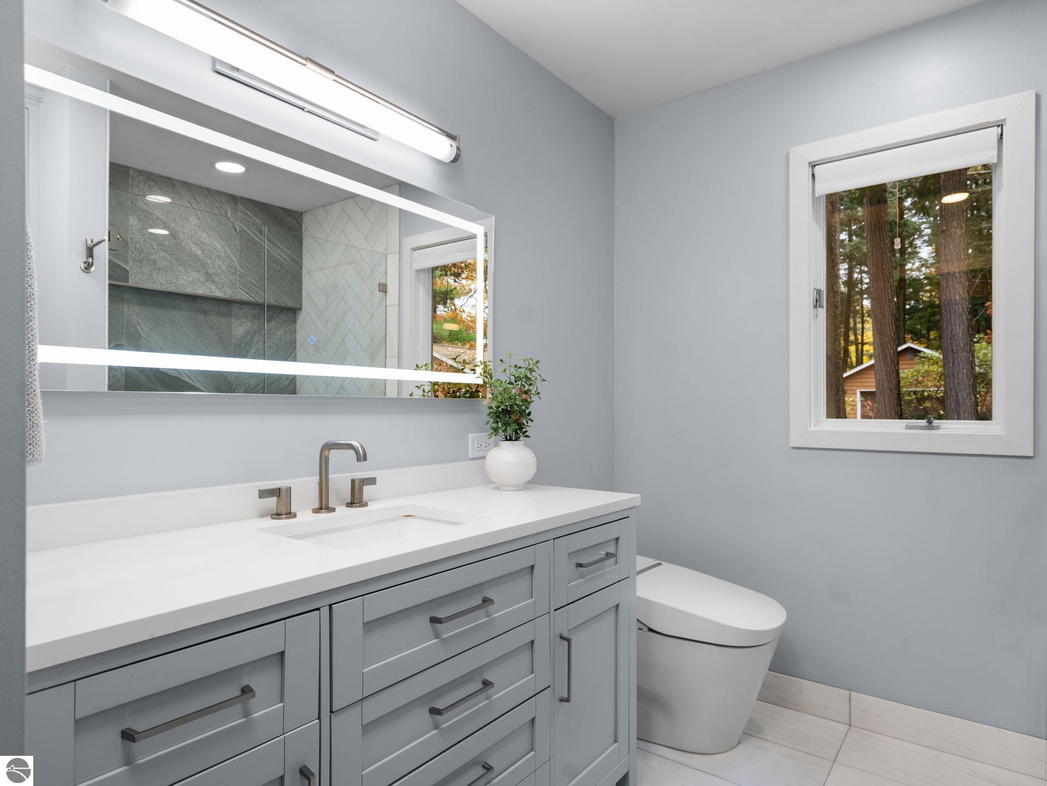 At the end of a peaceful cul-de-sac on the sought-after eastern shore of Long Lake, this completely renovated waterfront home delivers exceptional lake living with 117 feet of private sandy frontage and unforgettable west-facing sunset views. Step inside to find a warm, welcoming space filled with natural light and thoughtful design. The open kitchen features quartz and soapstone countertops, a dual oven, and stylish finishes ideal for cooking or casual entertaining. Two gas fireplaces add cozy character, while wide-plank Old Dutch hardwood flooring runs throughout the main level for a refined, timeless feel. The spacious primary suite opens to the expansive teak deck, offering beautiful lake views and easy indoor-outdoor flow. Downstairs, the full finished walkout level is an entertainer’s dream with two additional bedrooms, a full and half bath, a large family room, and a second mudroom for convenient lake access. Outside, enjoy your own private beach - perfect for hosting, lounging, and launching summer adventures. An outdoor shower adds a practical touch, and a boat house beneath the garage offers smart, secure storage.