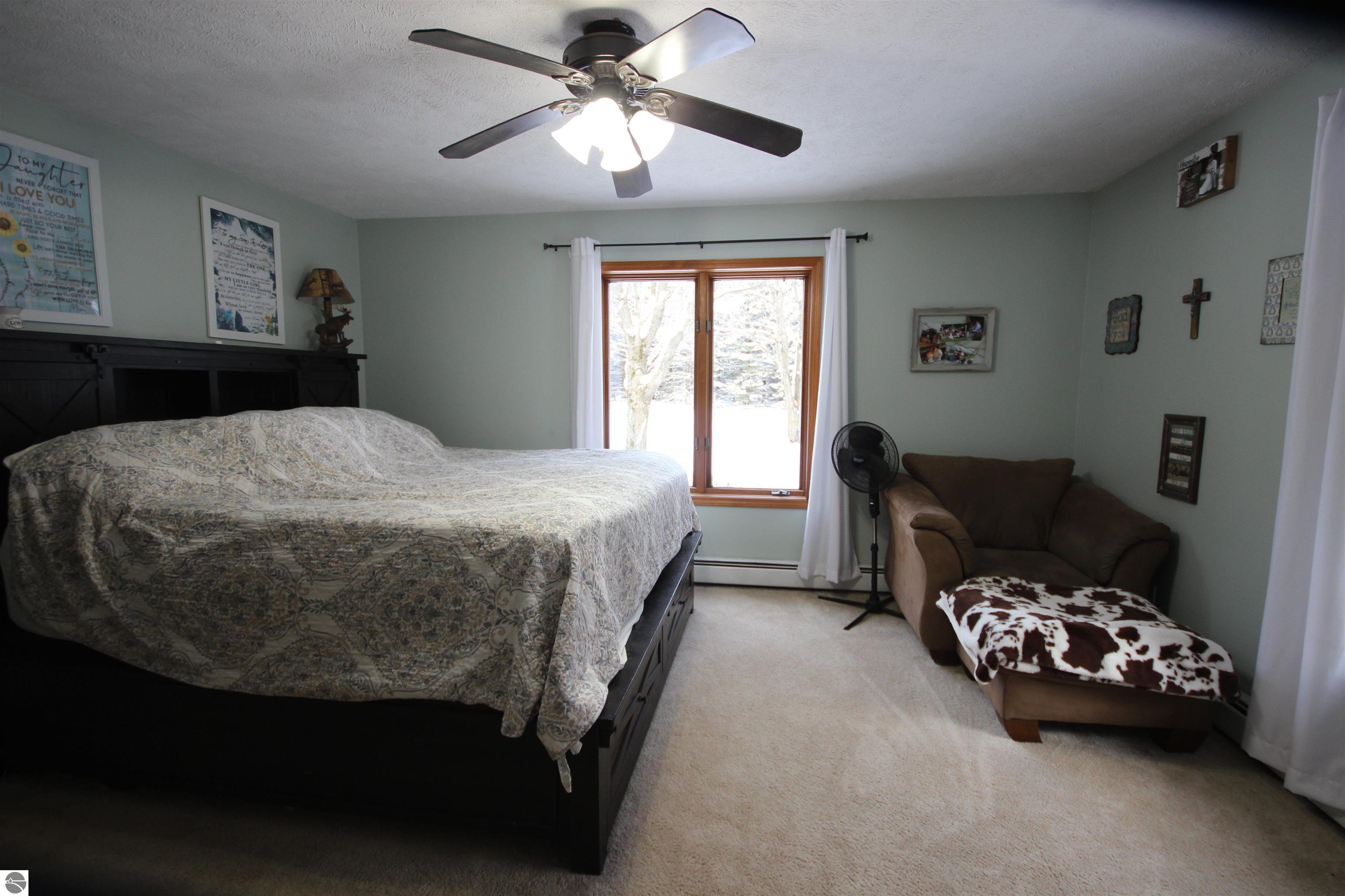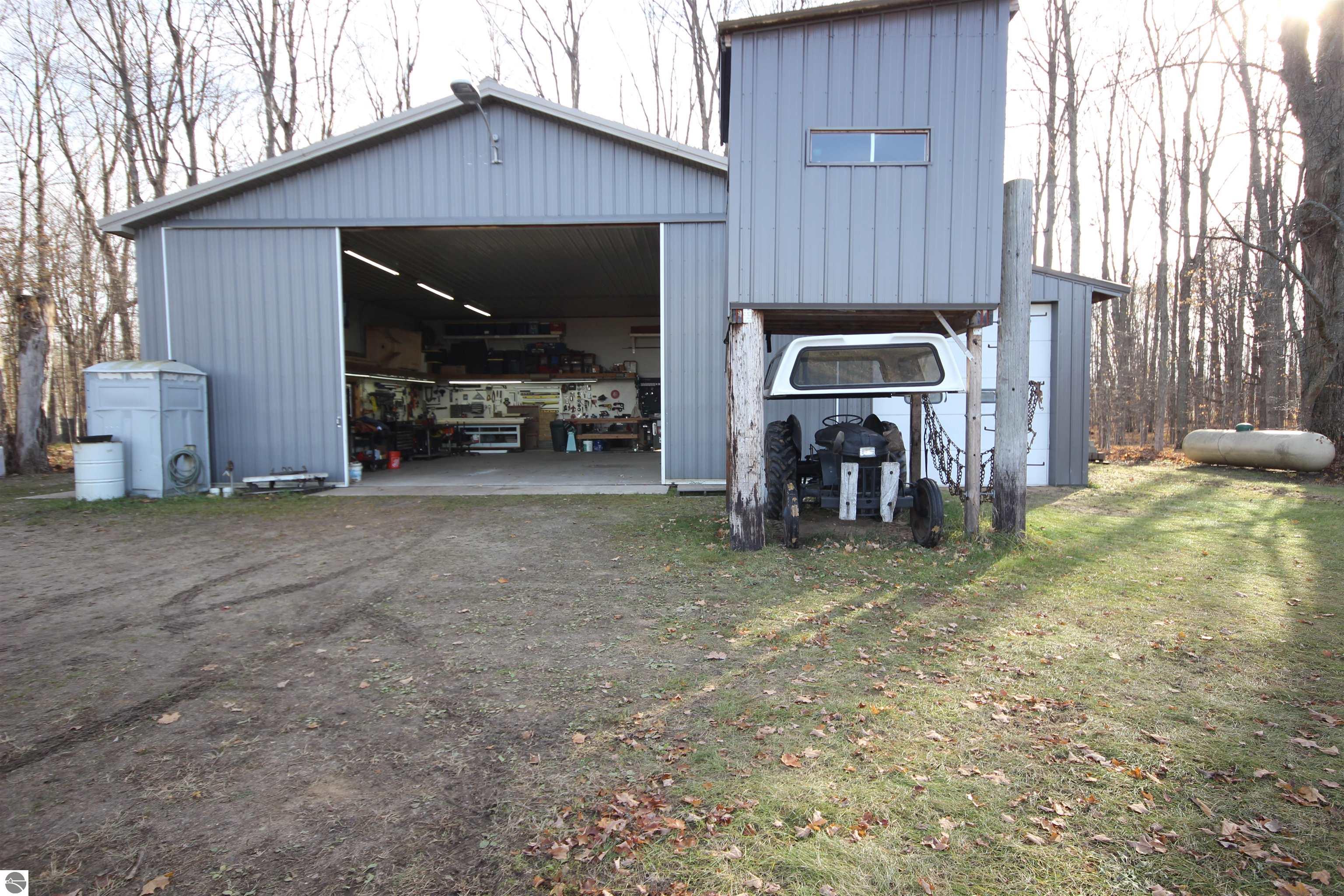 Here is a Spacious, Comfortable 3-bedroom, 2.5 bath Ranch, a Fabulous Pole Barn on 11.35 acres 10 minutes west of downtown TC. Property blends privacy, acreage & convenience in a highly desirable location. Enjoy nearby Long Lake public access as well as close access to hiking and snowmobile trails, making this an ideal retreat for outdoor enthusiasts. The home features a finished walk-out lower-level. Boiler system and wood stove heat options with well appointed venting for heat circulation. Impressive 42x40 Pole Blg which is heated,insulated with water with add'l 42x12 enclosed lean to. Expansive front & backyard provide room for entertaining, gardening, or play. Indulge in a game of Horseshoes next to the Bon Fire. Revere the Walking path thru the woods. Custom Deer Blind included for that hunter. A rare opportunity to own a turnkey home with acreage so close to Traverse City—Versatile & ready for its next owner.See Assoc Docs for long list of improvements.