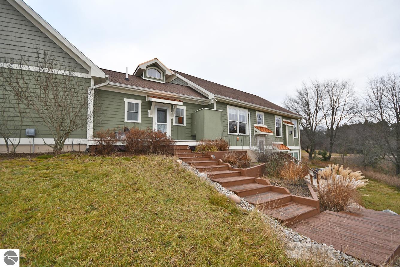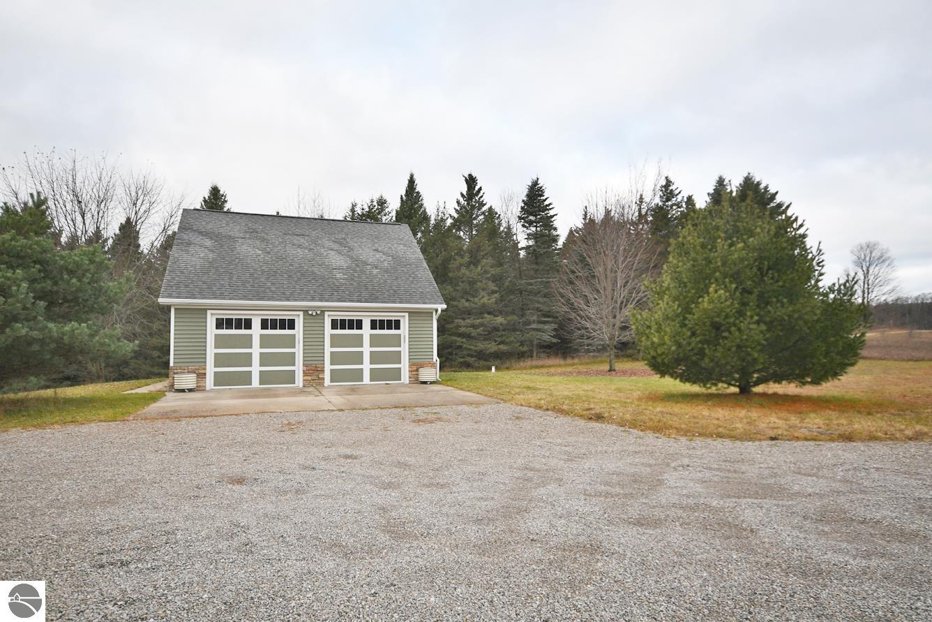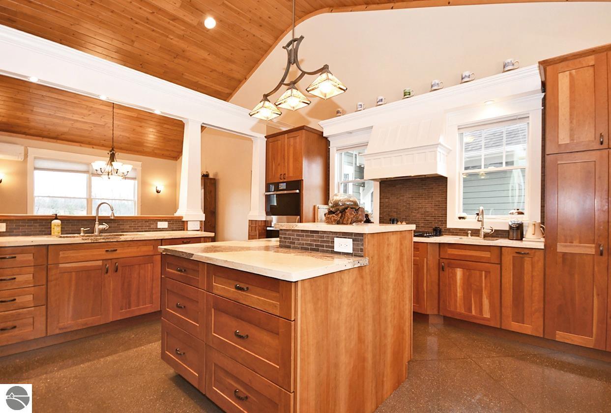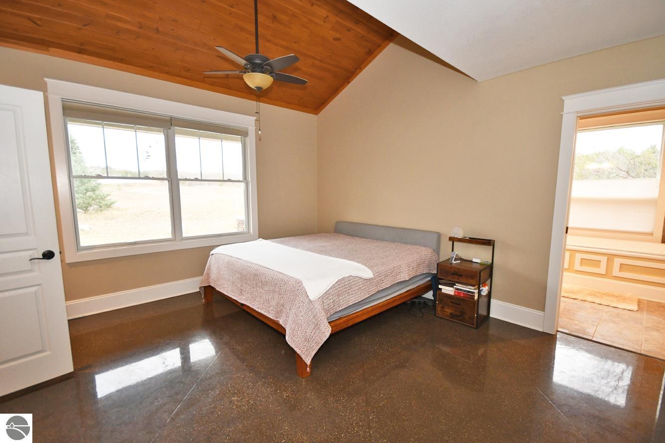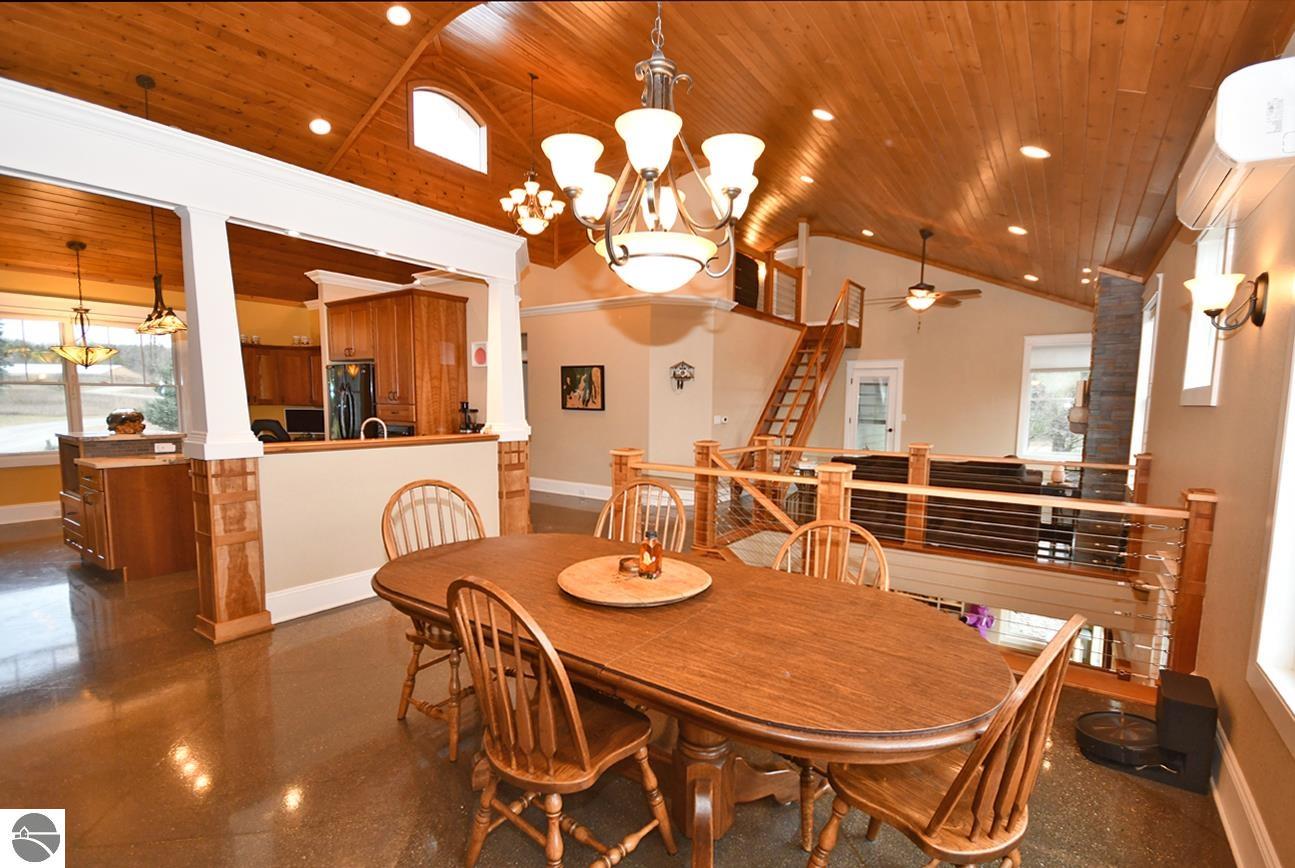 This property offers a true Homestead lifestyle on nearly 10 acres of rolling hillside and meadows. This stately four-bedroom, three-bath home features fine craftsmanship, 17' vaulted barreled wood ceilings, and an open floor plan designed for both serenity and entertaining. Enjoy multiple decks and patios, an incredible fire pit, and two outdoor showers, one attached to the main house and another at the carriage house, ideal after gardening or exploring the land. Inside, the spacious kitchen with stone and concrete counters opens to the dining and living areas, anchored by a high-efficiency gas fireplace and a charming eagles-nest loft. The main-floor primary suite includes a soaking tub and walk-in shower, along with an additional bath, mudroom, and a large heated 25x14 bonus room above the attached garage, ideal office or 4th bedroom. A geothermal system with radiant floor heat, air conditioning, generator, and gigabit fiber internet provide exceptional comfort. The walkout lower level offers a large living area, wet bar, office nook, two bedrooms, full bath, and ample storage. The detached garage includes a full carriage house/guest house with kitchen, bathroom, living and dining space, lofted sleeping area, and its own outdoor shower. Located on a quiet Kasson Township road near M-72, just a few minutes to Glen Lake School, with easy access to Glen Arbor, Empire, Maple City, Cedar, Glen Lake, and Sleeping Bear Dunes. A 19.39 acre parcel directly behind the house may also be available to future buyers.
