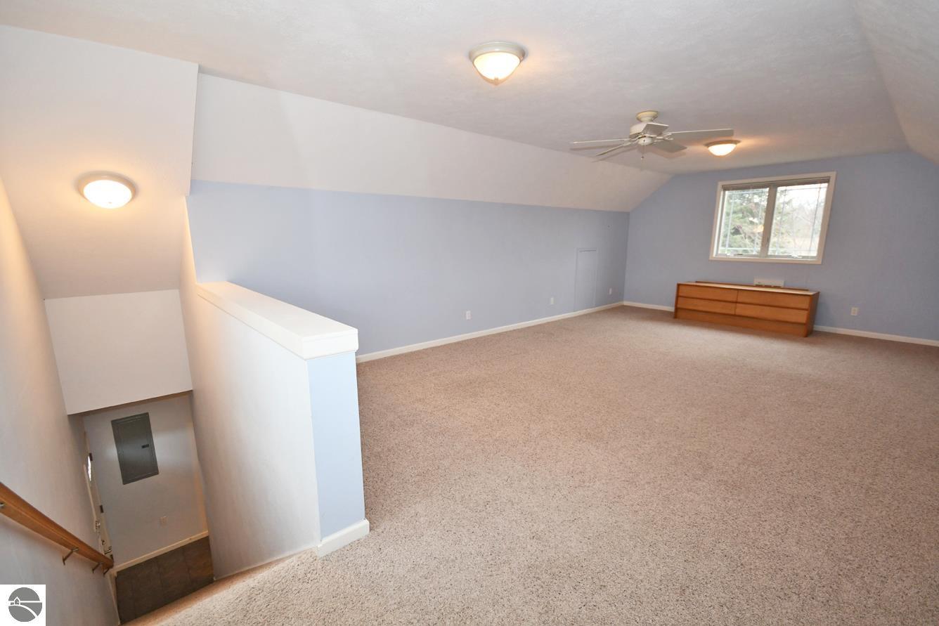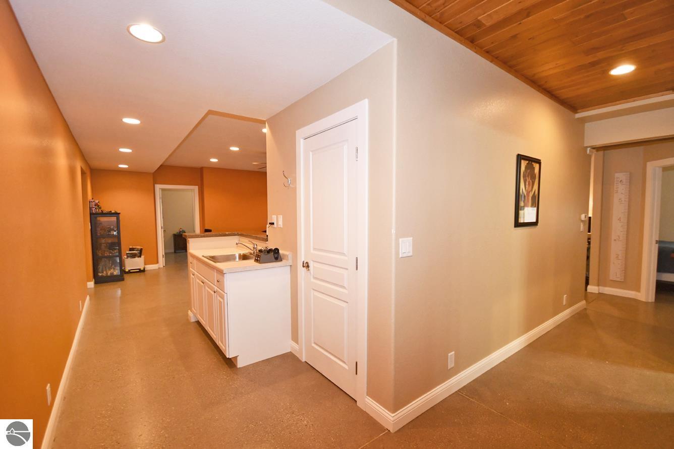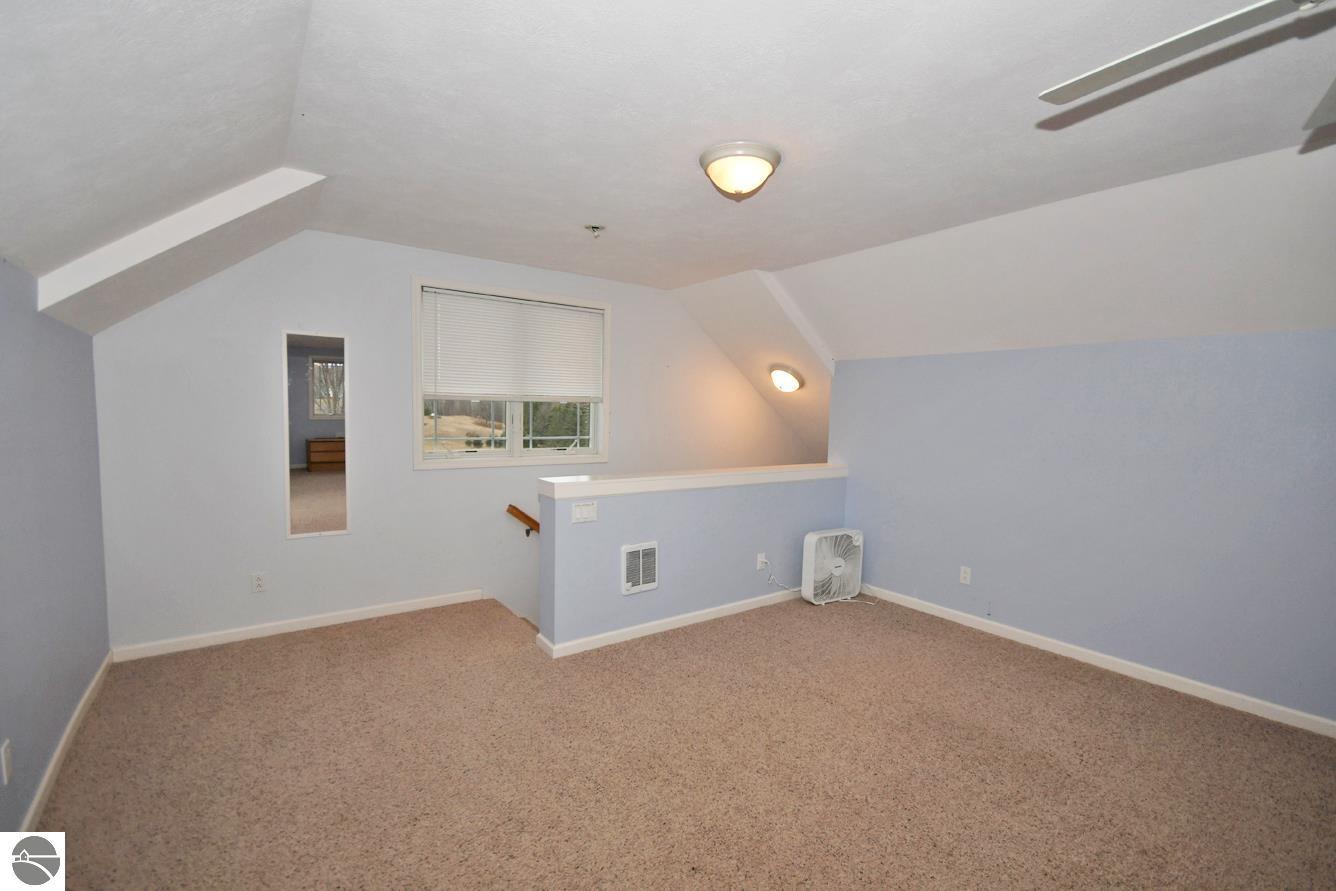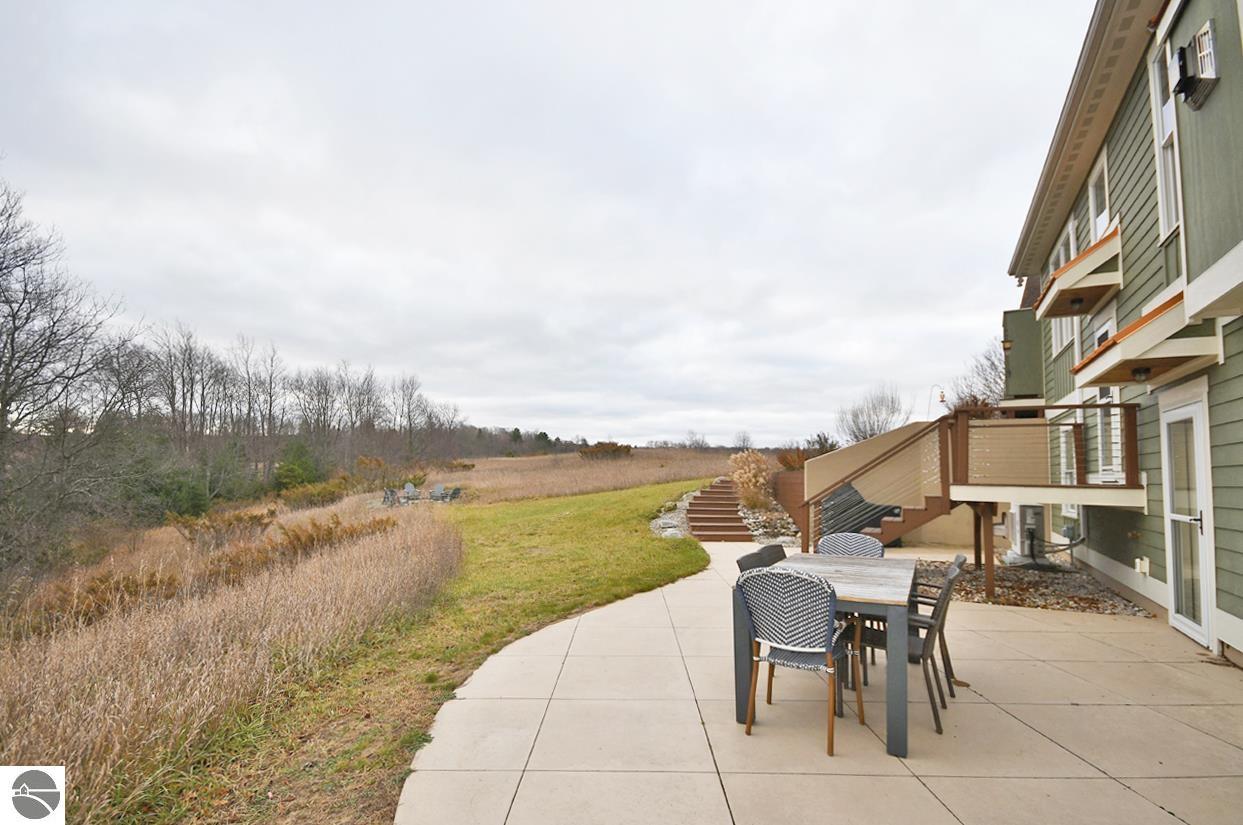 This property offers a true Homestead lifestyle on nearly 10 acres of rolling hillside and meadows. This stately four-bedroom, three-bath home features fine craftsmanship, 17' vaulted barreled wood ceilings, and an open floor plan designed for both serenity and entertaining. Enjoy multiple decks and patios, an incredible fire pit, and two outdoor showers, one attached to the main house and another at the carriage house, ideal after gardening or exploring the land. Inside, the spacious kitchen with stone and concrete counters opens to the dining and living areas, anchored by a high-efficiency gas fireplace and a charming eagles-nest loft. The main-floor primary suite includes a soaking tub and walk-in shower, along with an additional bath, mudroom, and a large heated 25x14 bonus room above the attached garage, ideal office or 4th bedroom. A geothermal system with radiant floor heat, air conditioning, generator, and gigabit fiber internet provide exceptional comfort. The walkout lower level offers a large living area, wet bar, office nook, two bedrooms, full bath, and ample storage. The detached garage includes a full carriage house/guest house with kitchen, bathroom, living and dining space, lofted sleeping area, and its own outdoor shower. Located on a quiet Kasson Township road near M-72, just a few minutes to Glen Lake School, with easy access to Glen Arbor, Empire, Maple City, Cedar, Glen Lake, and Sleeping Bear Dunes. A 19.39 acre parcel directly behind the house may also be available to future buyers.