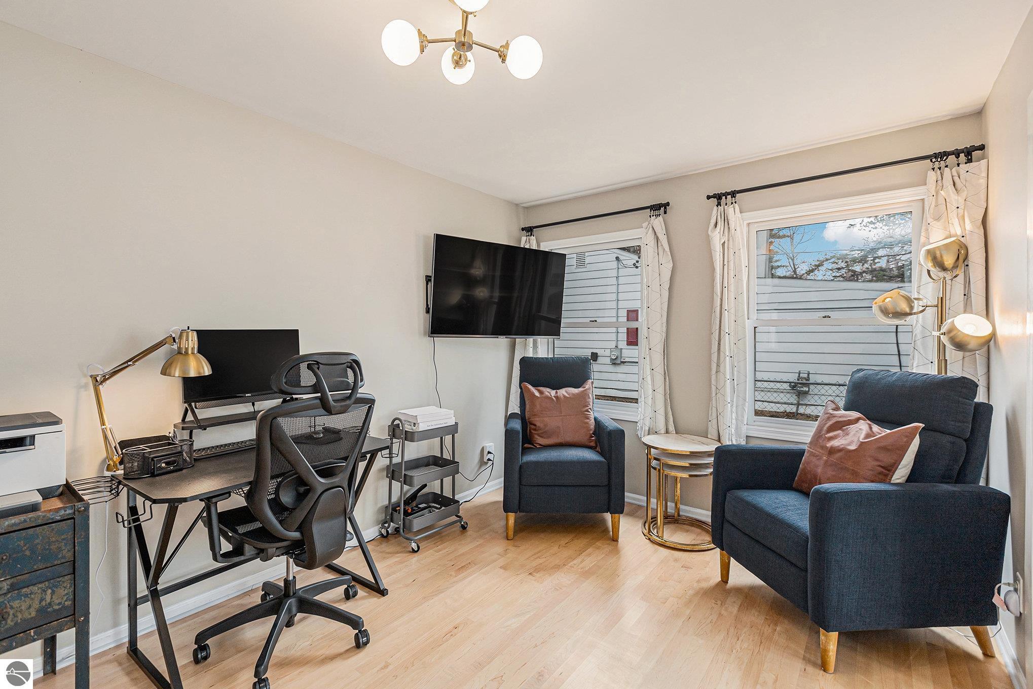 Welcome to this beautifully updated 2-bed, 1-bath home featuring a full unfinished basement and an incredible amount of bonus space—ideal for hobbies, storage, or future expansion. Thoughtfully remodeled throughout, this home blends modern comfort with cozy character. Step inside to a bright living area and an updated kitchen, then make your way to the sunny back sunroom, which can easily serve as a third bedroom, office, or extra hangout space. The home is completely fenced in, perfect for pets or kids, offering peace of mind and privacy. Outside, enjoy a spacious 3-car garage with an attached workshop, giving you plenty of room for tools, toys, and projects. A charming covered porch separates the house from the garage, creating a great outdoor transition space. The backyard is ready for relaxation with a fire pit, garden area, and room to entertain. Located within walking distance to the college and downtown Traverse City, this home offers convenience, charm, and move-in-ready comfort. Whether you're starting out, downsizing, or looking for an investment, this one checks all the boxes. Cute, clean, and fully remodeled—don’t miss it!