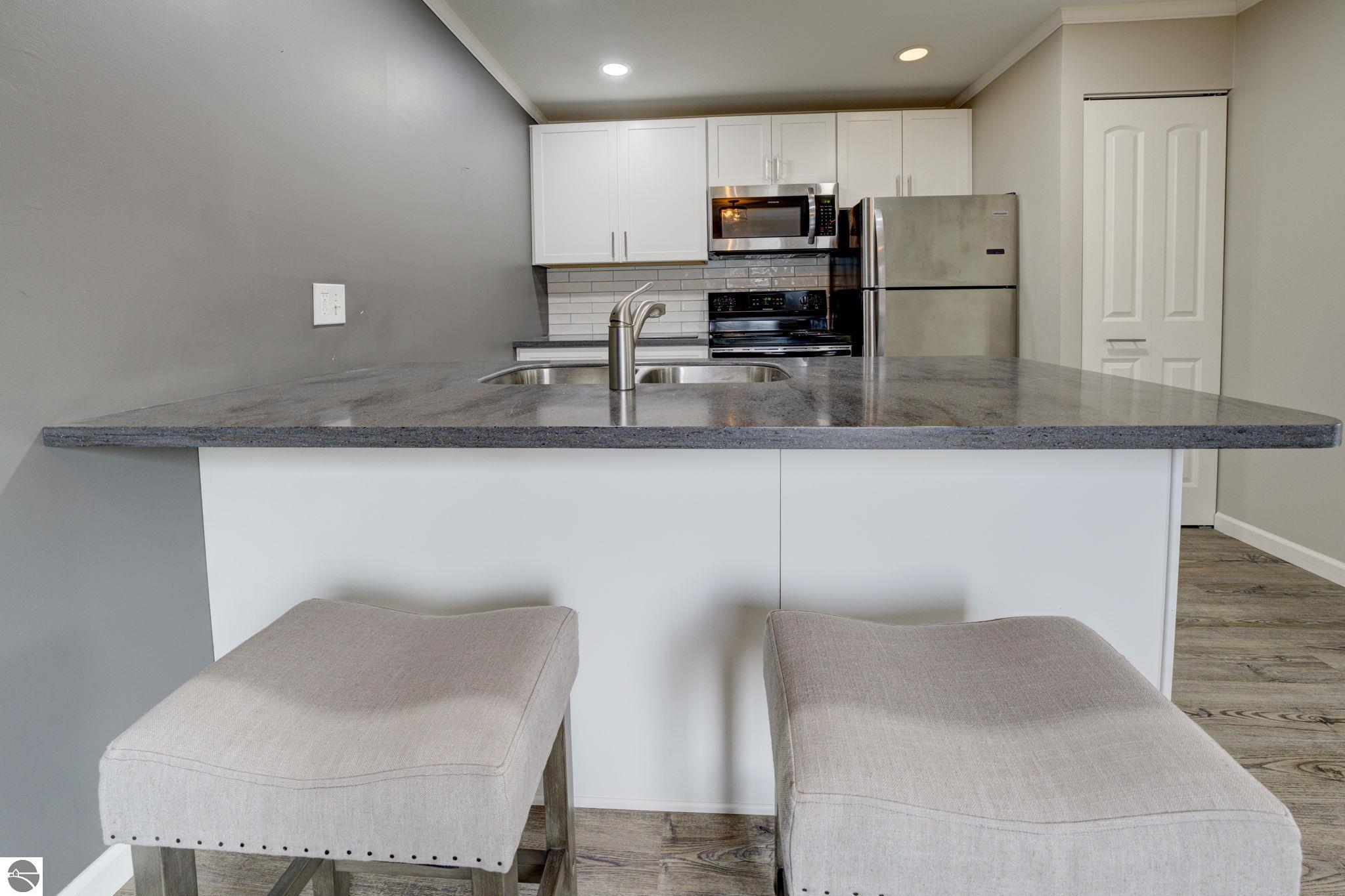 Tucked into a wonderful, in-town neighborhood, this 2 BR mint-condition condo is a gem in this price range - everything main level, a delightful private courtyard for outdoor living in those 8 warm weather months. A great alternative to a big sprawling condo complex. Pets allowed. $270 monthly fee includes heat, trash, landscaping, snow removal, water and sewer and insurance. Markets, restaurants, parks, library and the TART trail all within strolling distance. Priced to sell quickly.