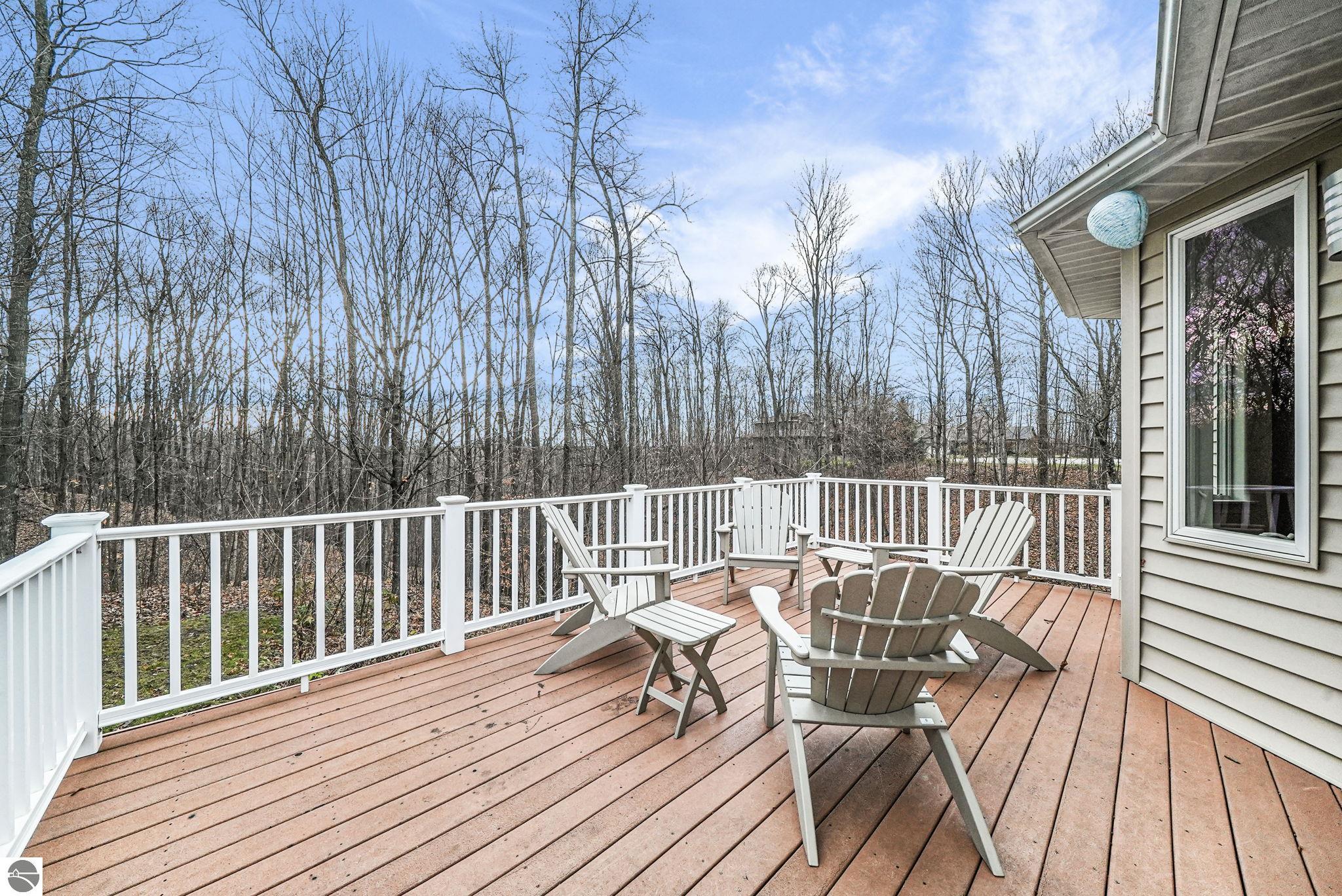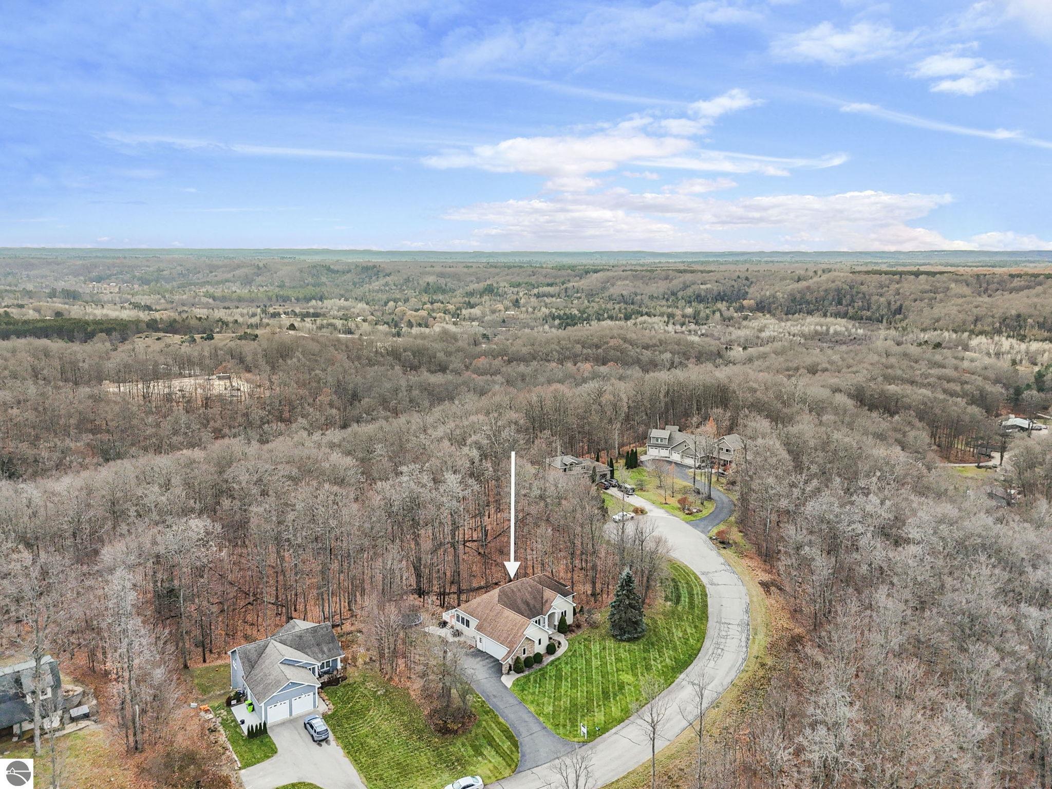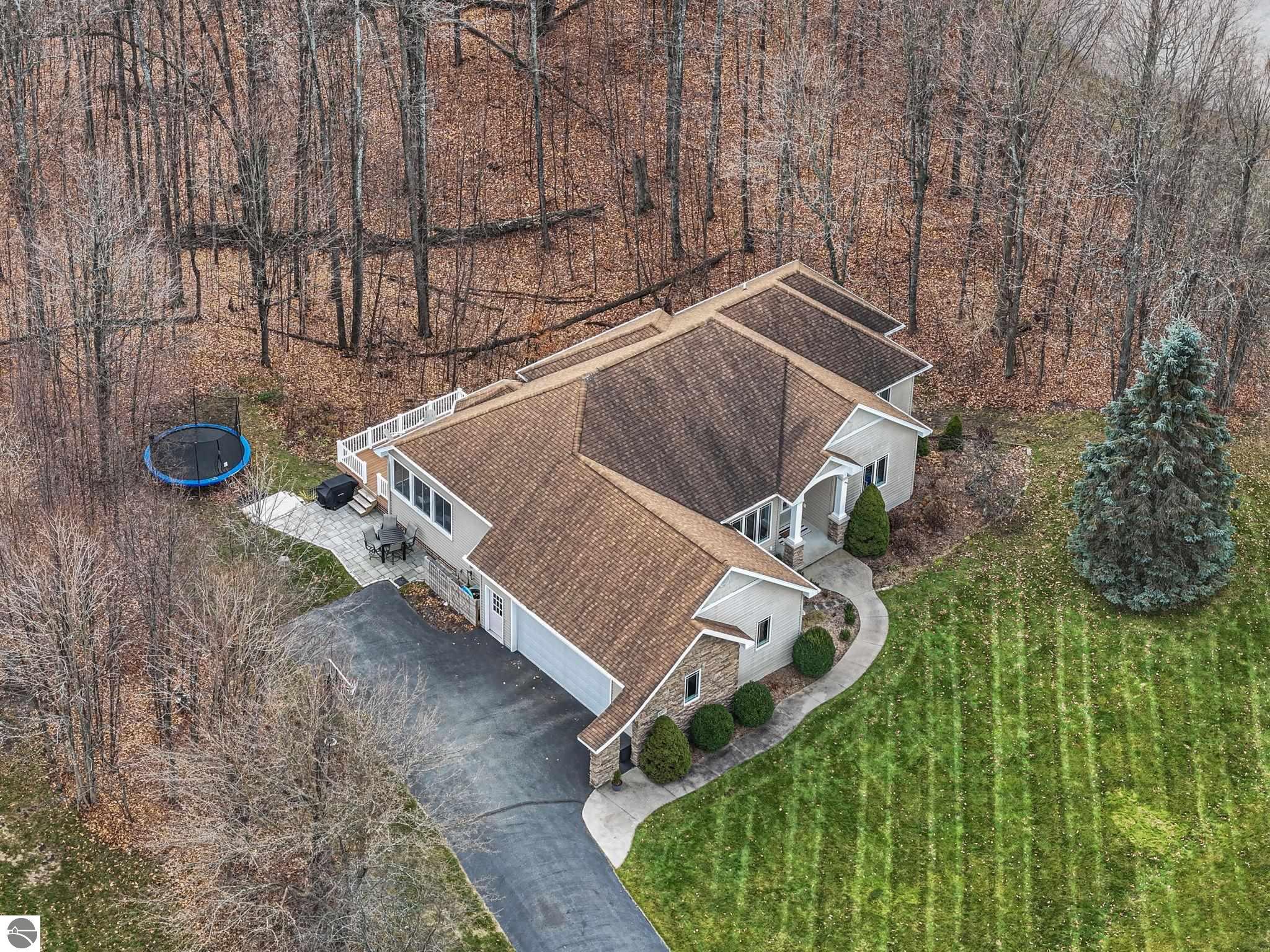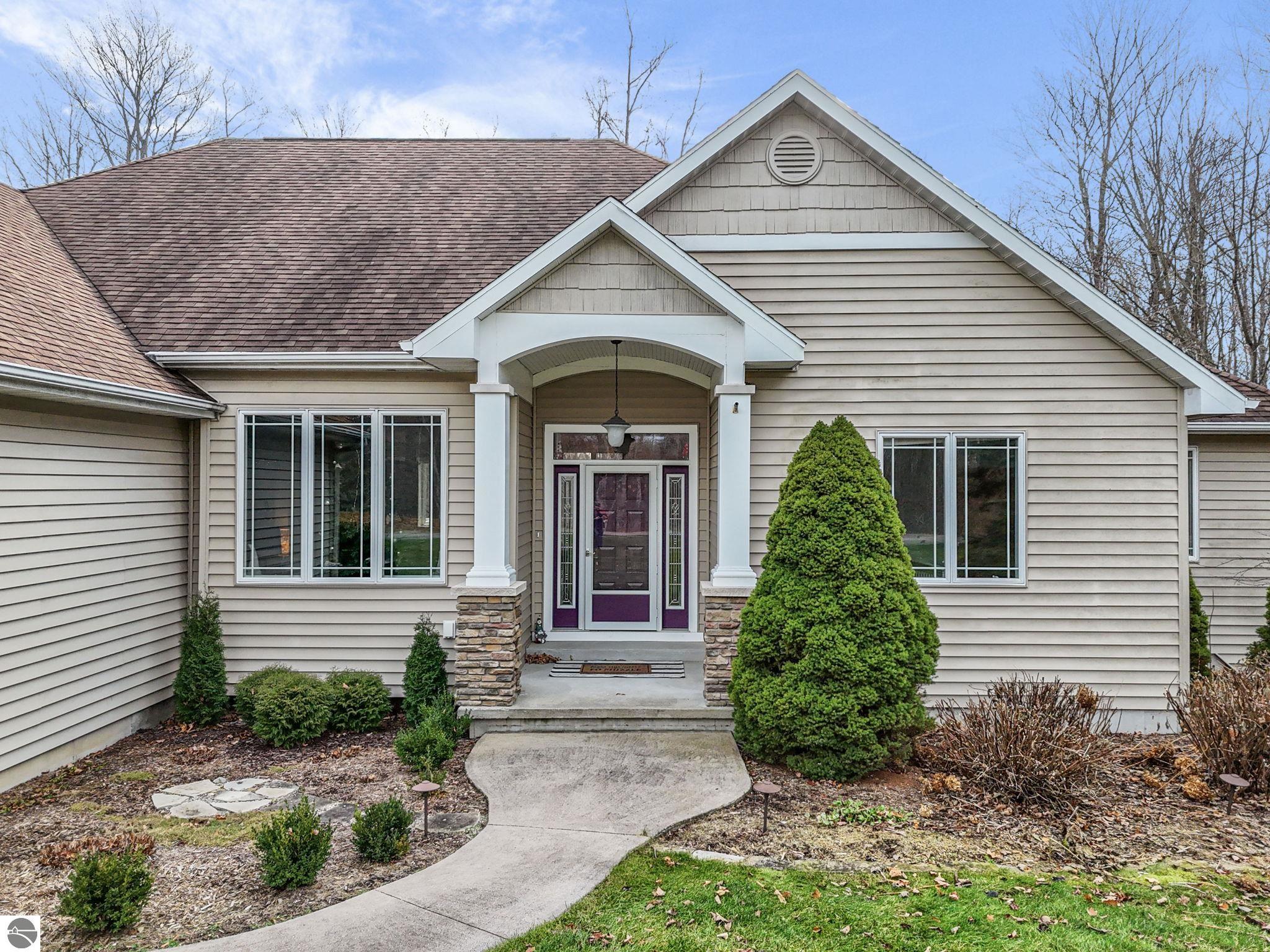 Welcome to this spacious home on a quiet cul-de-sac just 7 miles from downtown Traverse City. Surrounded by hardwoods and evergreens, this home offers a peaceful, park-like setting with irrigation and beautiful landscaping. Inside, a covered porch opens to an inviting living room and office area that flows into an open kitchen, dining room, sunroom, and deck overlooking the large yard. The main-floor bedroom features a large primary ensuite with laundry, plus a second bedroom and full bath. The bright lower-level walkout includes a living area, third bedroom, full bath, and abundant storage with room to expand. Meticulously maintained and truly turn-key. Complete with a newer water heater and appliances replaced within the last few years. Custom features include 11-foot ceilings, Anderson windows, reverse osmosis, water softener, whole-house surround sound, and a natural gas fireplace. A rare find in the highly sought-after South Creek Subdivision.