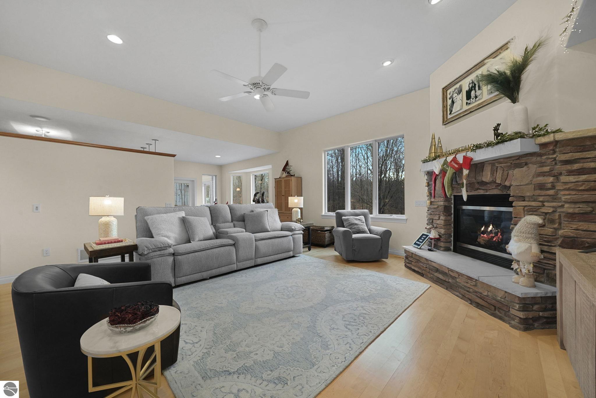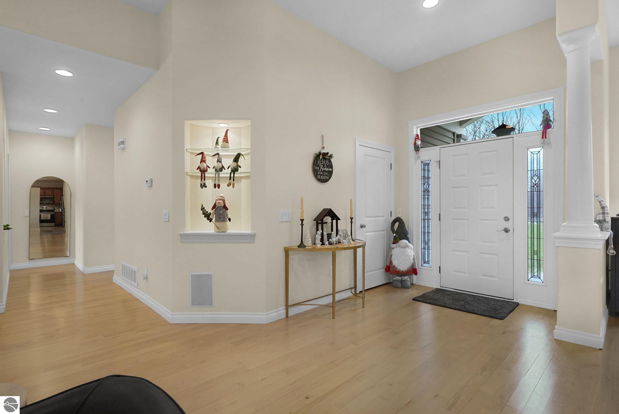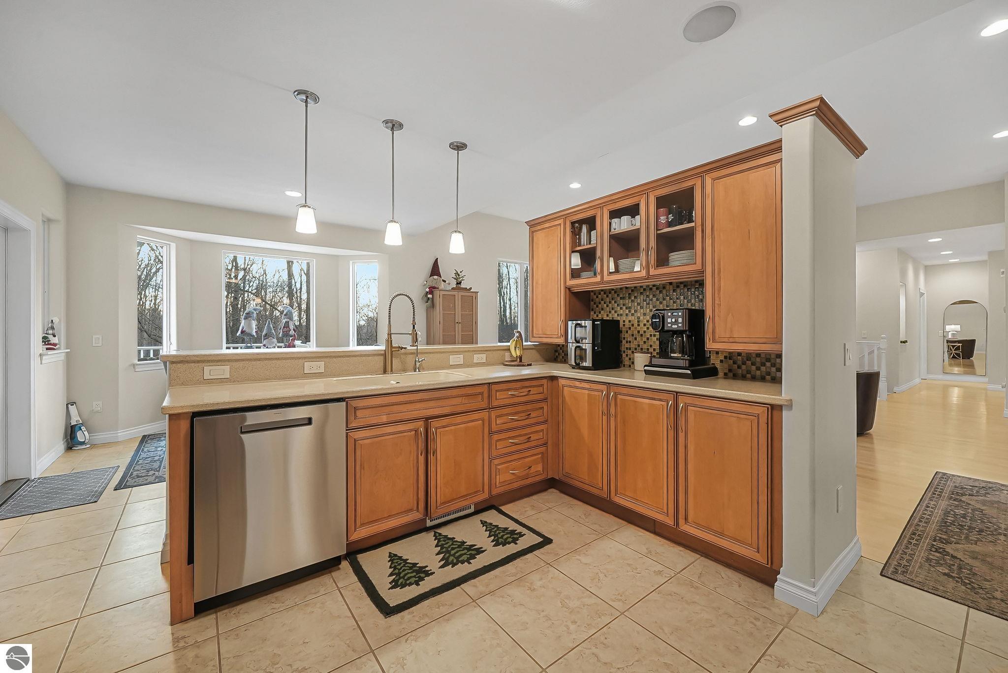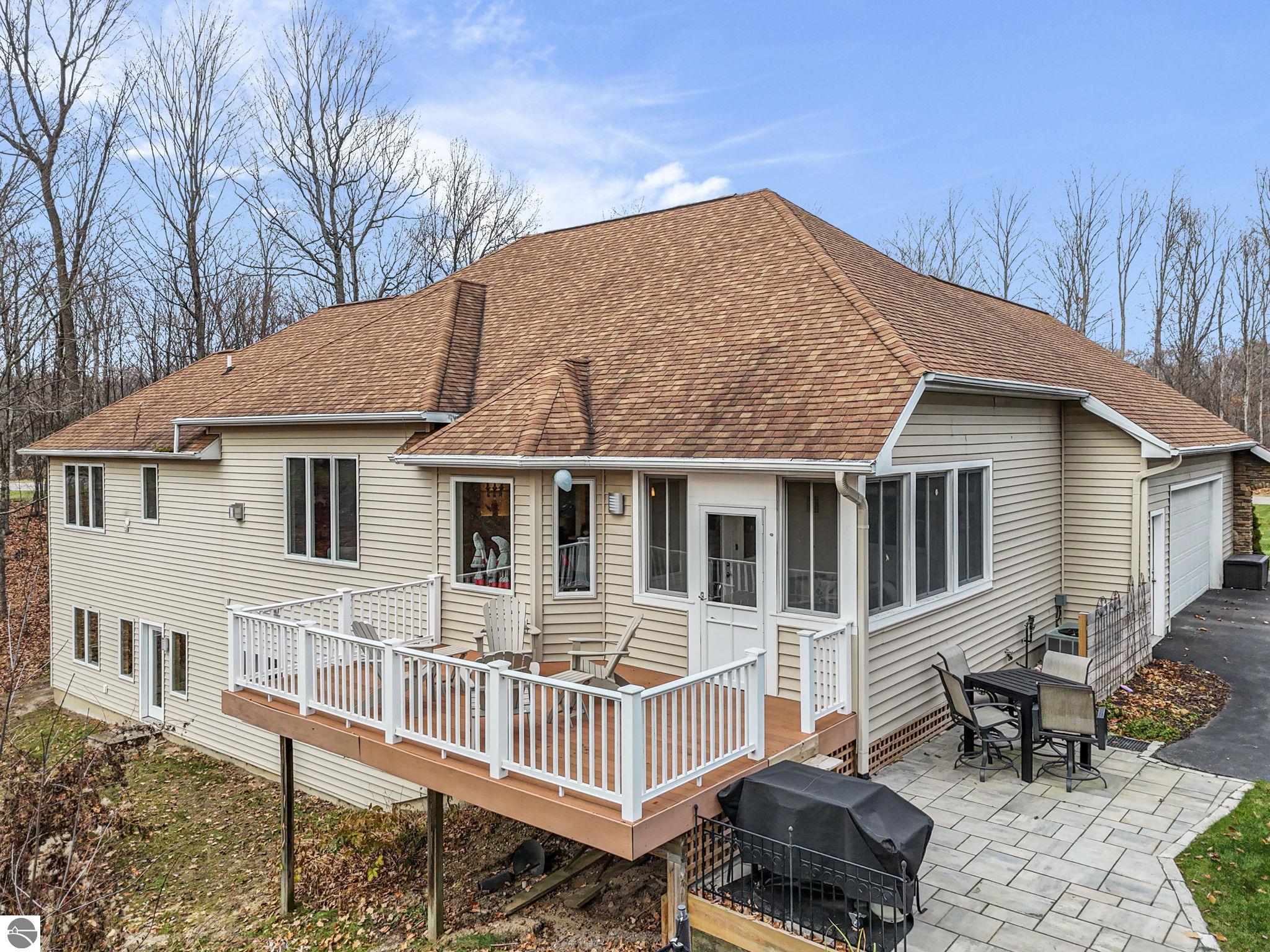 Welcome to this spacious home on a quiet cul-de-sac just 7 miles from downtown Traverse City. Surrounded by hardwoods and evergreens, this home offers a peaceful, park-like setting with irrigation and beautiful landscaping. Inside, a covered porch opens to an inviting living room and office area that flows into an open kitchen, dining room, sunroom, and deck overlooking the large yard. The main-floor bedroom features a large primary ensuite with laundry, plus a second bedroom and full bath. The bright lower-level walkout includes a living area, third bedroom, full bath, and abundant storage with room to expand. Meticulously maintained and truly turn-key. Complete with a newer water heater and appliances replaced within the last few years. Custom features include 11-foot ceilings, Anderson windows, reverse osmosis, water softener, whole-house surround sound, and a natural gas fireplace. A rare find in the highly sought-after South Creek Subdivision.