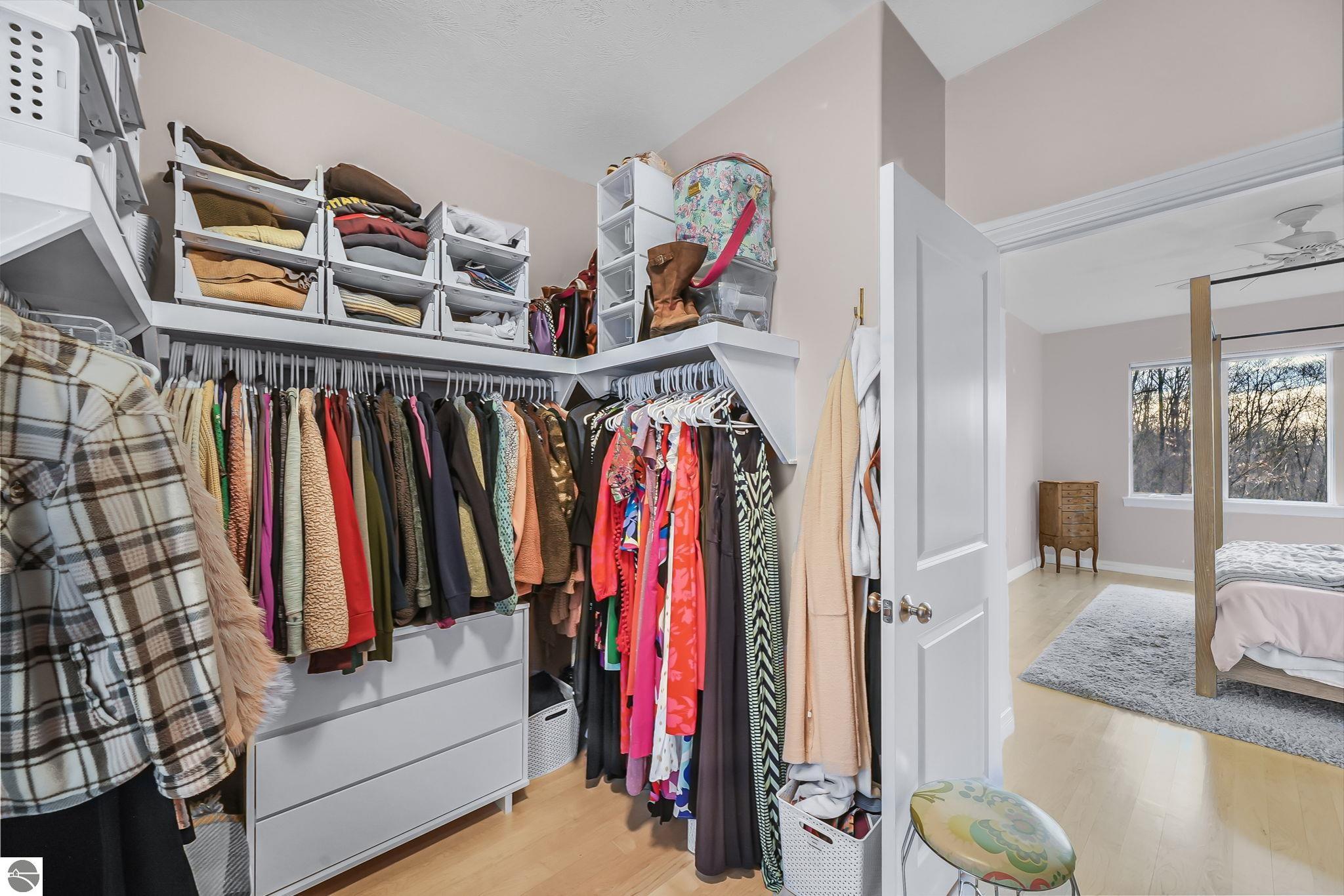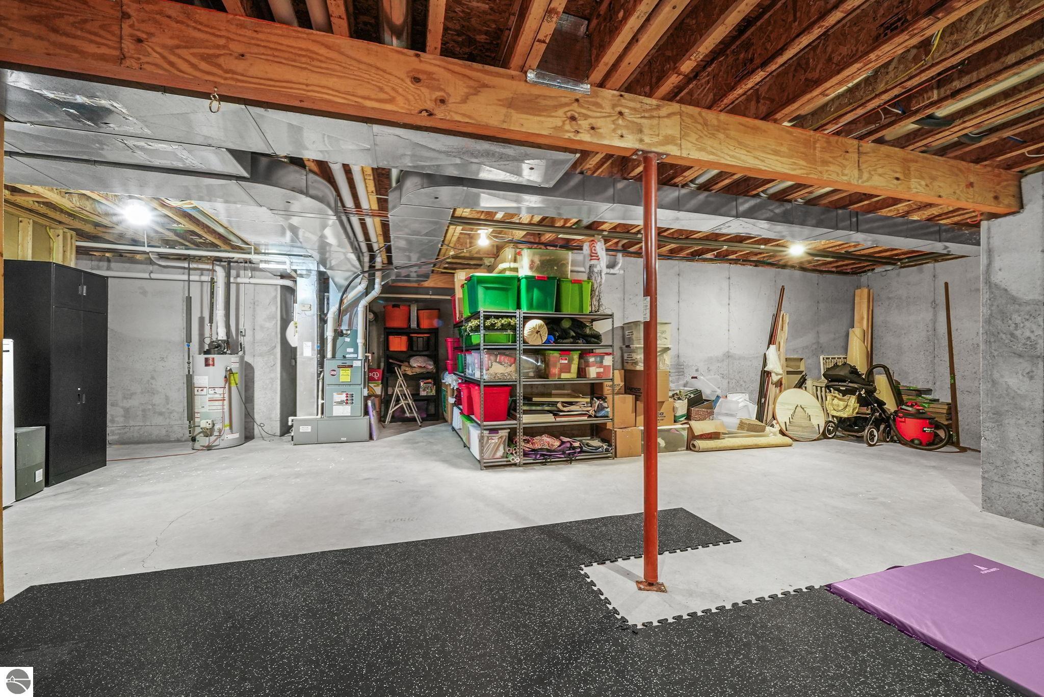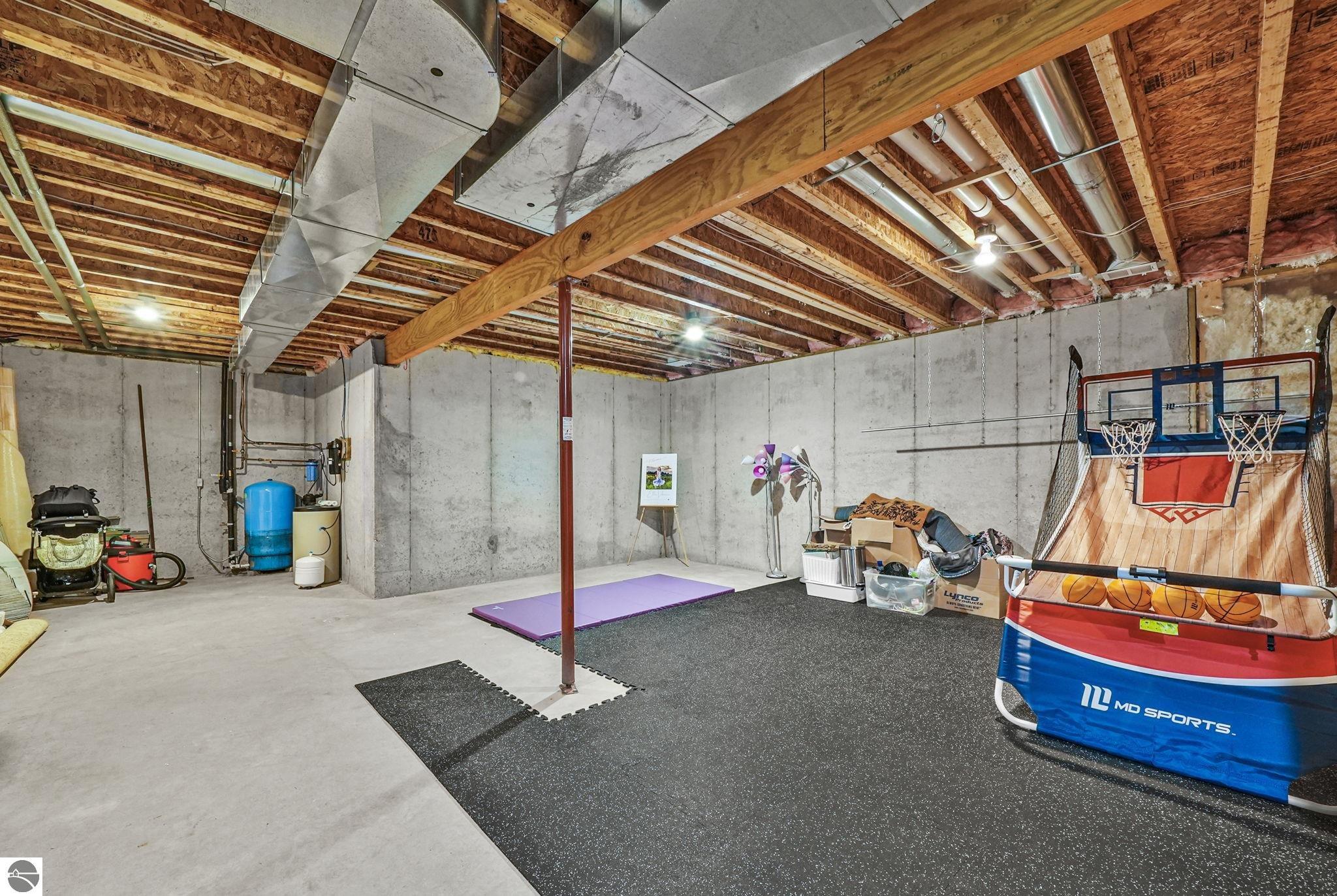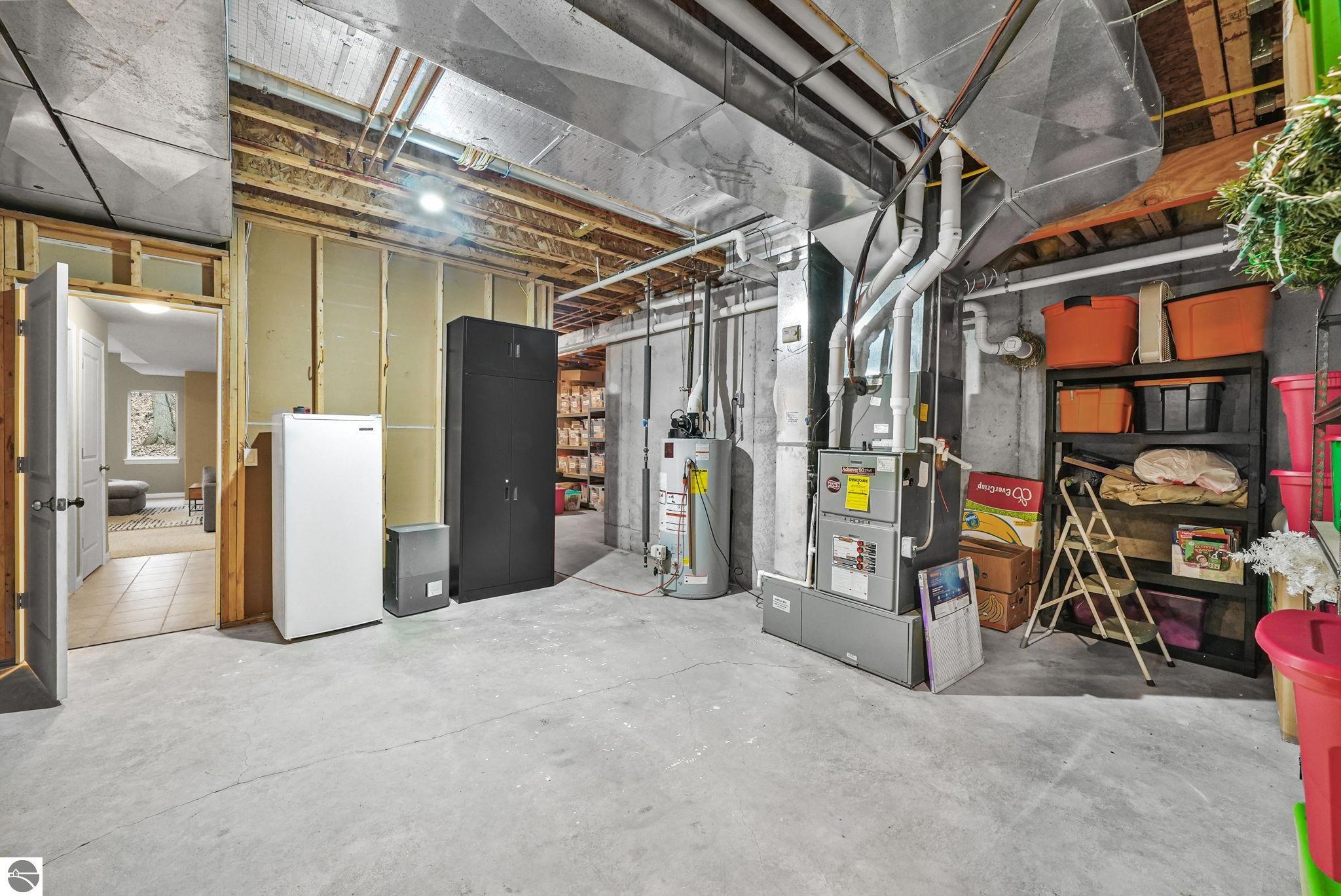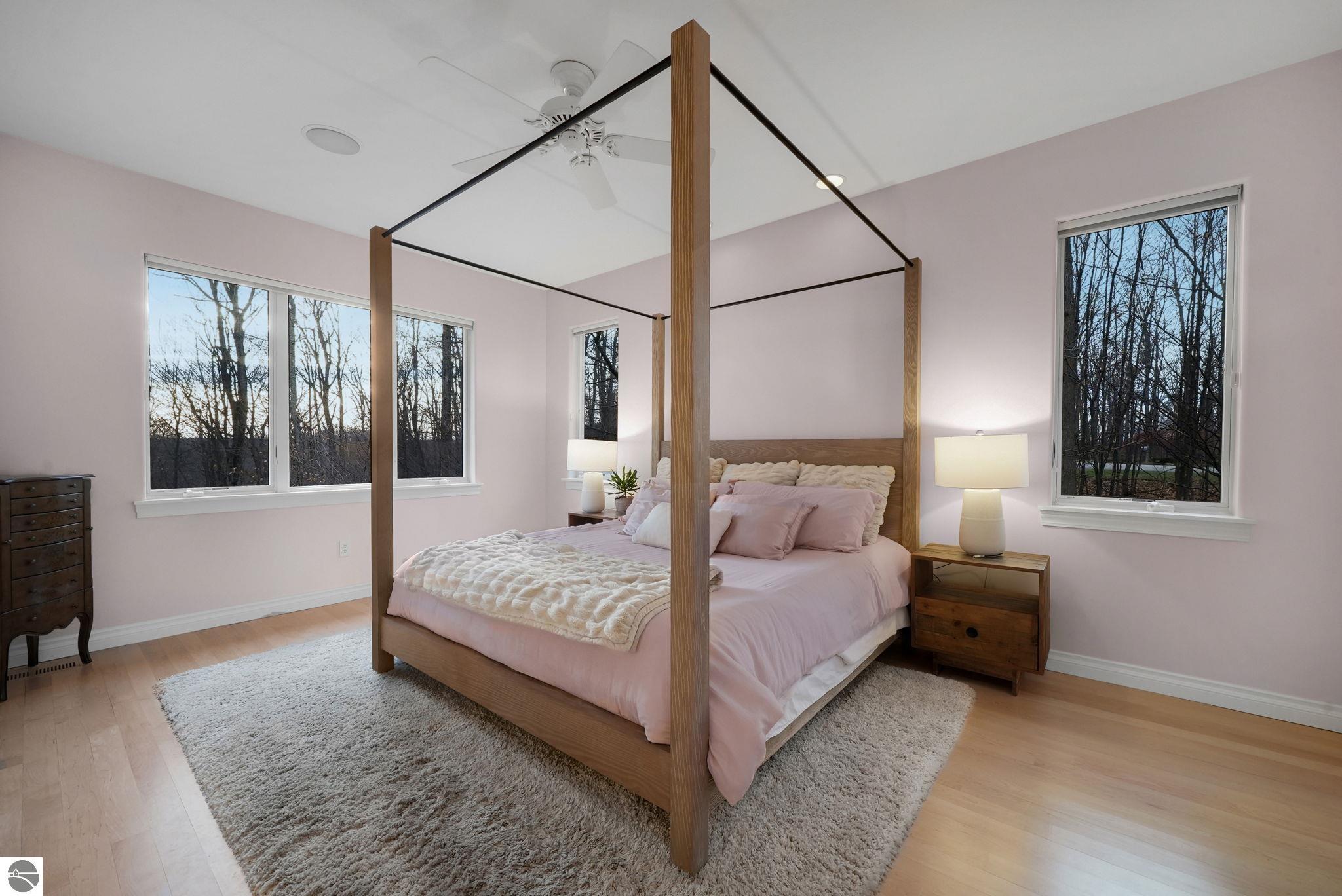 Welcome to this spacious home on a quiet cul-de-sac just 7 miles from downtown Traverse City. Surrounded by hardwoods and evergreens, this home offers a peaceful, park-like setting with irrigation and beautiful landscaping. Inside, a covered porch opens to an inviting living room and office area that flows into an open kitchen, dining room, sunroom, and deck overlooking the large yard. The main-floor bedroom features a large primary ensuite with laundry, plus a second bedroom and full bath. The bright lower-level walkout includes a living area, third bedroom, full bath, and abundant storage with room to expand. Meticulously maintained and truly turn-key. Complete with a newer water heater and appliances replaced within the last few years. Custom features include 11-foot ceilings, Anderson windows, reverse osmosis, water softener, whole-house surround sound, and a natural gas fireplace. A rare find in the highly sought-after South Creek Subdivision.