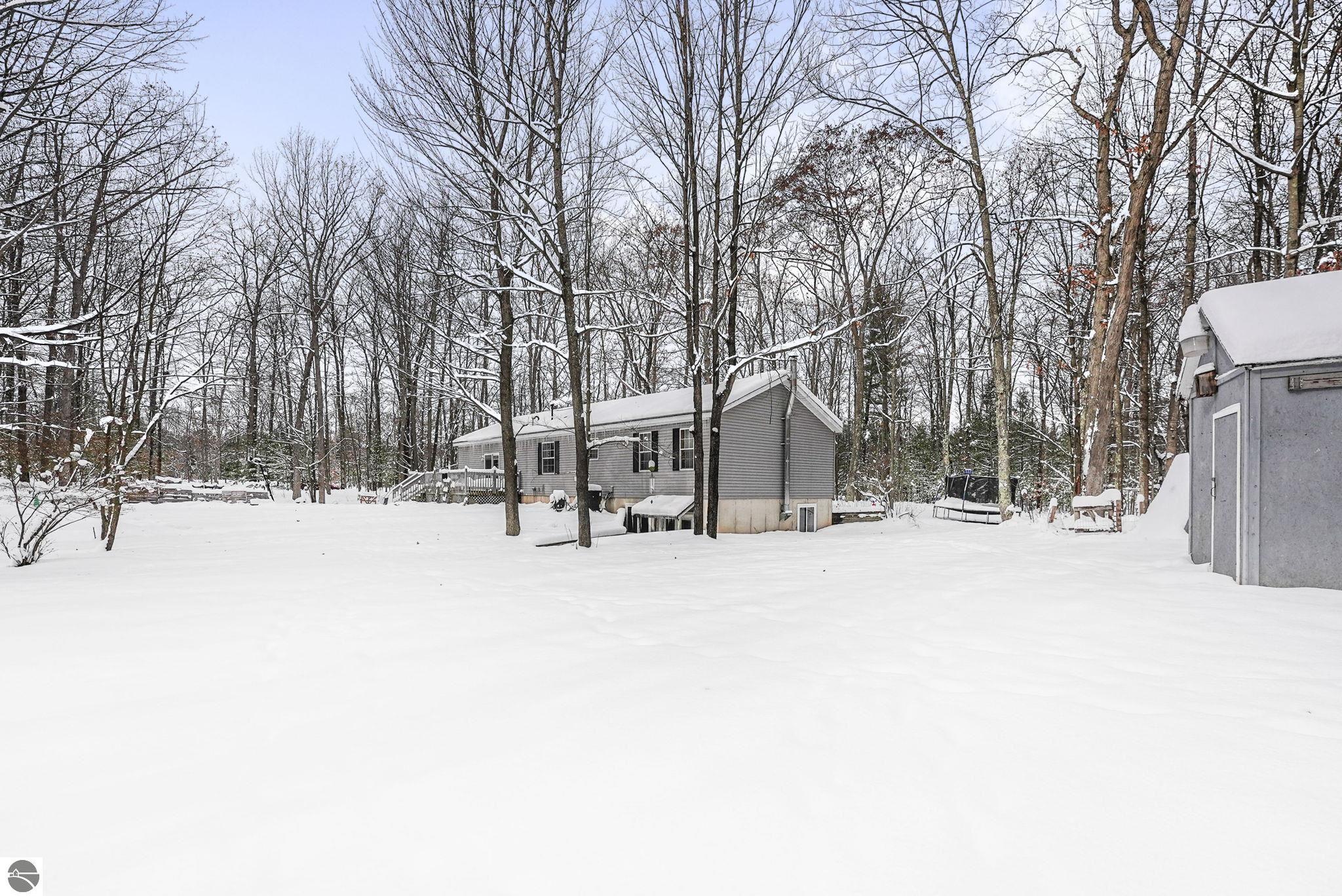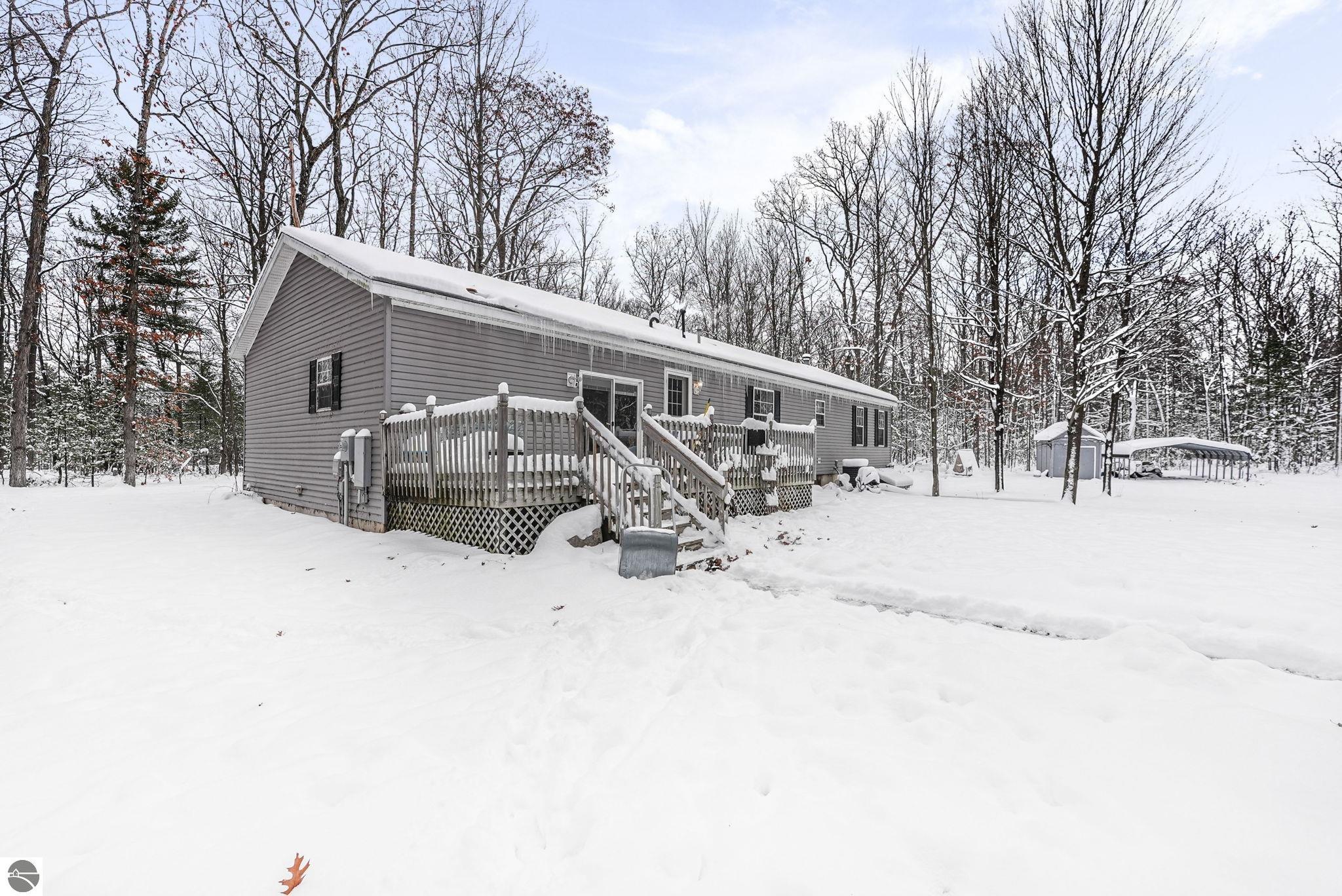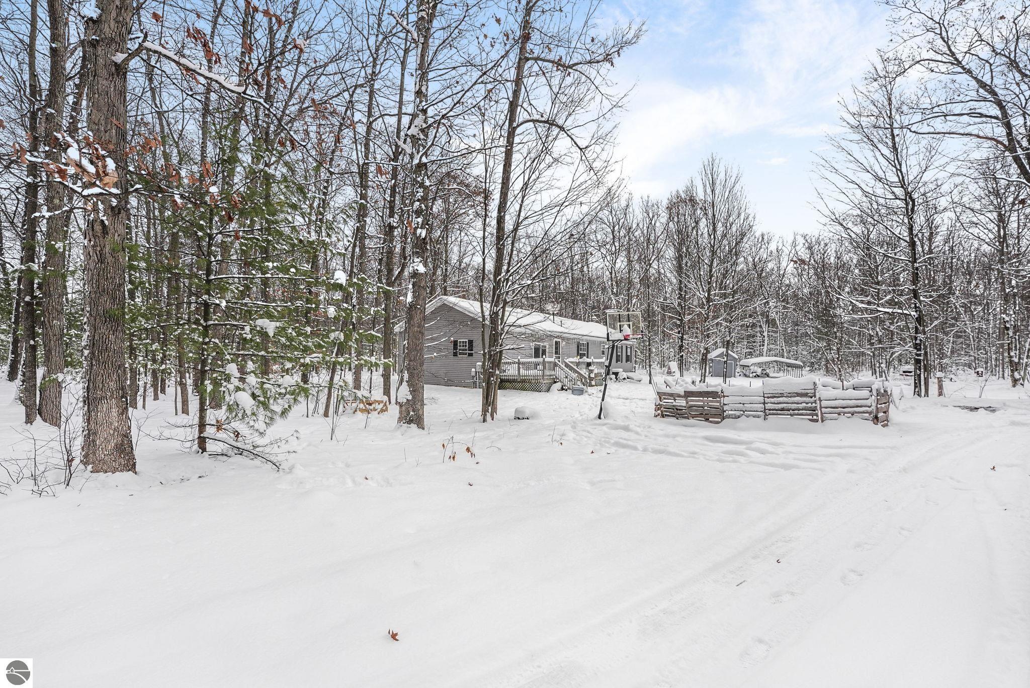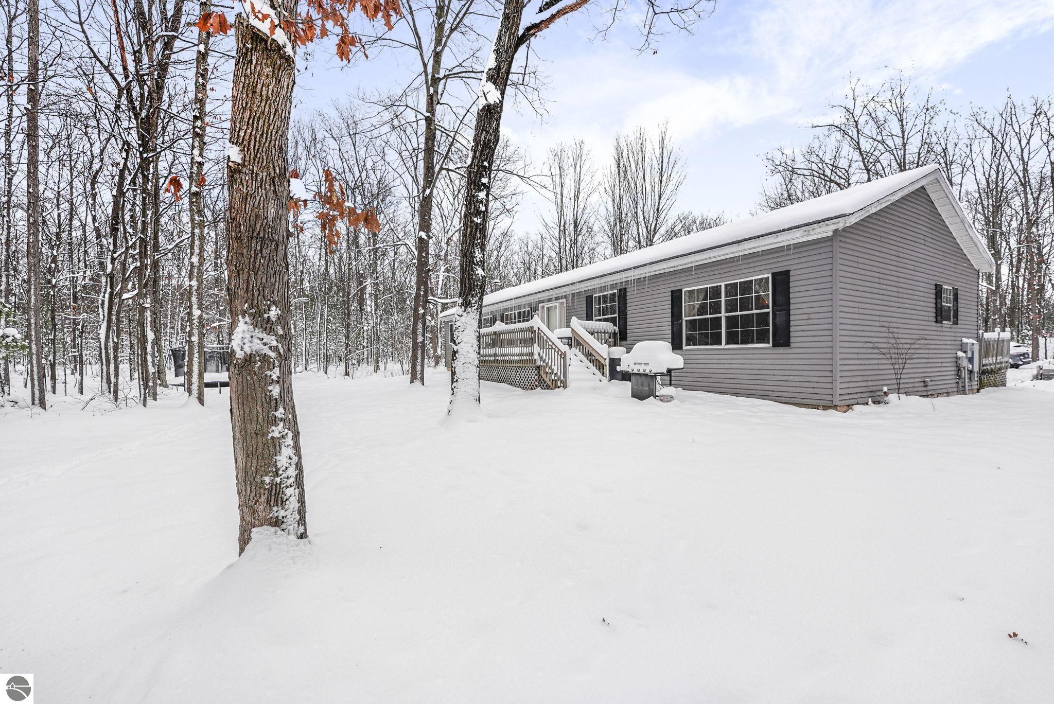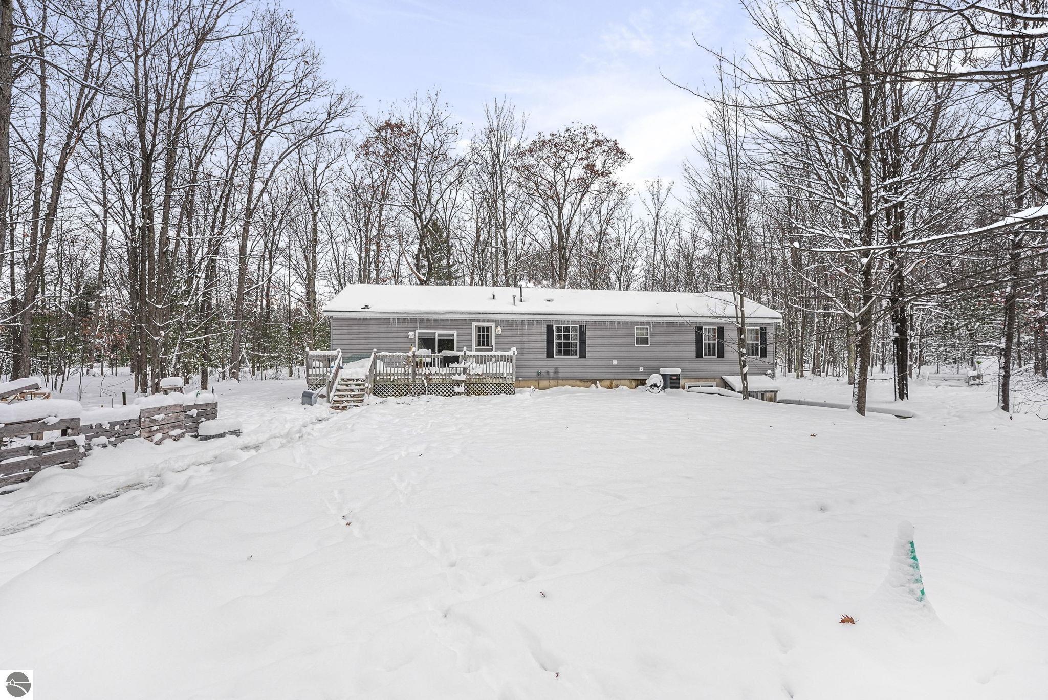 Discover peaceful living on 6.04 private, beautifully wooded acres just minutes from the Village of Interlochen and an easy drive to Traverse City. This quality built ranch offers spacious main-floor living and an impressive 1,400 sq ft. lower level that nearly doubles the home’s living space. The lower level features a large family room, bar/entertainment area, abundant storage, and two non-conforming bedrooms. The luxurious main-floor primary suite includes a generous master bath, while the dramatic island kitchen and dining area showcase stylish bamboo hardwood flooring. A convenient main-floor laundry/mudroom adds to the home’s thoughtful design. Enjoy the outdoors with two decks, lovely landscaping, and extensive perennial gardens. Efficient and flexible heating options include a wood-burning furnace that can heat the entire home economically, along with a propane furnace and a heat pump—use any or all to suit your needs. Built as a high-end manufactured home, this residence features a 5/12 roof pitch, 8' interior sidewalls, full drywall, a custom kitchen, upgraded flooring and light fixtures, and detailed craftsmanship throughout. A solid, attractive home that truly feels stick-built—ready to welcome its next owner.