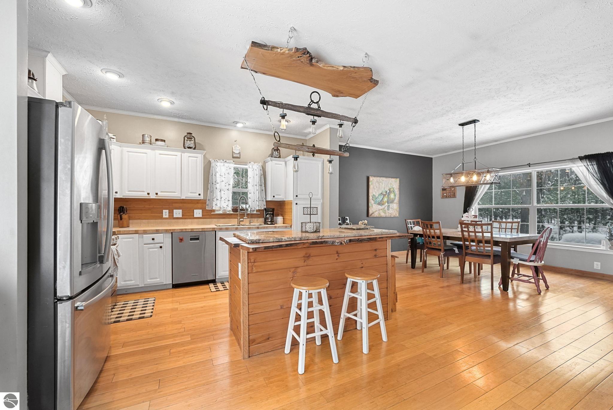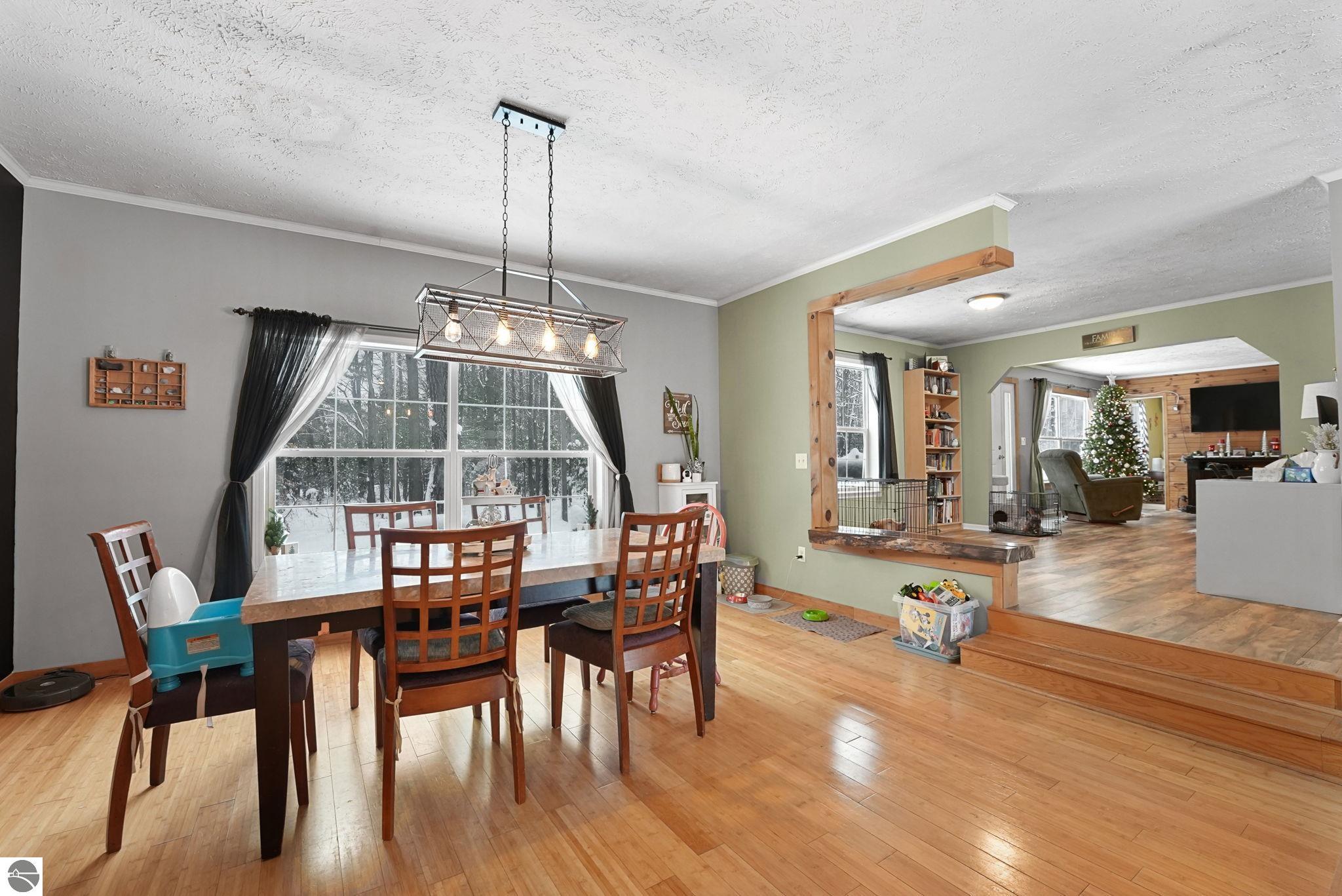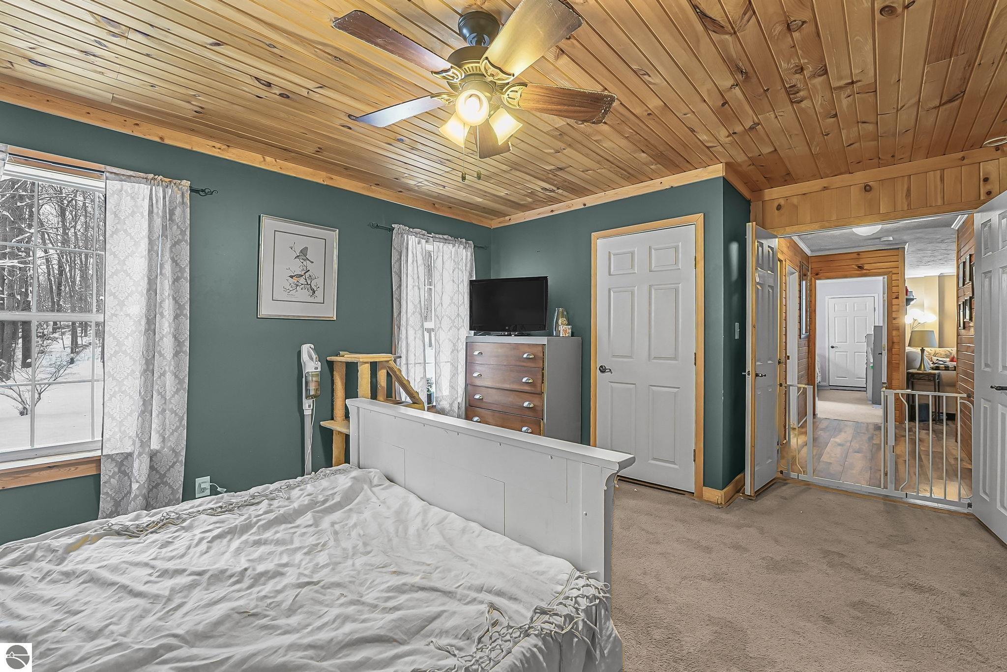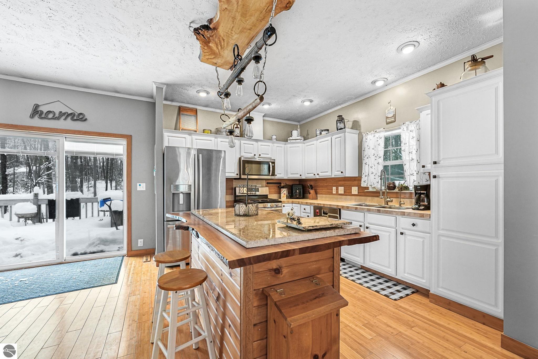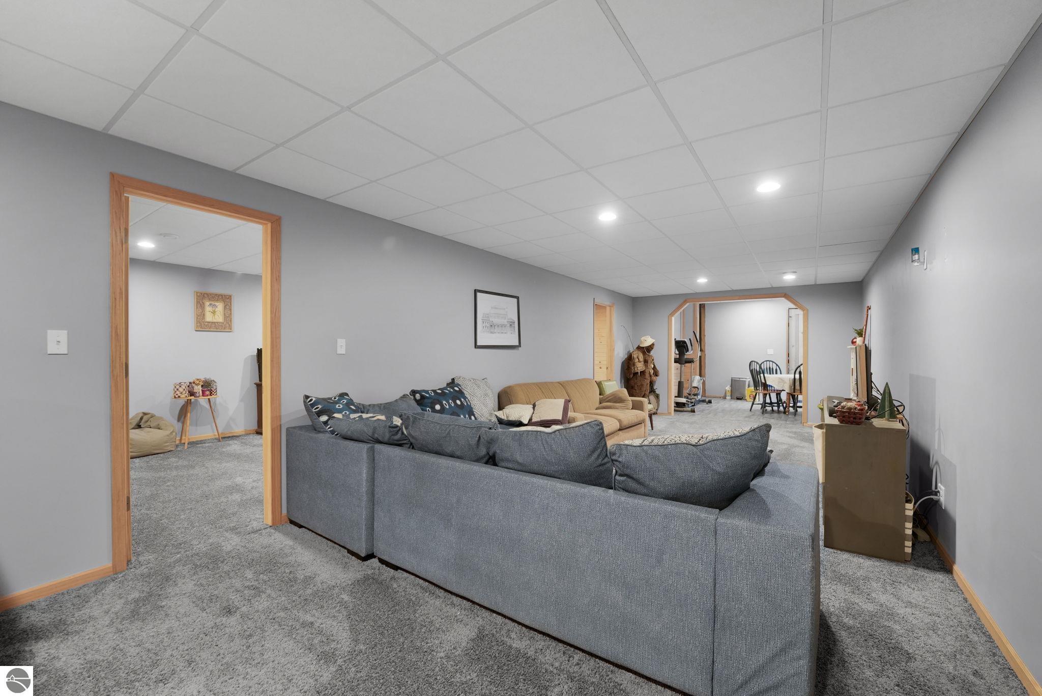 Discover peaceful living on 6.04 private, beautifully wooded acres just minutes from the Village of Interlochen and an easy drive to Traverse City. This quality built ranch offers spacious main-floor living and an impressive 1,400 sq ft. lower level that nearly doubles the home’s living space. The lower level features a large family room, bar/entertainment area, abundant storage, and two non-conforming bedrooms. The luxurious main-floor primary suite includes a generous master bath, while the dramatic island kitchen and dining area showcase stylish bamboo hardwood flooring. A convenient main-floor laundry/mudroom adds to the home’s thoughtful design. Enjoy the outdoors with two decks, lovely landscaping, and extensive perennial gardens. Efficient and flexible heating options include a wood-burning furnace that can heat the entire home economically, along with a propane furnace and a heat pump—use any or all to suit your needs. Built as a high-end manufactured home, this residence features a 5/12 roof pitch, 8' interior sidewalls, full drywall, a custom kitchen, upgraded flooring and light fixtures, and detailed craftsmanship throughout. A solid, attractive home that truly feels stick-built—ready to welcome its next owner.
