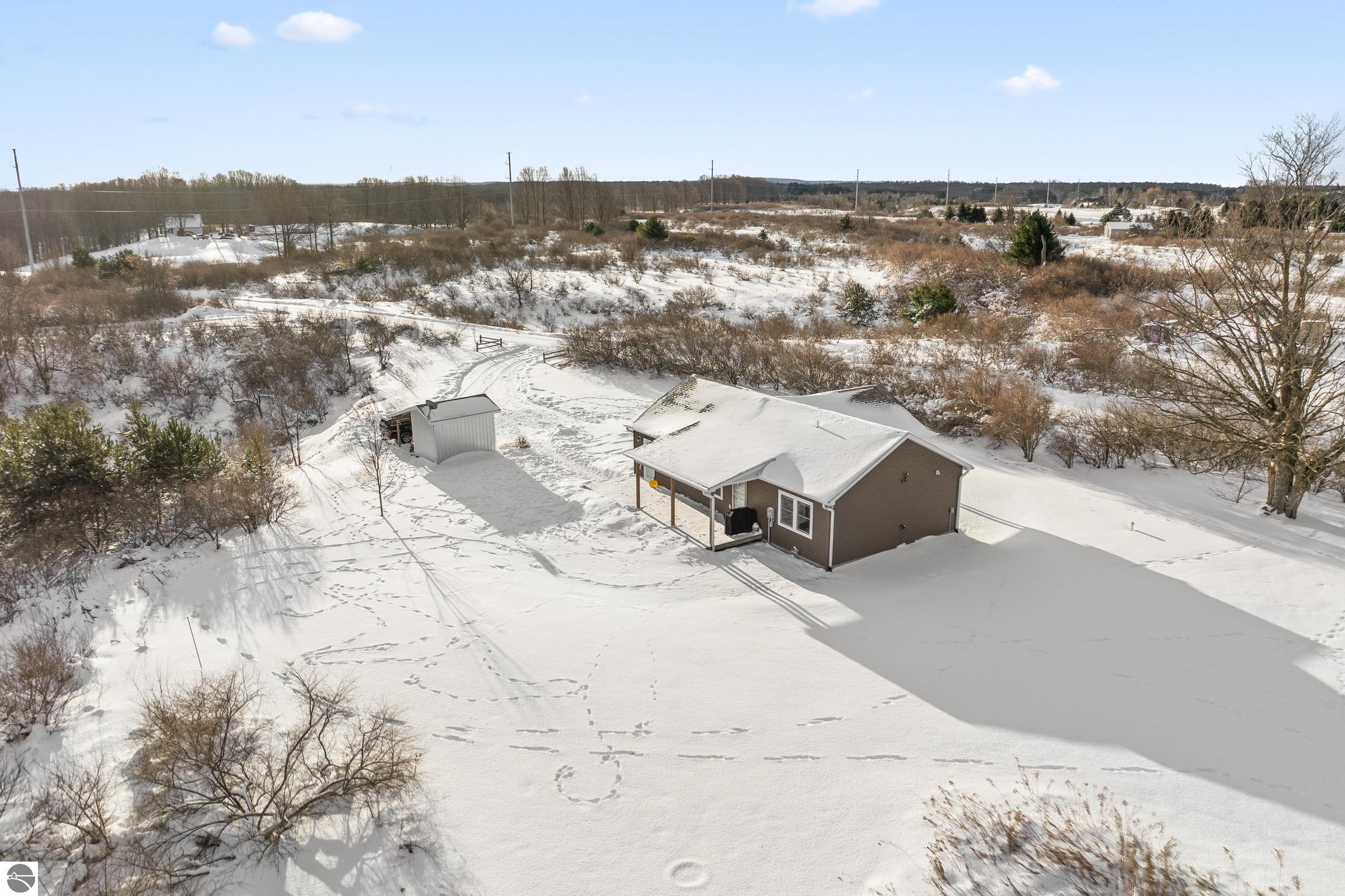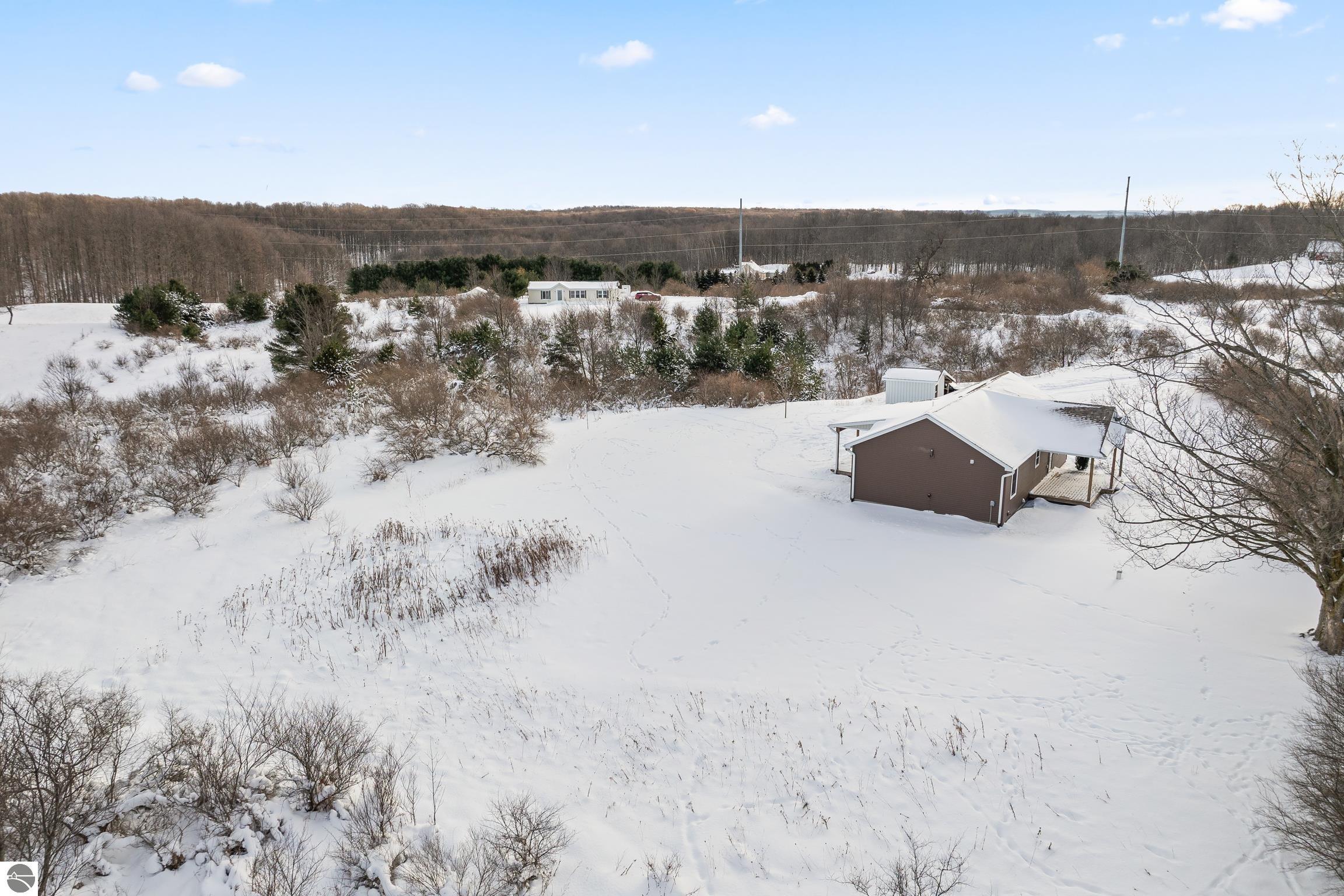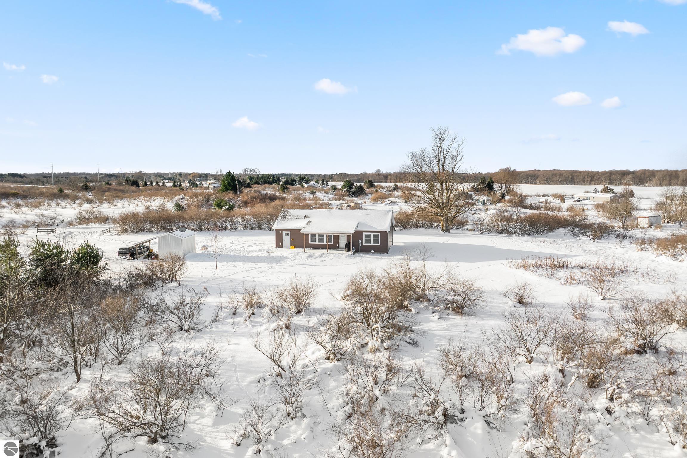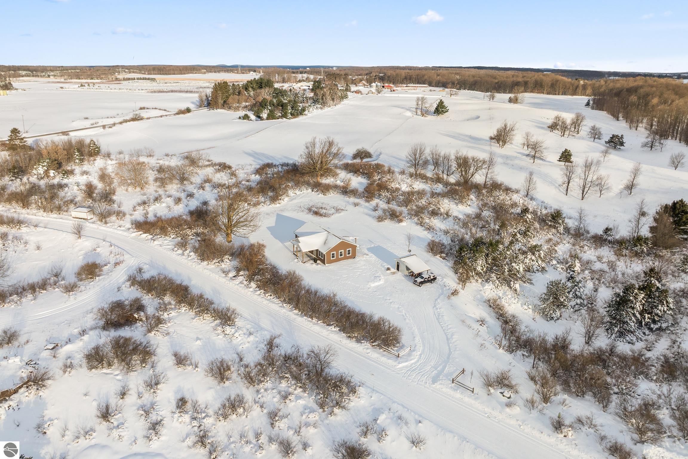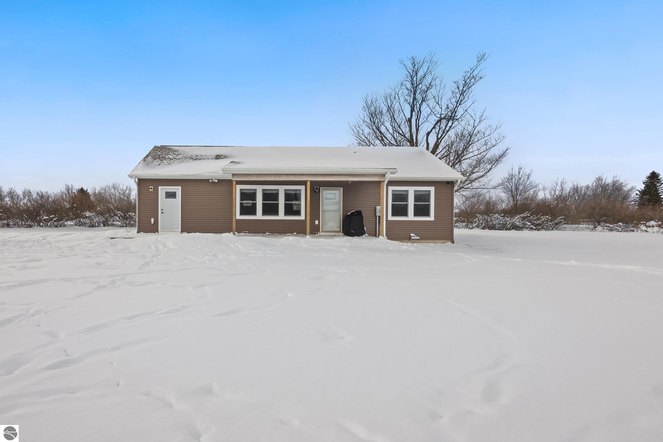 Discover this charming newer-build ranch home set in a peaceful country setting yet close to Traverse City and all of the amenities.. Thoughtfully designed with an open floor plan, the home is filled with natural light that enhances its warm and inviting feel. The living spaces flow easily, creating a comfortable layout ideal for everyday living. Enjoy your morning coffee or unwind in the evenings on the covered front and back porches—perfect spots to take in the surrounding tranquility. Lovingly cared for, this 2-bedroom, 1-bath home offers low-maintenance living with all the benefits of a serene rural location and the convenience of being close to town. Move-in ready and full of charm, and with acreage providing opportunities to grow!!