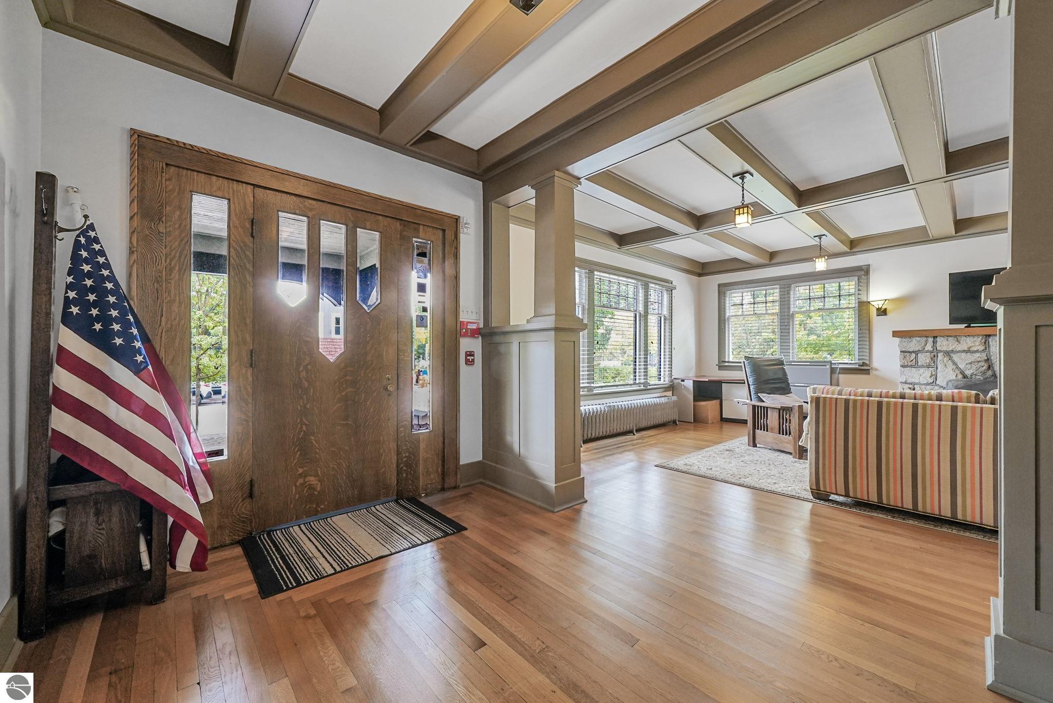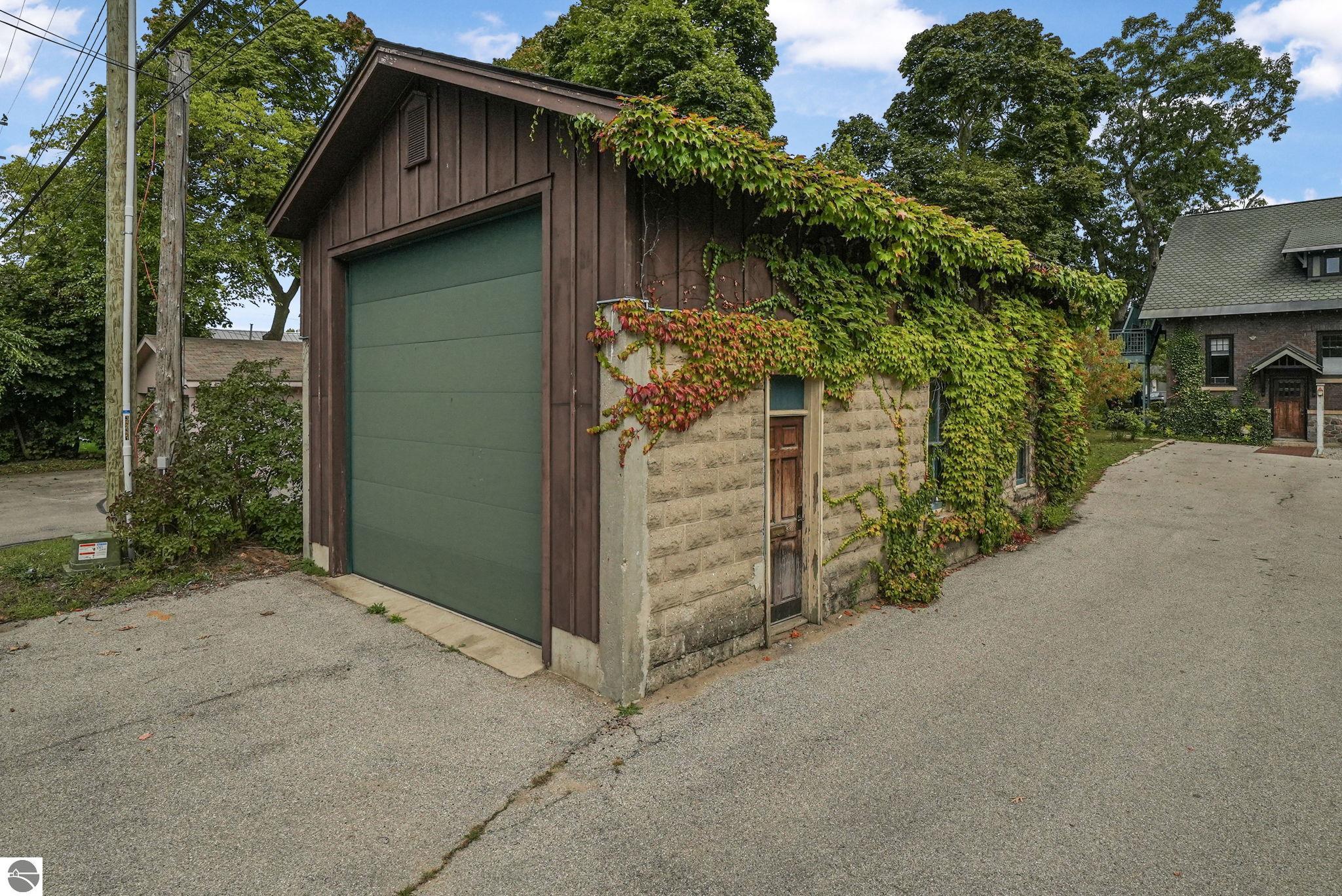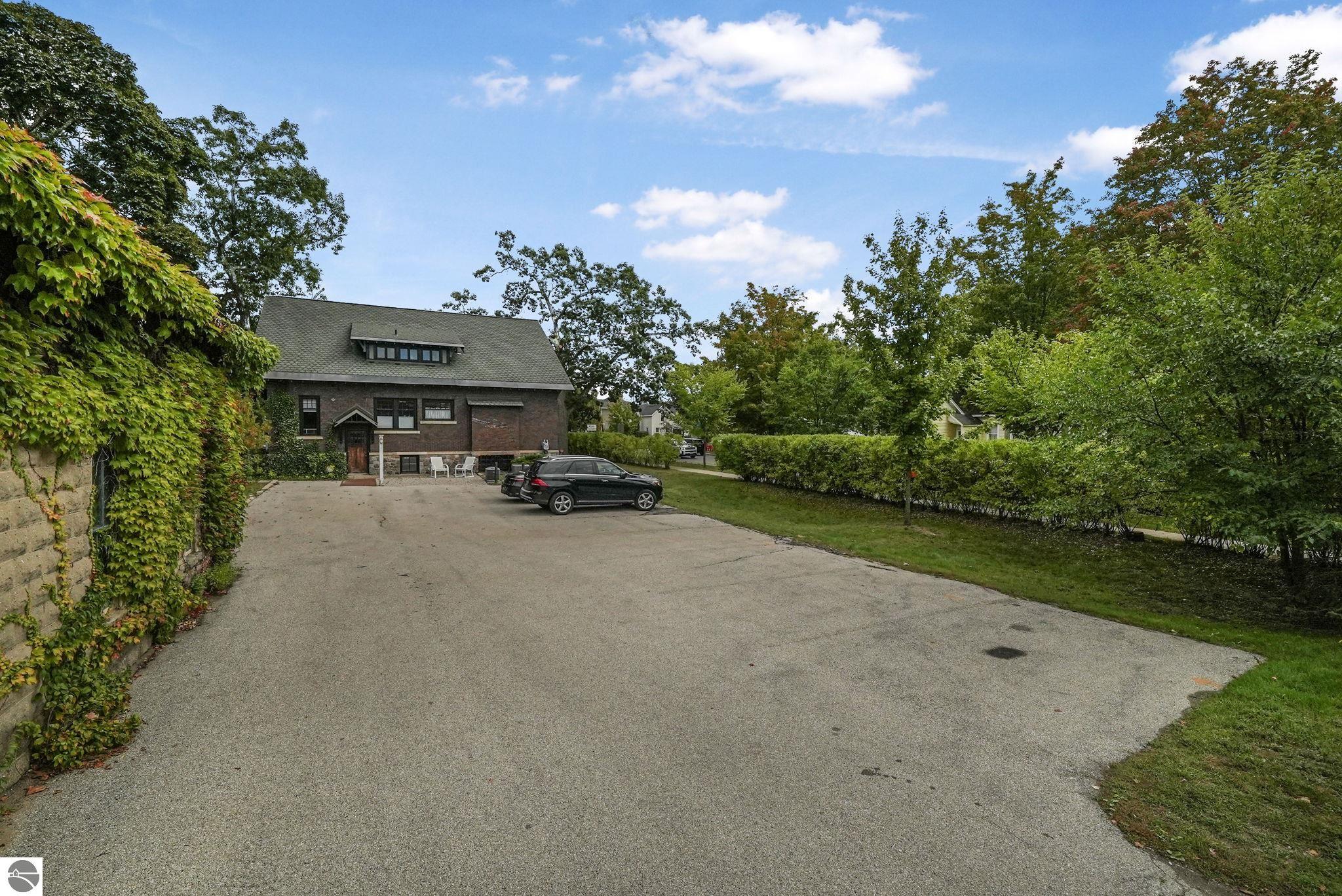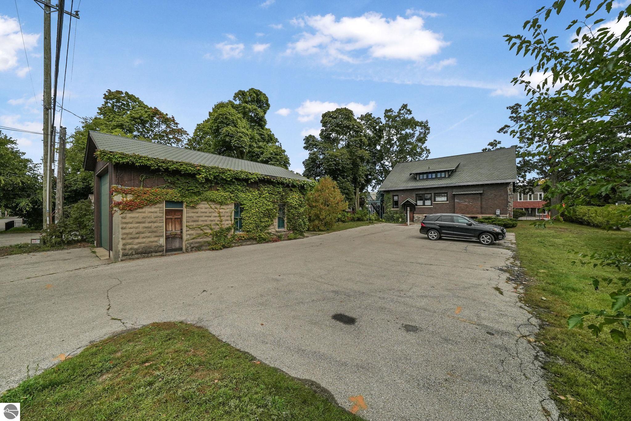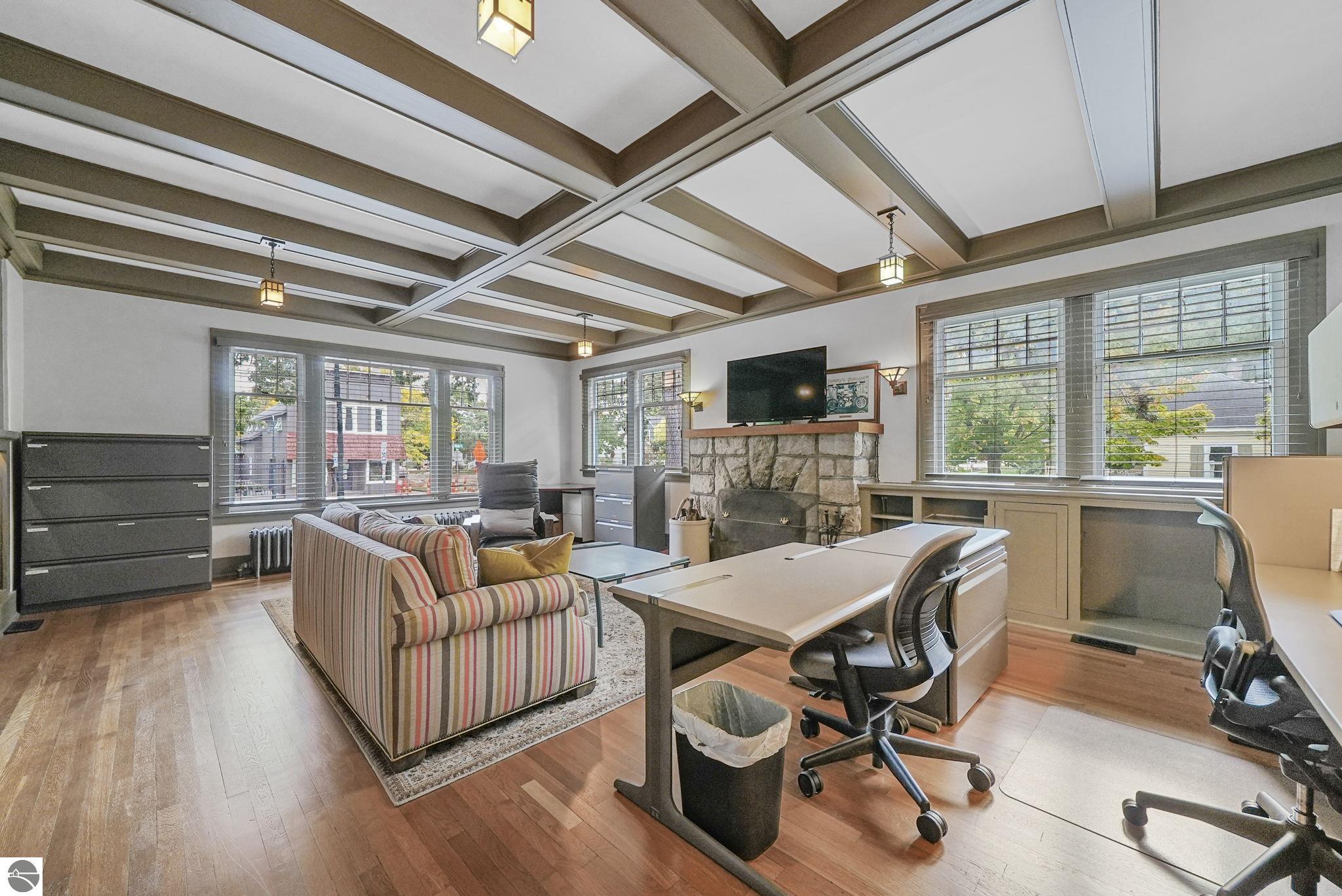 This is one of the most iconic Traverse City structures, and now one of the coolest ownership opportunities of a historic mixed-use property on the corner of 9th and Union Street - large enough to be split by right! This historic Old Town bungalow built in 1915 was constructed with high end craftsmanship and is beautifully preserved - find gorgeous maple hardwood floors, rich original wood trim, and striking 9' coffered ceilings. A grand wood-burning fireplace anchors the spacious living area, complemented by a welcoming foyer, den, office, and main floor primary bedroom. The main floor is currently used as an office, with lots of potential to go easily back to a residence. Upstairs could be a completely separate unit, as it has an additional kitchen, and two or three bedrooms with a private entrance. The finished lower level area adds valuable, flexible living/office space—perfect for a media room, home gym, expanded office use, storage, etc. Sitting on three city lots, the property includes a massive 2+ car garage with oversized door—large enough to potentially fit four vehicles or provide RV/Boat storage. The setting is one of its finest attributes, with a covered front porch to take in the morning sun, or a lovely back patio area and large corner property on the alley to stretch out and enjoy. Big mature trees line the edges of the property as well - it's a must see!