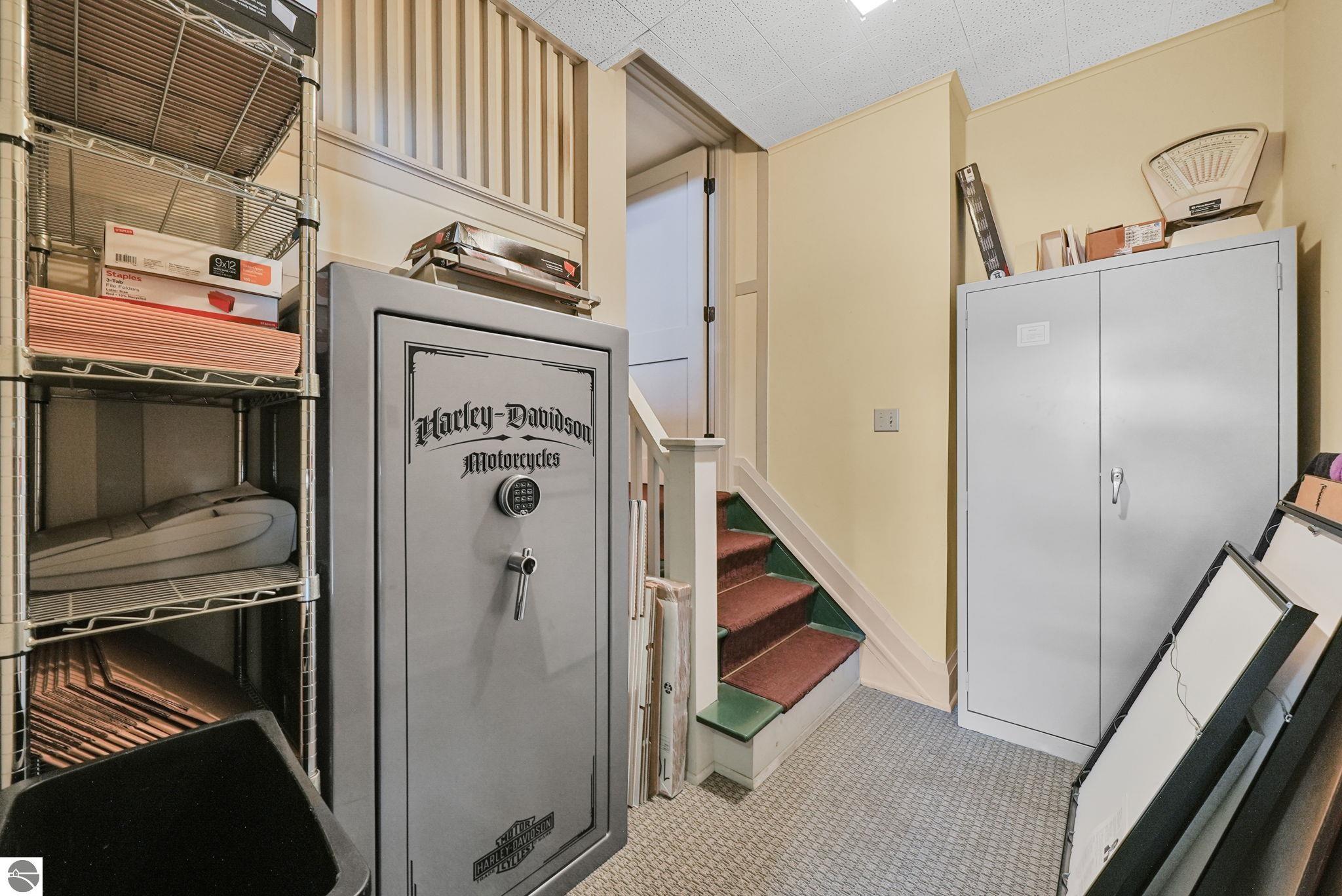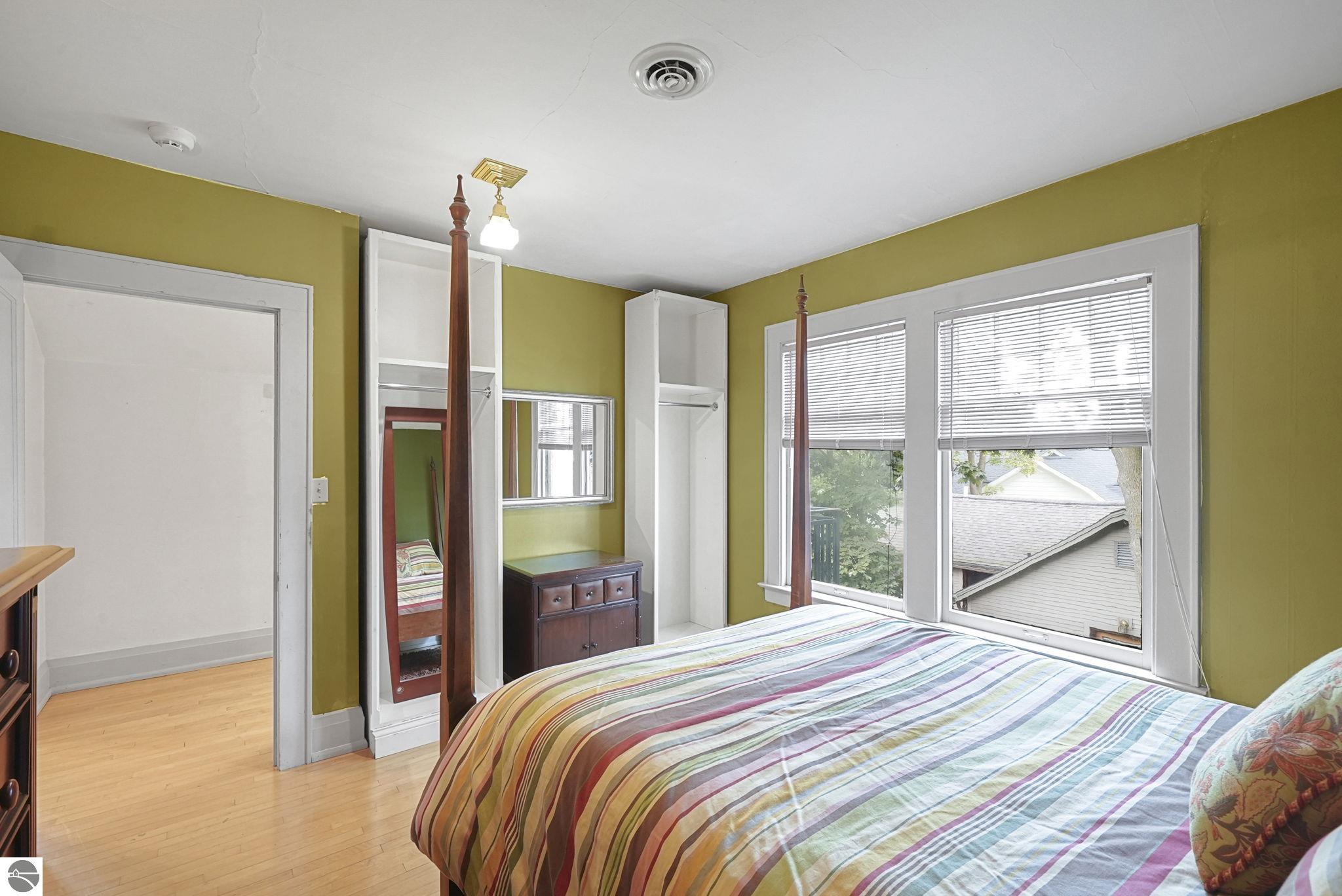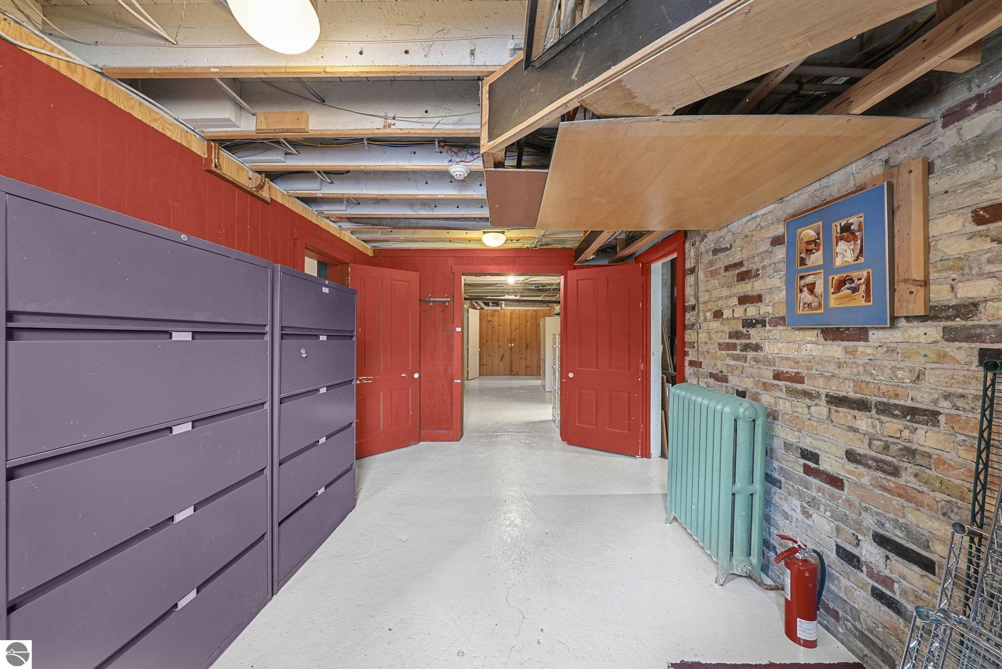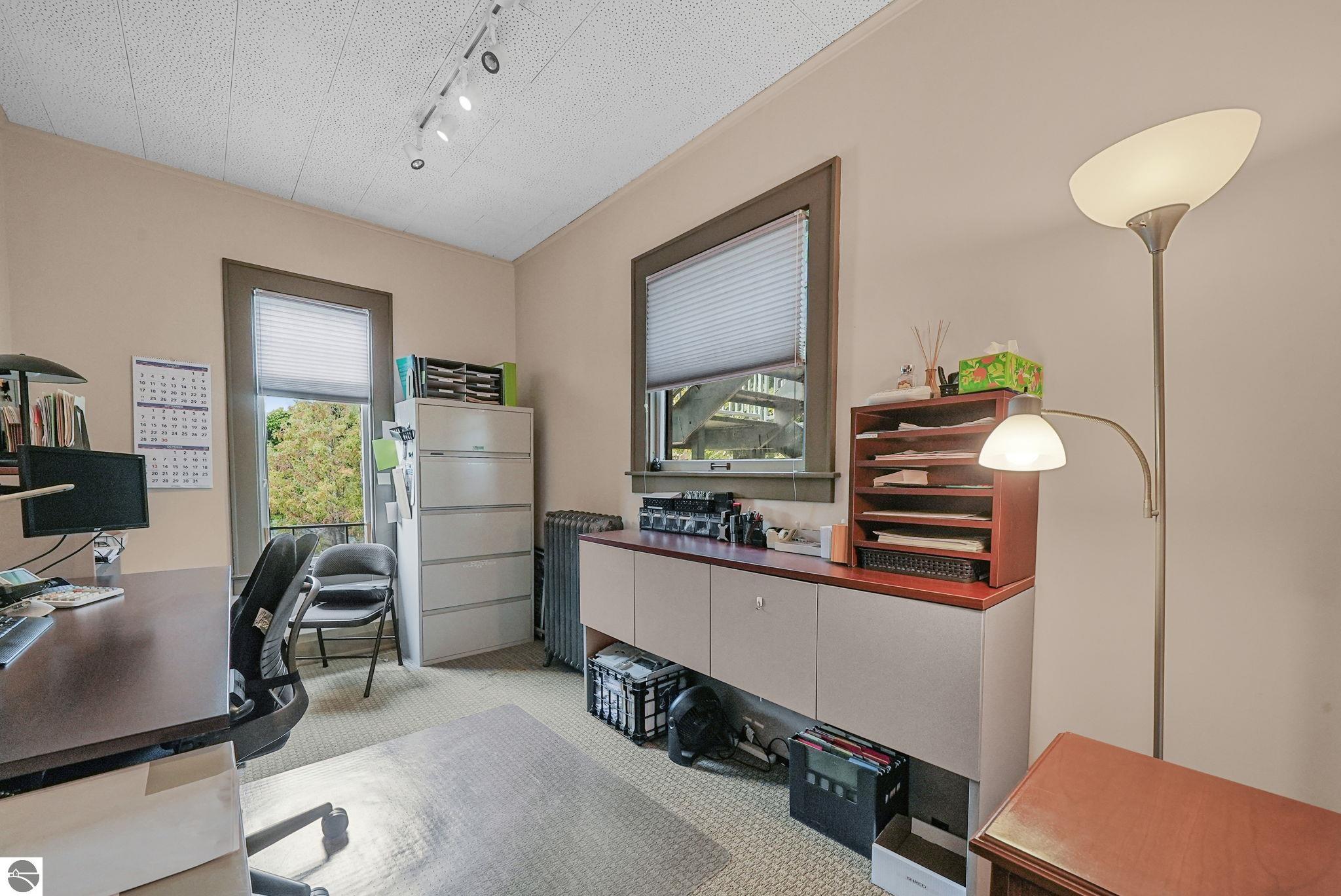 This is one of the most iconic Traverse City structures, and now one of the coolest ownership opportunities of a historic mixed-use property on the corner of 9th and Union Street - large enough to be split by right! This historic Old Town bungalow built in 1915 was constructed with high end craftsmanship and is beautifully preserved - find gorgeous maple hardwood floors, rich original wood trim, and striking 9' coffered ceilings. A grand wood-burning fireplace anchors the spacious living area, complemented by a welcoming foyer, den, office, and main floor primary bedroom. The main floor is currently used as an office, with lots of potential to go easily back to a residence. Upstairs could be a completely separate unit, as it has an additional kitchen, and two or three bedrooms with a private entrance. The finished lower level area adds valuable, flexible living/office space—perfect for a media room, home gym, expanded office use, storage, etc. Sitting on three city lots, the property includes a massive 2+ car garage with oversized door—large enough to potentially fit four vehicles or provide RV/Boat storage. The setting is one of its finest attributes, with a covered front porch to take in the morning sun, or a lovely back patio area and large corner property on the alley to stretch out and enjoy. Big mature trees line the edges of the property as well - it's a must see!