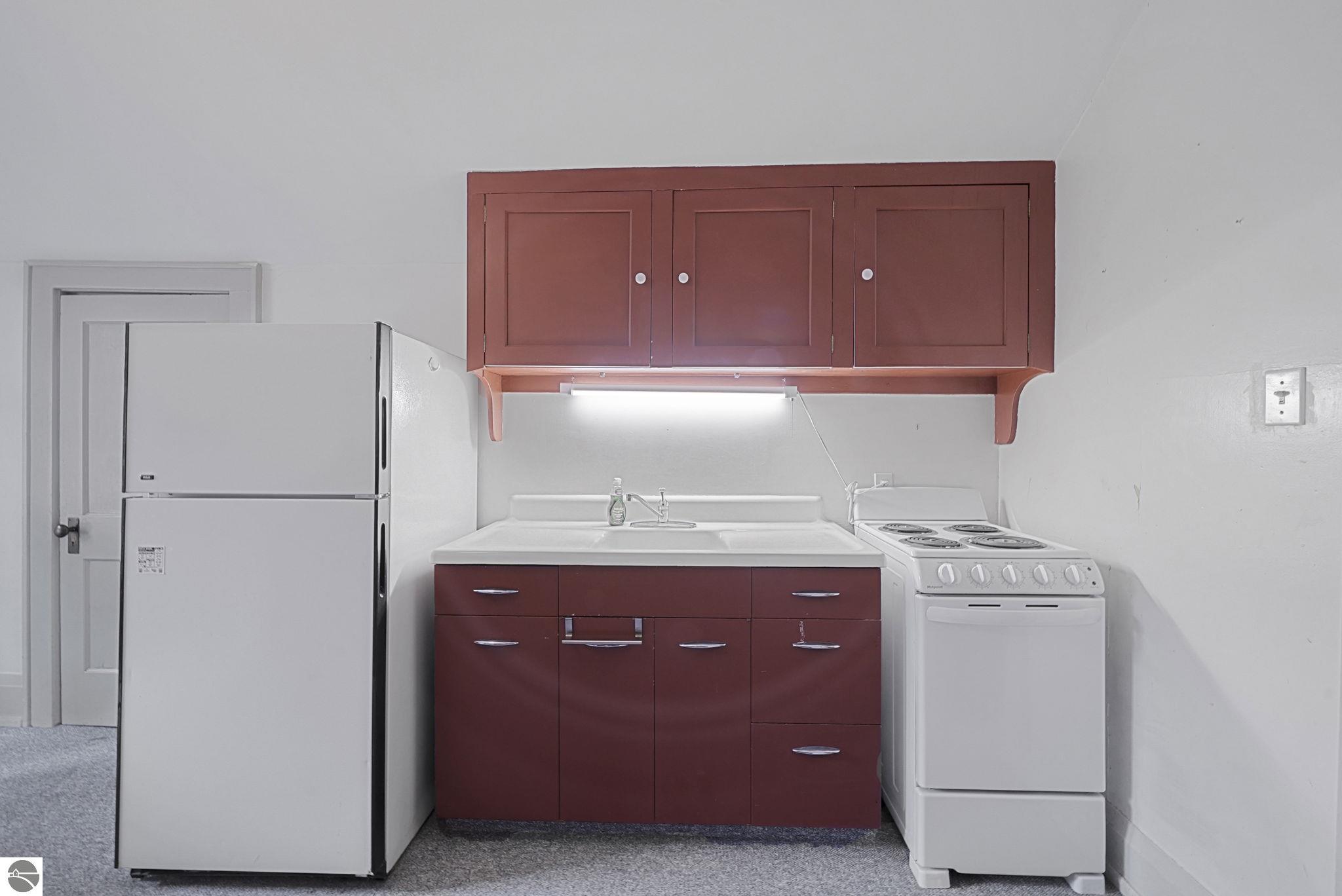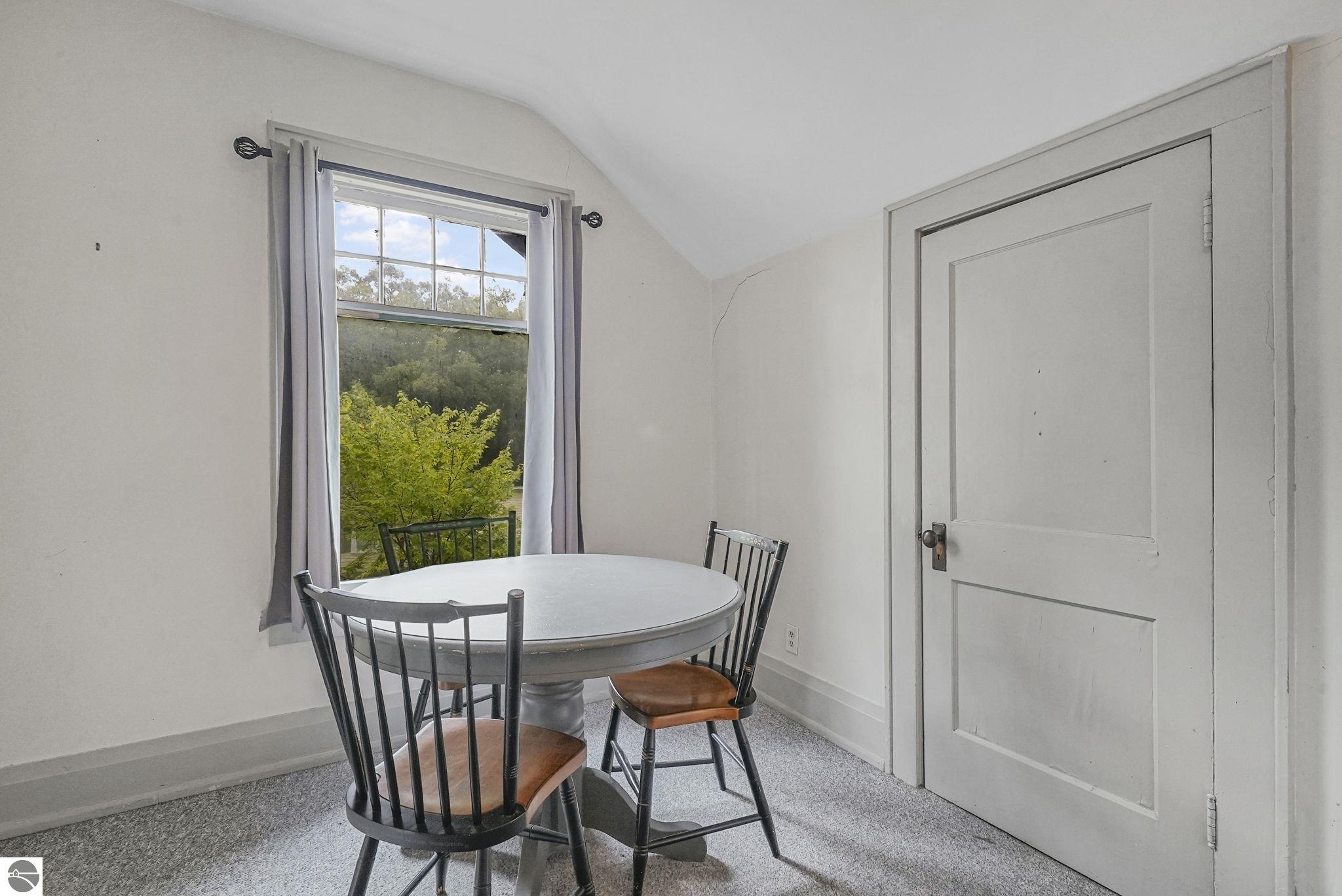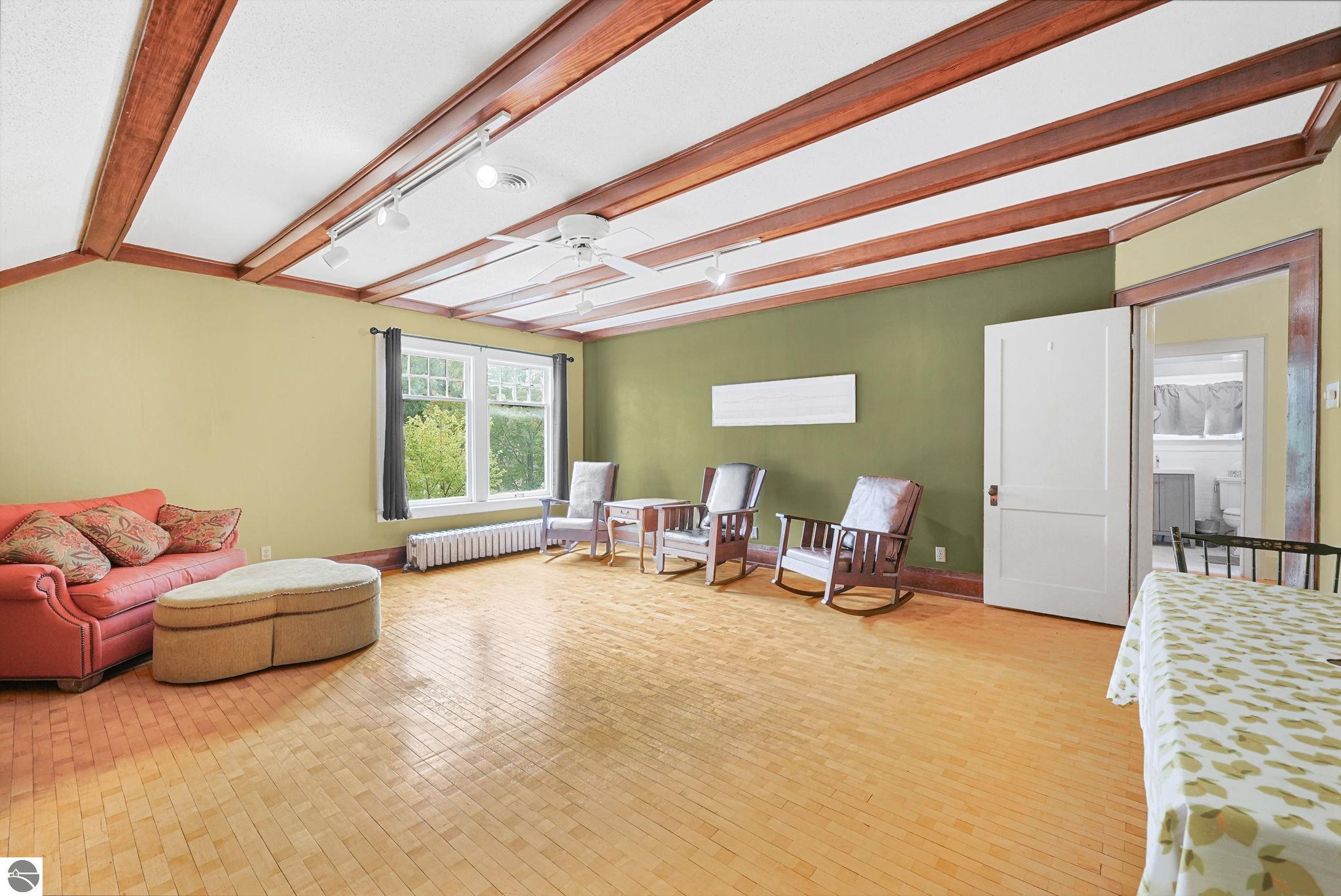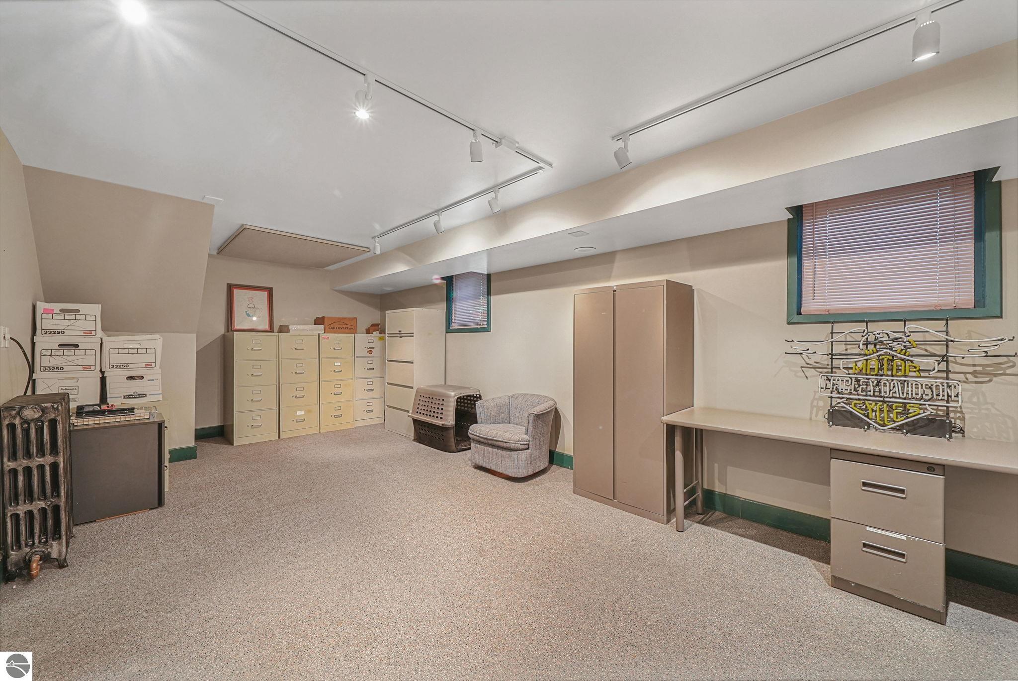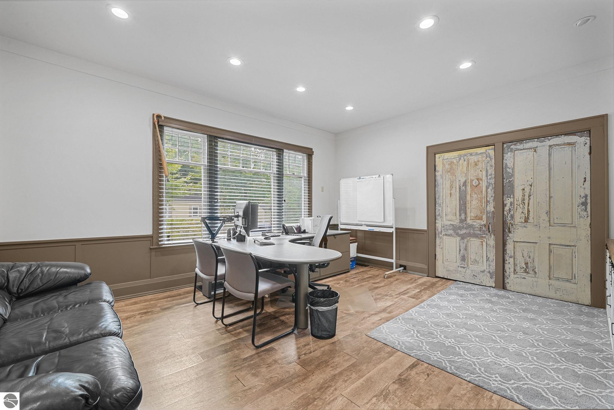This is one of the most iconic Traverse City structures, and now one of the coolest ownership opportunities of a historic mixed-use property on the corner of 9th and Union Street - large enough to be split by right! This historic Old Town bungalow built in 1915 was constructed with high end craftsmanship and is beautifully preserved - find gorgeous maple hardwood floors, rich original wood trim, and striking 9' coffered ceilings. A grand wood-burning fireplace anchors the spacious living area, complemented by a welcoming foyer, den, office, and main floor primary bedroom. The main floor is currently used as an office, with lots of potential to go easily back to a residence. Upstairs could be a completely separate unit, as it has an additional kitchen, and two or three bedrooms with a private entrance. The finished lower level area adds valuable, flexible living/office space—perfect for a media room, home gym, expanded office use, storage, etc. Sitting on three city lots, the property includes a massive 2+ car garage with oversized door—large enough to potentially fit four vehicles or provide RV/Boat storage. The setting is one of its finest attributes, with a covered front porch to take in the morning sun, or a lovely back patio area and large corner property on the alley to stretch out and enjoy. Big mature trees line the edges of the property as well - it's a must see!