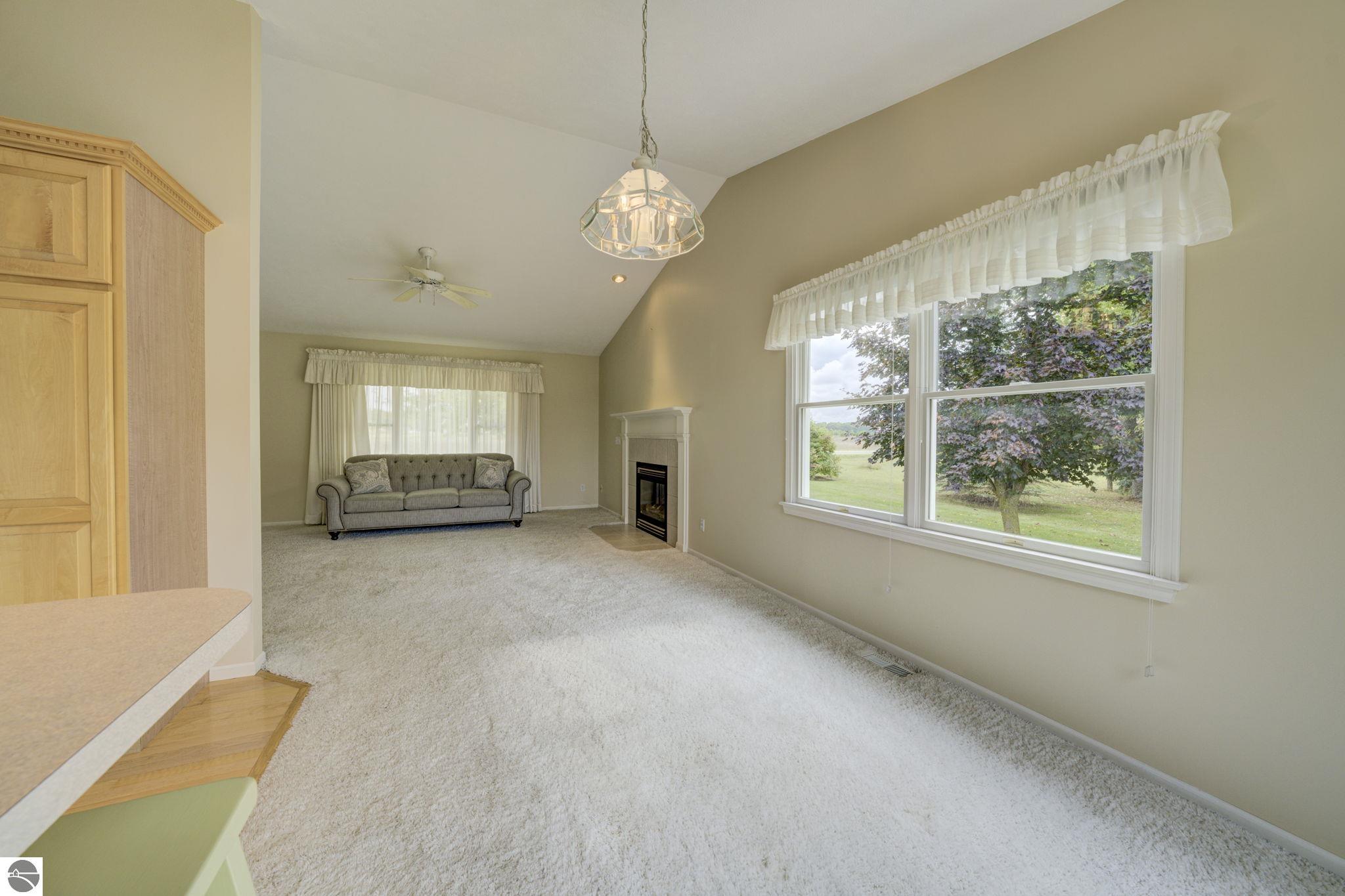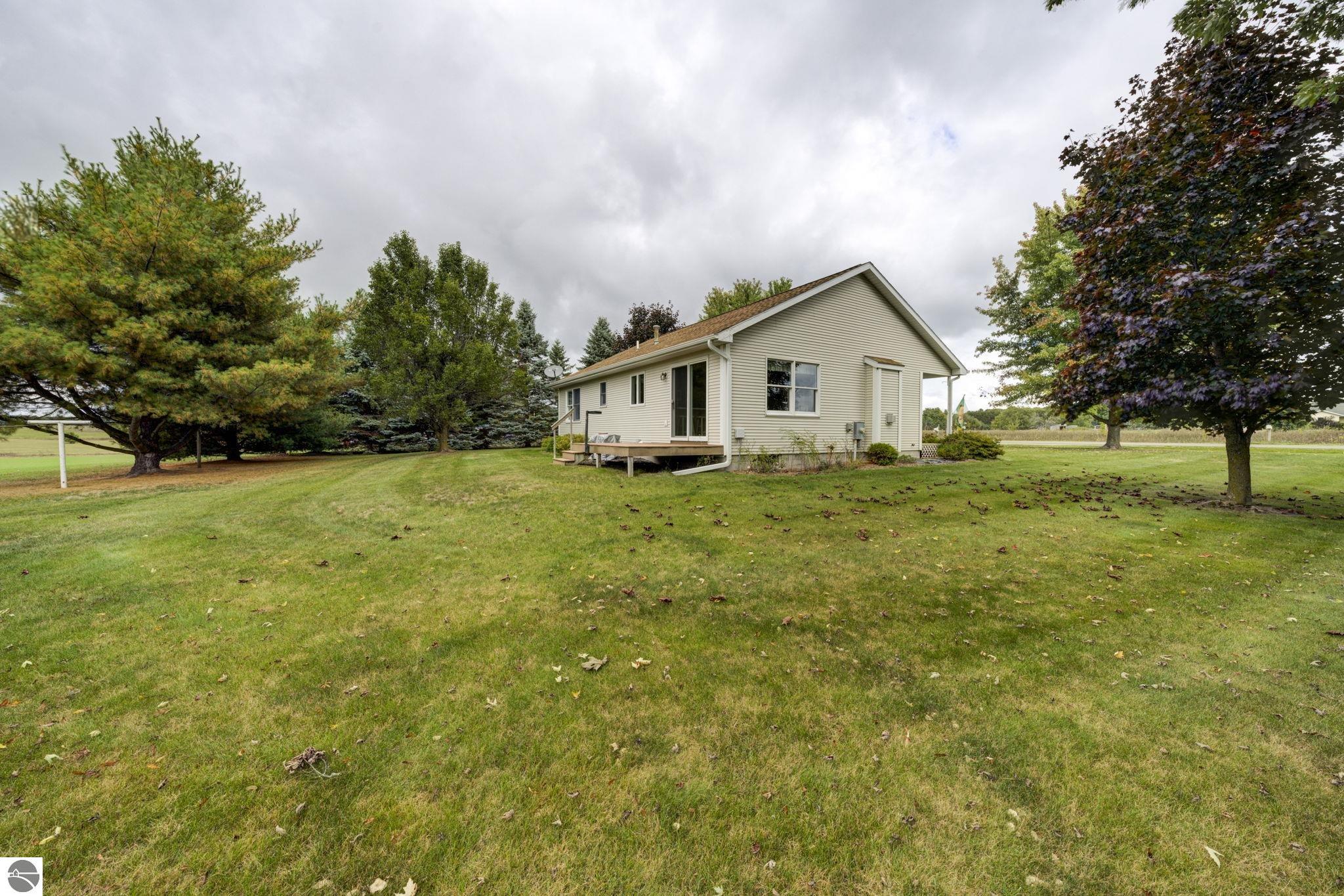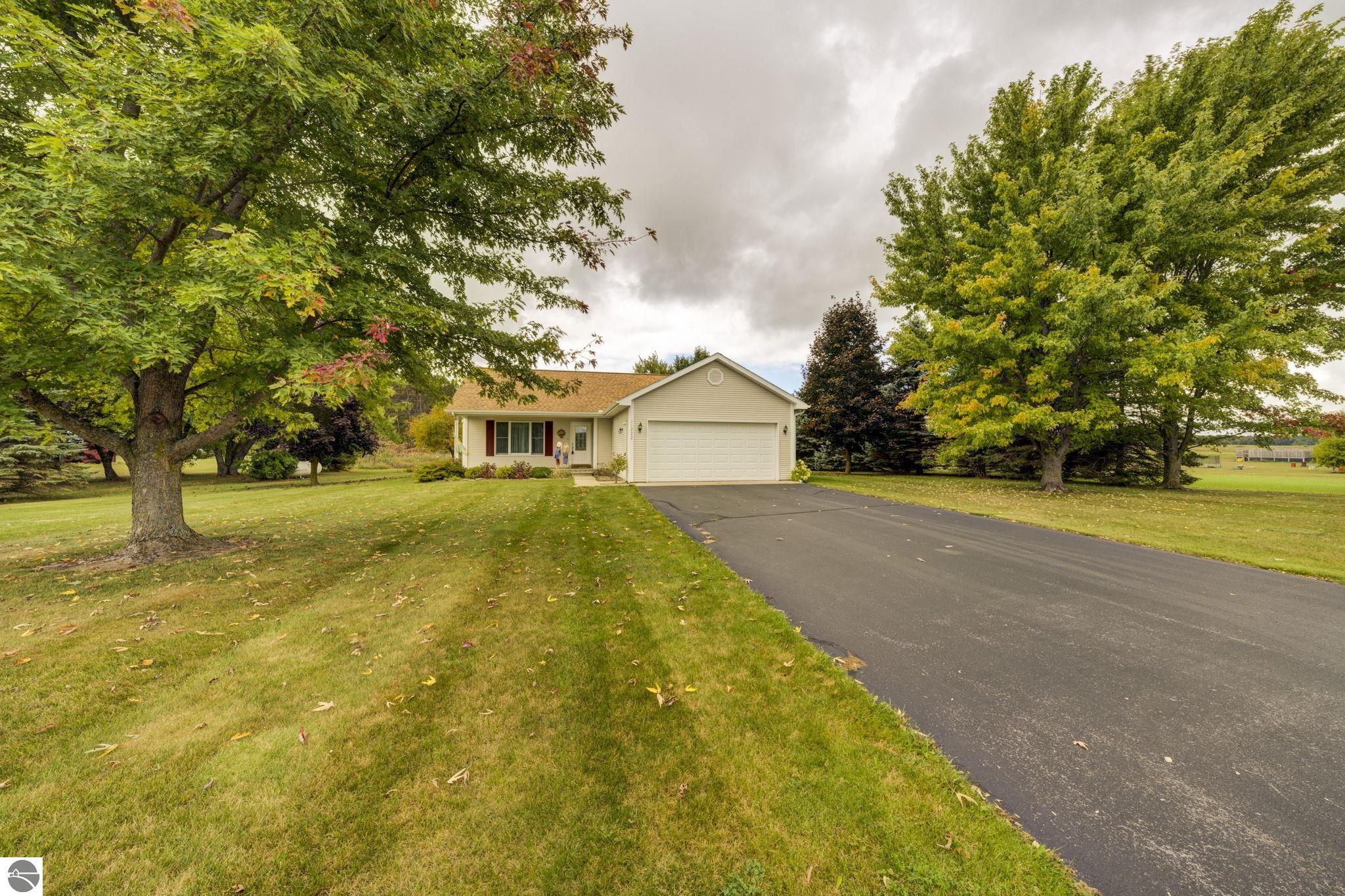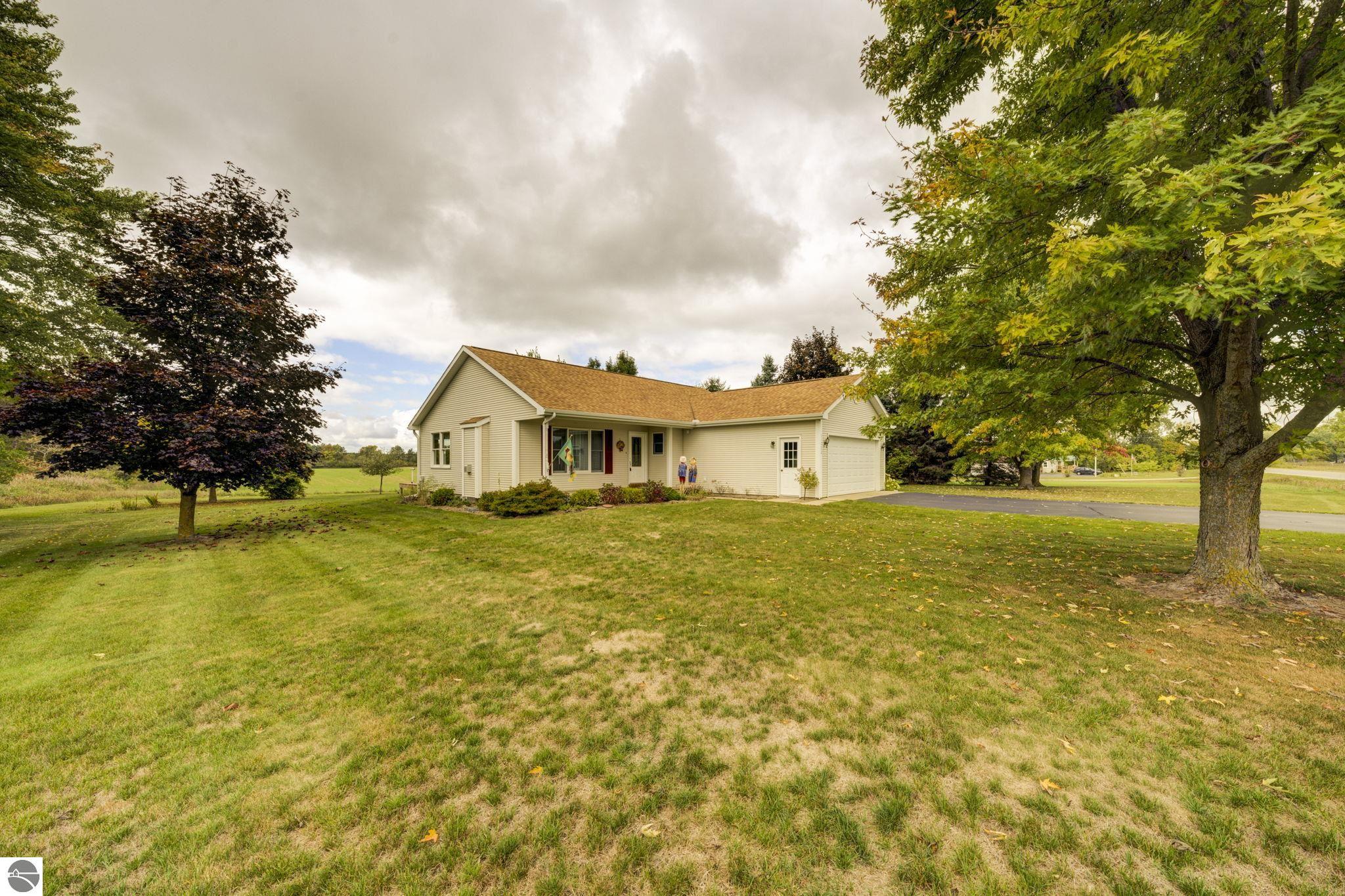 Well maintained ranch style home with all main floor living situated on 10 acres. The covered front porch greets you. Stepping into the home you will find a somewhat open floor plan with a nice sized living room offering plush white carpet, tiled gas fireplace and large daylight windows. You will appreciate the coat closet to keep all items put away and organized and the adjacent mudroom / laundry room with washtub and stackable washer & dryer. The kitchen overlooks the backyard and offers nice cabinetry with a pantry that has pull out drawers, two Lazy Susans, dishwasher and a breakfast bar. The dining area has a slider door that leads you out onto the back deck, facing west, for viewing those beautiful sunsets over the farm field. Walking down the hallway you will find a full bath and the 2nd bedroom along with the primary ensuite offering a TV nook, walk-in closet and a private 3/4 bath. Back out through the mudroom, there is a door that will lead you the stairs to the un-finished lower level where you can envision a future build out or continue to use as a storage room. Also from the mudroom, there is a door that leads you to the attached finished garage which has a side service door for convenience and a handicap ramp that can easily be removed.