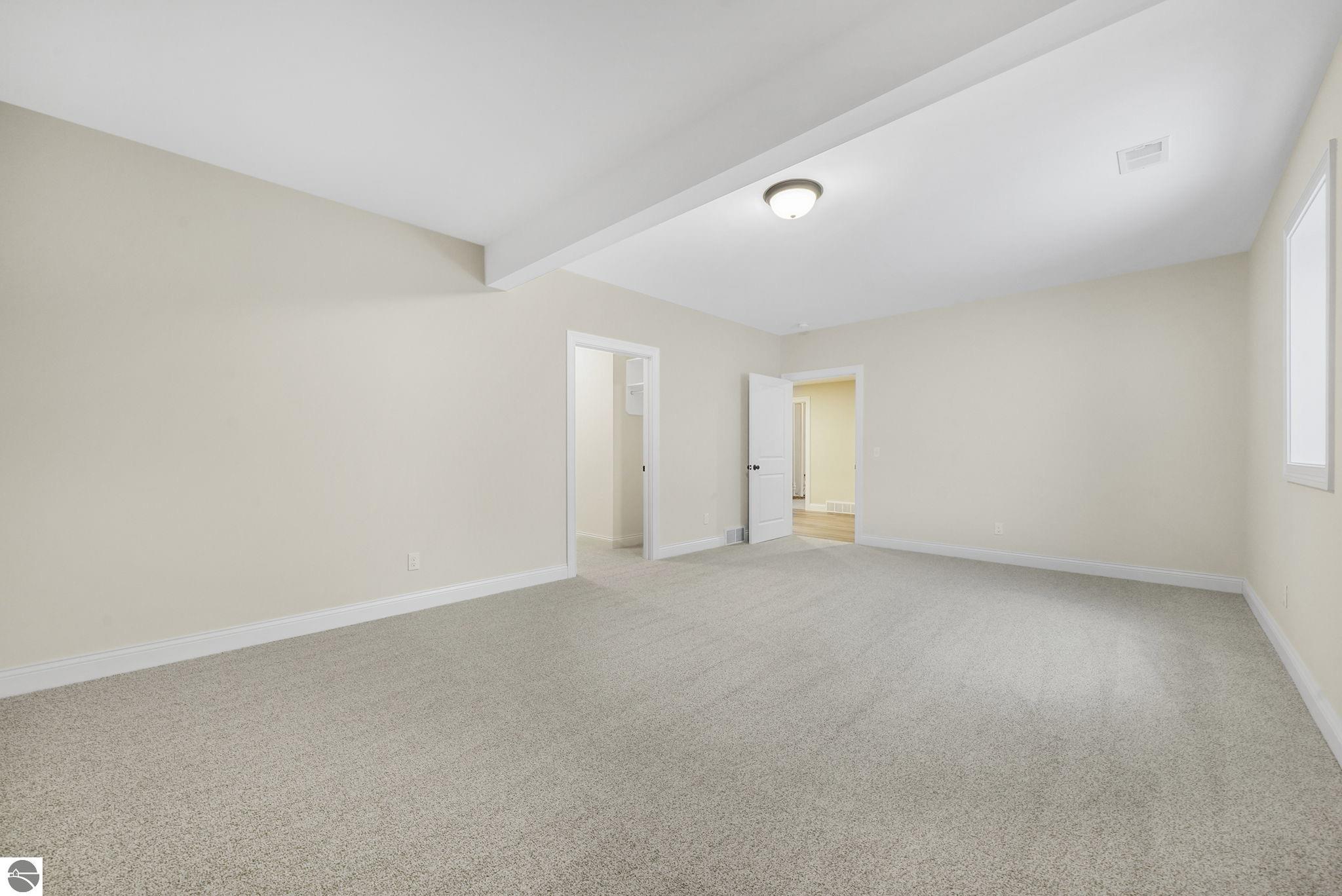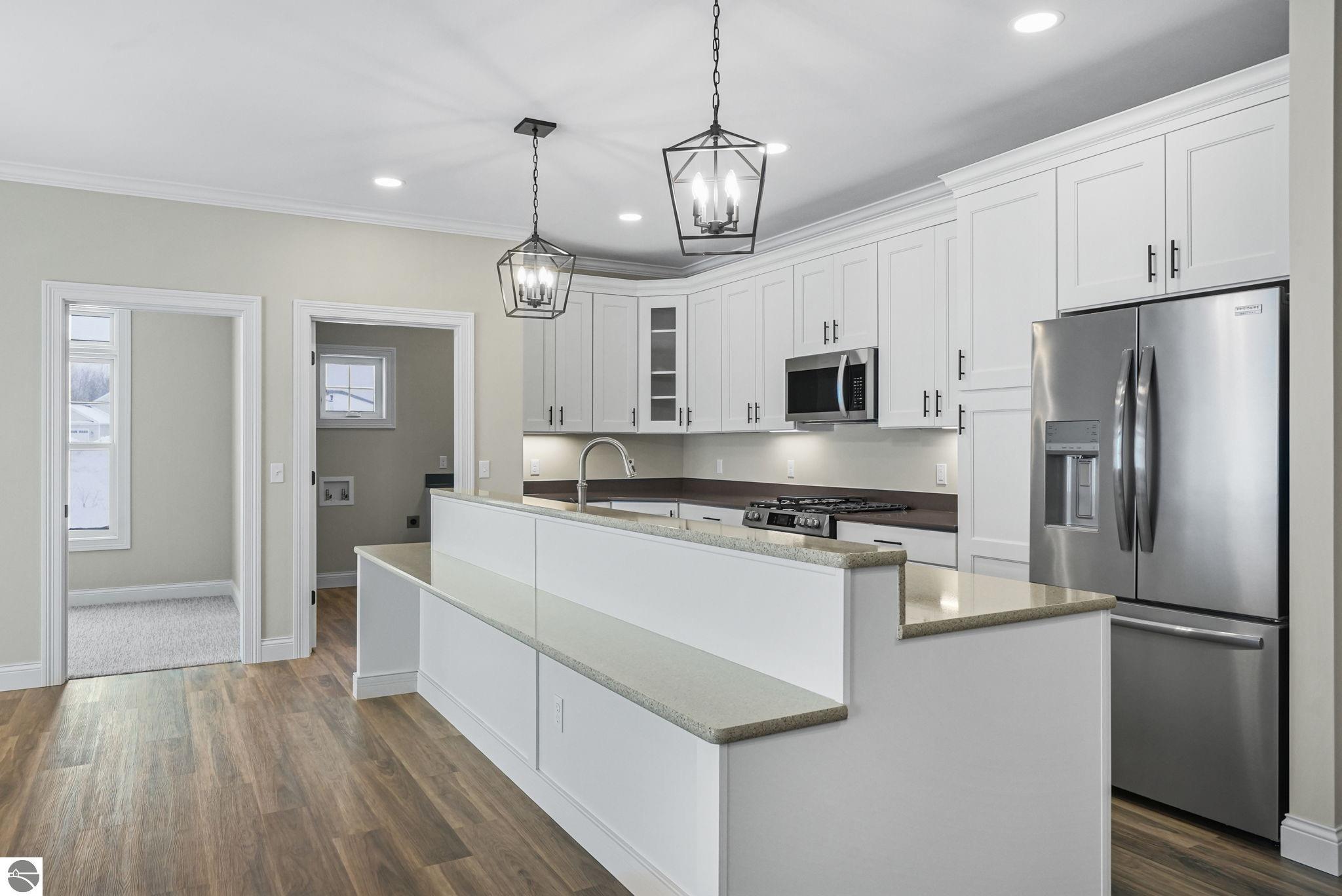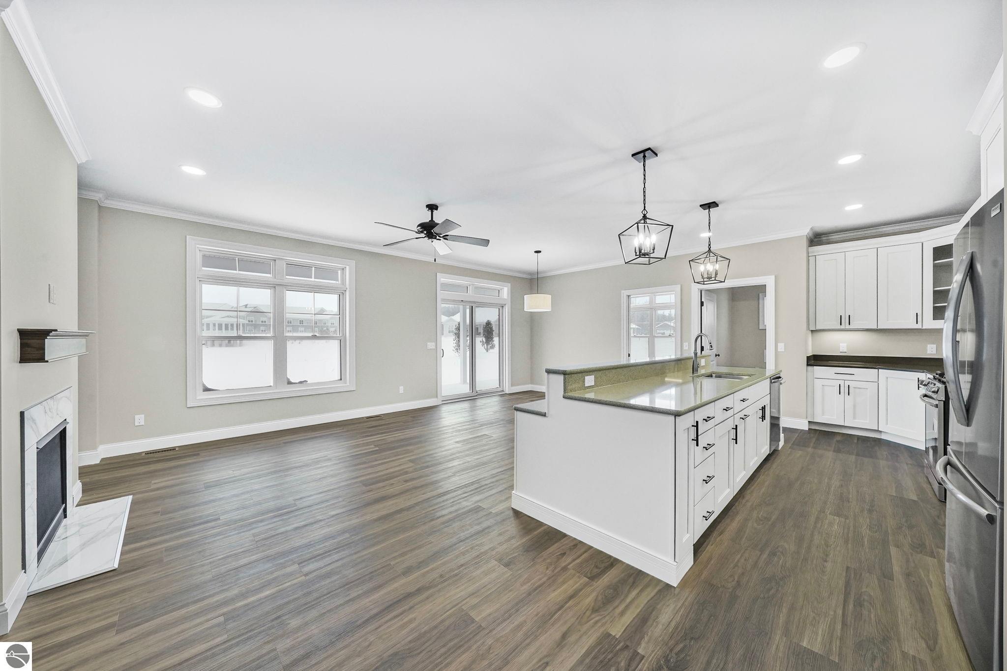 Discover effortless main-floor living in the heart of Meadow Valley, where quality craftsmanship and everyday convenience meet. This well-appointed 3-bedroom, 3-bath ranch features timeless vinyl and stone exterior finishes and a thoughtfully designed interior filled with high-end details throughout. Designed for easy, single-level living, the main floor offers a bright,open layout that brings together comfort and functionality. The inviting living room centers around a cozy gas fireplace and flows seamlessly into the kitchen, complete with stainless steel appliances, soft-close cabinetry, and generous counter space for entertaining. Two bedrooms and two full bathrooms are conveniently located on the main level, along with main-floor laundry, a dedicated office space, and exceptional closet and storage space throughout, making everyday living both simple and efficient.The fully finished lower level expands your living options with endless flexibility. Whether you envision a guest retreat, home gym, recreation space, or media room, this level adapts to your lifestyle. A portion of the basement features durable vinyl flooring, creating an ideal foundation for a future wet bar or entertaining area. The HOA includes lawn care, sprinkler system maintenance, and snow removal of roads and driveways. Optional access to the community clubhouse offers an impressive lineup of amenities, including a fitness center, restaurant, pub, pizza parlor, movie theater, game room, and pickleball courts. Step outside to relax on your private patio, take advantage of neighborhood sidewalks, or explore the dog-walking trail and scenic walking paths with a gazebo and pond. Conveniently located near Munson Medical Center and just minutes from downtown Traverse City’s dining, shopping, entertainment, and recreation, this home offers the perfect blend of comfort, location, and low-maintenance living.