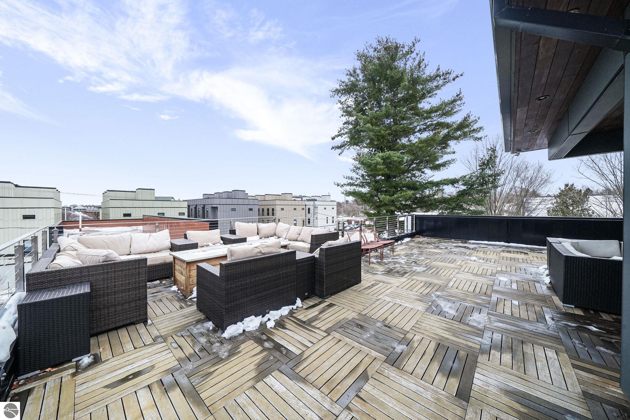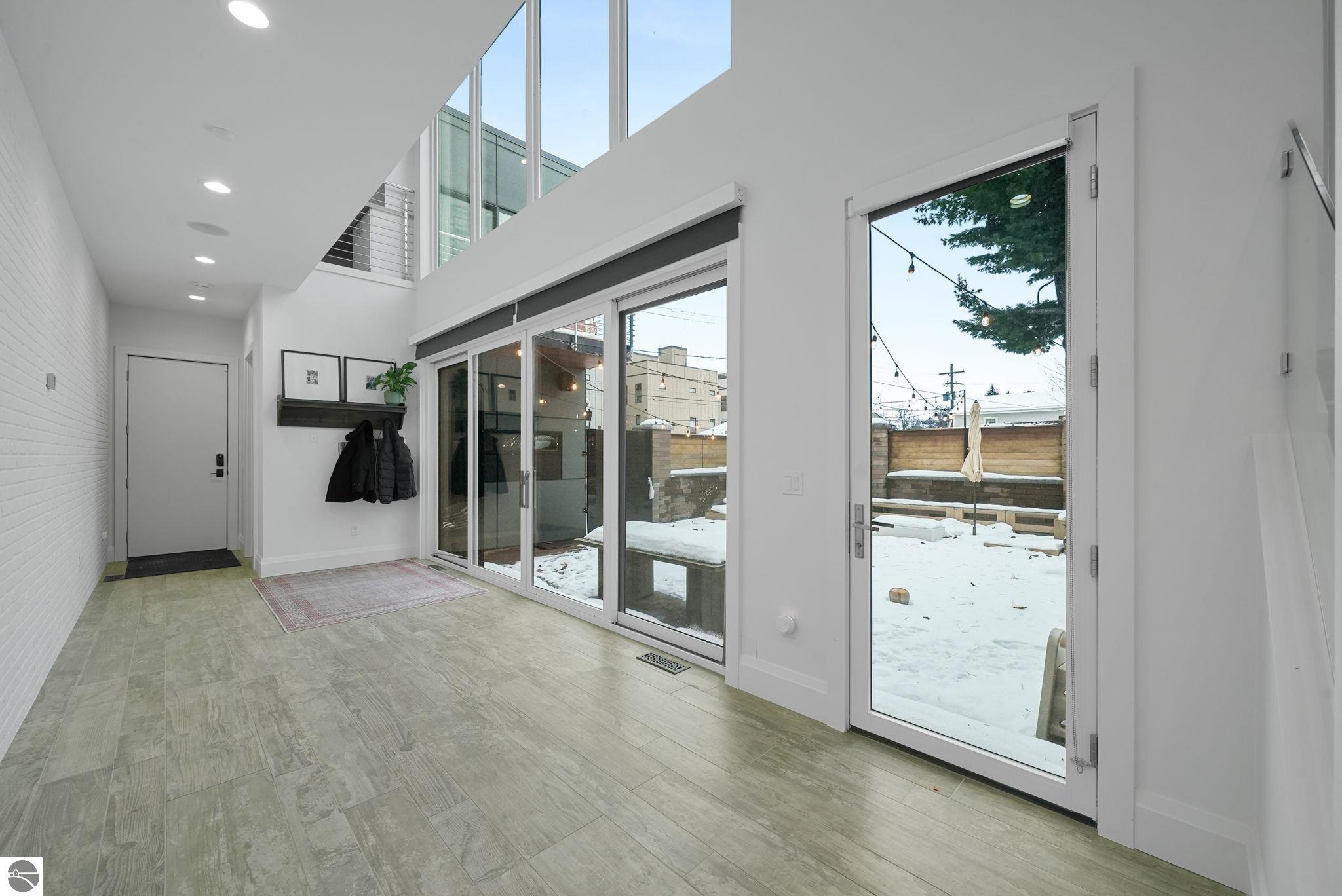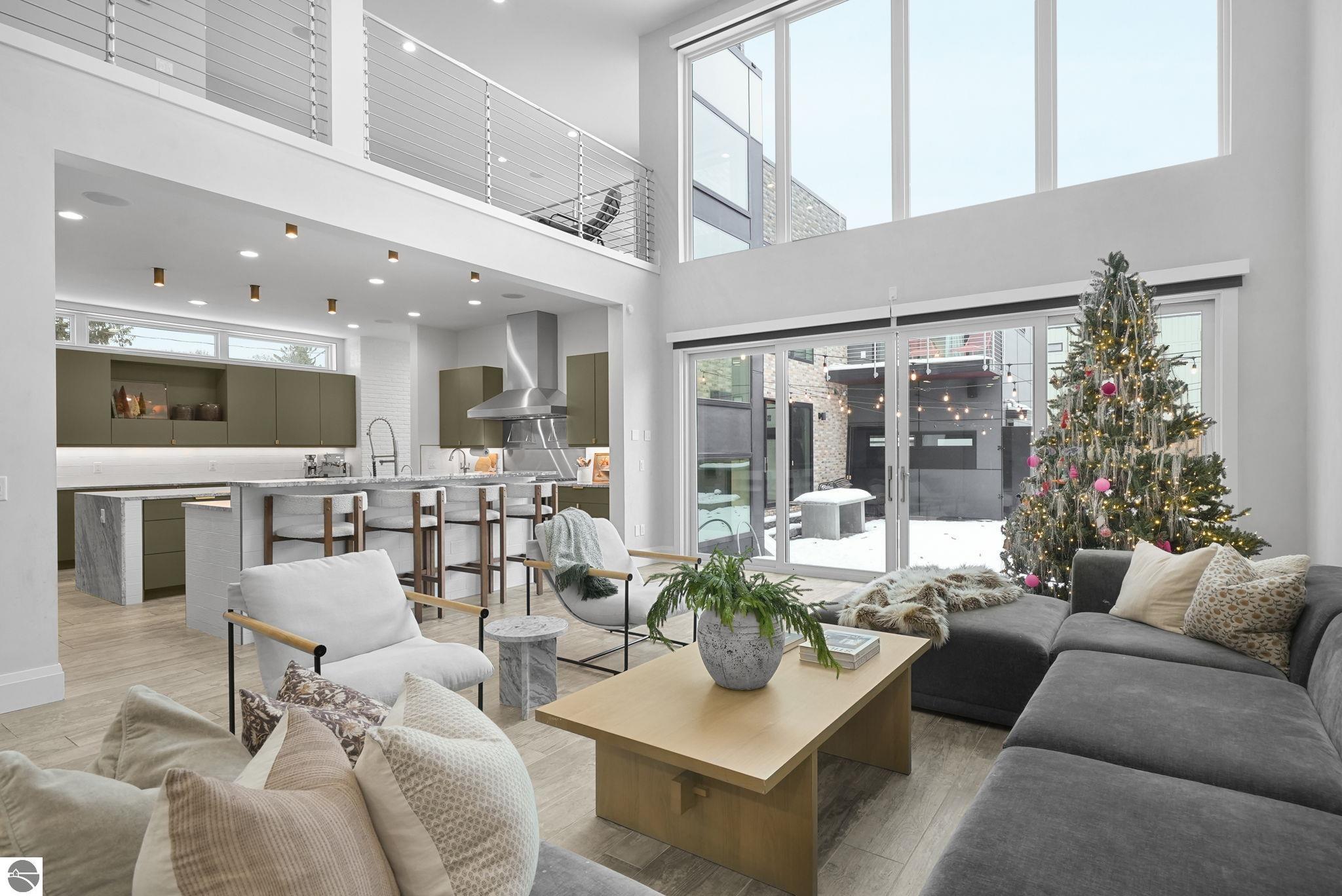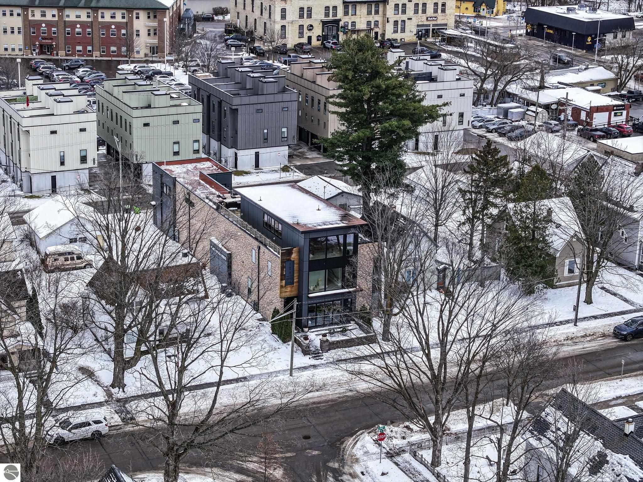 124 North Oak Street - A Premier Contemporary home in Downtown Traverse City. Step into one of Traverse City’s most extraordinary urban residences, perfectly situated on a premier walkable street in the heart of downtown. Meticulously designed and expansive in scale, this contemporary masterpiece offers over 8,000 square feet of refined living space with 8 bedrooms and 10 bathrooms, delivering a home that is as functional as it is striking. Architecturally compelling from façade to interior, the home features a bold blend of brick, warm mid-century wood, and sleek dark contemporary accents. Upon entry, a dramatic double-height living room framed by floor-to-ceiling windows welcomes you, bathing the space in natural light and showcasing thoughtful architectural detailing. Designed for both grand entertaining and comfortable everyday living, the chef-caliber kitchen boasts premium stainless-steel appliances, expansive center island, granite counters, and a walk-in Butler’s pantry. Elegant flow continues through the formal dining room with its dedicated wine chiller, multiple balconies, and generous social spaces on every level. Additional highlights include: A third-floor bar area with a fully equipped secondary kitchen — ideal for entertaining while taking in the expansive rooftop terrace with dramatic Bay views, extending living outdoors with striking panoramas, and the overhead garage door that opens to the outside is a showstopper. A lower level thoughtfully appointed with home office, fitness gym, and theatre / screening room with concessions bar — perfect for family down time. A private enclosed courtyard that serves as a serene space to host dinner parties or simply relax and unwind. This home is walking distance to the best of Traverse City’s dining, retail, arts, and waterfront access, this residence defines downtown luxury living with unrivaled scale, sophistication, and location. Don't miss an opportunity to own one of the premiere downtown homes.