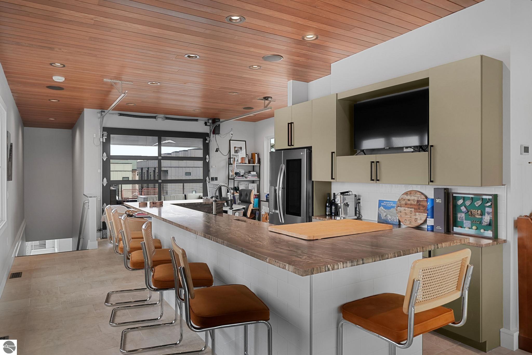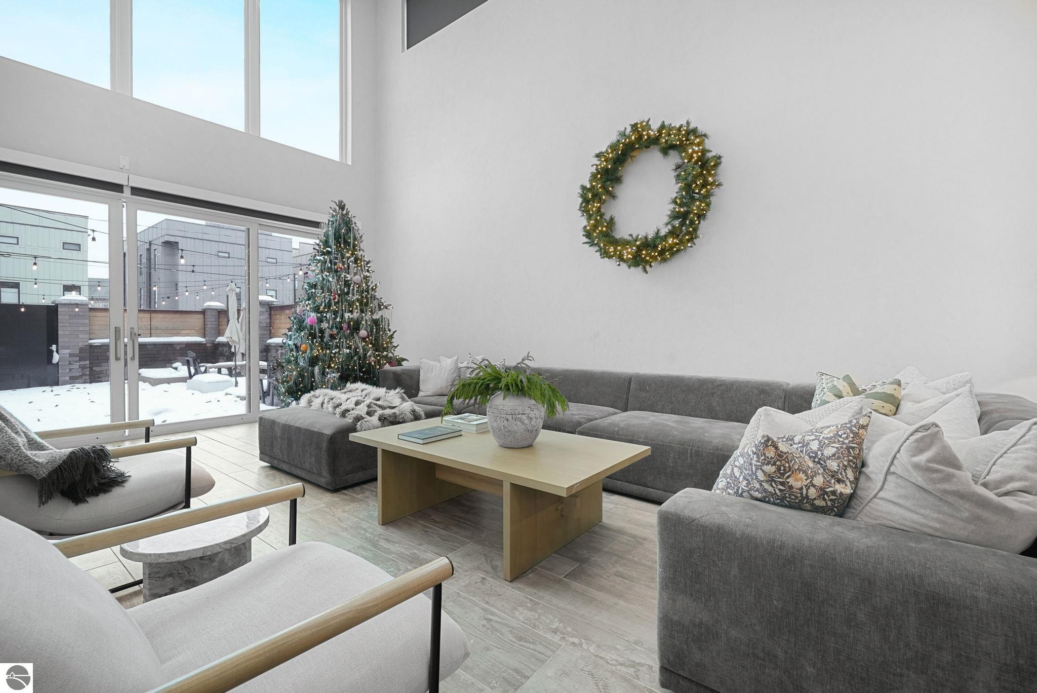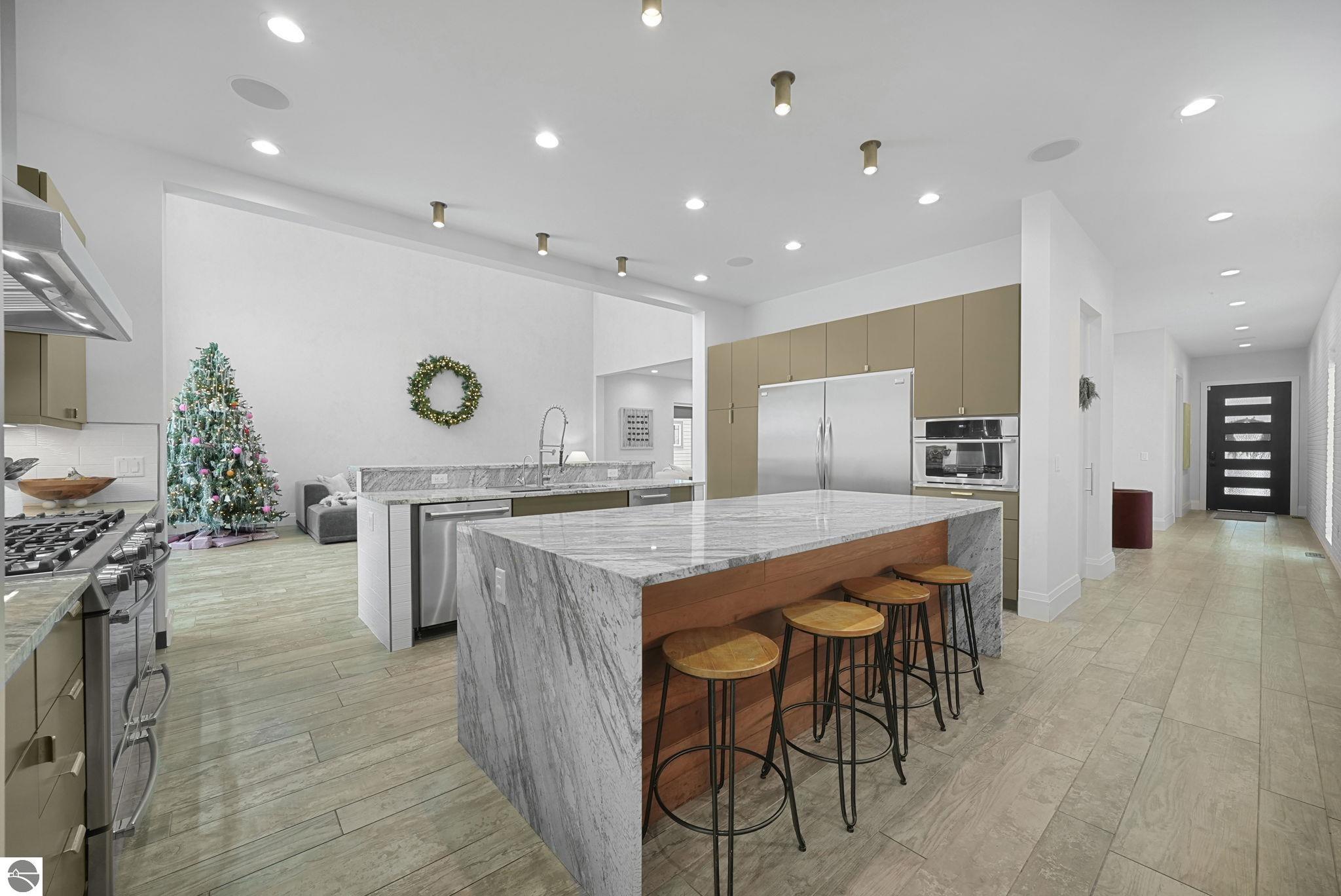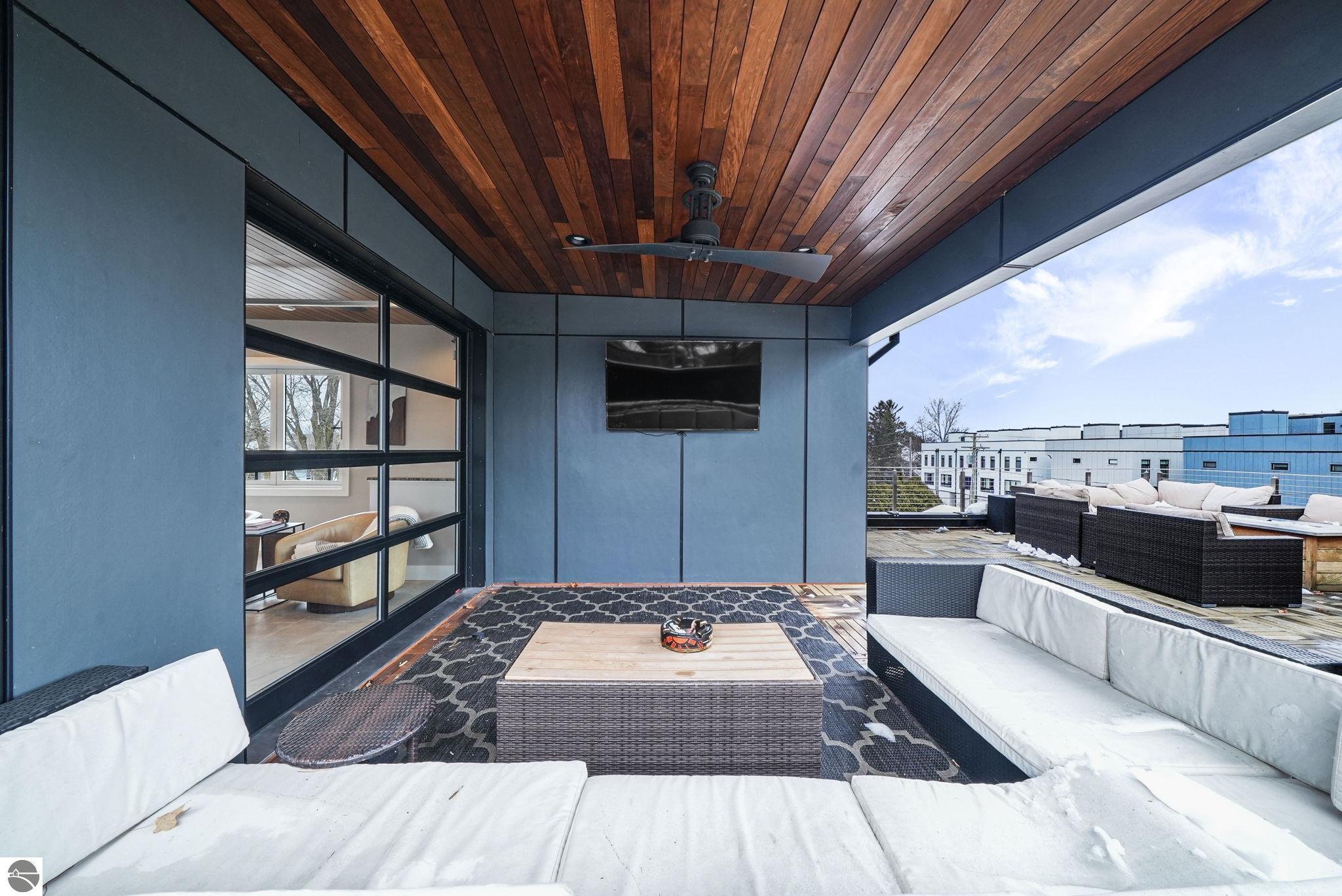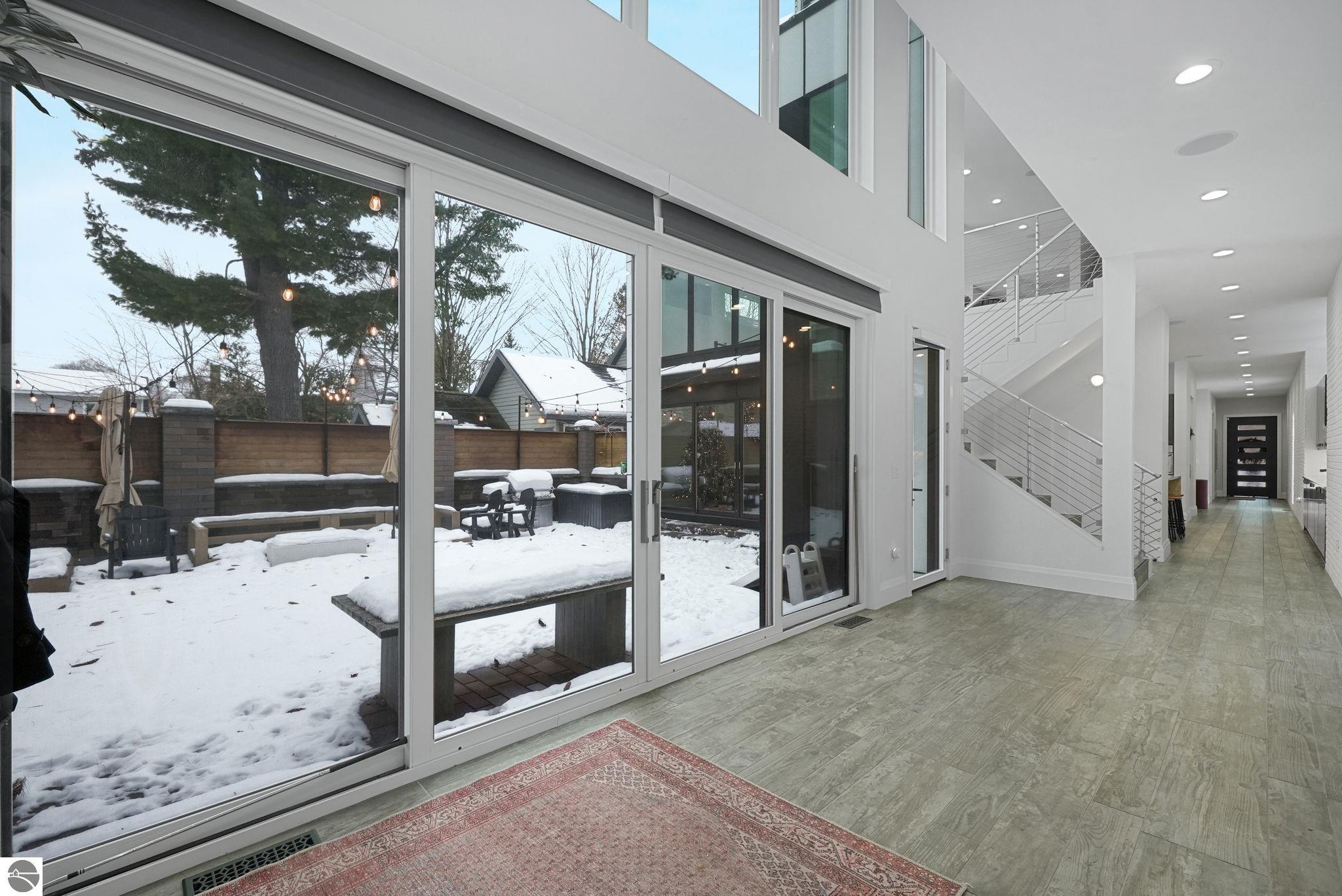 124 North Oak Street - A Premier Contemporary home in Downtown Traverse City. Step into one of Traverse City’s most extraordinary urban residences, perfectly situated on a premier walkable street in the heart of downtown. Meticulously designed and expansive in scale, this contemporary masterpiece offers over 8,000 square feet of refined living space with 8 bedrooms and 10 bathrooms, delivering a home that is as functional as it is striking. Architecturally compelling from façade to interior, the home features a bold blend of brick, warm mid-century wood, and sleek dark contemporary accents. Upon entry, a dramatic double-height living room framed by floor-to-ceiling windows welcomes you, bathing the space in natural light and showcasing thoughtful architectural detailing. Designed for both grand entertaining and comfortable everyday living, the chef-caliber kitchen boasts premium stainless-steel appliances, expansive center island, granite counters, and a walk-in Butler’s pantry. Elegant flow continues through the formal dining room with its dedicated wine chiller, multiple balconies, and generous social spaces on every level. Additional highlights include: A third-floor bar area with a fully equipped secondary kitchen — ideal for entertaining while taking in the expansive rooftop terrace with dramatic Bay views, extending living outdoors with striking panoramas, and the overhead garage door that opens to the outside is a showstopper. A lower level thoughtfully appointed with home office, fitness gym, and theatre / screening room with concessions bar — perfect for family down time. A private enclosed courtyard that serves as a serene space to host dinner parties or simply relax and unwind. This home is walking distance to the best of Traverse City’s dining, retail, arts, and waterfront access, this residence defines downtown luxury living with unrivaled scale, sophistication, and location. Don't miss an opportunity to own one of the premiere downtown homes.