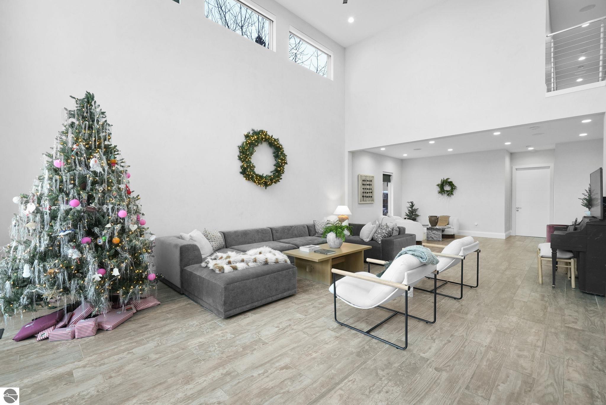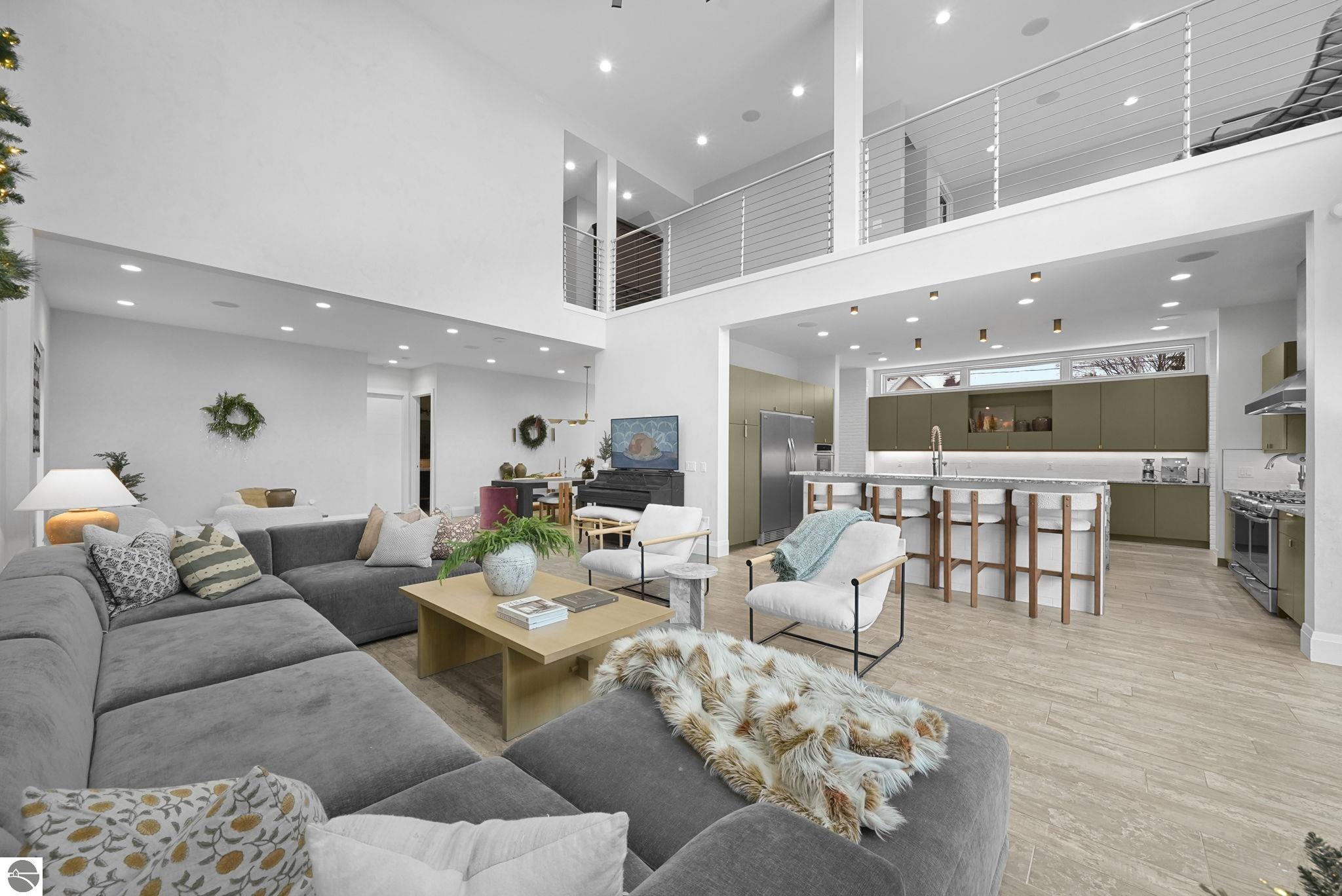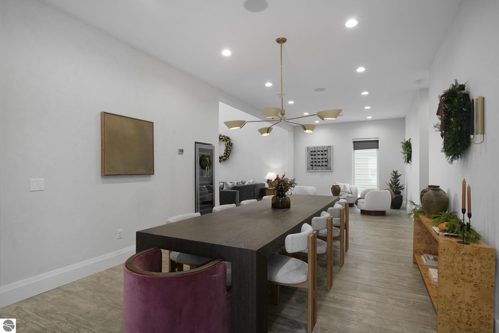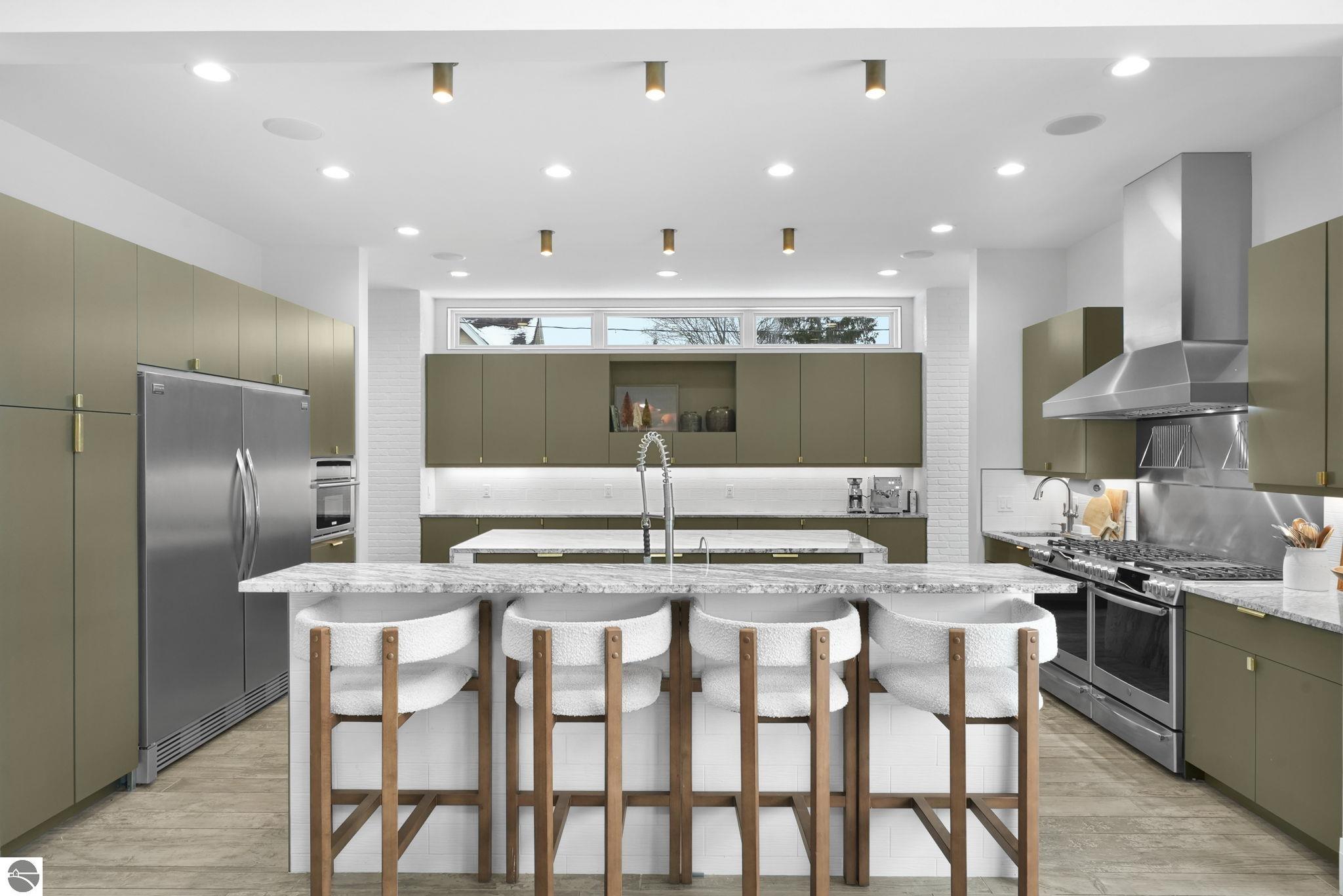 124 North Oak Street - A Premier Contemporary home in Downtown Traverse City. Step into one of Traverse City’s most extraordinary urban residences, perfectly situated on a premier walkable street in the heart of downtown. Meticulously designed and expansive in scale, this contemporary masterpiece offers over 8,000 square feet of refined living space with 8 bedrooms and 10 bathrooms, delivering a home that is as functional as it is striking. Architecturally compelling from façade to interior, the home features a bold blend of brick, warm mid-century wood, and sleek dark contemporary accents. Upon entry, a dramatic double-height living room framed by floor-to-ceiling windows welcomes you, bathing the space in natural light and showcasing thoughtful architectural detailing. Designed for both grand entertaining and comfortable everyday living, the chef-caliber kitchen boasts premium stainless-steel appliances, expansive center island, granite counters, and a walk-in Butler’s pantry. Elegant flow continues through the formal dining room with its dedicated wine chiller, multiple balconies, and generous social spaces on every level. Additional highlights include: A third-floor bar area with a fully equipped secondary kitchen — ideal for entertaining while taking in the expansive rooftop terrace with dramatic Bay views, extending living outdoors with striking panoramas, and the overhead garage door that opens to the outside is a showstopper. A lower level thoughtfully appointed with home office, fitness gym, and theatre / screening room with concessions bar — perfect for family down time. A private enclosed courtyard that serves as a serene space to host dinner parties or simply relax and unwind. This home is walking distance to the best of Traverse City’s dining, retail, arts, and waterfront access, this residence defines downtown luxury living with unrivaled scale, sophistication, and location. Don't miss an opportunity to own one of the premiere downtown homes.