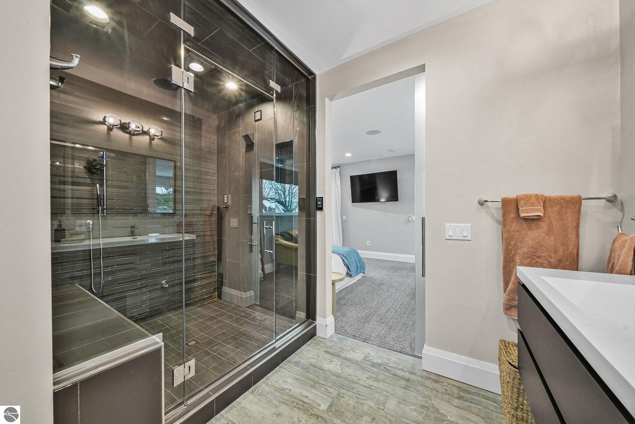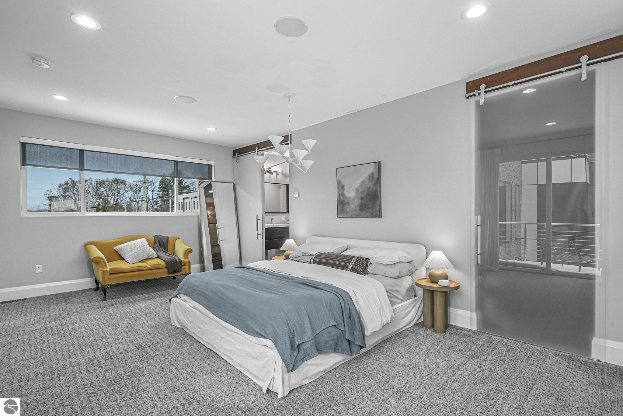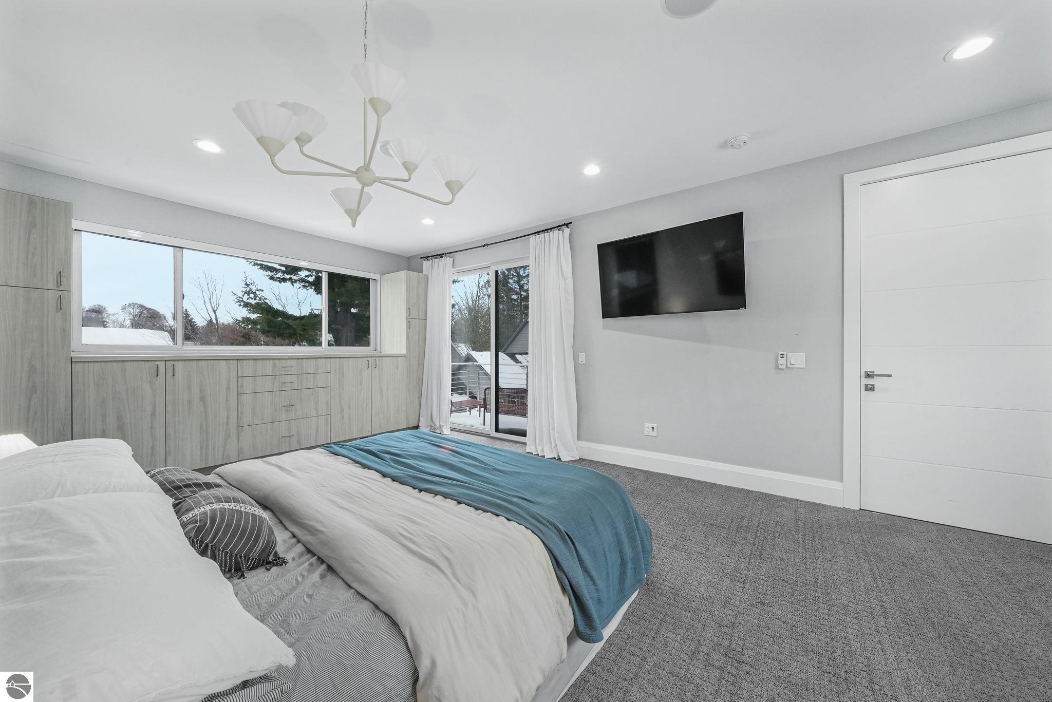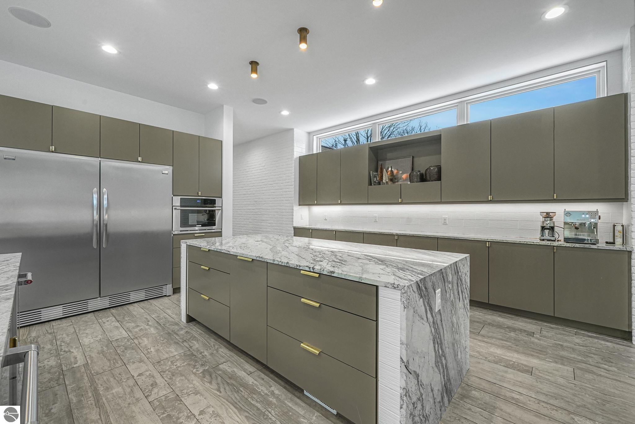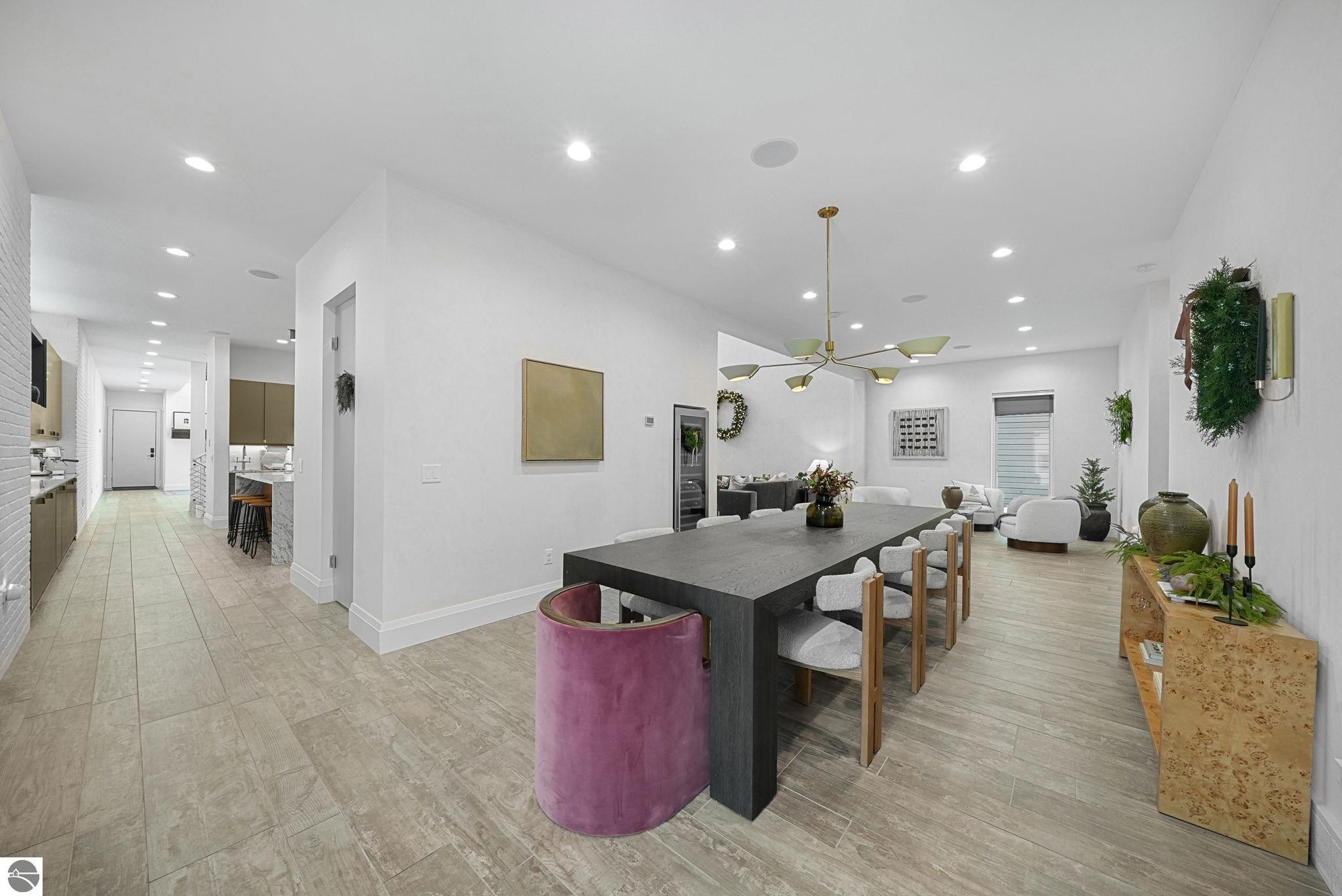 124 North Oak Street - A Premier Contemporary home in Downtown Traverse City. Step into one of Traverse City’s most extraordinary urban residences, perfectly situated on a premier walkable street in the heart of downtown. Meticulously designed and expansive in scale, this contemporary masterpiece offers over 8,000 square feet of refined living space with 8 bedrooms and 10 bathrooms, delivering a home that is as functional as it is striking. Architecturally compelling from façade to interior, the home features a bold blend of brick, warm mid-century wood, and sleek dark contemporary accents. Upon entry, a dramatic double-height living room framed by floor-to-ceiling windows welcomes you, bathing the space in natural light and showcasing thoughtful architectural detailing. Designed for both grand entertaining and comfortable everyday living, the chef-caliber kitchen boasts premium stainless-steel appliances, expansive center island, granite counters, and a walk-in Butler’s pantry. Elegant flow continues through the formal dining room with its dedicated wine chiller, multiple balconies, and generous social spaces on every level. Additional highlights include: A third-floor bar area with a fully equipped secondary kitchen — ideal for entertaining while taking in the expansive rooftop terrace with dramatic Bay views, extending living outdoors with striking panoramas, and the overhead garage door that opens to the outside is a showstopper. A lower level thoughtfully appointed with home office, fitness gym, and theatre / screening room with concessions bar — perfect for family down time. A private enclosed courtyard that serves as a serene space to host dinner parties or simply relax and unwind. This home is walking distance to the best of Traverse City’s dining, retail, arts, and waterfront access, this residence defines downtown luxury living with unrivaled scale, sophistication, and location. Don't miss an opportunity to own one of the premiere downtown homes.