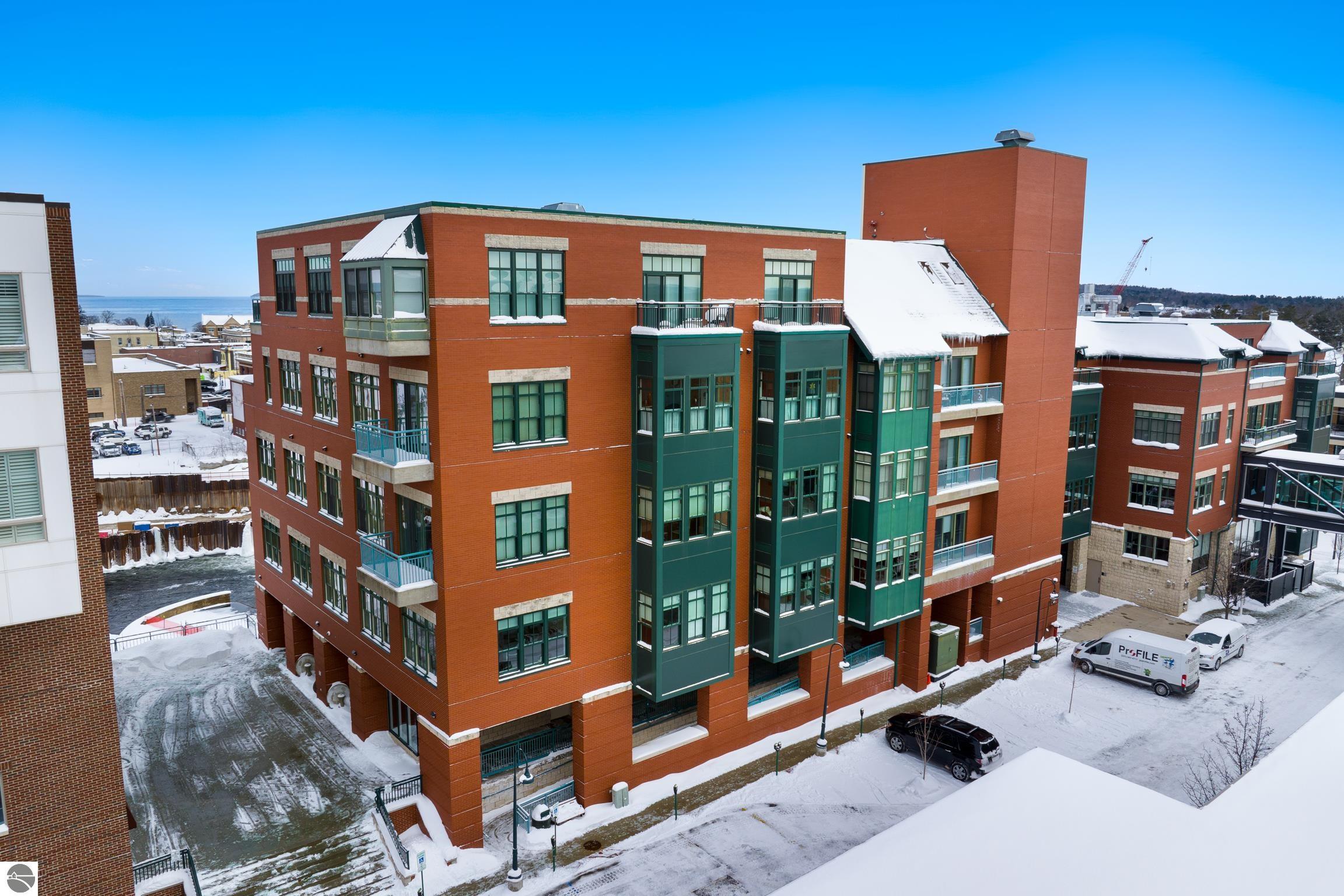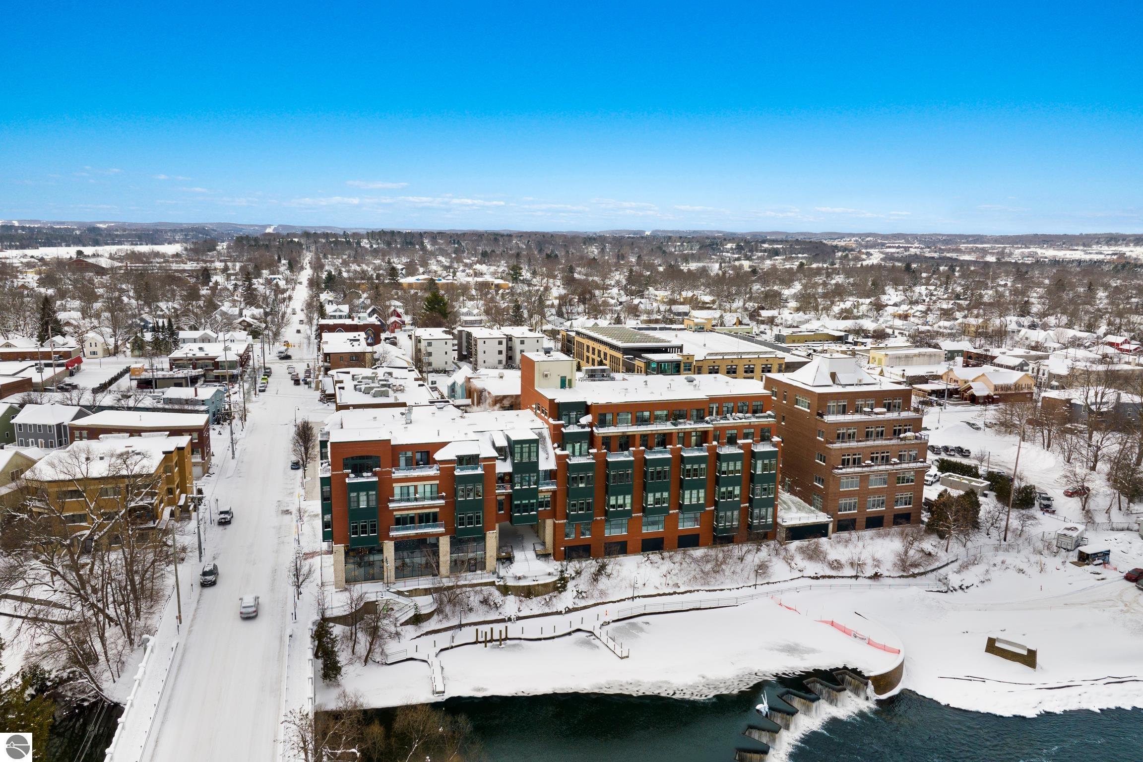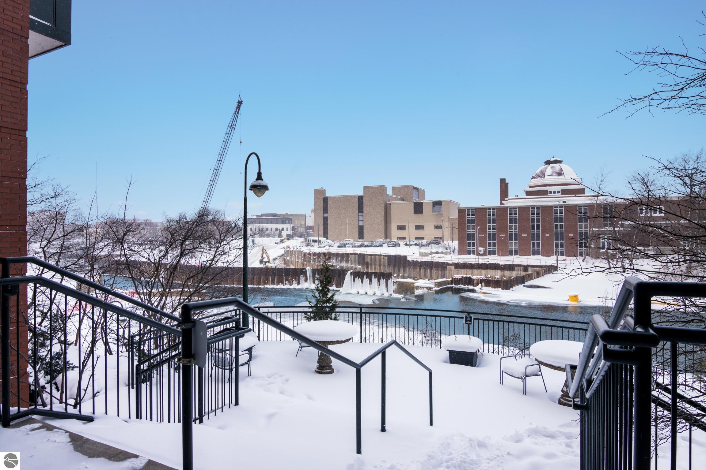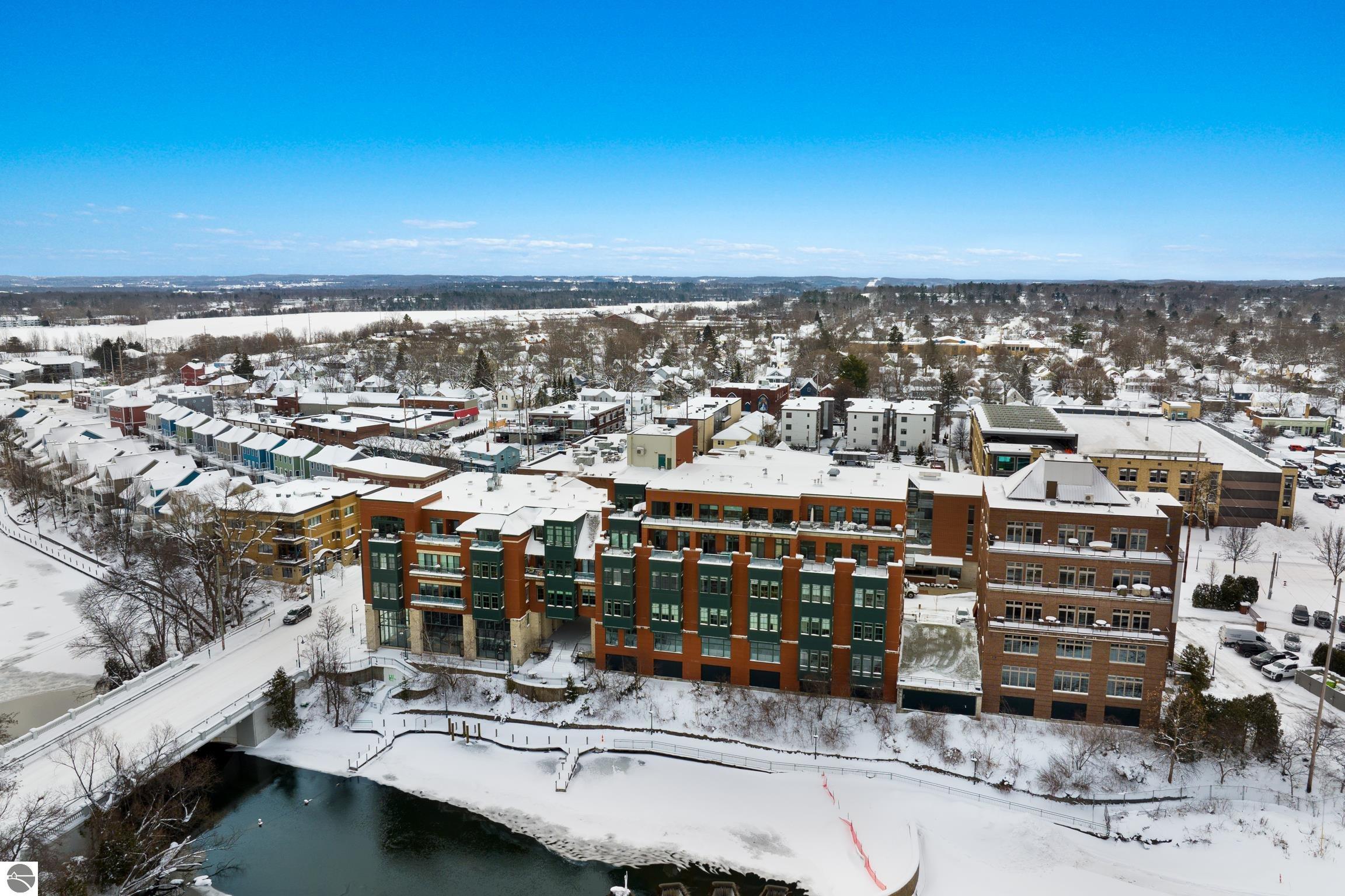 Take advantage of condo living at its very best, plus a fantastic location in the heart of downtown Traverse City. This 4th floor unit offers wonderful views of Grand Traverse Bay, the Boardman River and downtown Traverse City, the private balcony runs the length of the unit for maximum enjoyment of the outdoor space. This end unit has gorgeous natural light streaming in. The spacious living room has a gas burning fireplace and amazing views. The primary suite also takes full advantage of the view and has a private bath and walk in closet. Kitchen has new easy care counter tops and stainless steel appliances with a very efficient use of space and casual counter dining. Additional office and guest room both have their own bathrooms. The association also has a waterside community patio area, secure underground parking with elevator to unit. Association dues cover, basic cable, water, gas, heat/cooling, trash/recycling, snow removal, parking area maintenance and window cleaning.