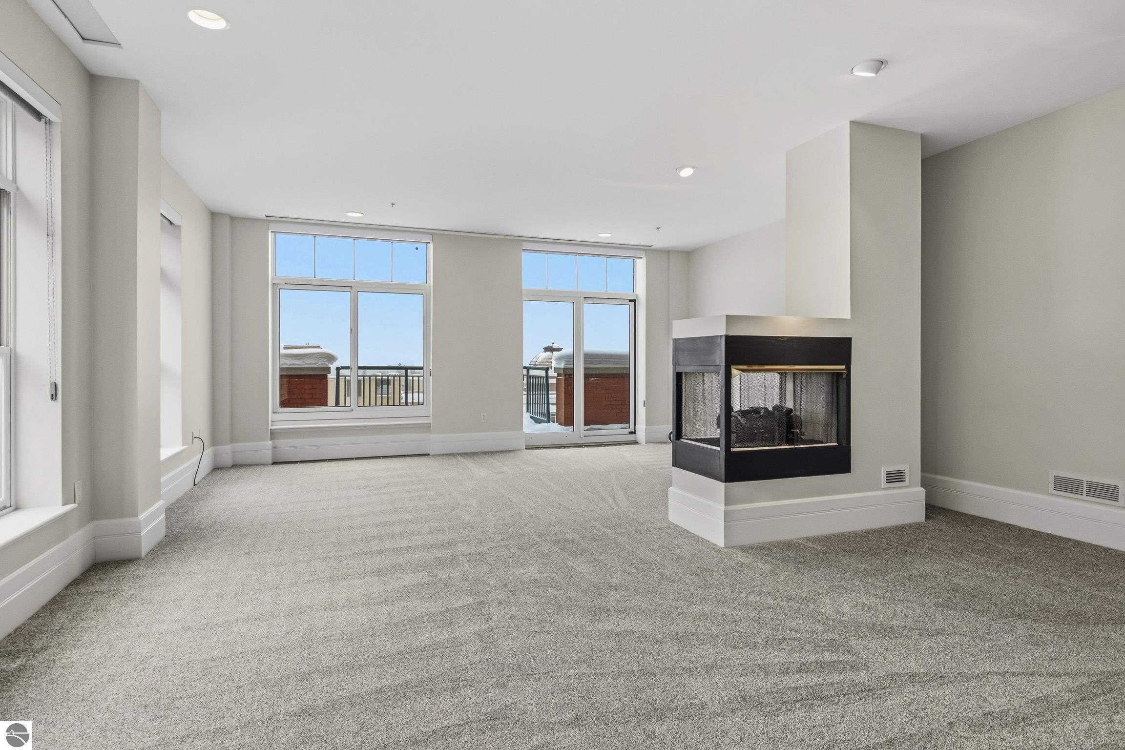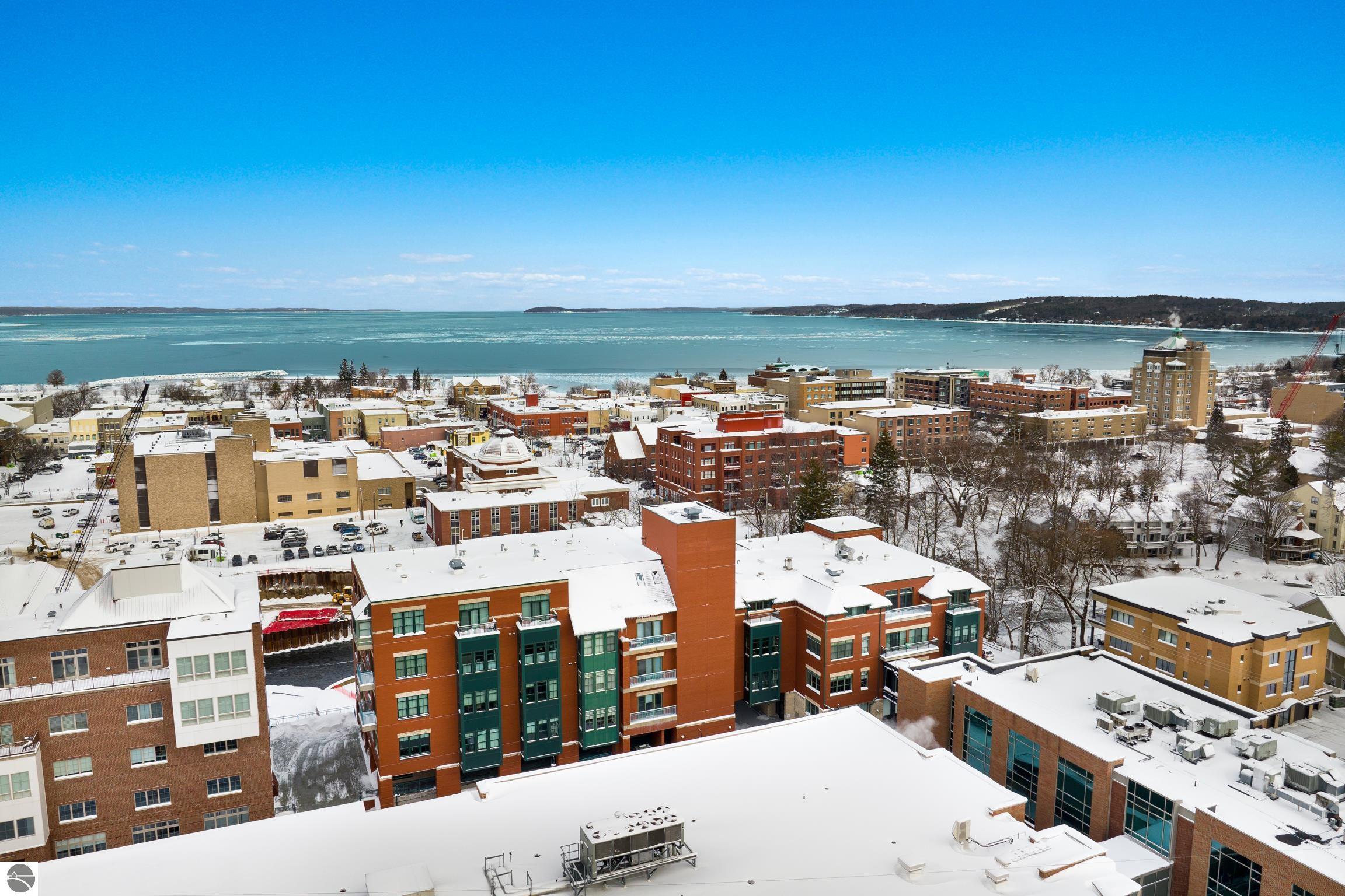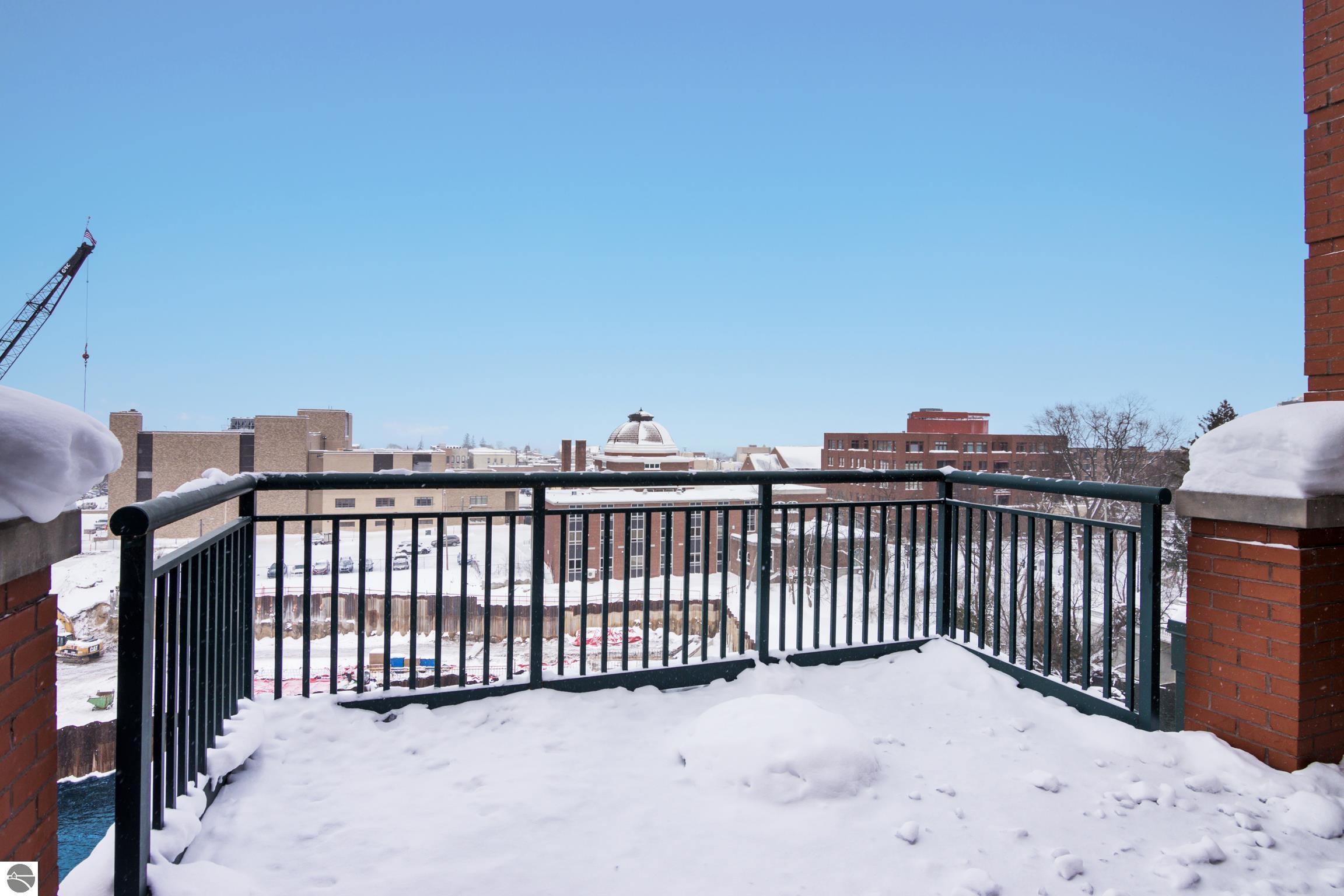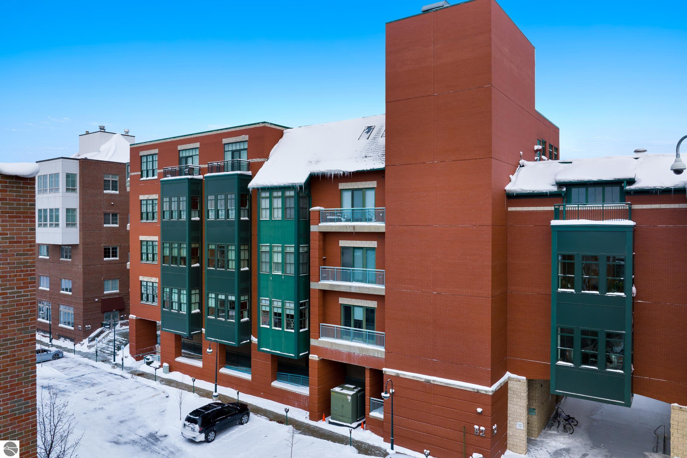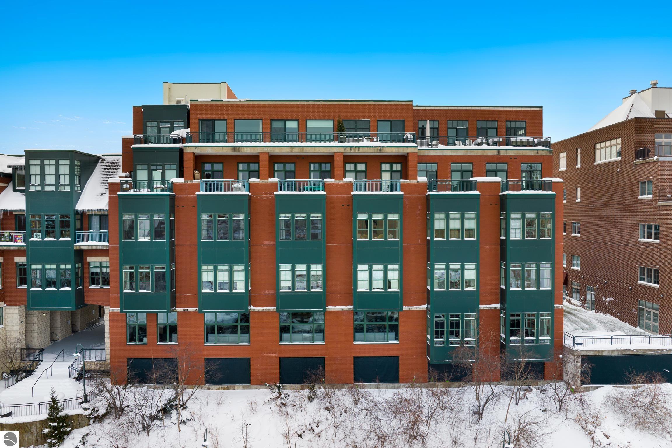 Take advantage of condo living at its very best, plus a fantastic location in the heart of downtown Traverse City. This 4th floor unit offers wonderful views of Grand Traverse Bay, the Boardman River and downtown Traverse City, the private balcony runs the length of the unit for maximum enjoyment of the outdoor space. This end unit has gorgeous natural light streaming in. The spacious living room has a gas burning fireplace and amazing views. The primary suite also takes full advantage of the view and has a private bath and walk in closet. Kitchen has new easy care counter tops and stainless steel appliances with a very efficient use of space and casual counter dining. Additional office and guest room both have their own bathrooms. The association also has a waterside community patio area, secure underground parking with elevator to unit. Association dues cover, basic cable, water, gas, heat/cooling, trash/recycling, snow removal, parking area maintenance and window cleaning.