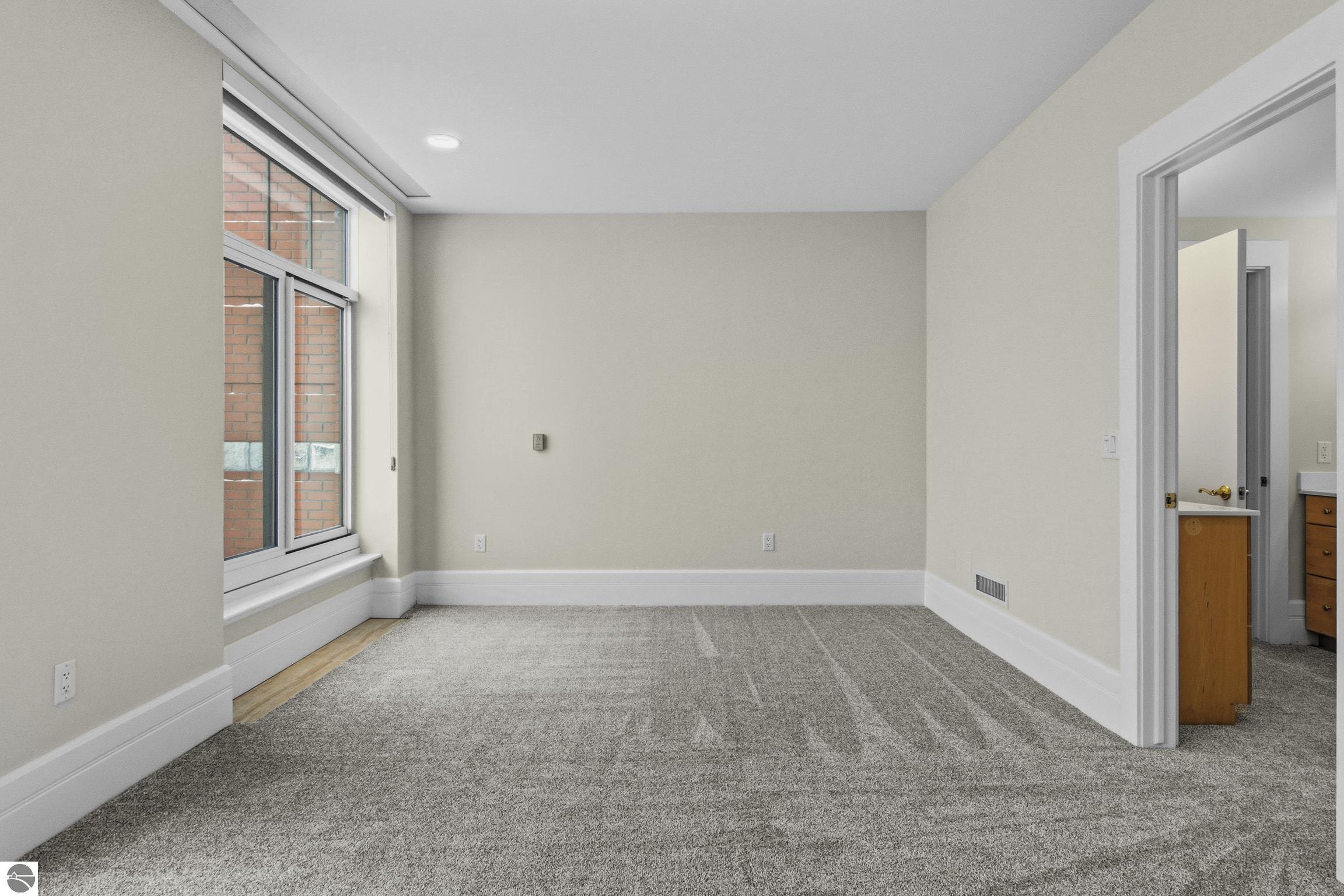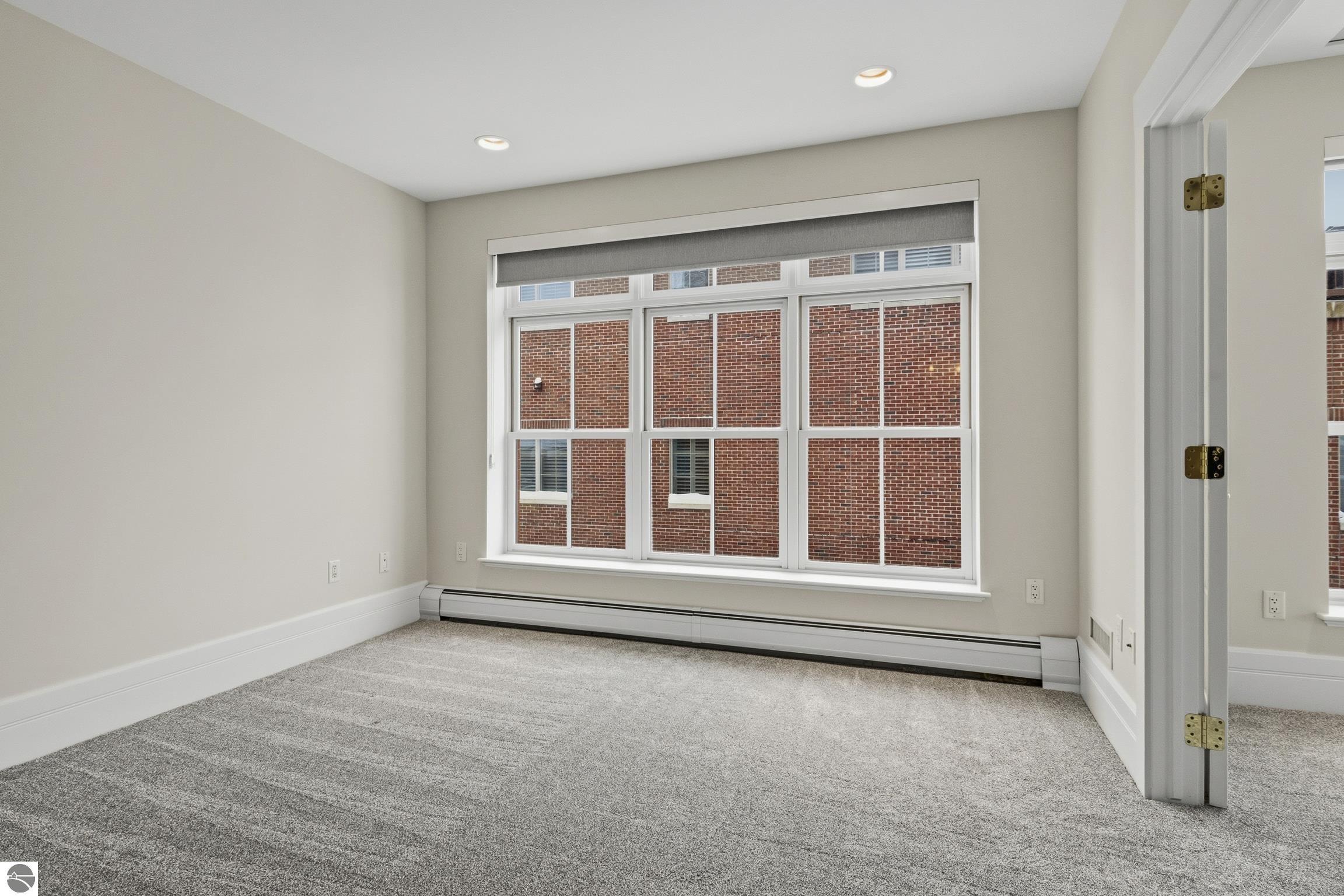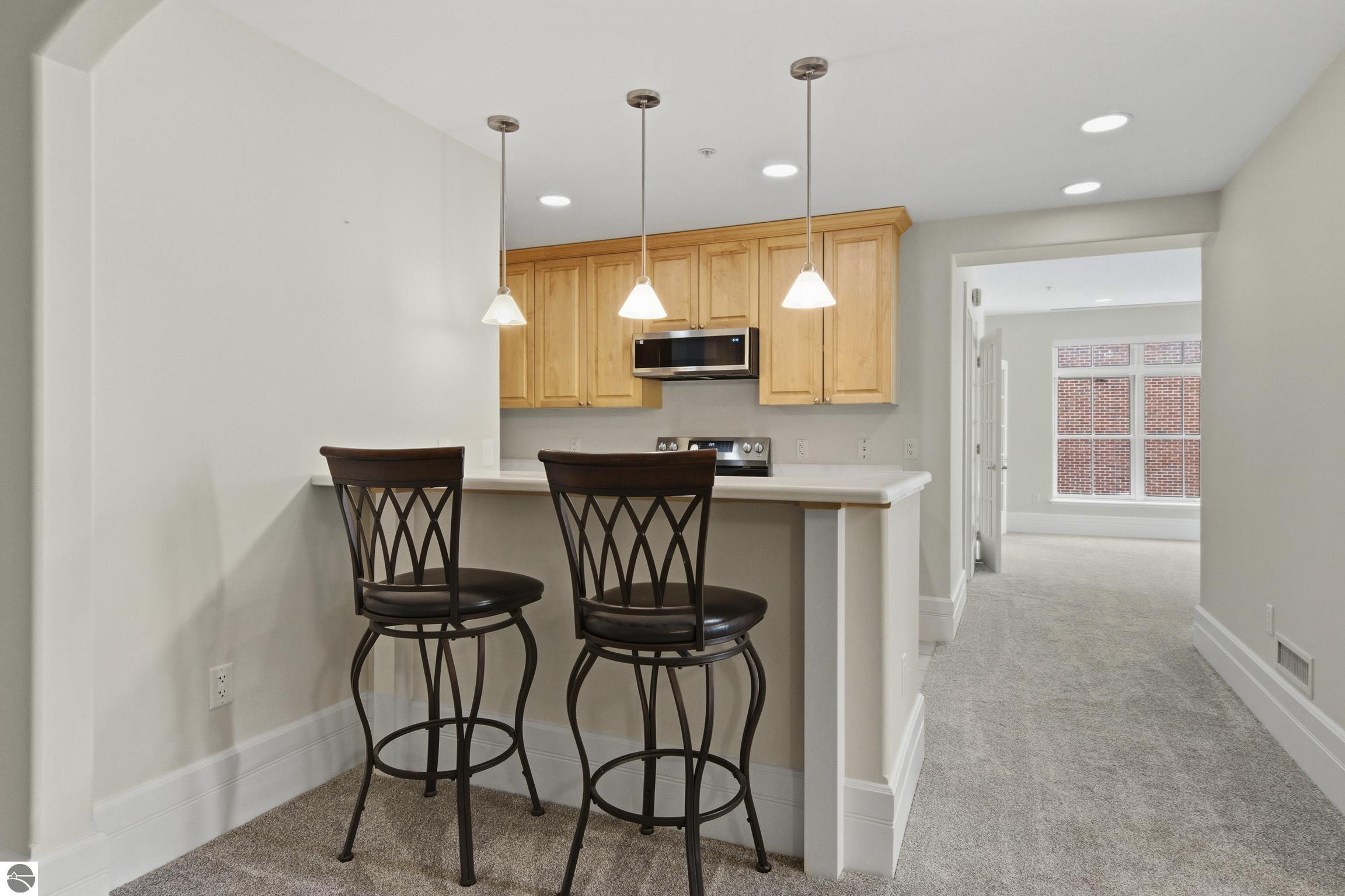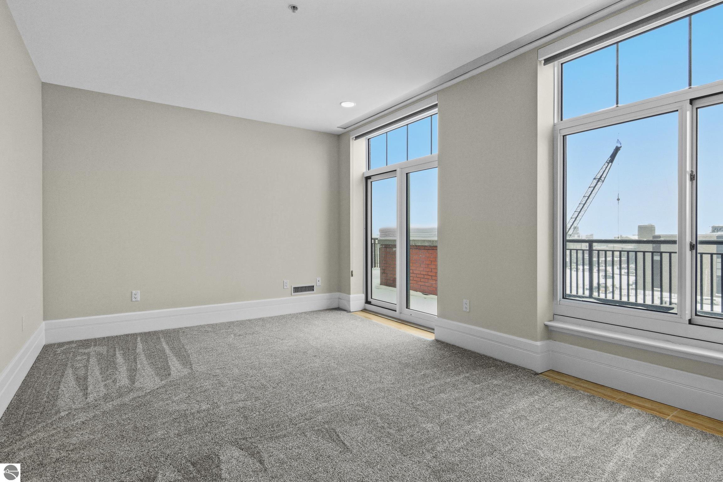 Take advantage of condo living at its very best, plus a fantastic location in the heart of downtown Traverse City. This 4th floor unit offers wonderful views of Grand Traverse Bay, the Boardman River and downtown Traverse City, the private balcony runs the length of the unit for maximum enjoyment of the outdoor space. This end unit has gorgeous natural light streaming in. The spacious living room has a gas burning fireplace and amazing views. The primary suite also takes full advantage of the view and has a private bath and walk in closet. Kitchen has new easy care counter tops and stainless steel appliances with a very efficient use of space and casual counter dining. Additional office and guest room both have their own bathrooms. The association also has a waterside community patio area, secure underground parking with elevator to unit. Association dues cover, basic cable, water, gas, heat/cooling, trash/recycling, snow removal, parking area maintenance and window cleaning.