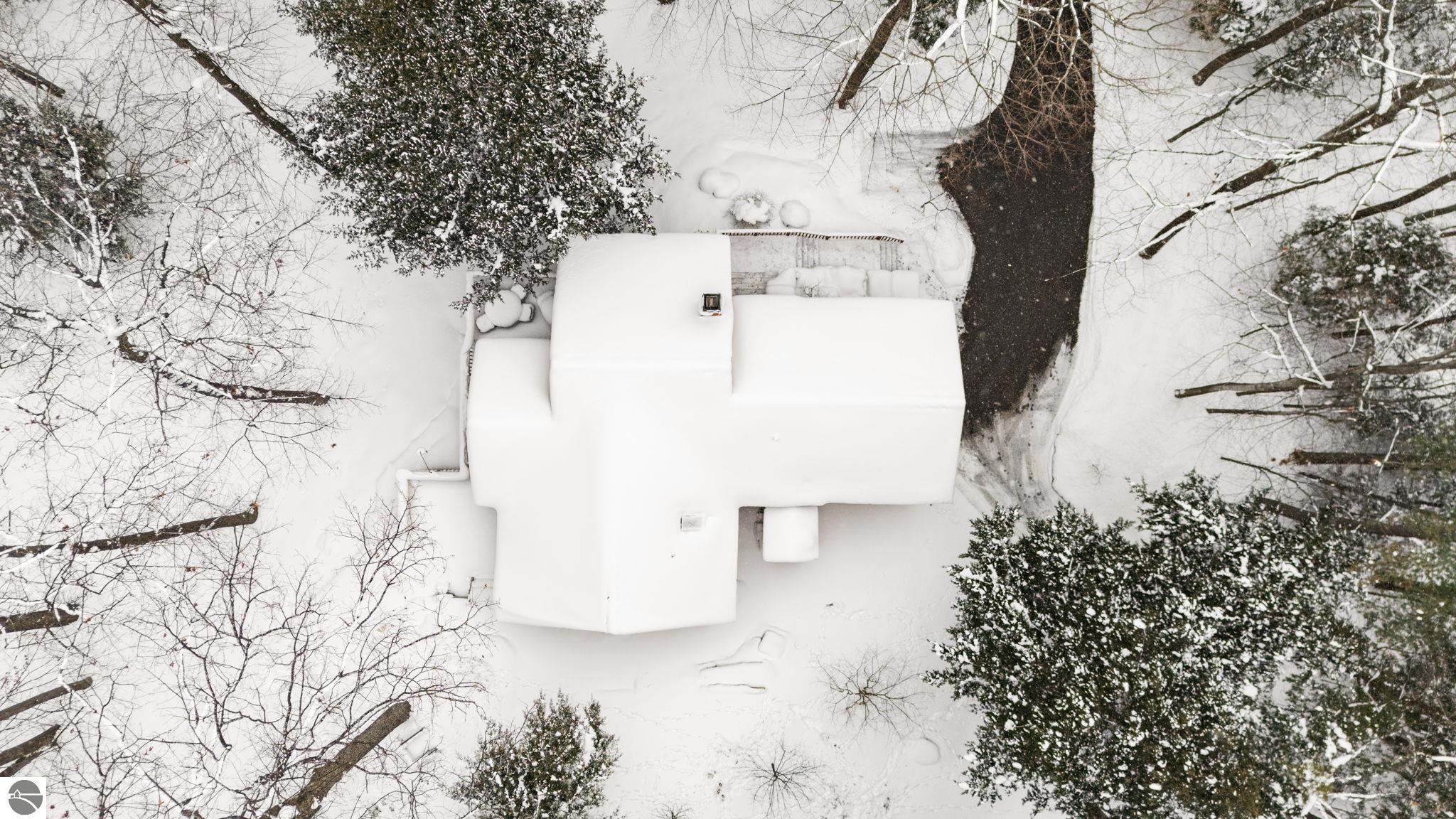 Designed by renowned architect Brad Wheeler, this thoughtfully crafted home is quietly tucked within The Bluffs, one of the most sought-after neighborhoods on the Old Mission Peninsula. Set on over an acre of private, wooded land, the home offers a rare blend of architectural integrity, natural beauty, and access to East Grand Traverse Bay. The main level is welcoming and expansive, featuring a light-filled living room with vaulted ceilings, hardwood floors, a gas fireplace, and oversized picture windows that frame the private landscape. Two bedrooms and two bathrooms on the main floor allow for comfortable main floor living, while the lower level provides a third bedroom, full bath, and a generous family room - ideal for guests, recreation, or a home office. Residents of The Bluffs enjoy approximately 1000 feet of shared frontage on East Grand Traverse Bay, with a community dock, the ability to have a boat on a lift, along with access to tennis and pickleball courts, private walking trails, and a neighborhood playground. All of this is just minutes from downtown Traverse City, and surrounded by wineries, beaches, and scenic charm that define the Old Mission Peninsula lifestyle. This is a timeless Northern Michigan home - architecturally significant, peacefully private, and exceptionally well located.