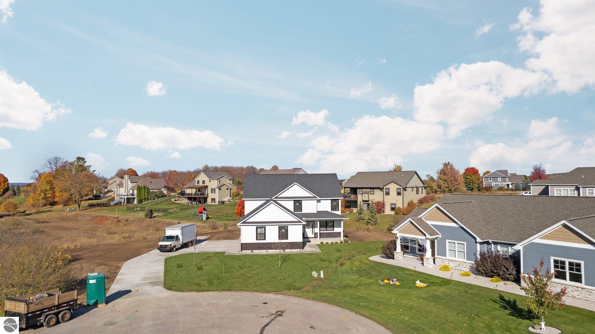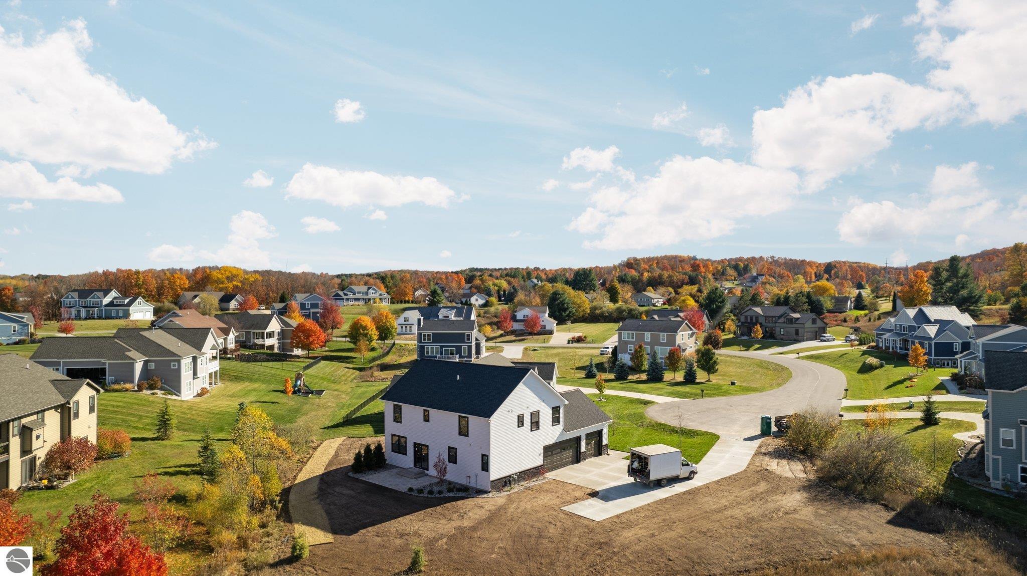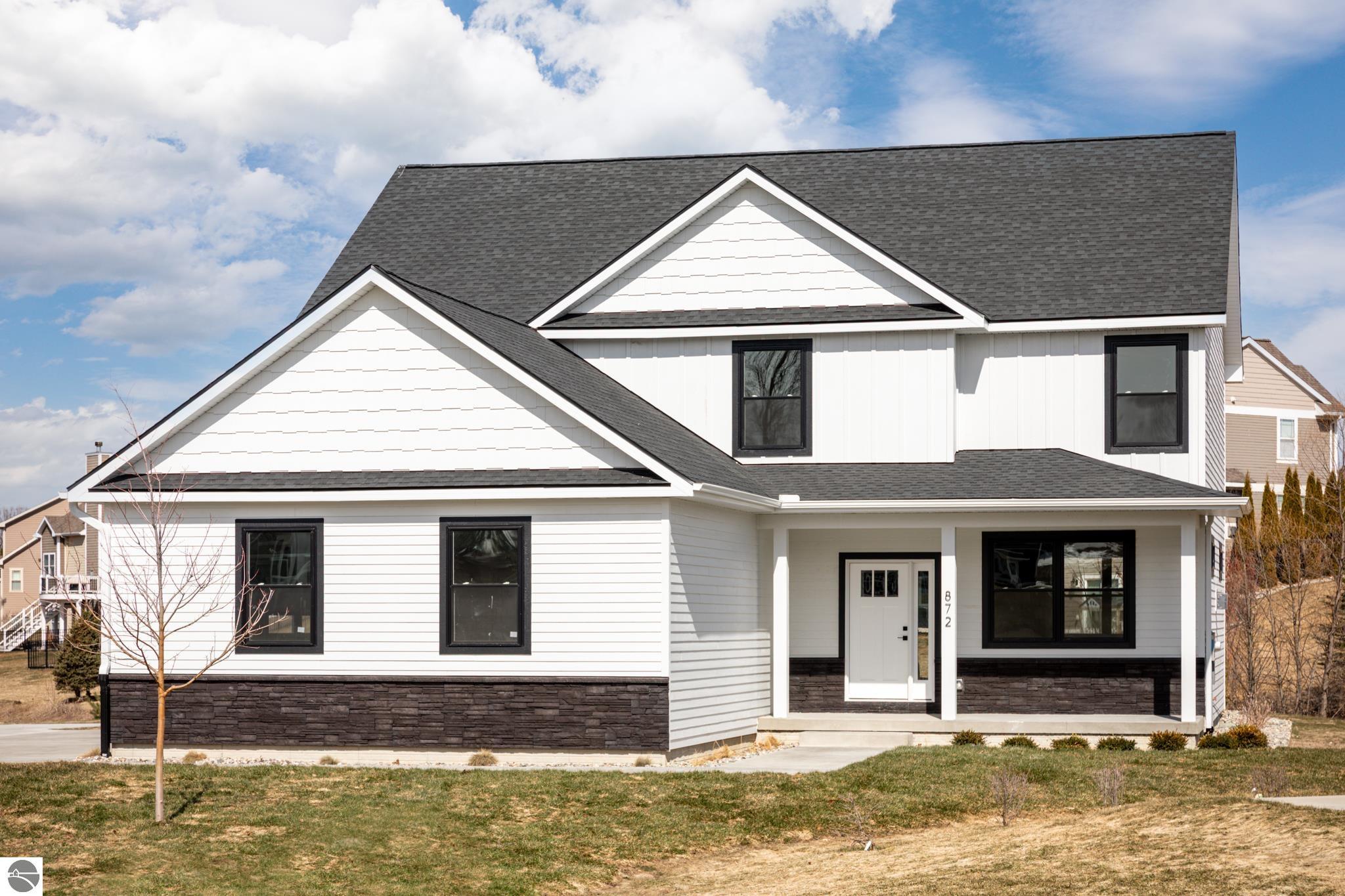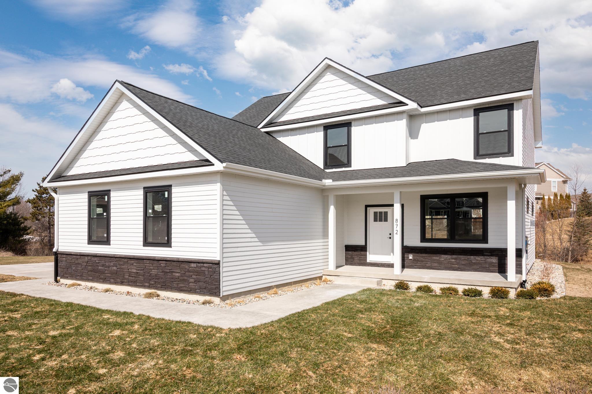 Tucked at the end of a quiet cul-de-sac in Verndale Estates, 872 Vienna Way delivers clean lines and livable design. Completed in 2025, its crisp white façade, bold black detailing, and three-car garage make a striking first impression. The generous lot opens to rolling hill views that glow with autumn color, offering privacy while still feeling connected to the neighborhood. Inside, natural light anchors an open layout that links the kitchen, dining, and living areas—easy for everyday life and effortless for entertaining. The kitchen stands out with sleek cabinetry, durable countertops, stylish flooring, and a full suite of included, state-of-the-art appliances. Well-placed windows frame the landscape and keep the main level bright from morning to evening. All-tile bathrooms bring a refined, timeless look with clean fixtures and spa-like simplicity. Bedrooms are comfortably scaled; the private primary suite adds a calm retreat with an elegant en-suite bath. Step outside to a professionally designed patio that extends your living space. The deep backyard invites gardens, play, or future amenities—bring your vision. Minutes to downtown Traverse City, nearby schools, golf, and waterfront recreation, this address pairs modern style with day-to-day convenience. A member of the selling LLC is a licensed real estate agent in the state of Michigan.