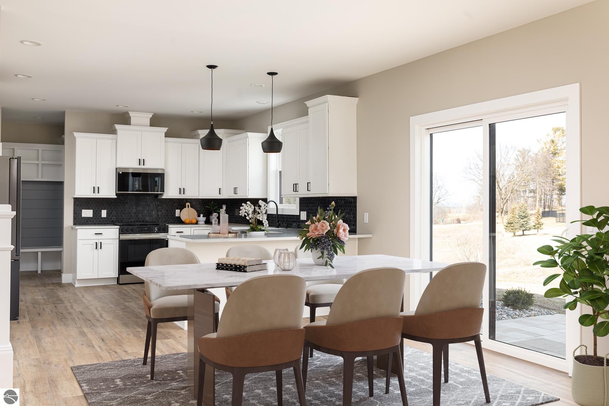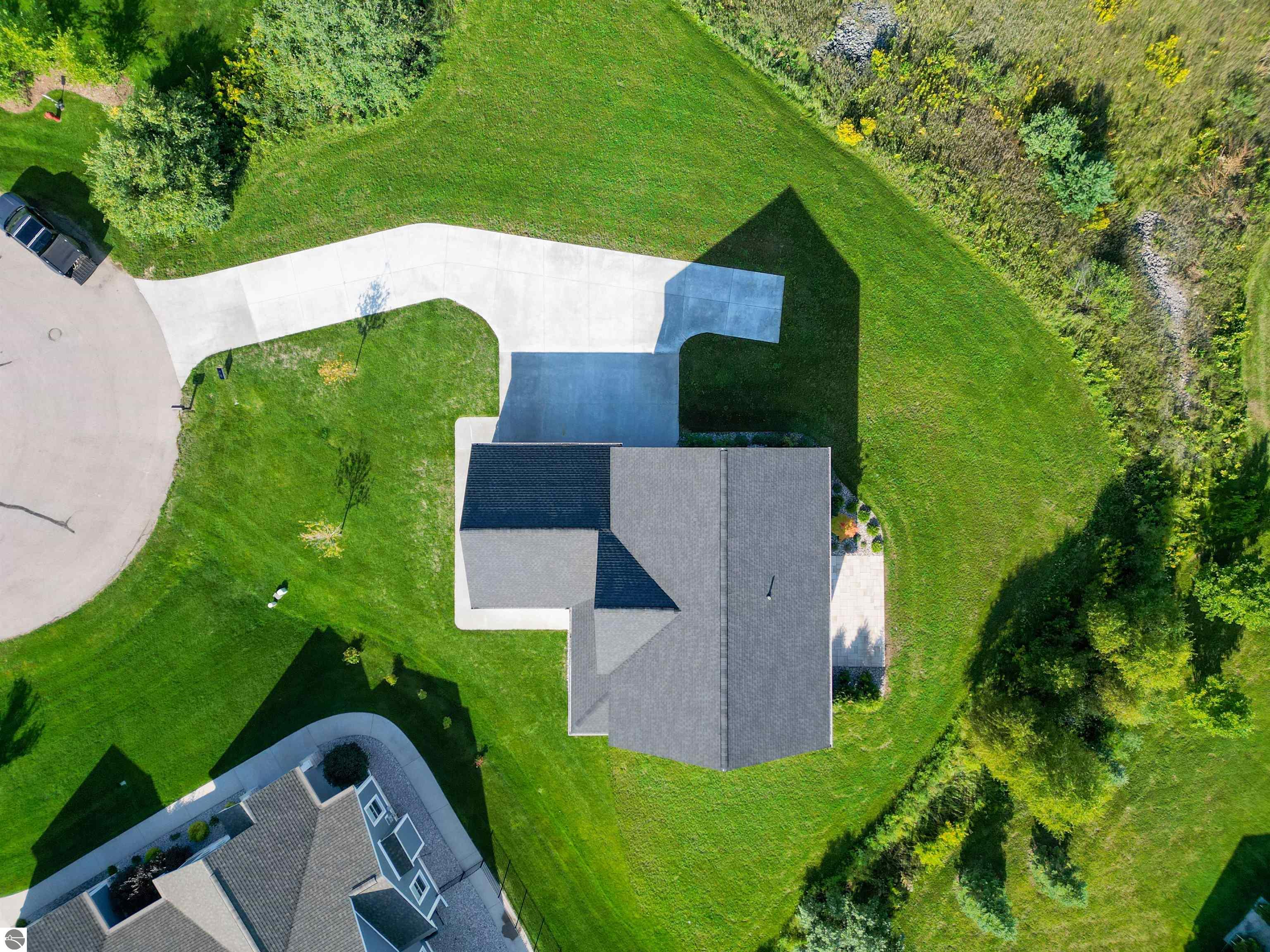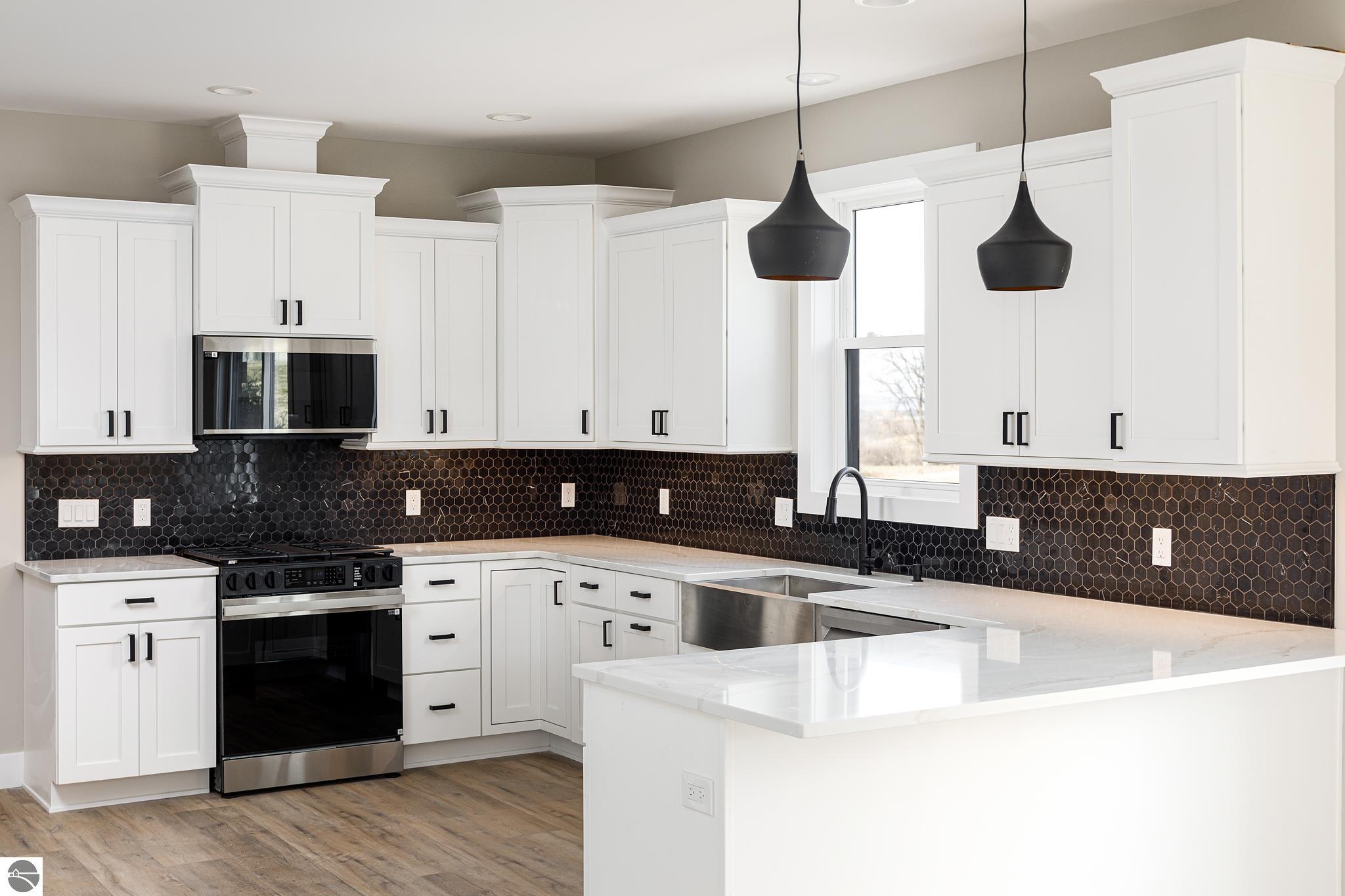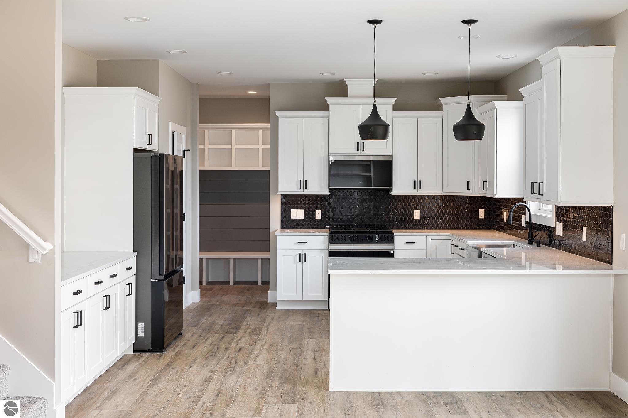 Tucked at the end of a quiet cul-de-sac in Verndale Estates, 872 Vienna Way delivers clean lines and livable design. Completed in 2025, its crisp white façade, bold black detailing, and three-car garage make a striking first impression. The generous lot opens to rolling hill views that glow with autumn color, offering privacy while still feeling connected to the neighborhood. Inside, natural light anchors an open layout that links the kitchen, dining, and living areas—easy for everyday life and effortless for entertaining. The kitchen stands out with sleek cabinetry, durable countertops, stylish flooring, and a full suite of included, state-of-the-art appliances. Well-placed windows frame the landscape and keep the main level bright from morning to evening. All-tile bathrooms bring a refined, timeless look with clean fixtures and spa-like simplicity. Bedrooms are comfortably scaled; the private primary suite adds a calm retreat with an elegant en-suite bath. Step outside to a professionally designed patio that extends your living space. The deep backyard invites gardens, play, or future amenities—bring your vision. Minutes to downtown Traverse City, nearby schools, golf, and waterfront recreation, this address pairs modern style with day-to-day convenience. A member of the selling LLC is a licensed real estate agent in the state of Michigan.