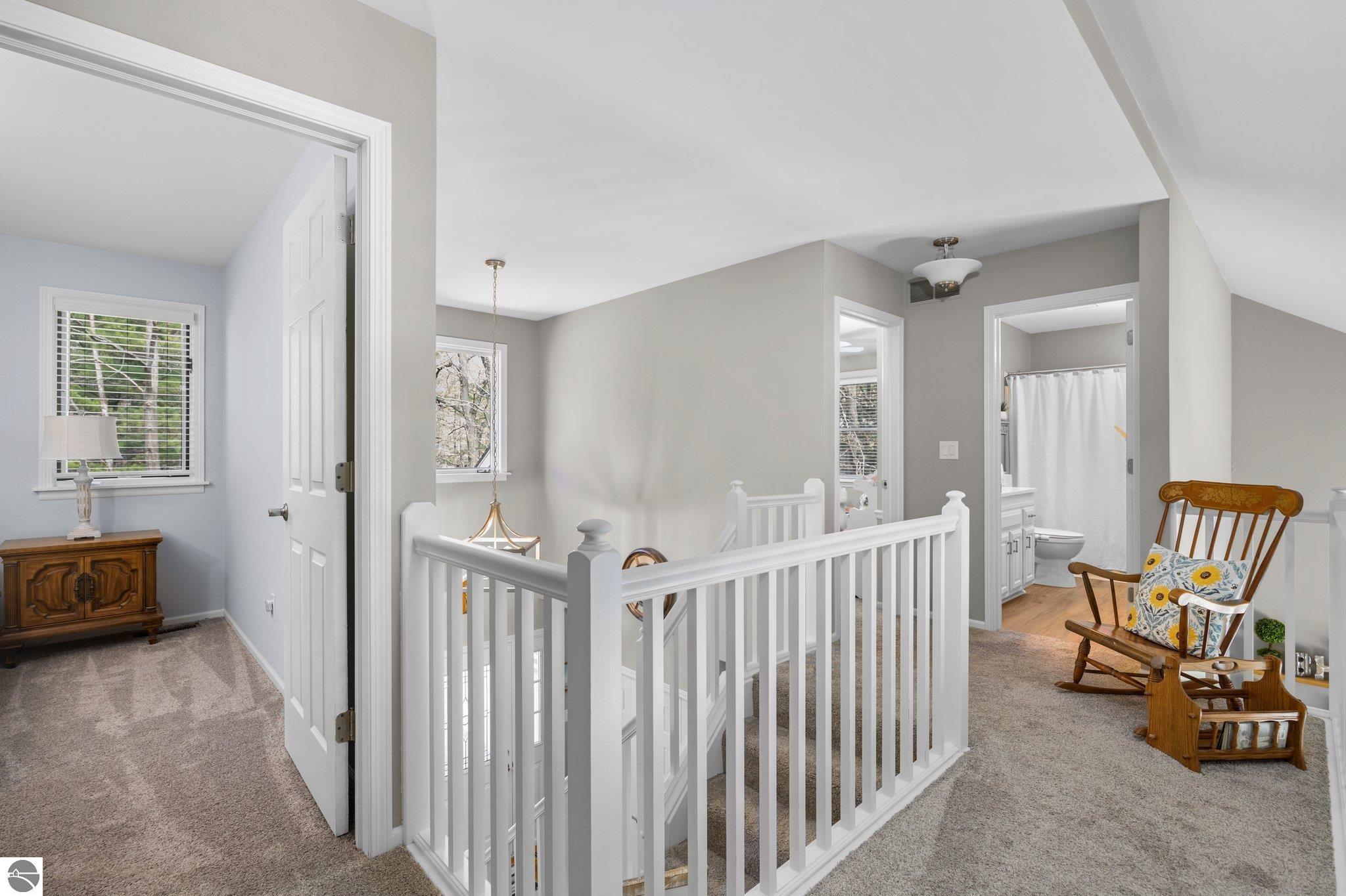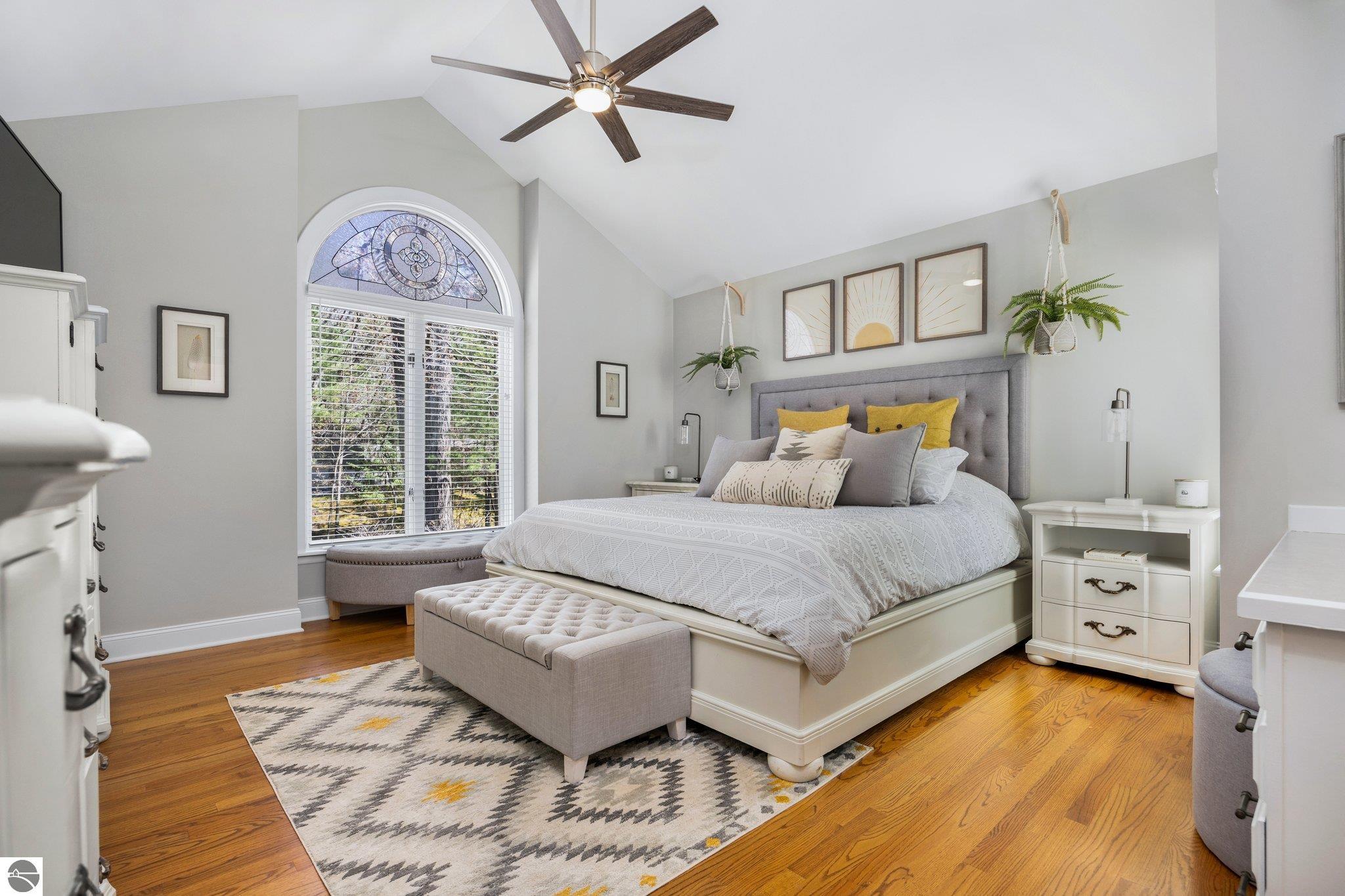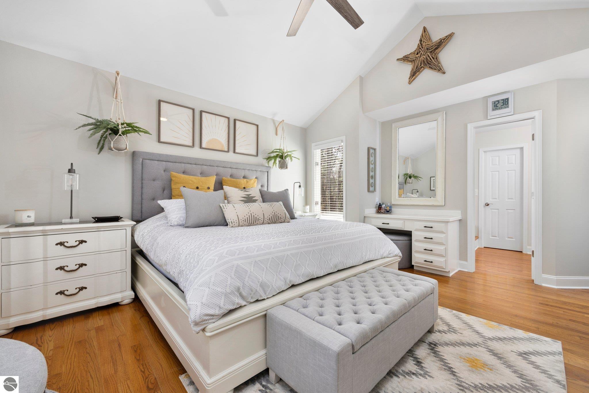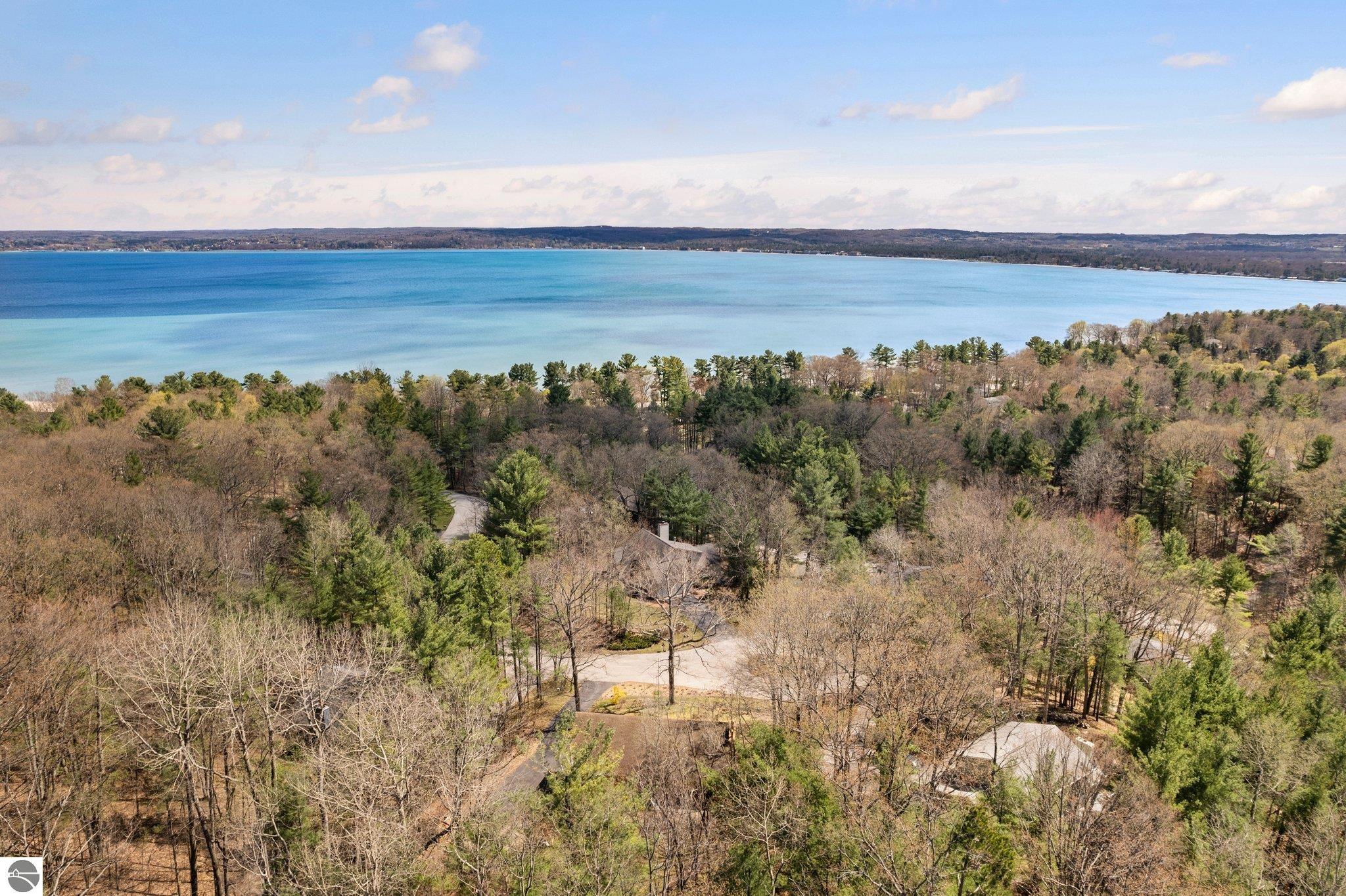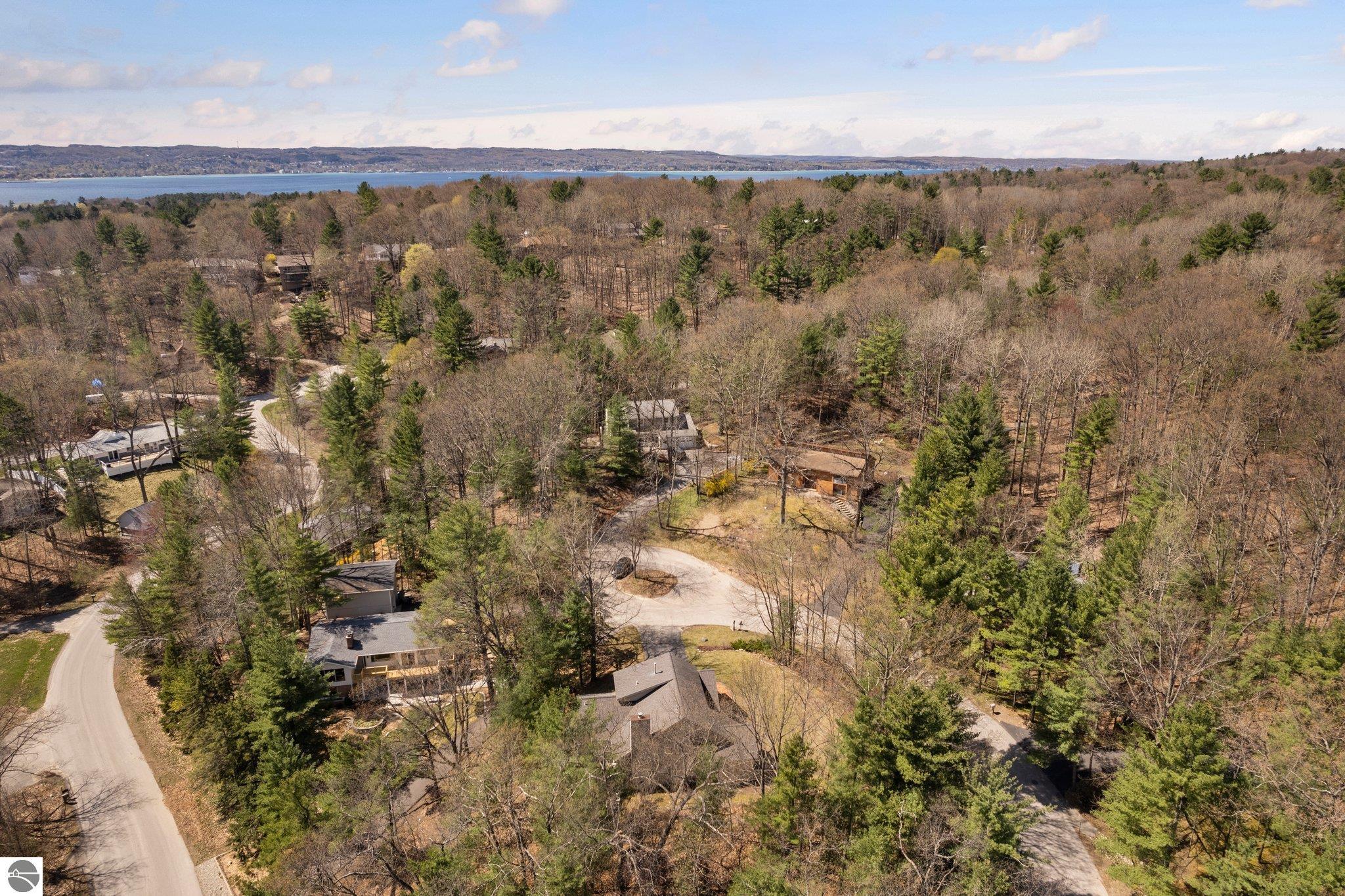 Imagine a spacious and magical tree-house on the base of Old Mission Peninsula just minutes from downtown Traverse City, in an enchanted neighborhood with big leafy trees, privacy, and plenty of safe space for children to play in the front yard by the cul-de-sac. Now imagine walking from your new home to the public beach on the east bay of Grand Traverse Bay that almost no one knows about! The front entry way leads immediately to a sensual and private en-suite primary equipped with jacuzzi, walk-in shower and ample walk-in closet space, totally removed from, but fully accessible to the rest of the home. Across the hallway, a staircase leads to three roomy bedrooms and another full bath. The plenteous windows on all three levels bring the outside in, which changes moment by moment. The living area, with its elegant cathedral ceilings and stunning wood burning fireplace leads seamlessly to the dining and kitchen area with powder room, and then into the pantry/laundry area and to the two-car garage. The lower walkout level has sliding glass doors leading to a patio surrounded by trees and practically invisible to the neighbors. Inside, a roomy family room offers another beautiful stone (gas) fireplace, a home-schooling area, a full bath, a small fitness room, and a large storage room. Your search is over. Here is the elegant space you've been seeking, for even multi-generational living, with plenty of room inside and outside to thrive and grow. Nothing compares to this unique two-story hideaway. Make an appointment today!