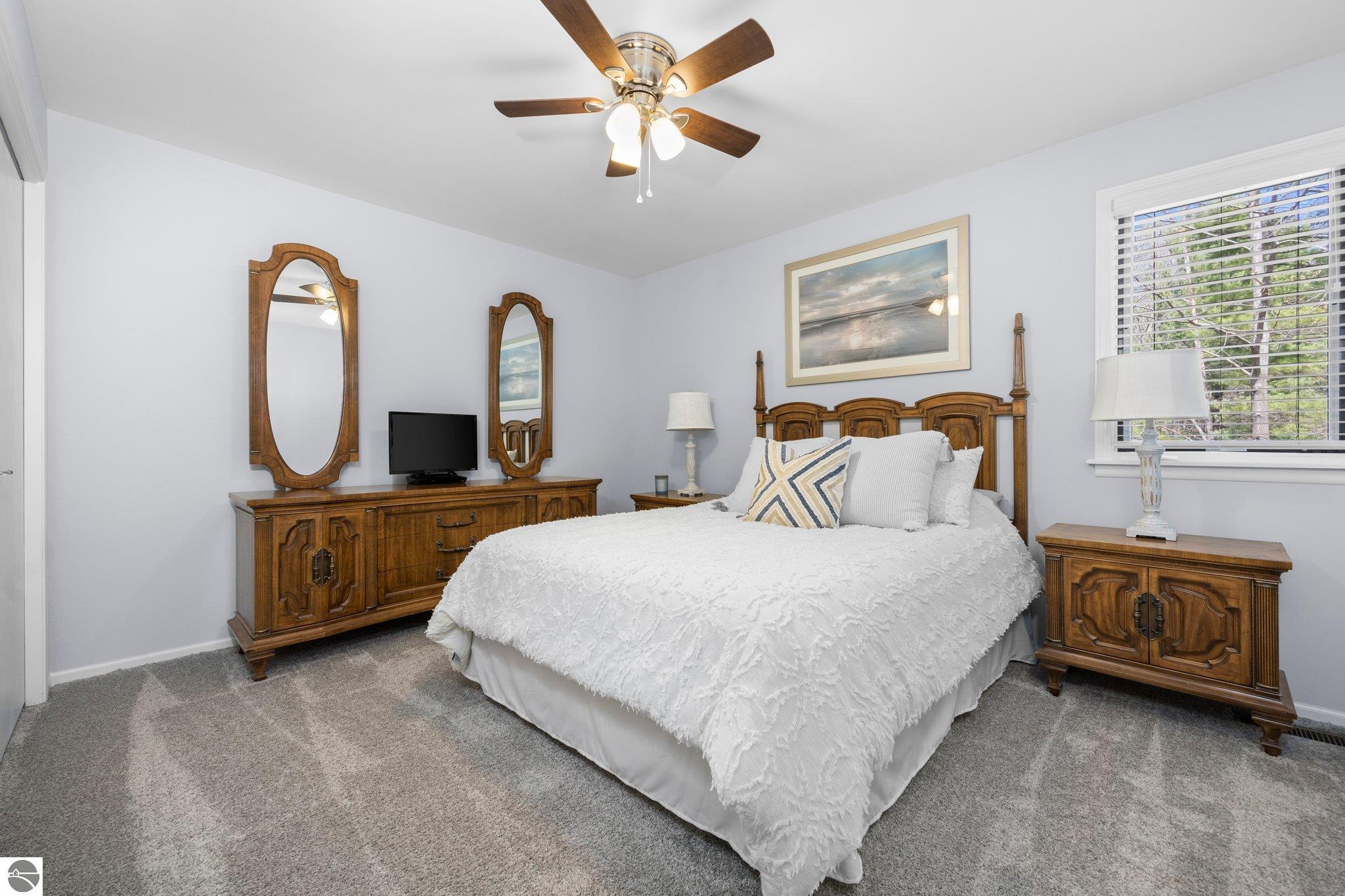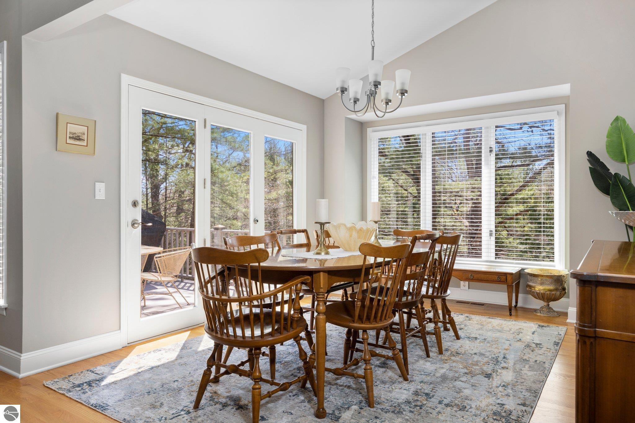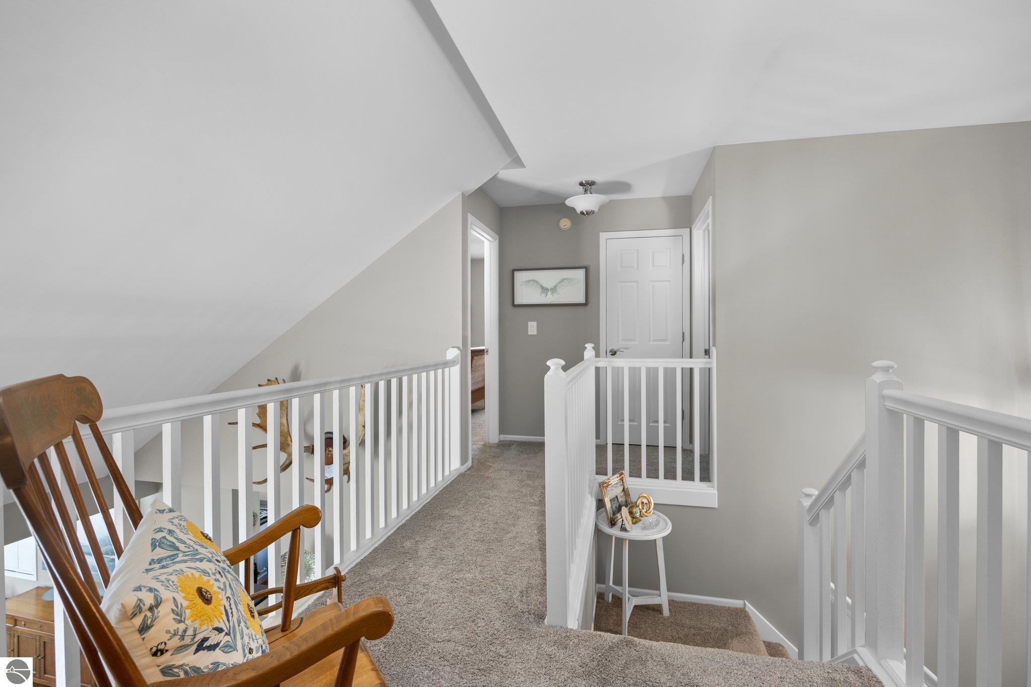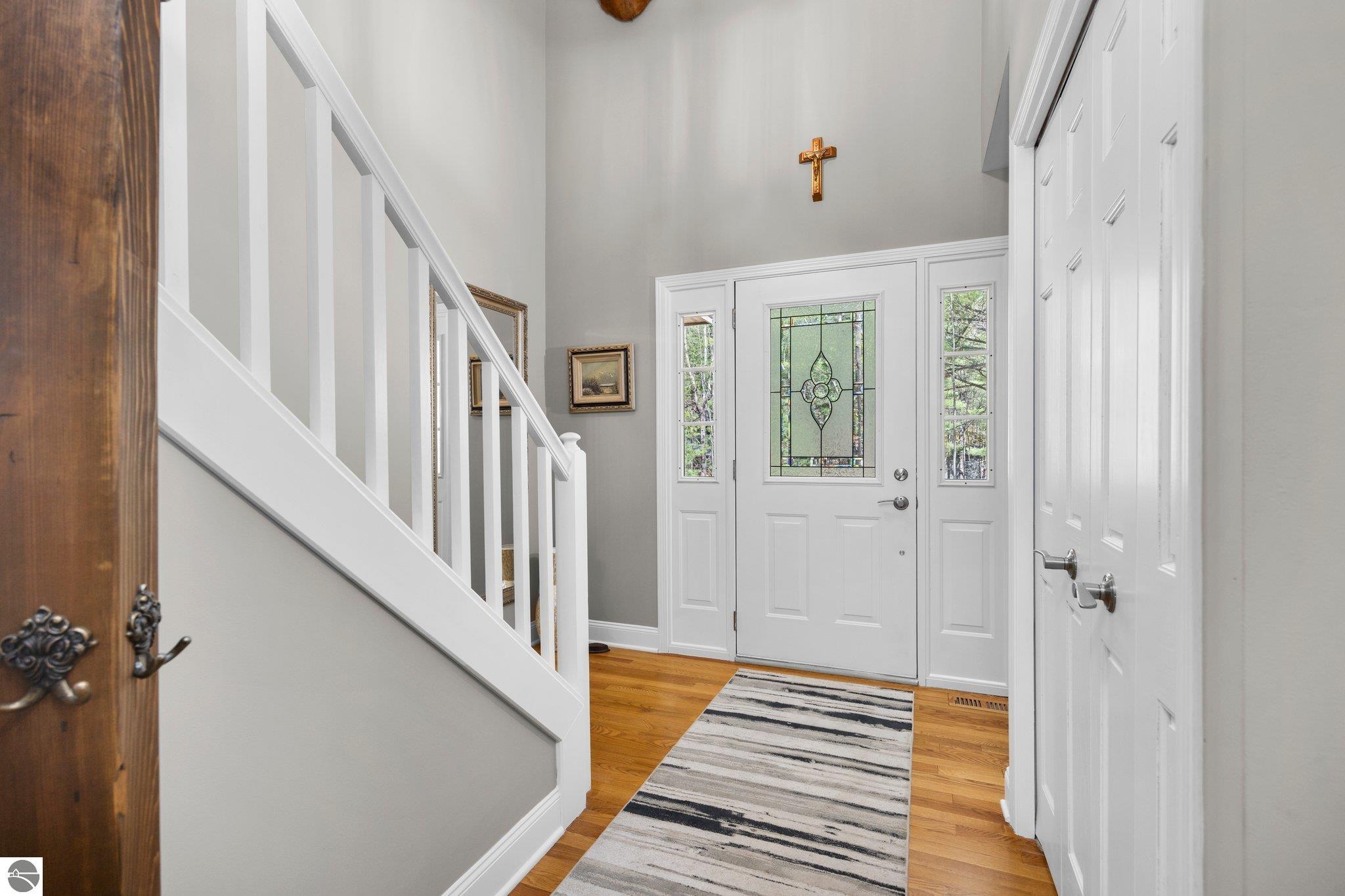 Imagine a spacious and magical tree-house on the base of Old Mission Peninsula just minutes from downtown Traverse City, in an enchanted neighborhood with big leafy trees, privacy, and plenty of safe space for children to play in the front yard by the cul-de-sac. Now imagine walking from your new home to the public beach on the east bay of Grand Traverse Bay that almost no one knows about! The front entry way leads immediately to a sensual and private en-suite primary equipped with jacuzzi, walk-in shower and ample walk-in closet space, totally removed from, but fully accessible to the rest of the home. Across the hallway, a staircase leads to three roomy bedrooms and another full bath. The plenteous windows on all three levels bring the outside in, which changes moment by moment. The living area, with its elegant cathedral ceilings and stunning wood burning fireplace leads seamlessly to the dining and kitchen area with powder room, and then into the pantry/laundry area and to the two-car garage. The lower walkout level has sliding glass doors leading to a patio surrounded by trees and practically invisible to the neighbors. Inside, a roomy family room offers another beautiful stone (gas) fireplace, a home-schooling area, a full bath, a small fitness room, and a large storage room. Your search is over. Here is the elegant space you've been seeking, for even multi-generational living, with plenty of room inside and outside to thrive and grow. Nothing compares to this unique two-story hideaway. Make an appointment today!