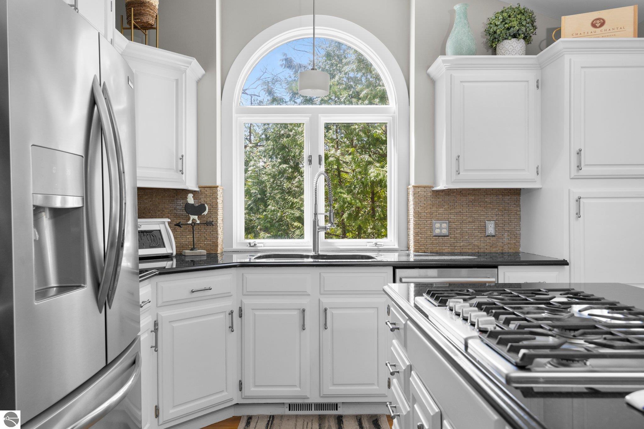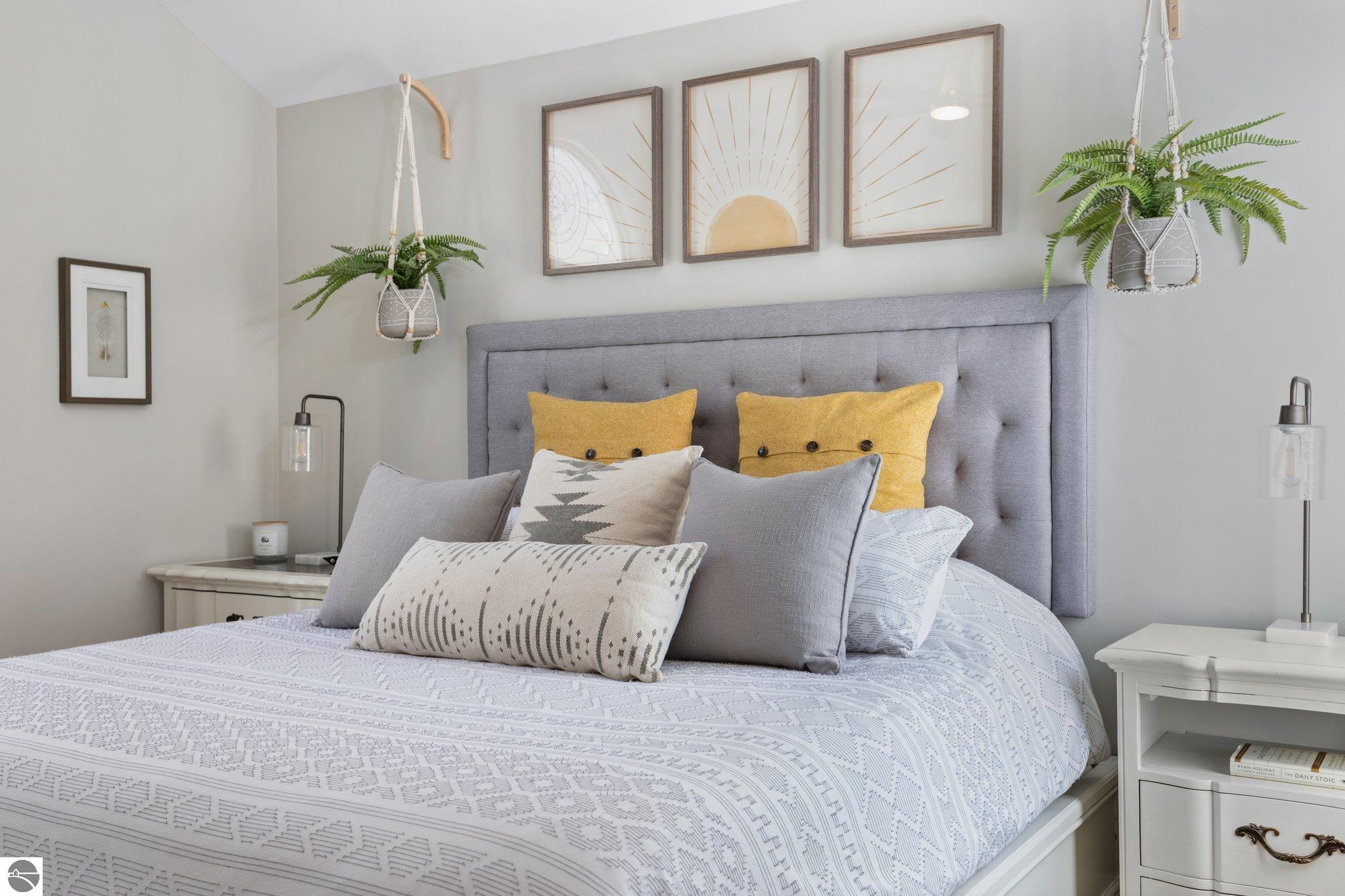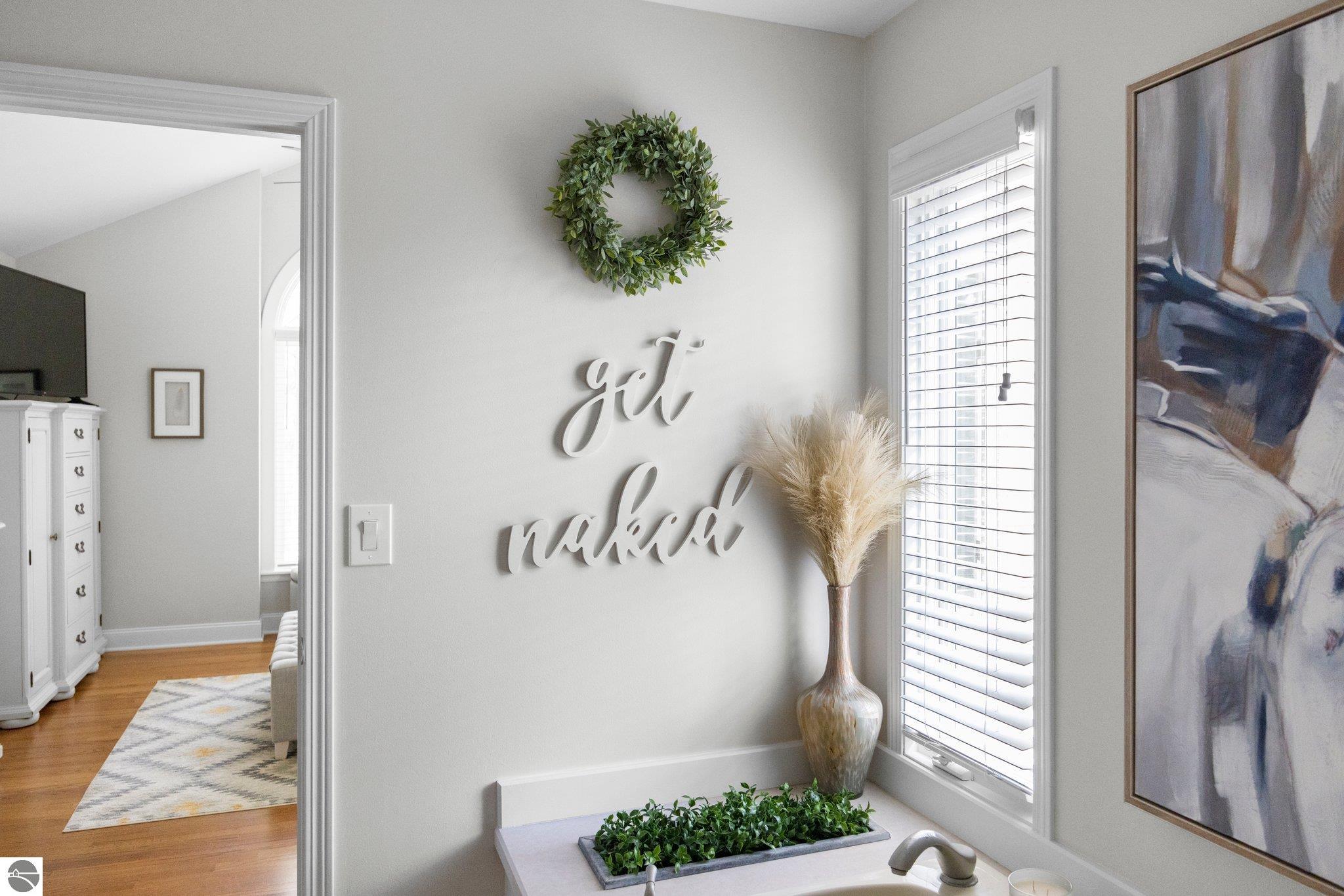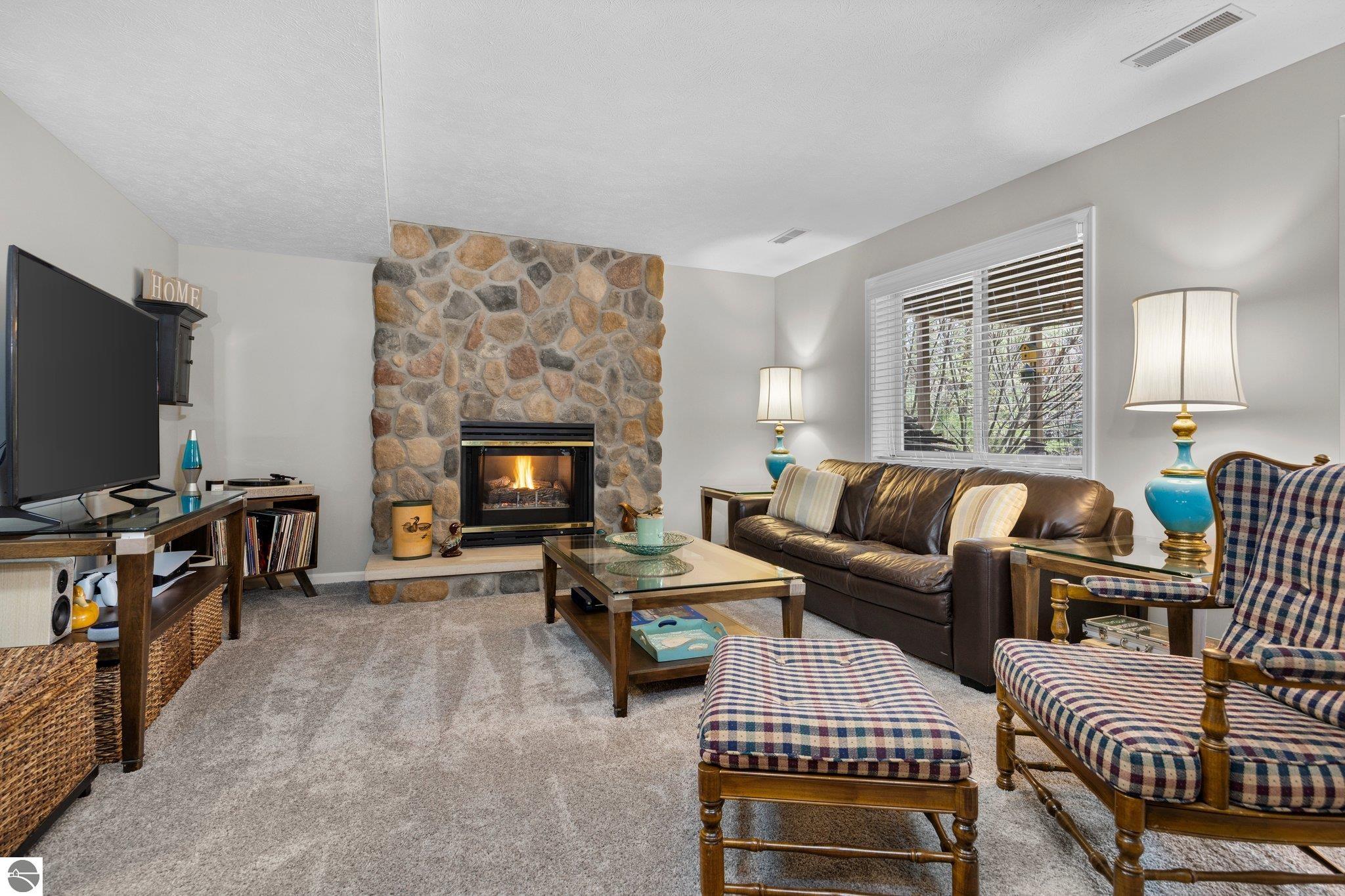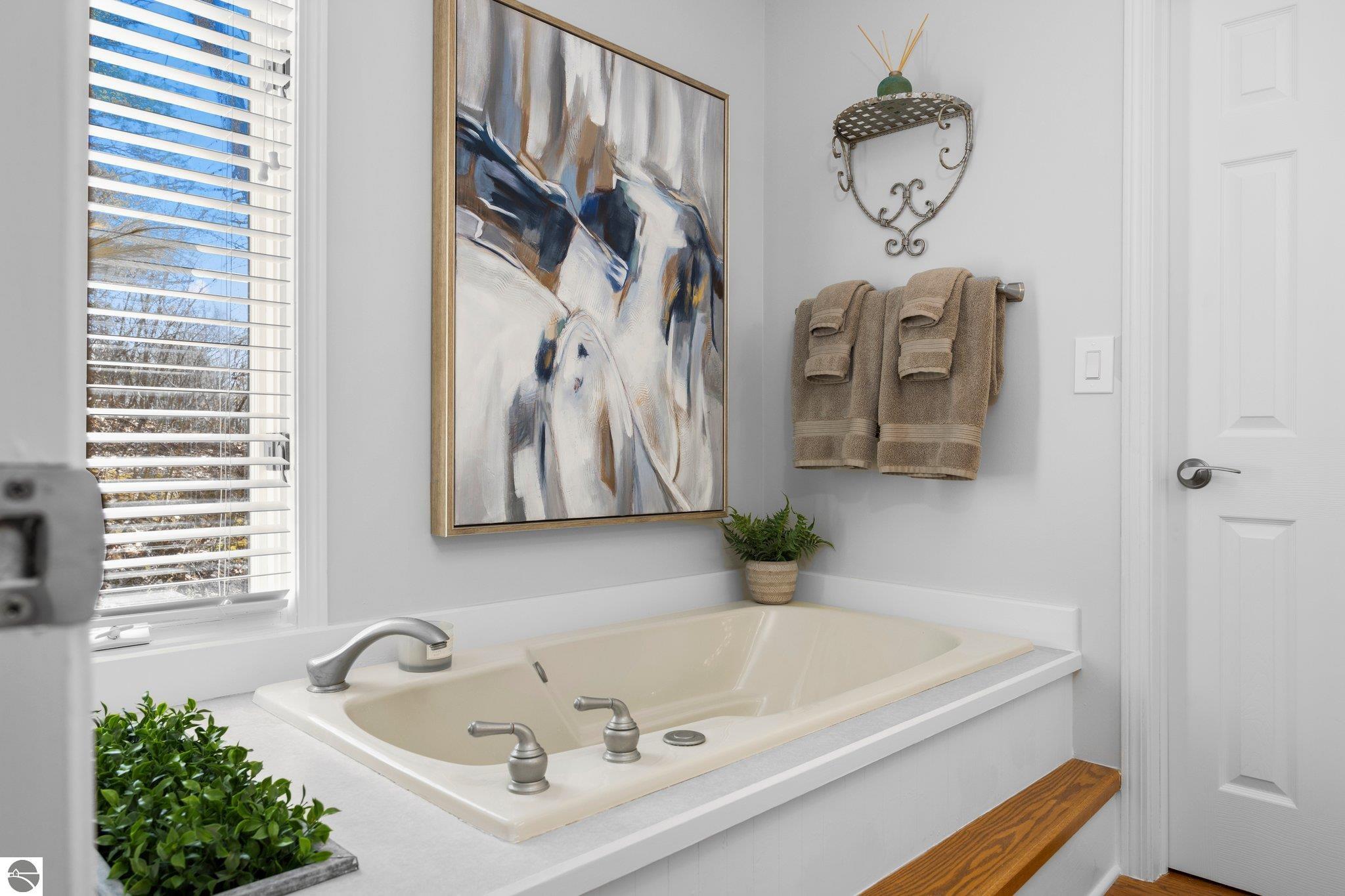 Imagine a spacious and magical tree-house on the base of Old Mission Peninsula just minutes from downtown Traverse City, in an enchanted neighborhood with big leafy trees, privacy, and plenty of safe space for children to play in the front yard by the cul-de-sac. Now imagine walking from your new home to the public beach on the east bay of Grand Traverse Bay that almost no one knows about! The front entry way leads immediately to a sensual and private en-suite primary equipped with jacuzzi, walk-in shower and ample walk-in closet space, totally removed from, but fully accessible to the rest of the home. Across the hallway, a staircase leads to three roomy bedrooms and another full bath. The plenteous windows on all three levels bring the outside in, which changes moment by moment. The living area, with its elegant cathedral ceilings and stunning wood burning fireplace leads seamlessly to the dining and kitchen area with powder room, and then into the pantry/laundry area and to the two-car garage. The lower walkout level has sliding glass doors leading to a patio surrounded by trees and practically invisible to the neighbors. Inside, a roomy family room offers another beautiful stone (gas) fireplace, a home-schooling area, a full bath, a small fitness room, and a large storage room. Your search is over. Here is the elegant space you've been seeking, for even multi-generational living, with plenty of room inside and outside to thrive and grow. Nothing compares to this unique two-story hideaway. Make an appointment today!