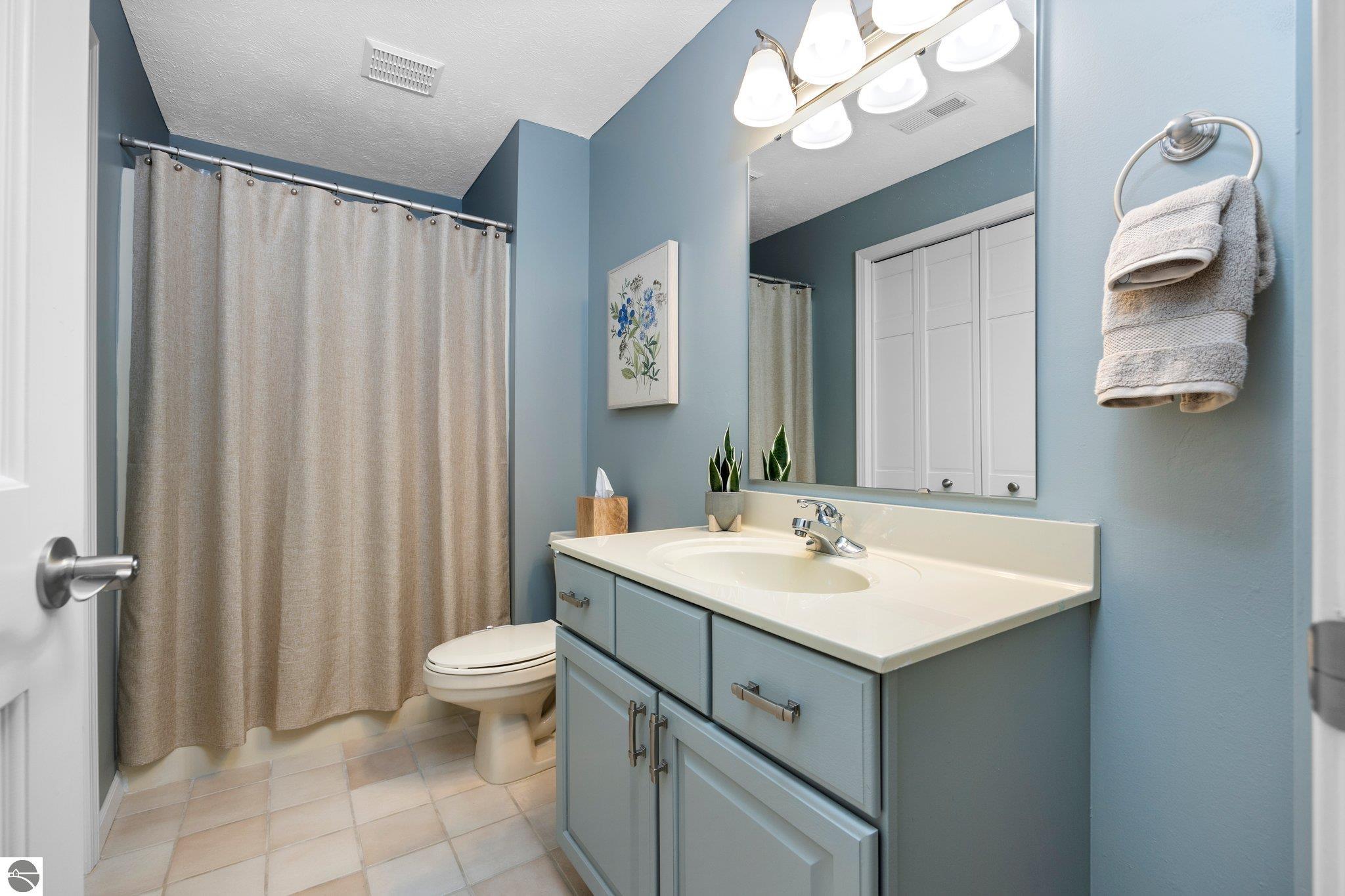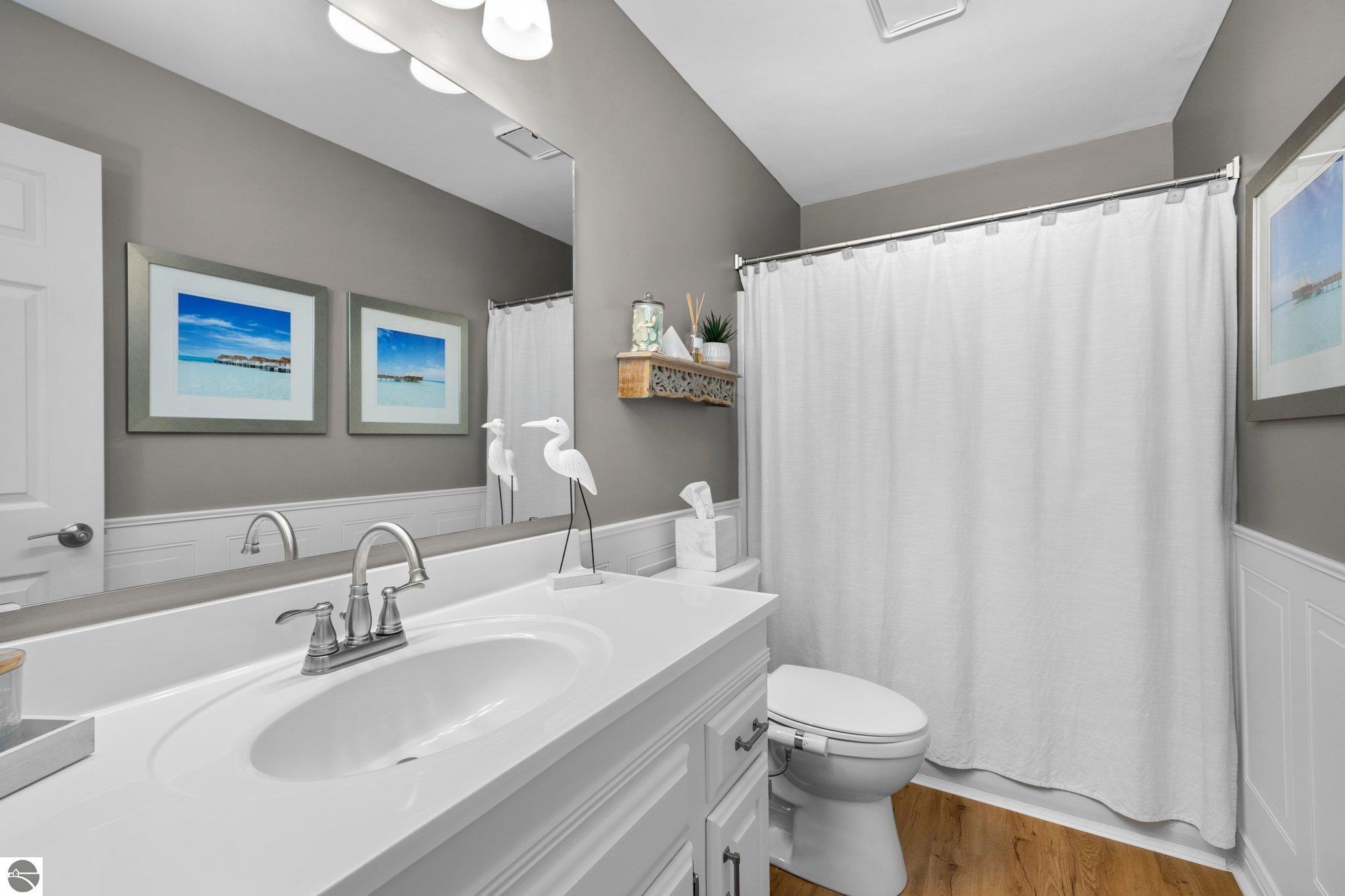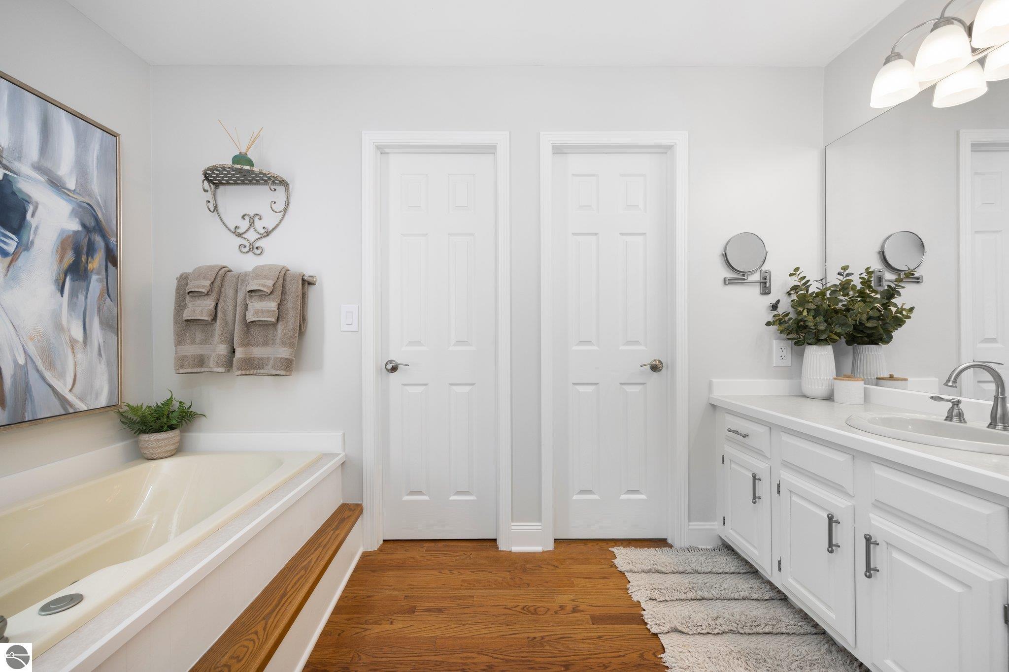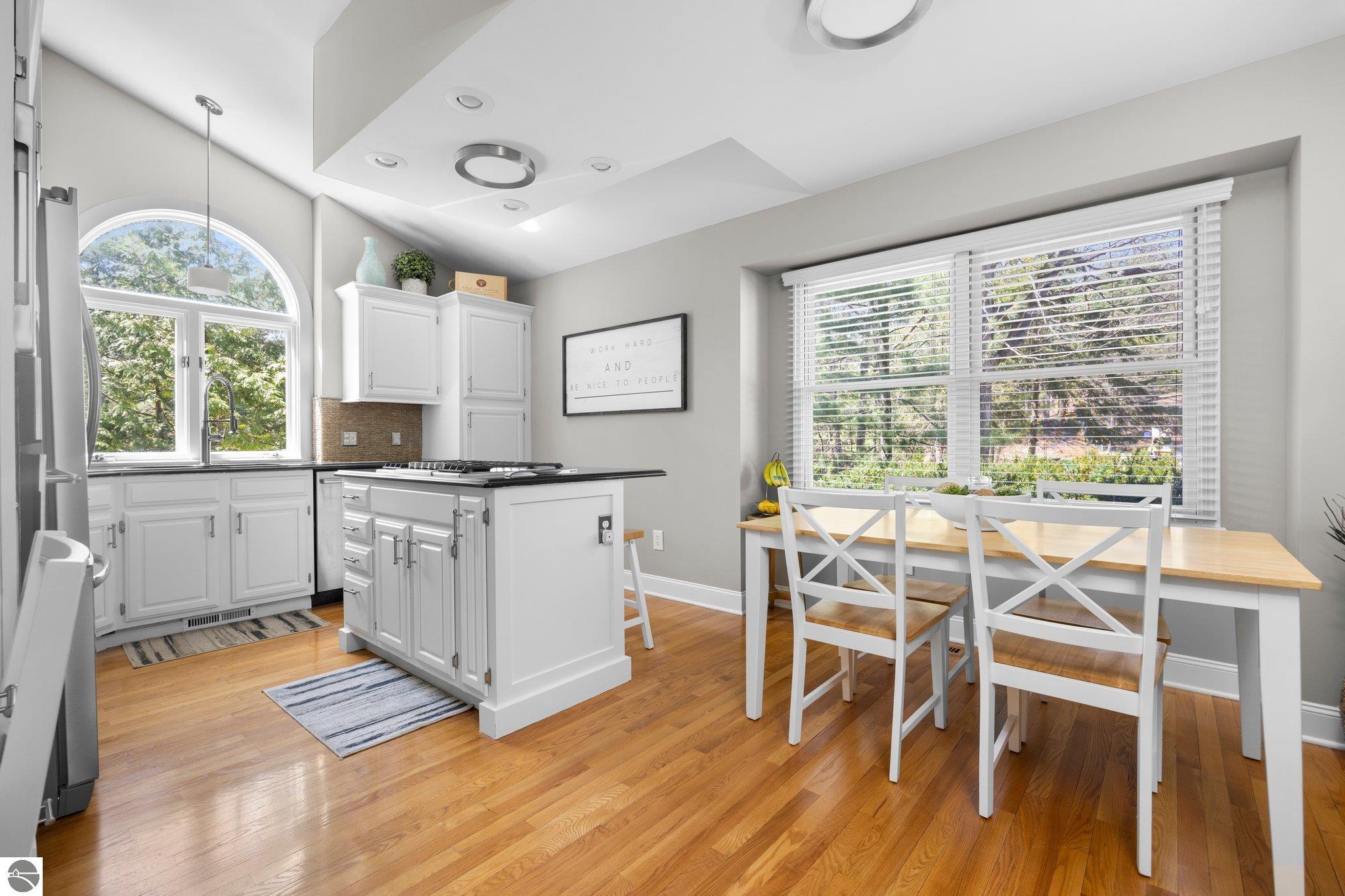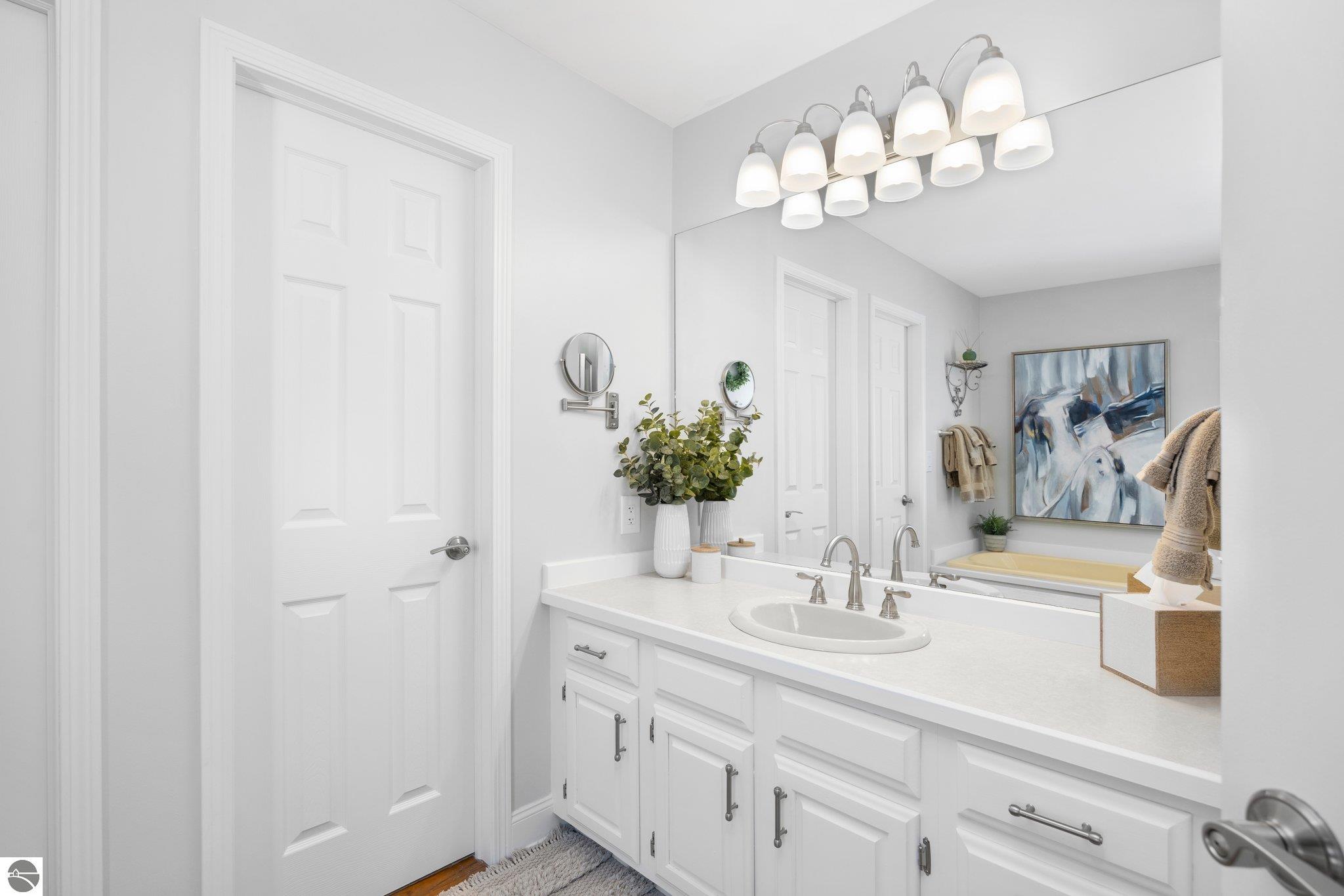 Imagine a spacious and magical tree-house on the base of Old Mission Peninsula just minutes from downtown Traverse City, in an enchanted neighborhood with big leafy trees, privacy, and plenty of safe space for children to play in the front yard by the cul-de-sac. Now imagine walking from your new home to the public beach on the east bay of Grand Traverse Bay that almost no one knows about! The front entry way leads immediately to a sensual and private en-suite primary equipped with jacuzzi, walk-in shower and ample walk-in closet space, totally removed from, but fully accessible to the rest of the home. Across the hallway, a staircase leads to three roomy bedrooms and another full bath. The plenteous windows on all three levels bring the outside in, which changes moment by moment. The living area, with its elegant cathedral ceilings and stunning wood burning fireplace leads seamlessly to the dining and kitchen area with powder room, and then into the pantry/laundry area and to the two-car garage. The lower walkout level has sliding glass doors leading to a patio surrounded by trees and practically invisible to the neighbors. Inside, a roomy family room offers another beautiful stone (gas) fireplace, a home-schooling area, a full bath, a small fitness room, and a large storage room. Your search is over. Here is the elegant space you've been seeking, for even multi-generational living, with plenty of room inside and outside to thrive and grow. Nothing compares to this unique two-story hideaway. Make an appointment today!